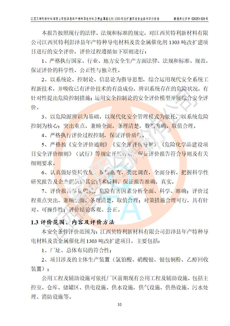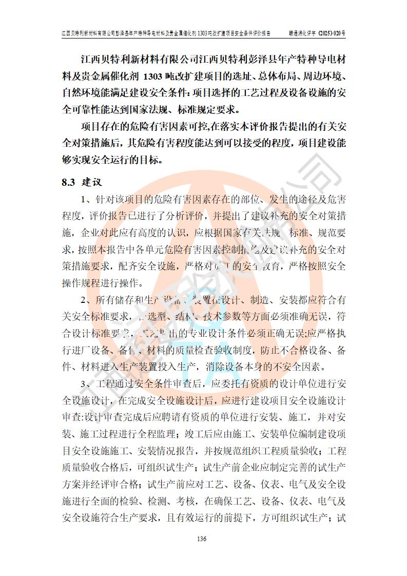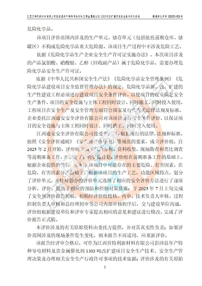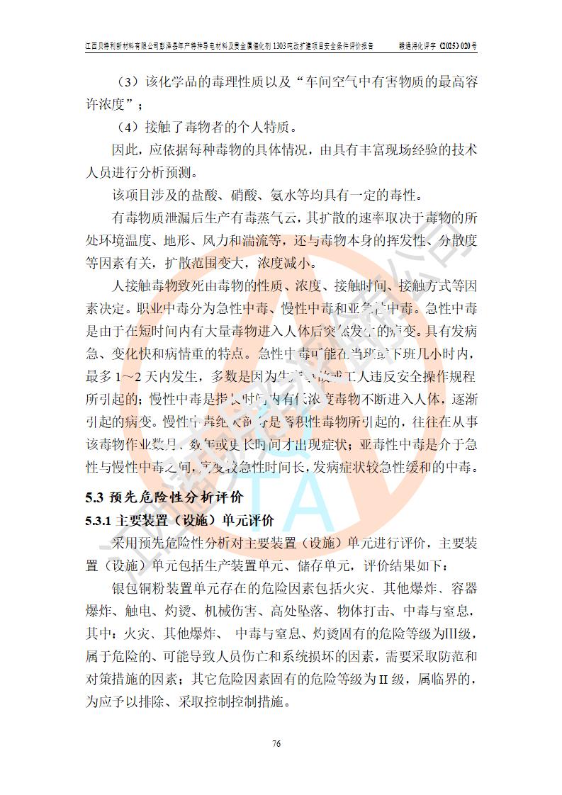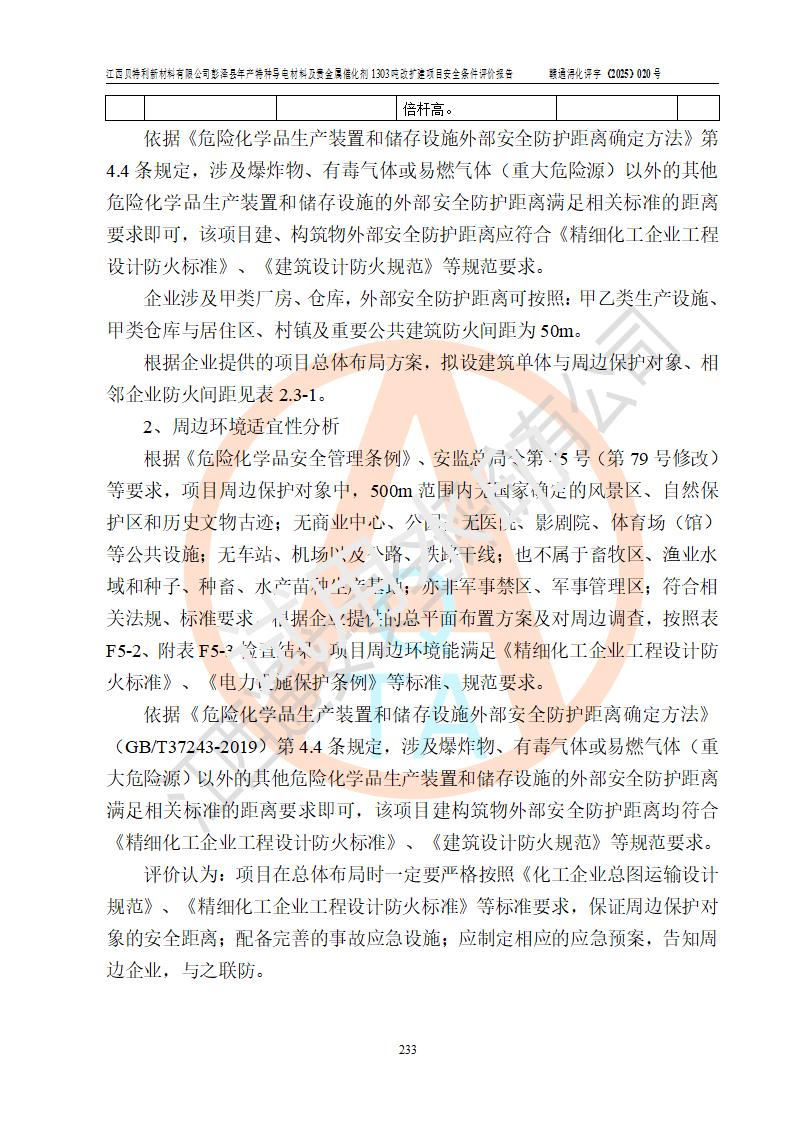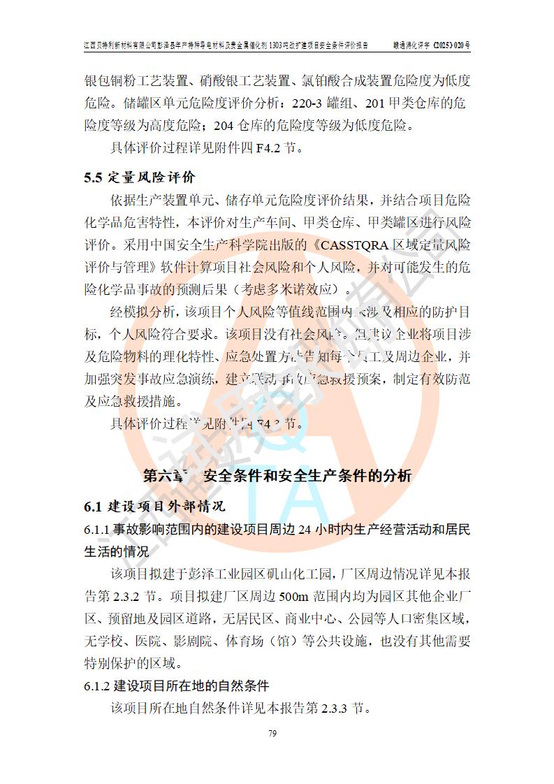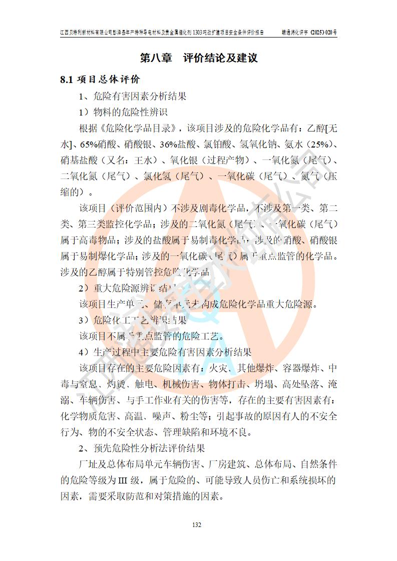 评价结论 | 江西贝特利新材料有限公司江西贝特利彭泽县年产特种导电材料及贵金属催化剂 1303吨改扩建项目的选址、总体布局、周边环境、自然环境能满足建设安全条件:项目选择的工艺过程及设备设施的安全可靠性能达到**法规、标准规定要求。 项目存在的危险有害因素可控,在落实本评价报告提出的有关安全对策措施后,其危险有害程度能达到可以接受的程度,项目建设能够实现安全运行的目标。 | |||||