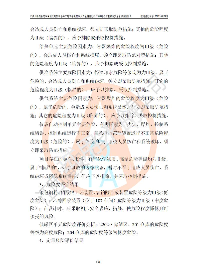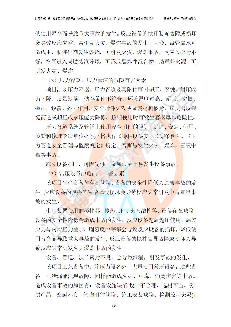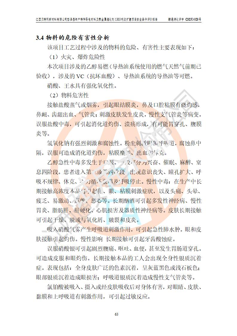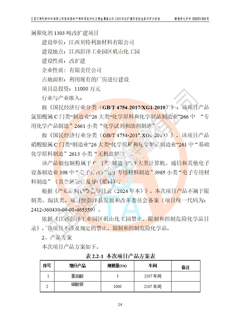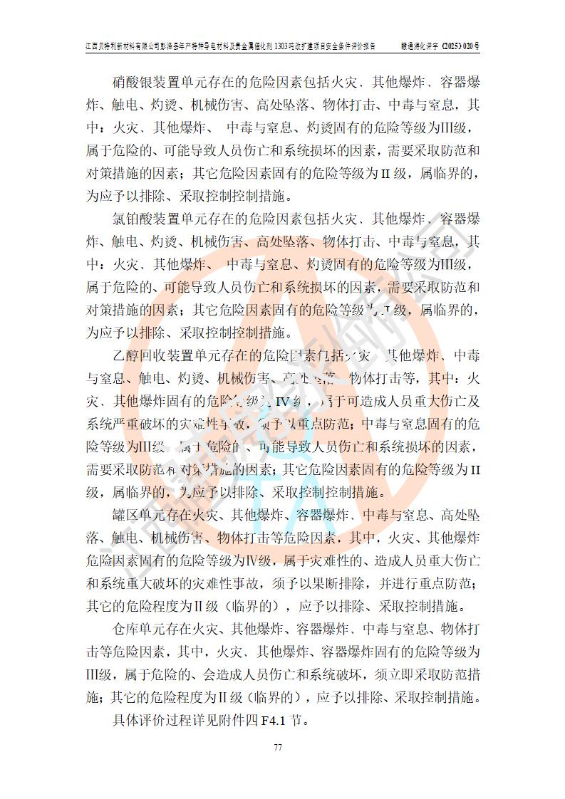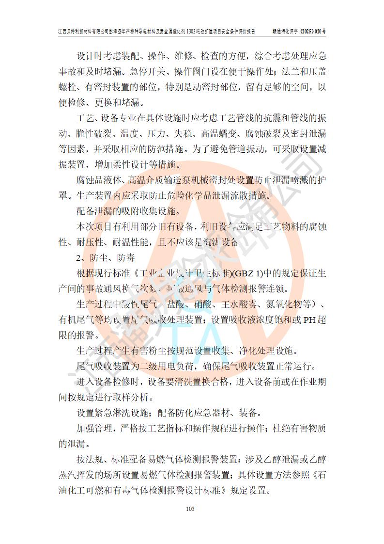 评价结论 | 江西贝特利新材料有限公司江西贝特利彭泽县年产特种导电材料及贵金属催化剂 1303吨改扩建项目的选址、总体布局、周边环境、自然环境能满足建设安全条件:项目选择的工艺过程及设备设施的安全可靠性能达到**法规、标准规定要求。 项目存在的危险有害因素可控,在落实本评价报告提出的有关安全对策措施后,其危险有害程度能达到可以接受的程度,项目建设能够实现安全运行的目标。 | |||||