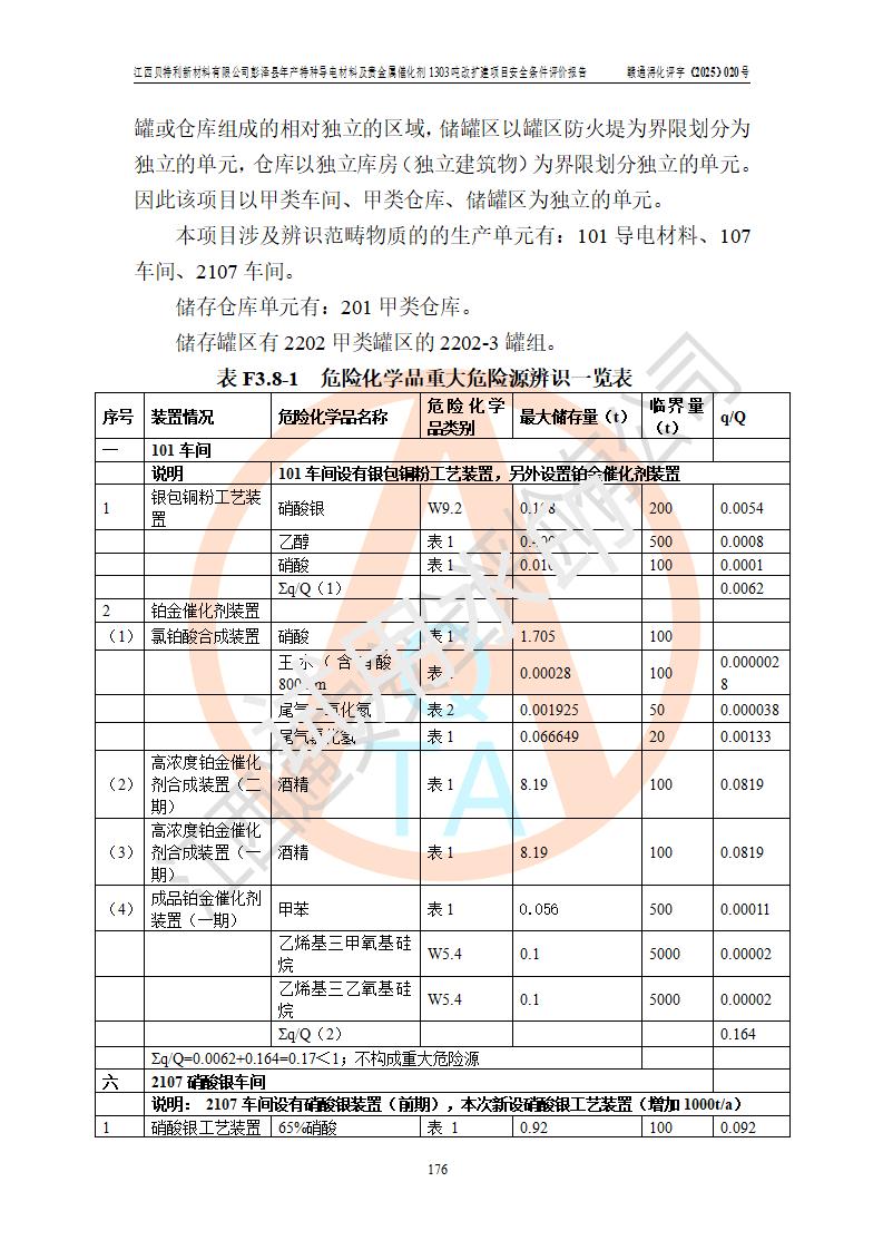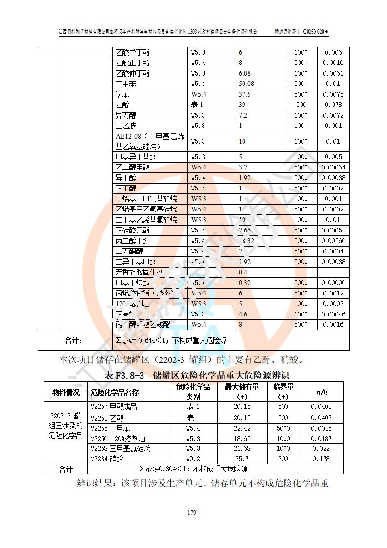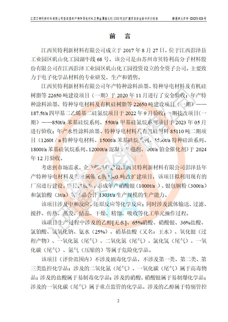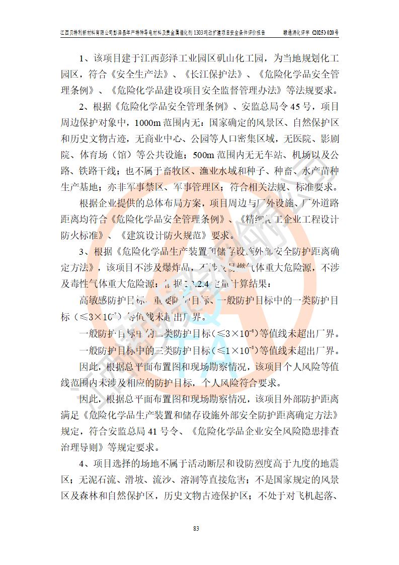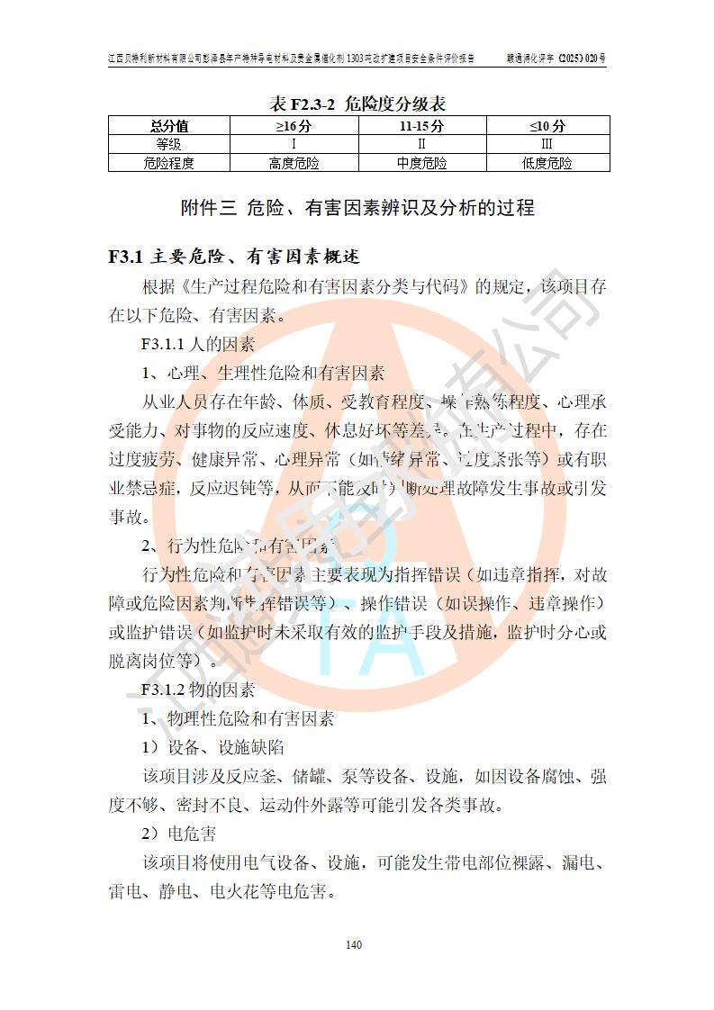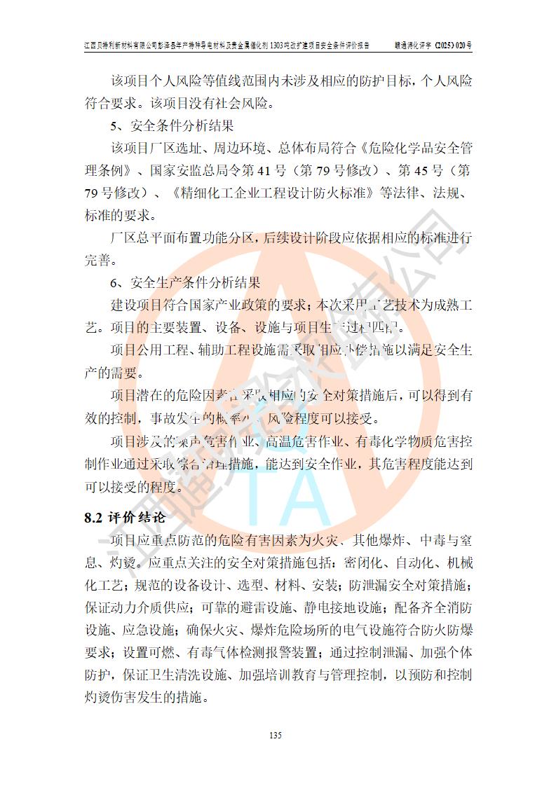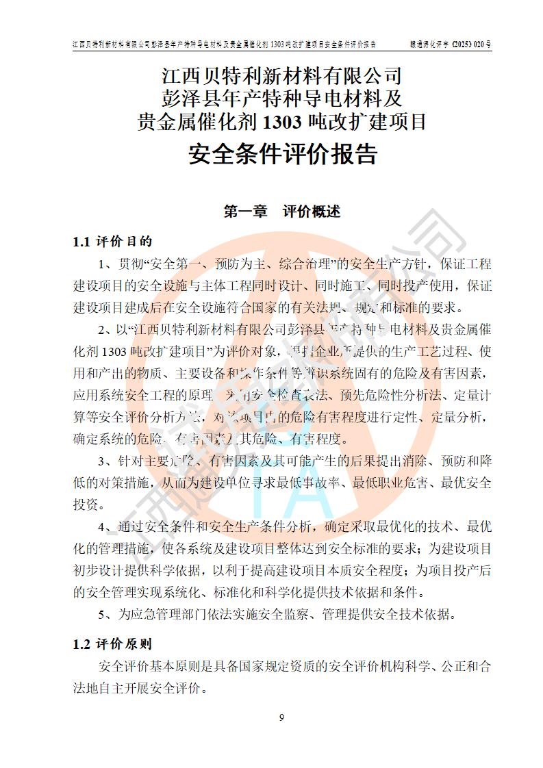 评价结论 | 江西贝特利新材料有限公司江西贝特利彭泽县年产特种导电材料及贵金属催化剂 1303吨改扩建项目的选址、总体布局、周边环境、自然环境能满足建设安全条件:项目选择的工艺过程及设备设施的安全可靠性能达到**法规、标准规定要求。 项目存在的危险有害因素可控,在落实本评价报告提出的有关安全对策措施后,其危险有害程度能达到可以接受的程度,项目建设能够实现安全运行的目标。 | |||||