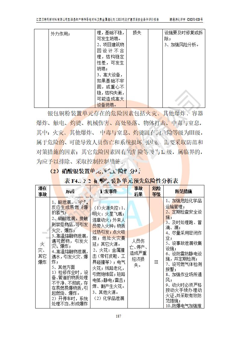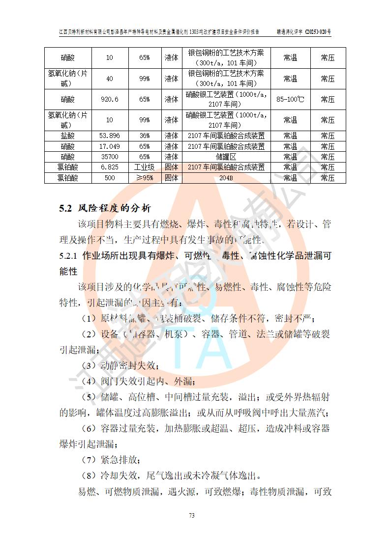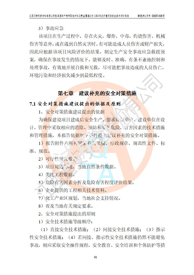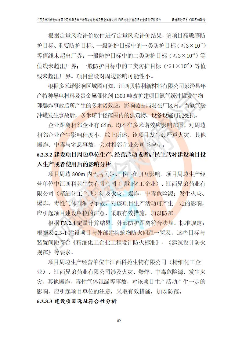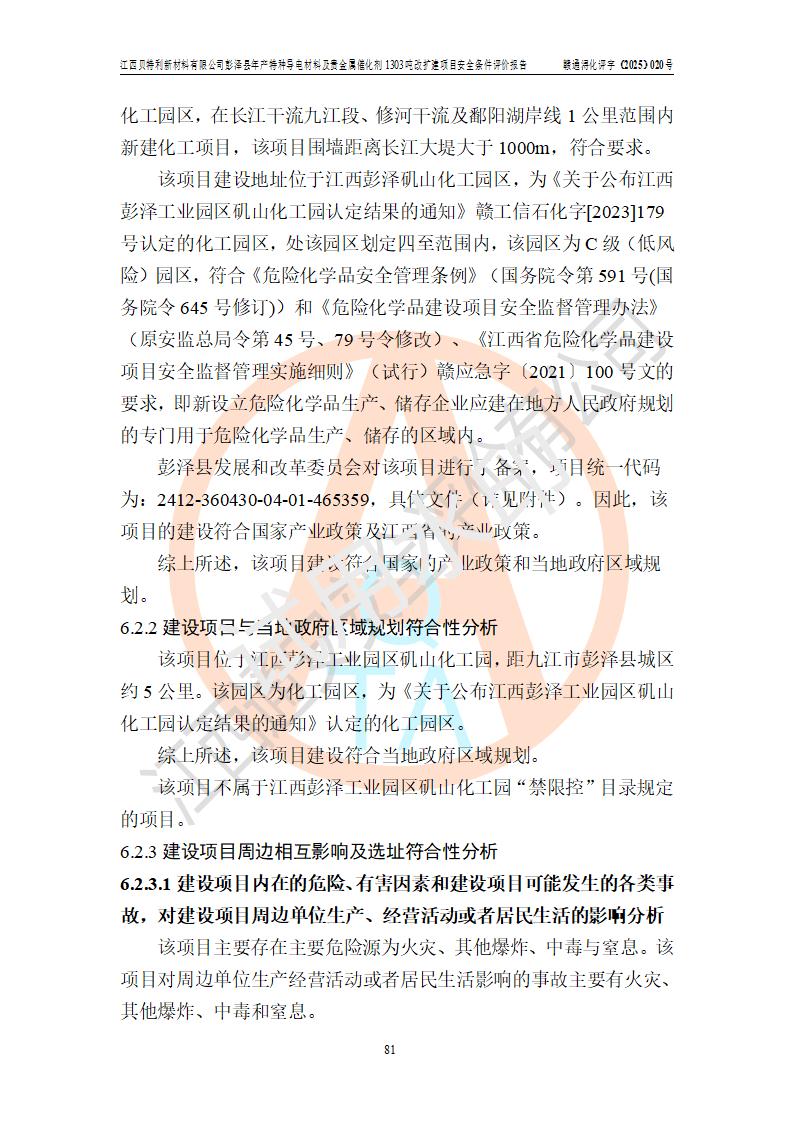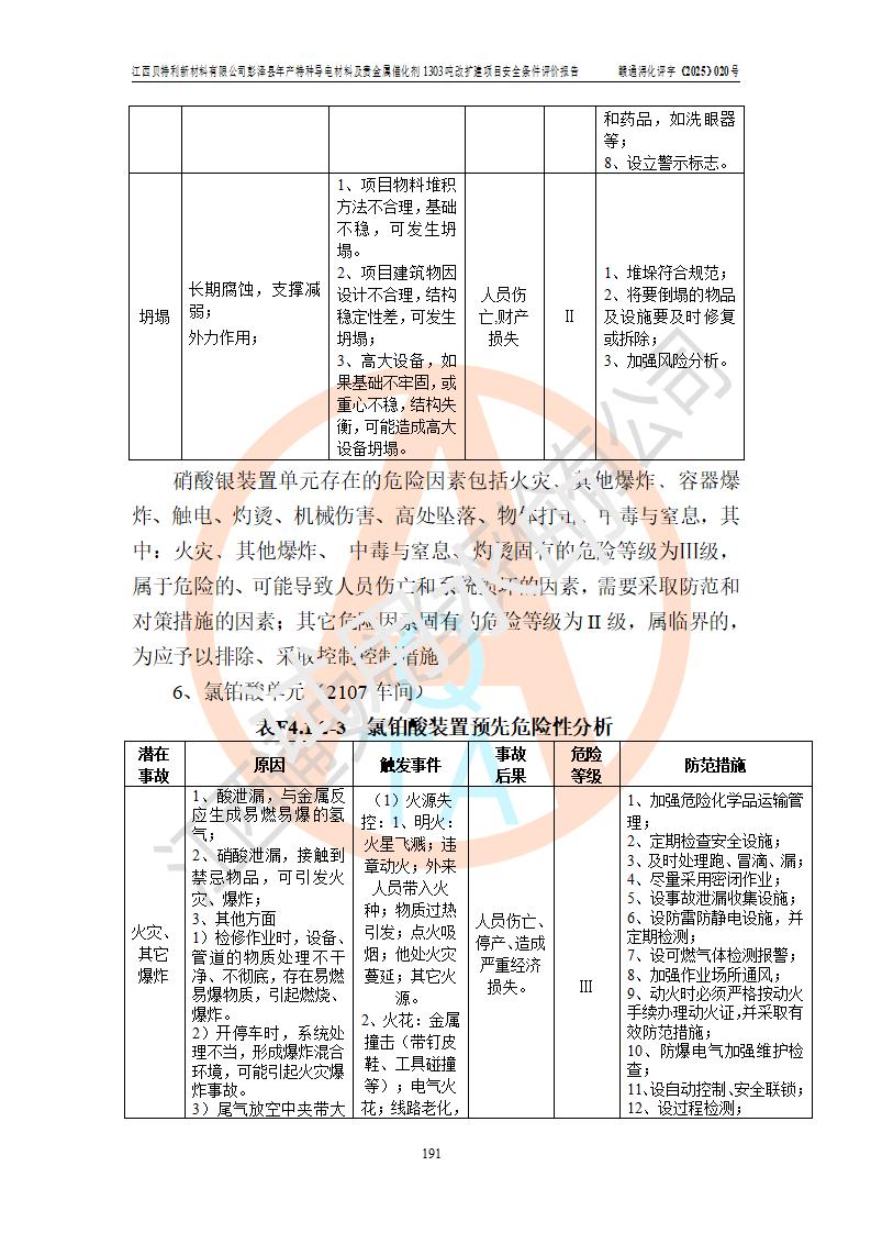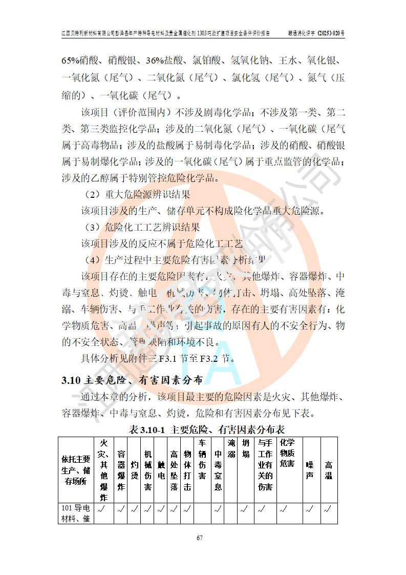 评价结论 | 江西贝特利新材料有限公司江西贝特利彭泽县年产特种导电材料及贵金属催化剂 1303吨改扩建项目的选址、总体布局、周边环境、自然环境能满足建设安全条件:项目选择的工艺过程及设备设施的安全可靠性能达到**法规、标准规定要求。 项目存在的危险有害因素可控,在落实本评价报告提出的有关安全对策措施后,其危险有害程度能达到可以接受的程度,项目建设能够实现安全运行的目标。 | |||||