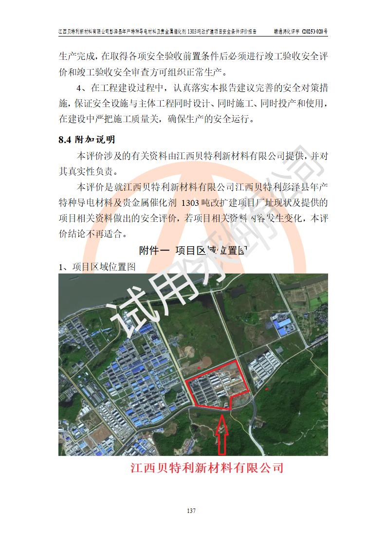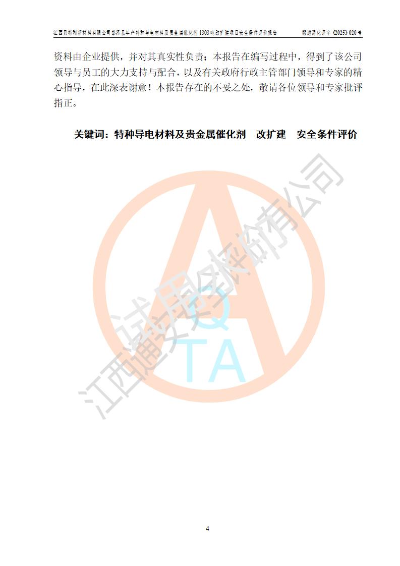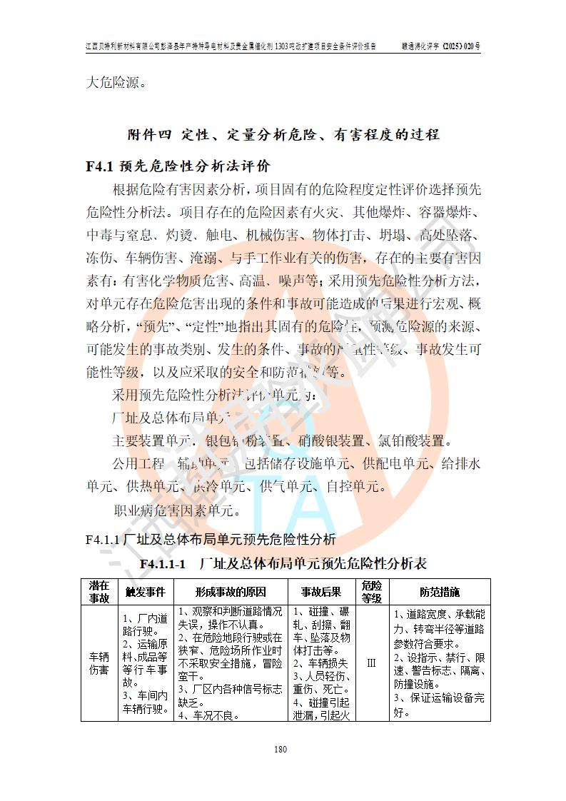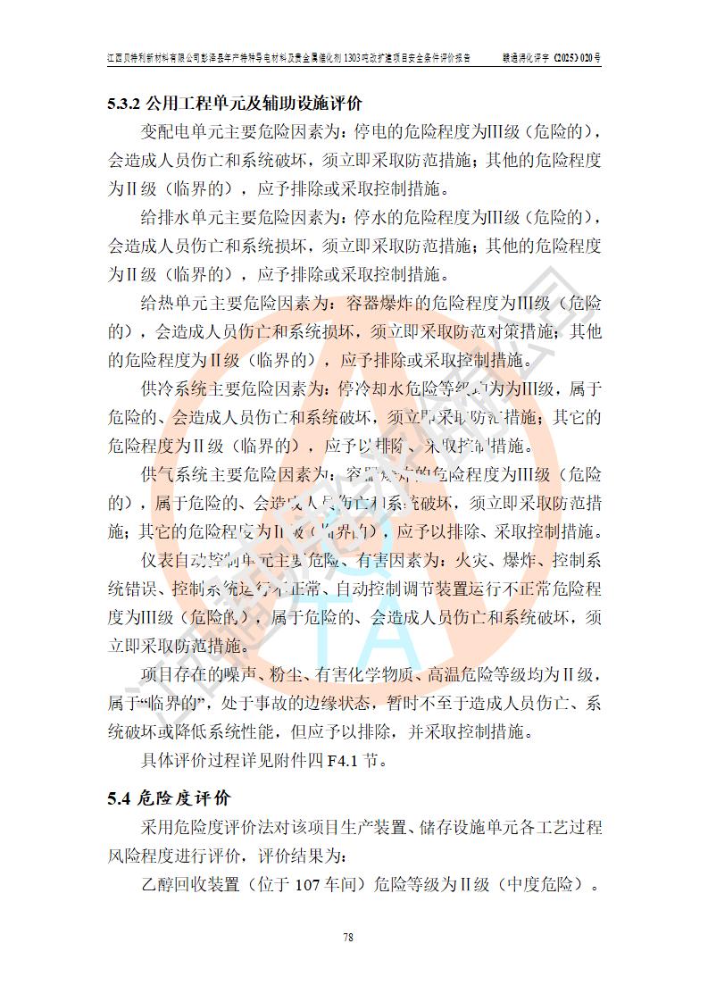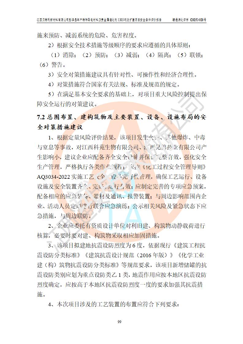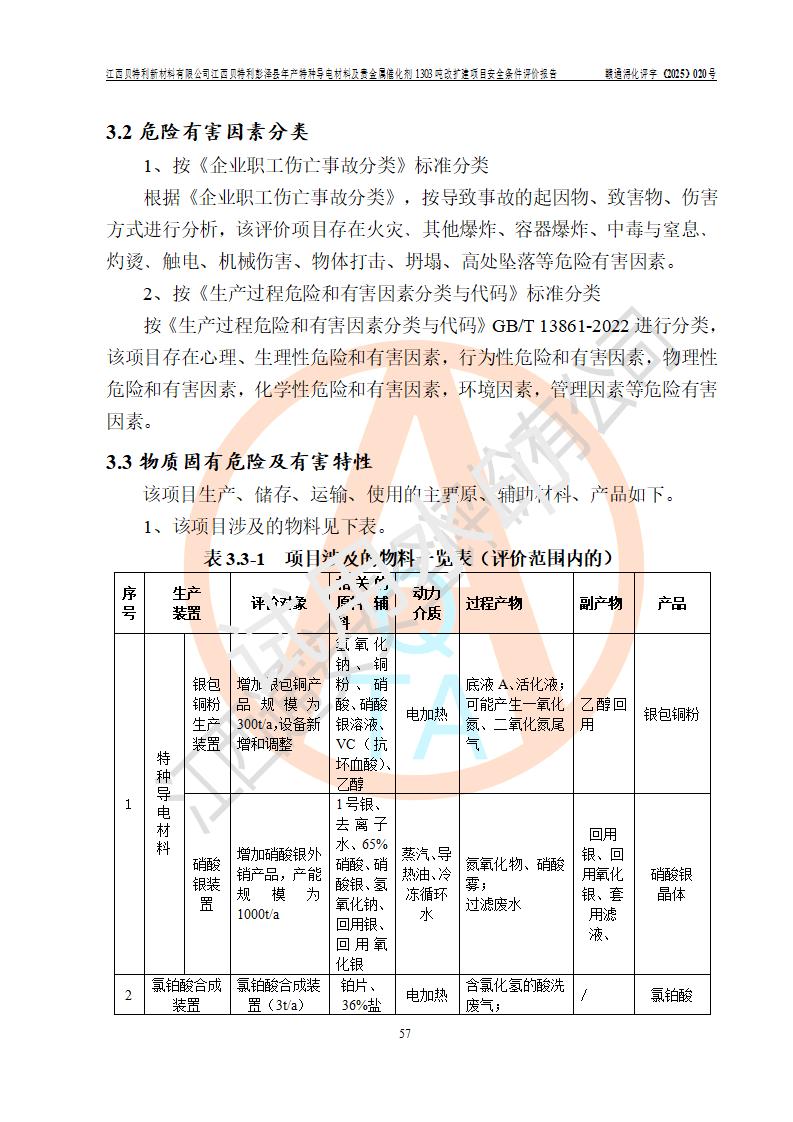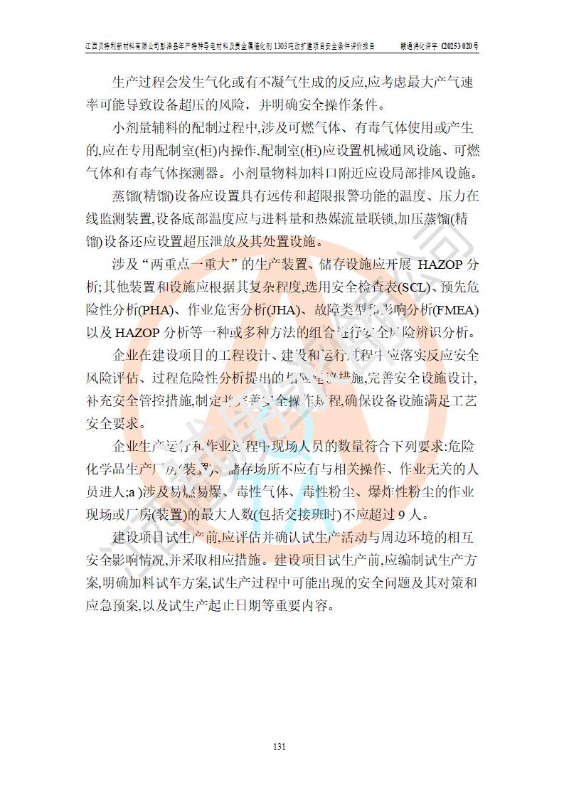 评价结论 | 江西贝特利新材料有限公司江西贝特利彭泽县年产特种导电材料及贵金属催化剂 1303吨改扩建项目的选址、总体布局、周边环境、自然环境能满足建设安全条件:项目选择的工艺过程及设备设施的安全可靠性能达到**法规、标准规定要求。 项目存在的危险有害因素可控,在落实本评价报告提出的有关安全对策措施后,其危险有害程度能达到可以接受的程度,项目建设能够实现安全运行的目标。 | |||||