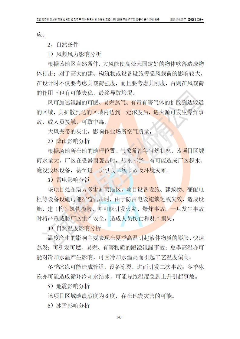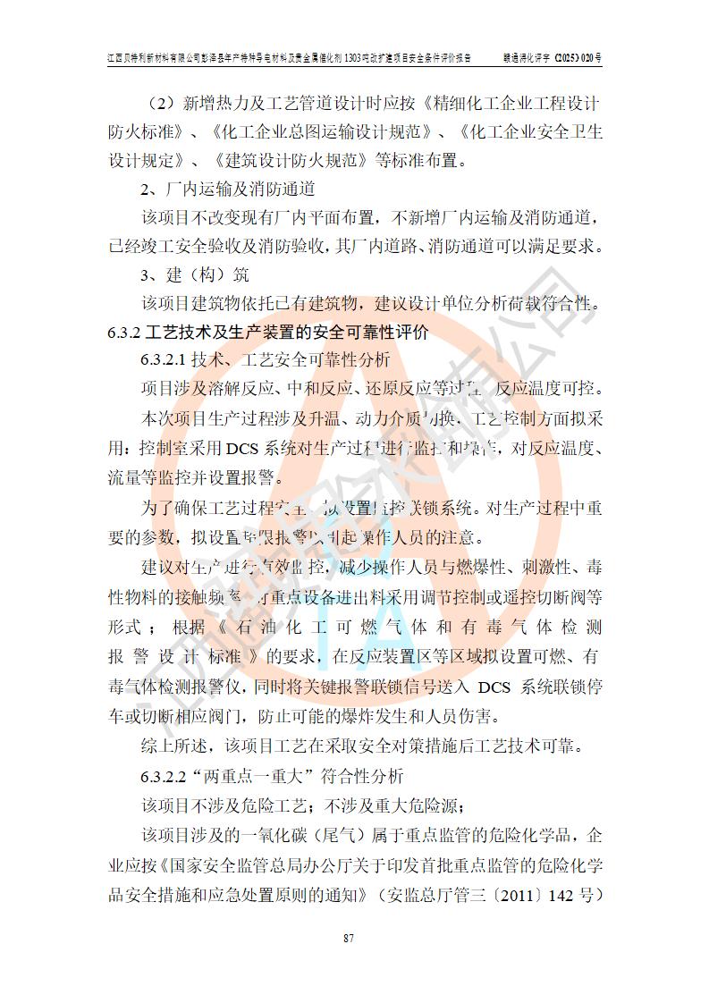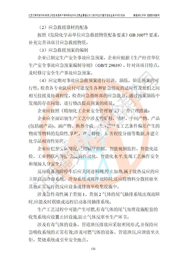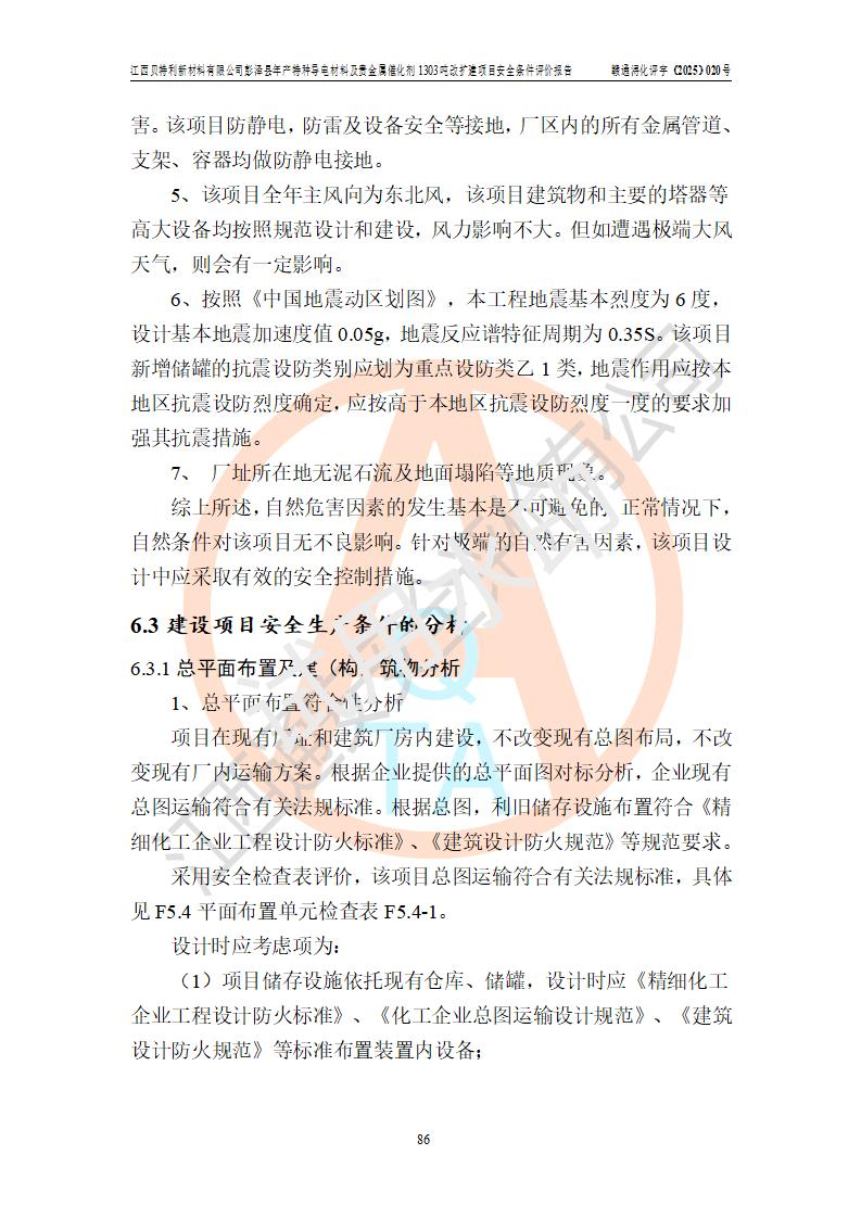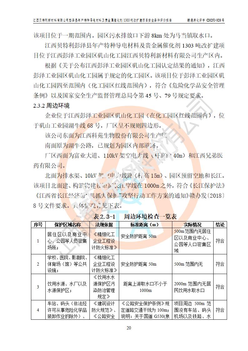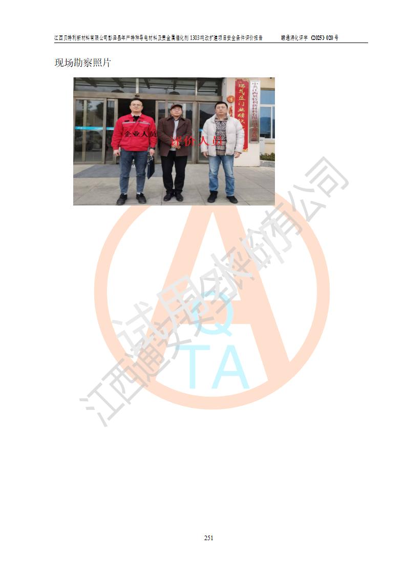评价结论 | 江西贝特利新材料有限公司江西贝特利彭泽县年产特种导电材料及贵金属催化剂 1303吨改扩建项目的选址、总体布局、周边环境、自然环境能满足建设安全条件:项目选择的工艺过程及设备设施的安全可靠性能达到**法规、标准规定要求。 项目存在的危险有害因素可控,在落实本评价报告提出的有关安全对策措施后,其危险有害程度能达到可以接受的程度,项目建设能够实现安全运行的目标。 | |||||