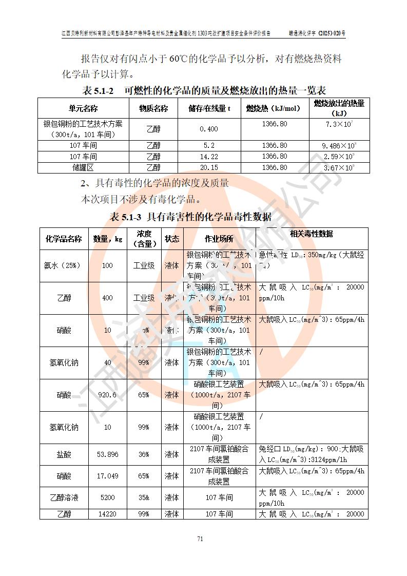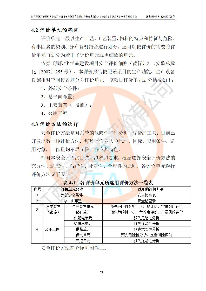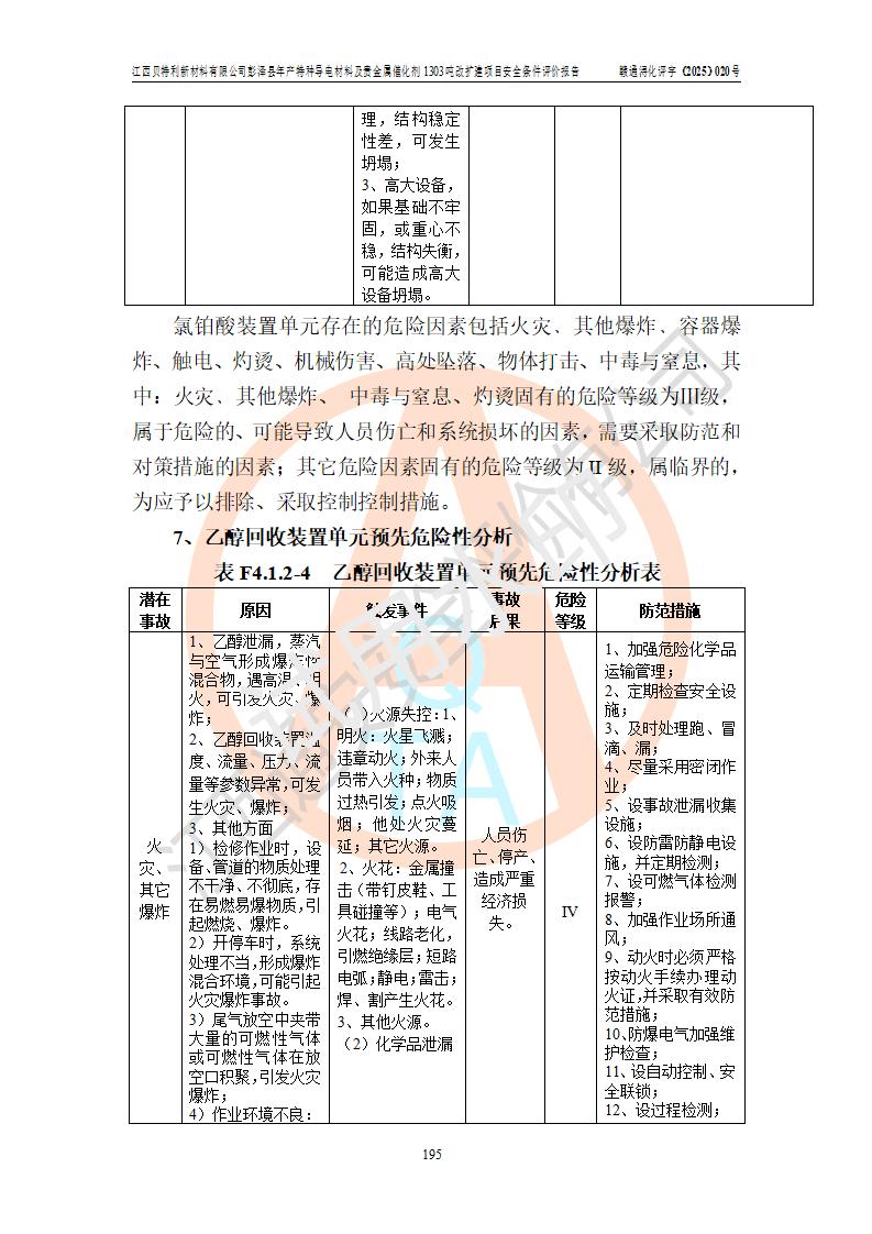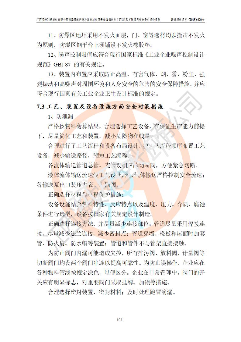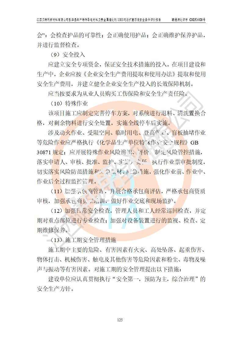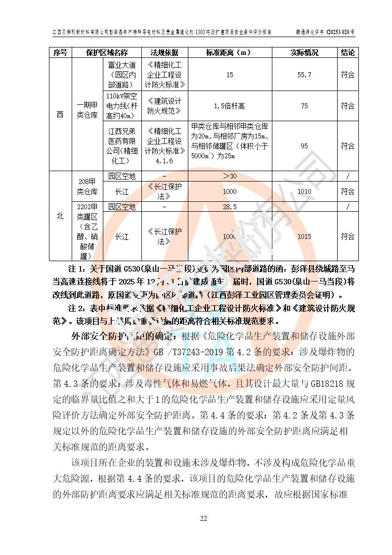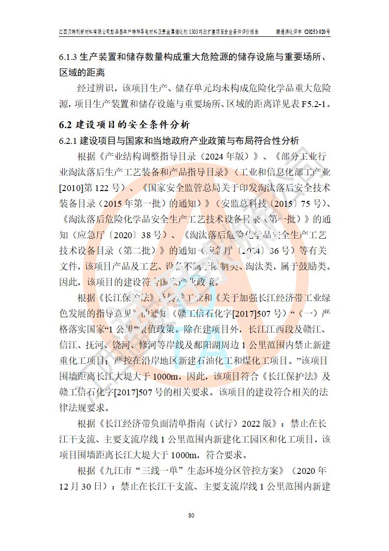 评价结论 | 江西贝特利新材料有限公司江西贝特利彭泽县年产特种导电材料及贵金属催化剂 1303吨改扩建项目的选址、总体布局、周边环境、自然环境能满足建设安全条件:项目选择的工艺过程及设备设施的安全可靠性能达到**法规、标准规定要求。 项目存在的危险有害因素可控,在落实本评价报告提出的有关安全对策措施后,其危险有害程度能达到可以接受的程度,项目建设能够实现安全运行的目标。 | |||||