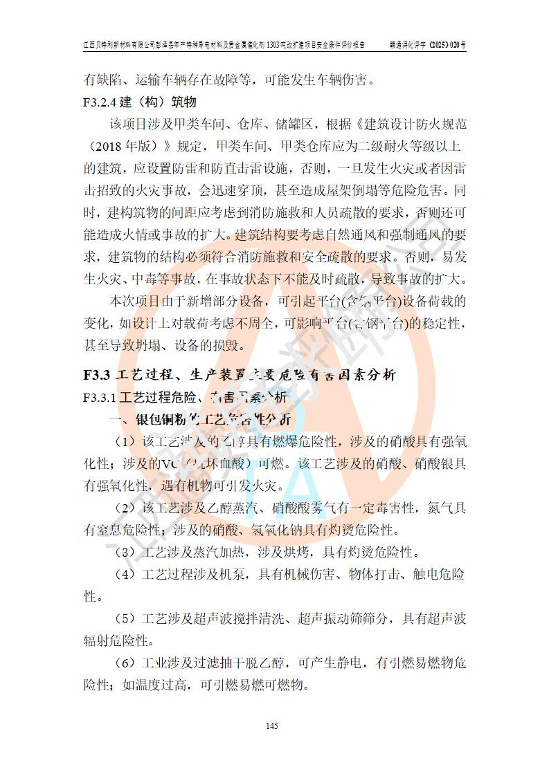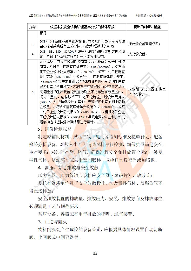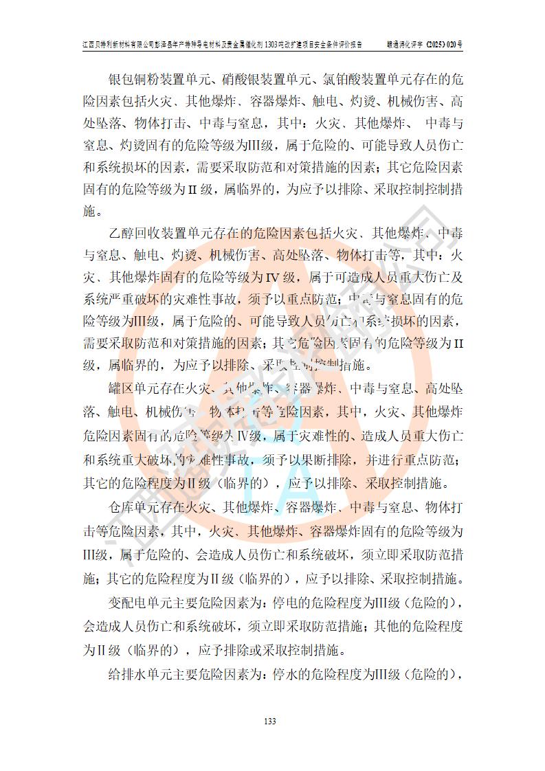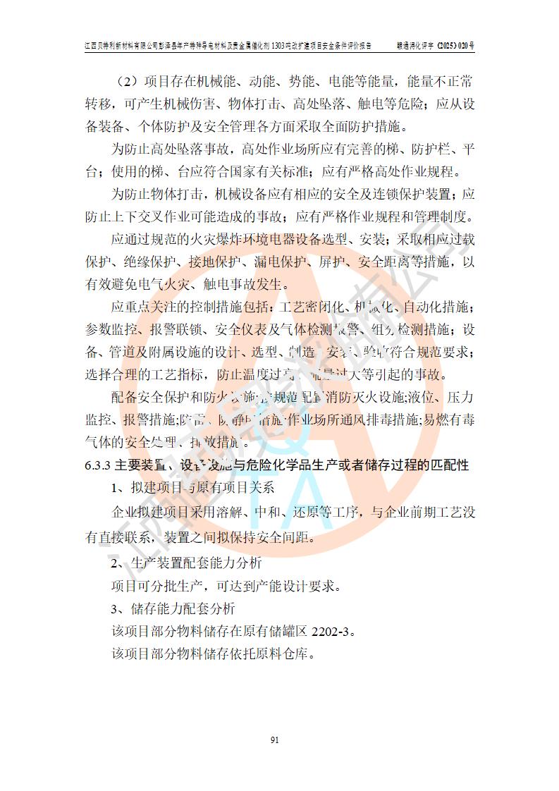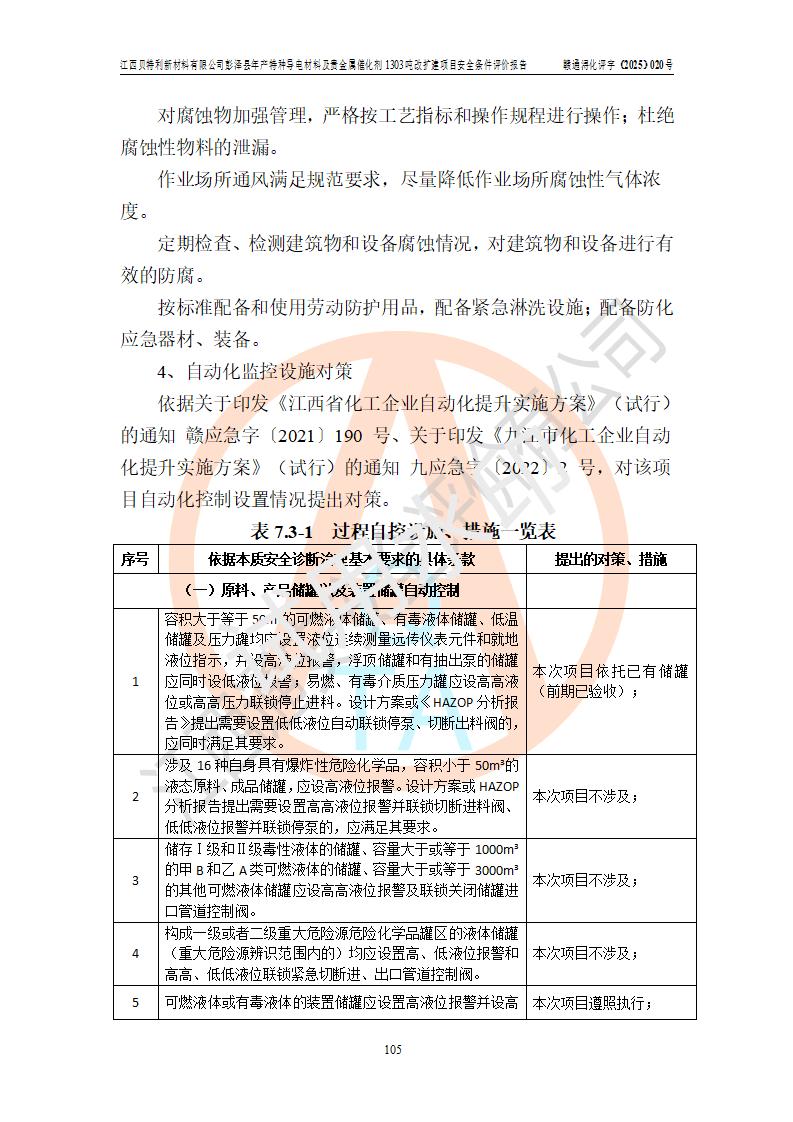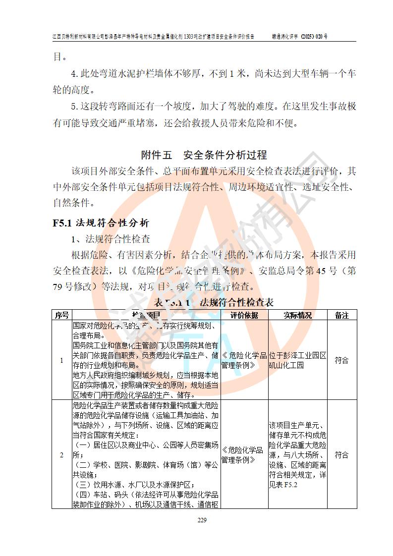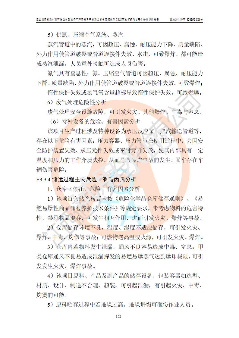 评价结论 | 江西贝特利新材料有限公司江西贝特利彭泽县年产特种导电材料及贵金属催化剂 1303吨改扩建项目的选址、总体布局、周边环境、自然环境能满足建设安全条件:项目选择的工艺过程及设备设施的安全可靠性能达到**法规、标准规定要求。 项目存在的危险有害因素可控,在落实本评价报告提出的有关安全对策措施后,其危险有害程度能达到可以接受的程度,项目建设能够实现安全运行的目标。 | |||||
