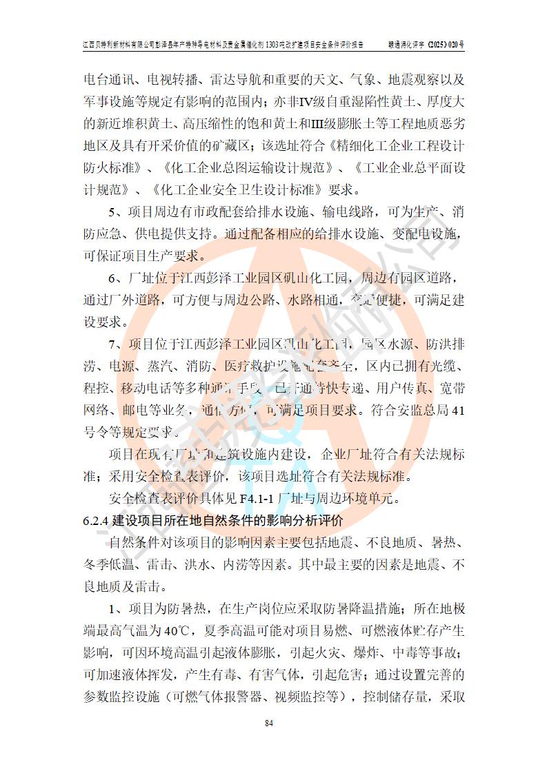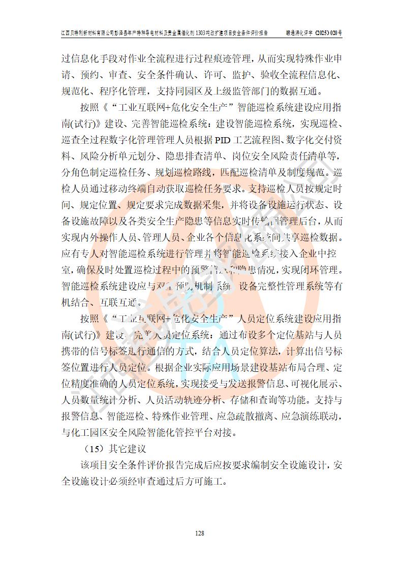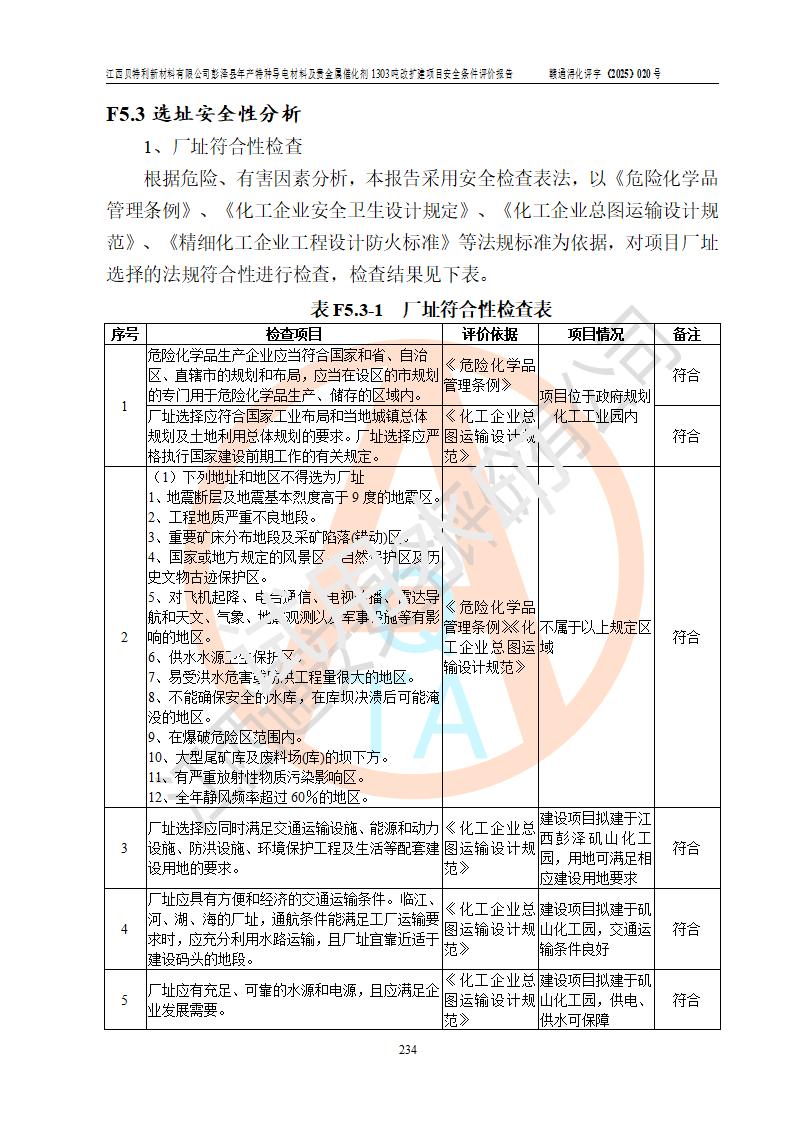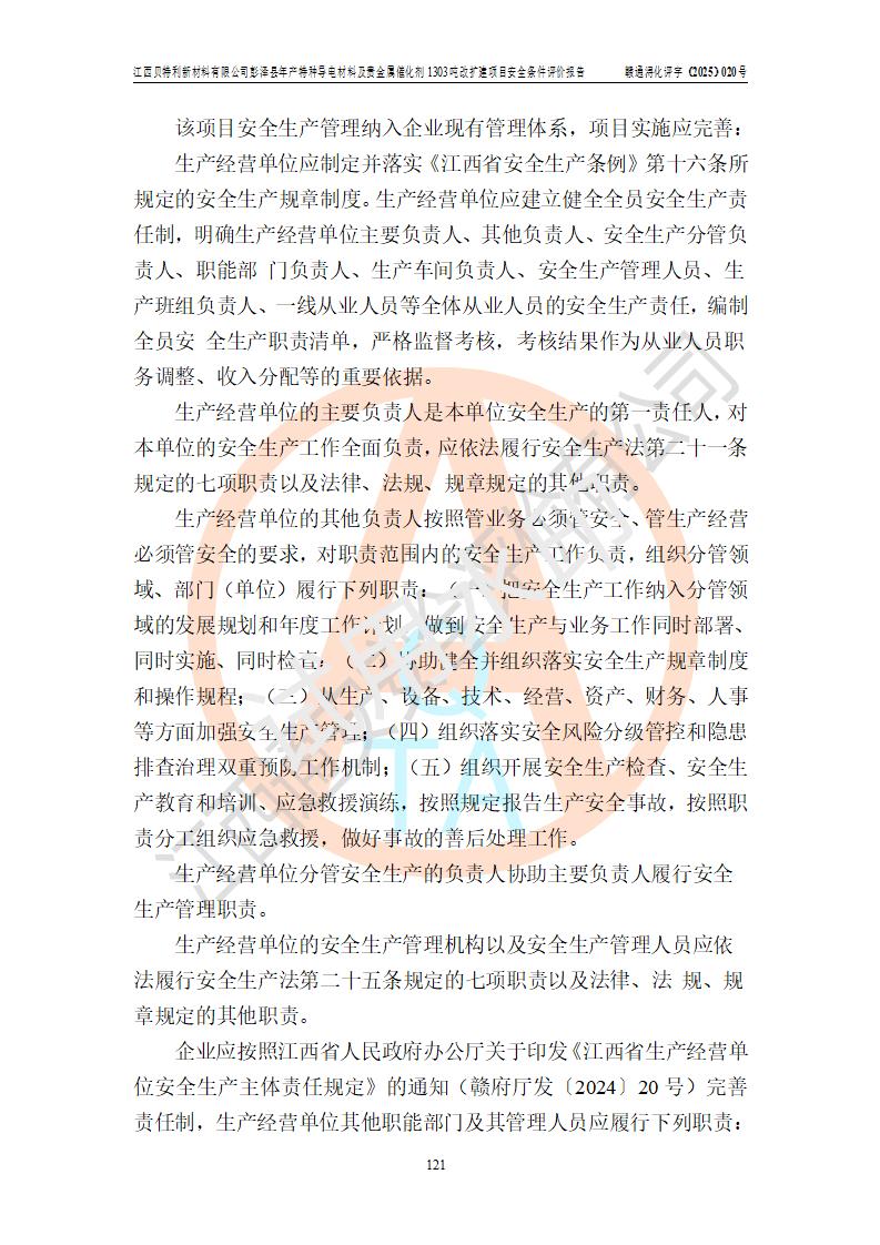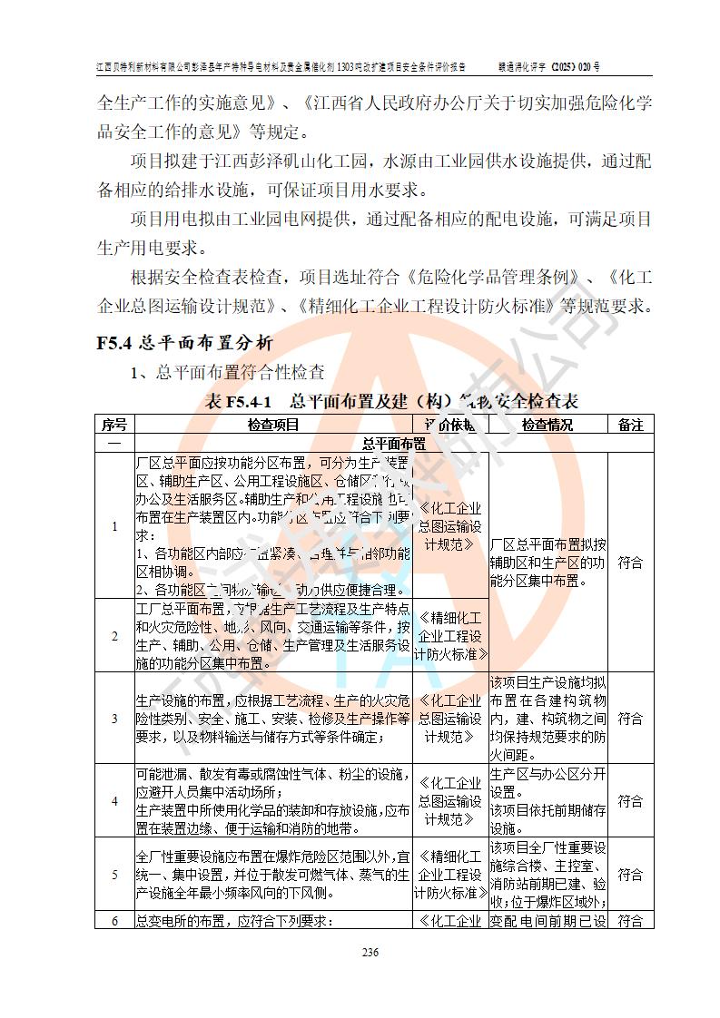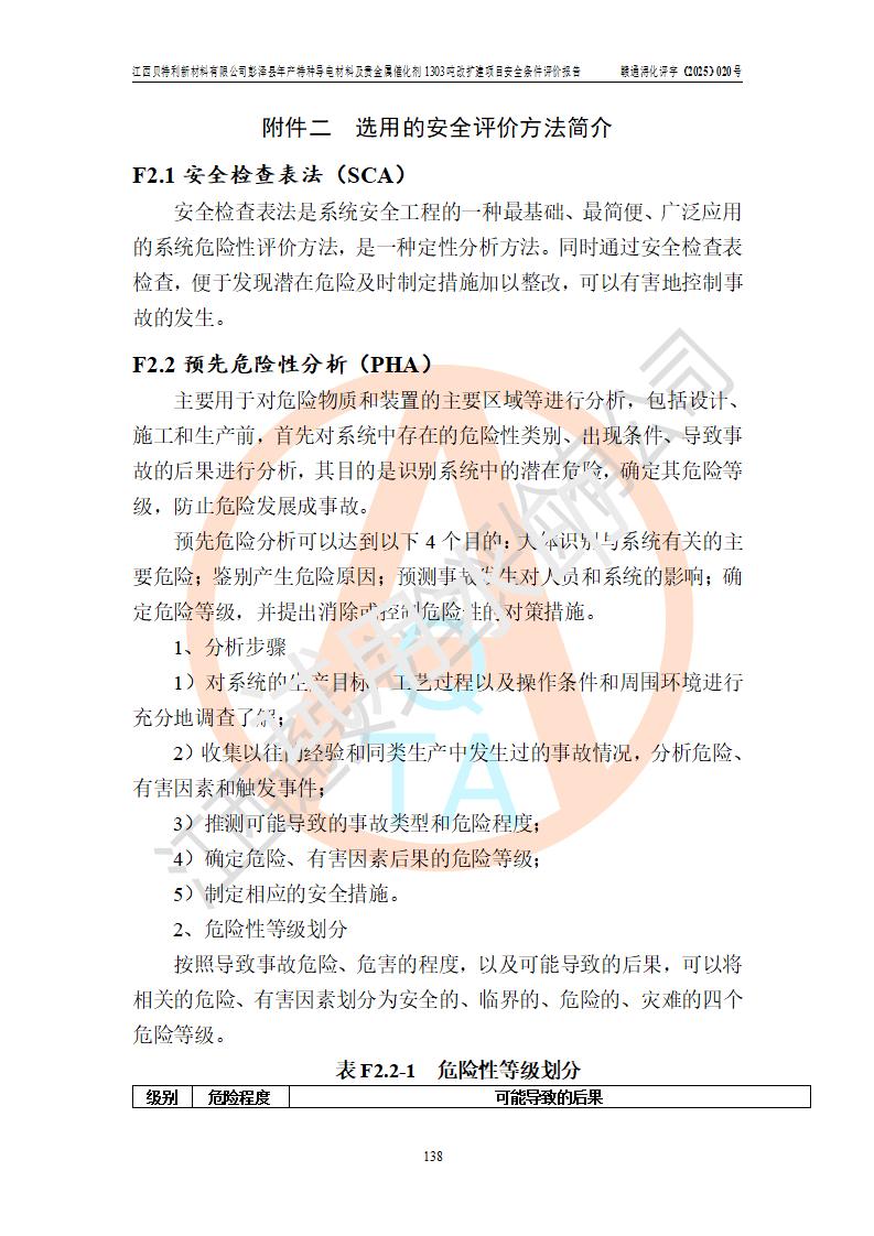 评价结论 | 江西贝特利新材料有限公司江西贝特利彭泽县年产特种导电材料及贵金属催化剂 1303吨改扩建项目的选址、总体布局、周边环境、自然环境能满足建设安全条件:项目选择的工艺过程及设备设施的安全可靠性能达到**法规、标准规定要求。 项目存在的危险有害因素可控,在落实本评价报告提出的有关安全对策措施后,其危险有害程度能达到可以接受的程度,项目建设能够实现安全运行的目标。 | |||||