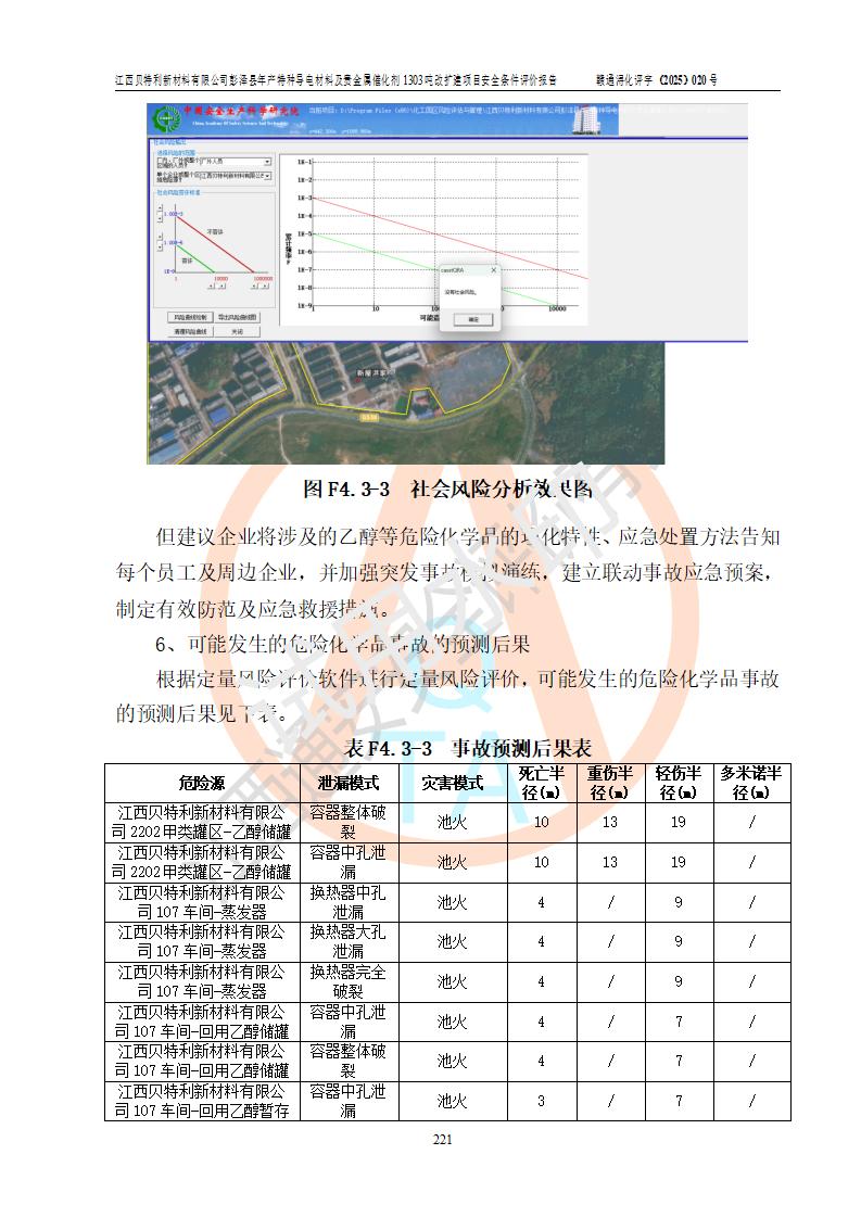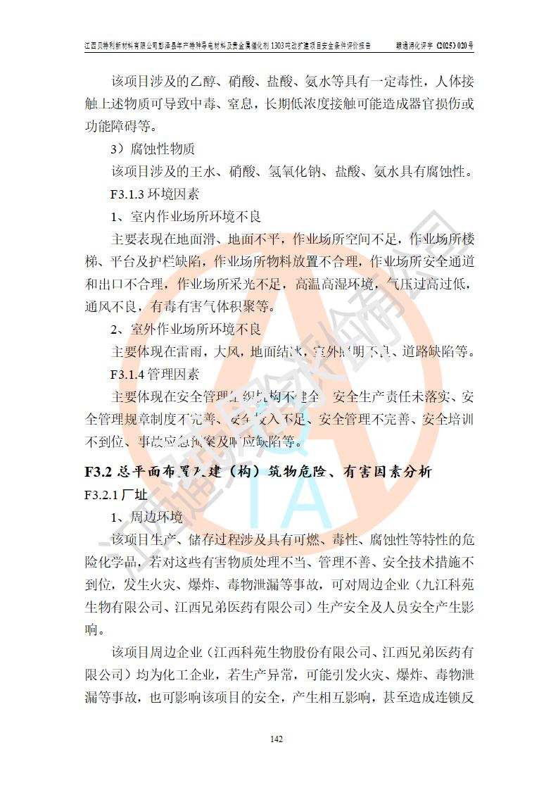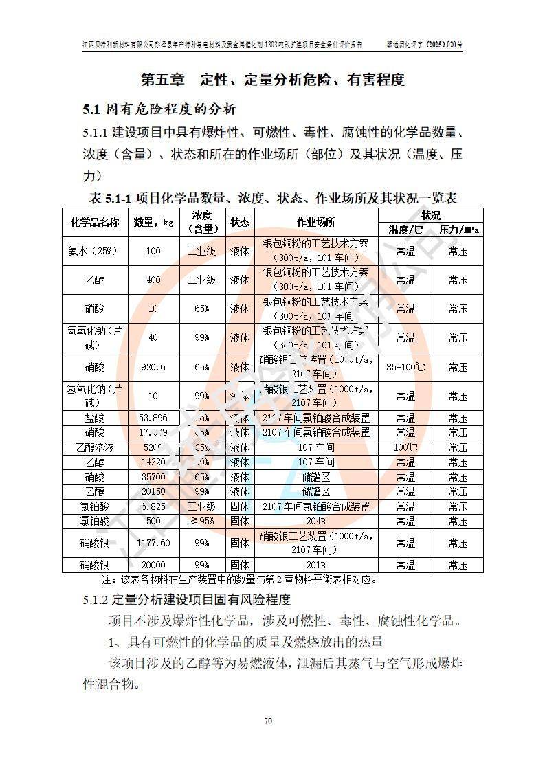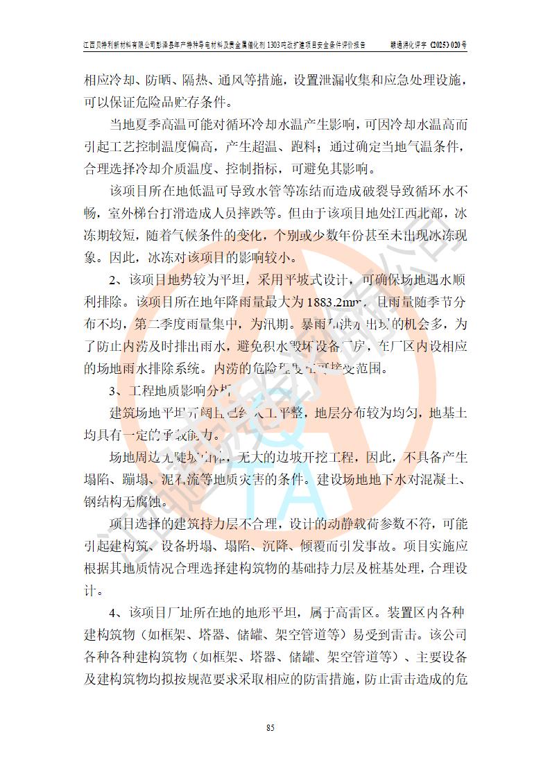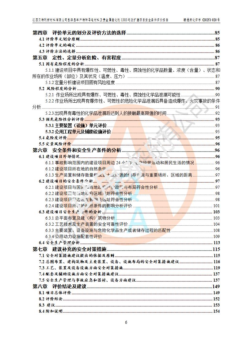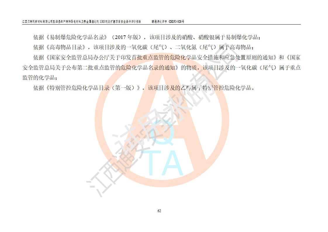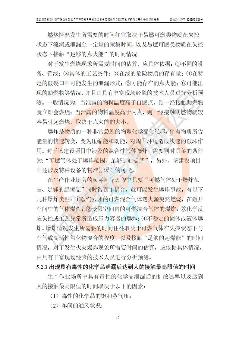 评价结论 | 江西贝特利新材料有限公司江西贝特利彭泽县年产特种导电材料及贵金属催化剂 1303吨改扩建项目的选址、总体布局、周边环境、自然环境能满足建设安全条件:项目选择的工艺过程及设备设施的安全可靠性能达到**法规、标准规定要求。 项目存在的危险有害因素可控,在落实本评价报告提出的有关安全对策措施后,其危险有害程度能达到可以接受的程度,项目建设能够实现安全运行的目标。 | |||||