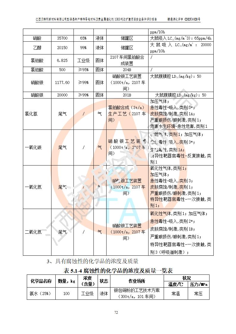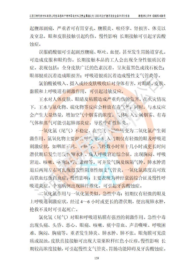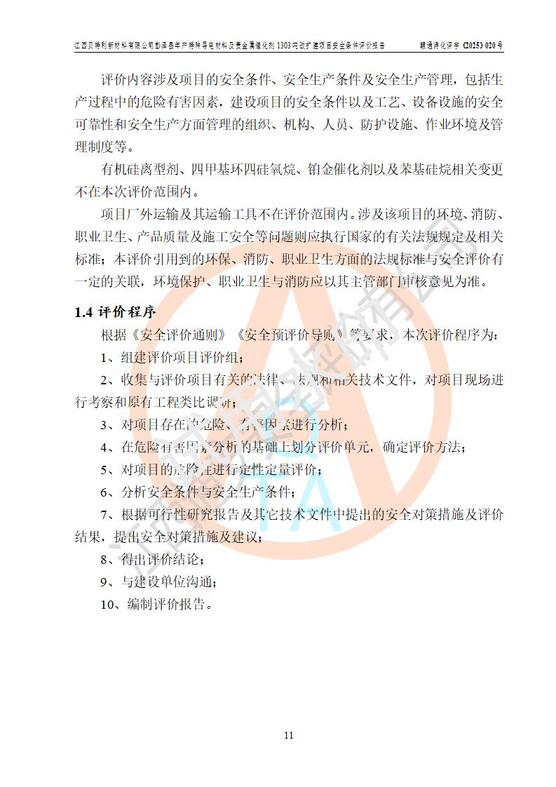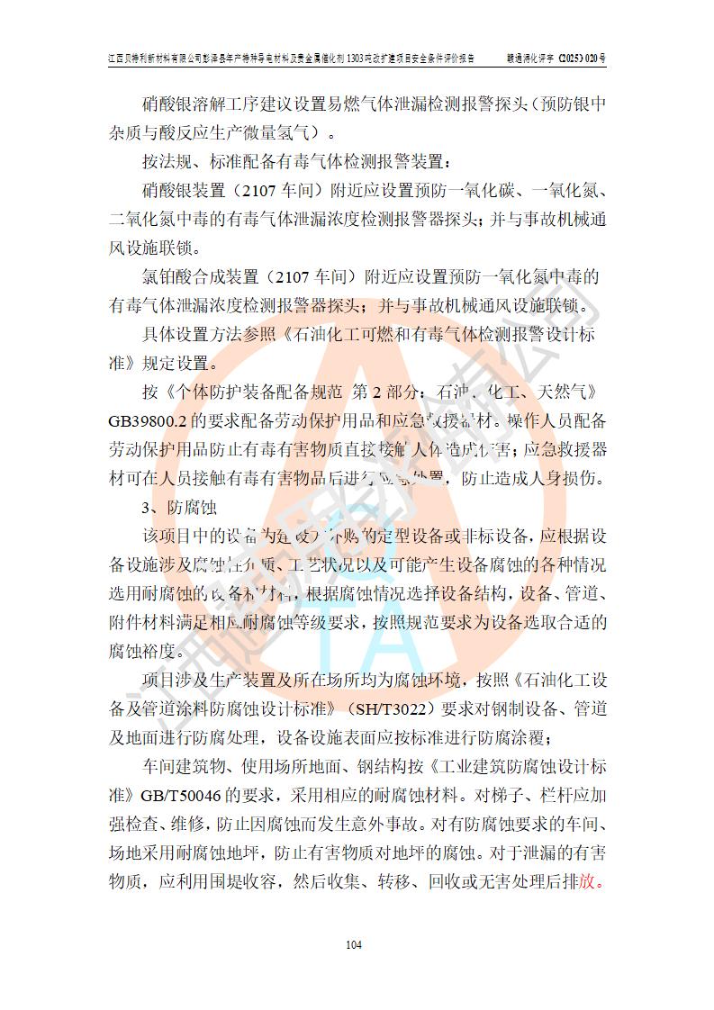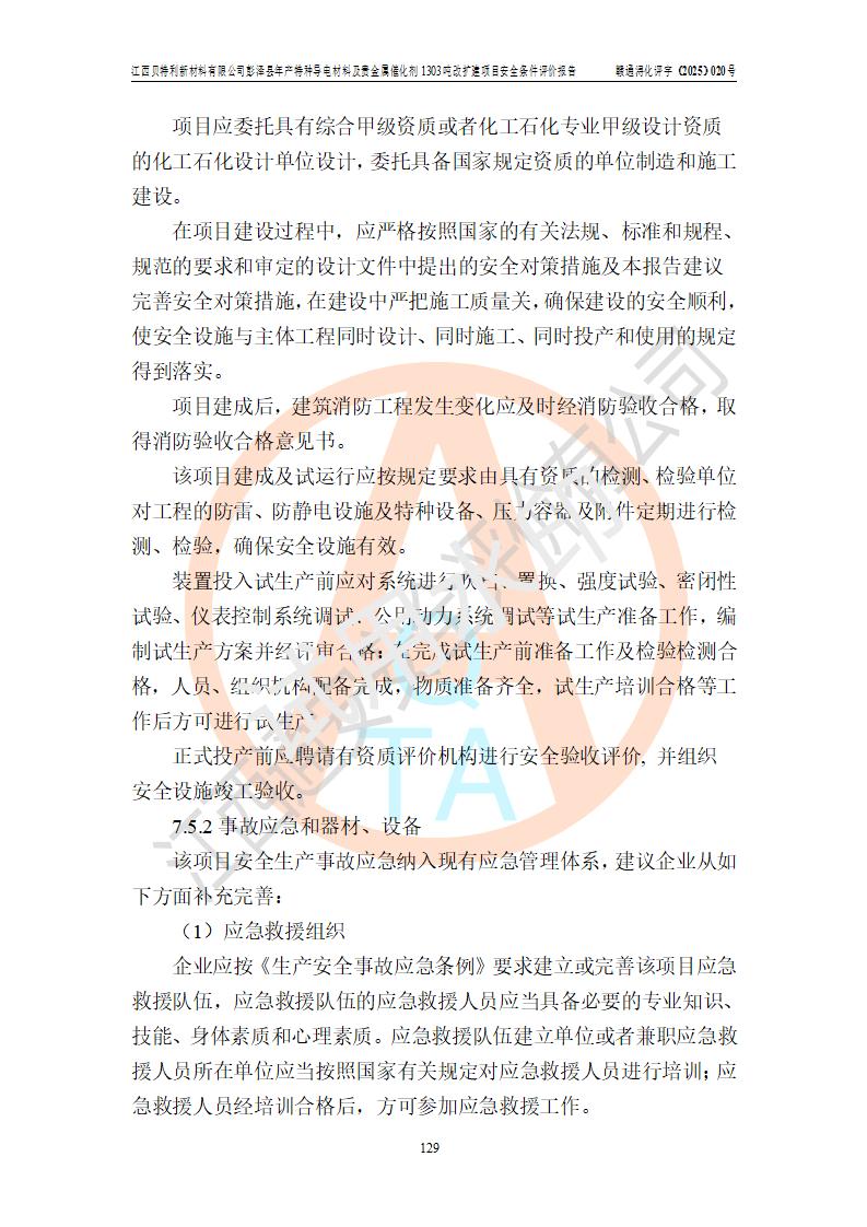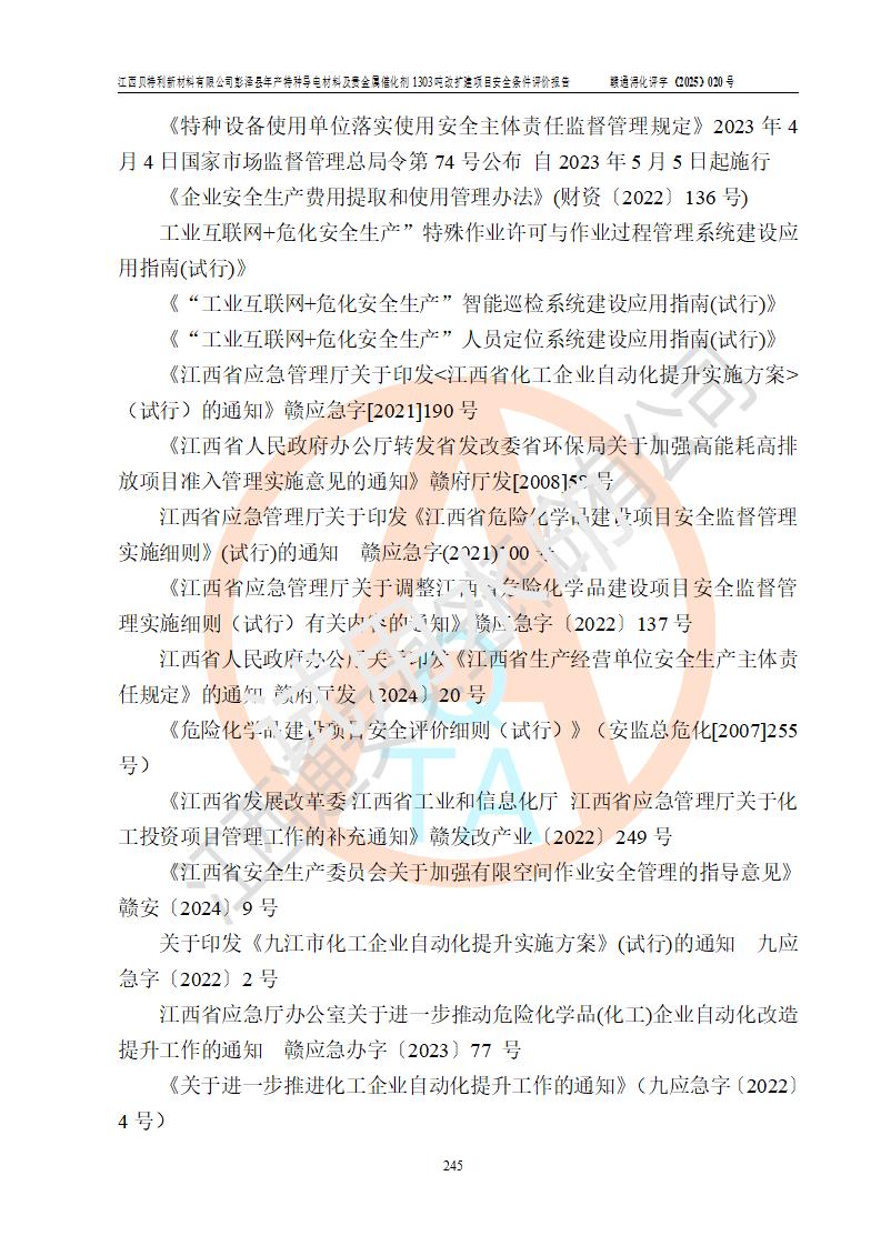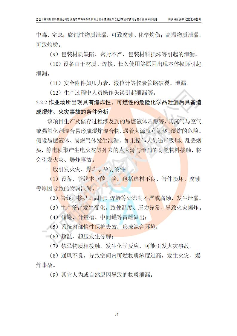 评价结论 | 江西贝特利新材料有限公司江西贝特利彭泽县年产特种导电材料及贵金属催化剂 1303吨改扩建项目的选址、总体布局、周边环境、自然环境能满足建设安全条件:项目选择的工艺过程及设备设施的安全可靠性能达到**法规、标准规定要求。 项目存在的危险有害因素可控,在落实本评价报告提出的有关安全对策措施后,其危险有害程度能达到可以接受的程度,项目建设能够实现安全运行的目标。 | |||||