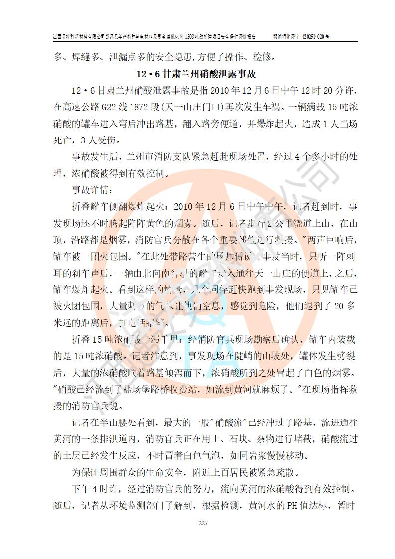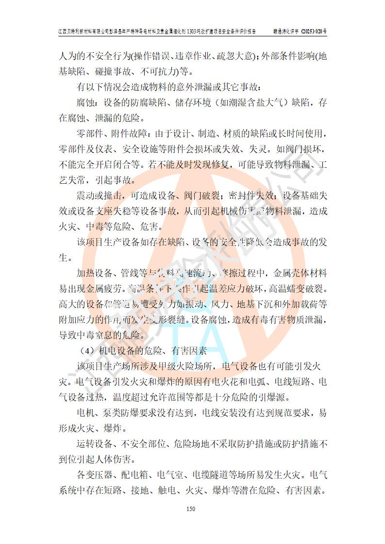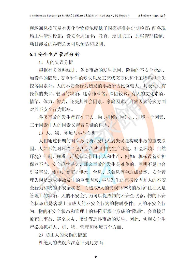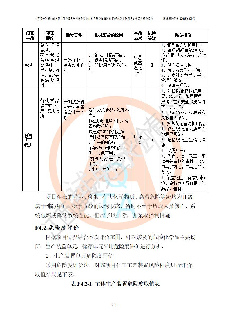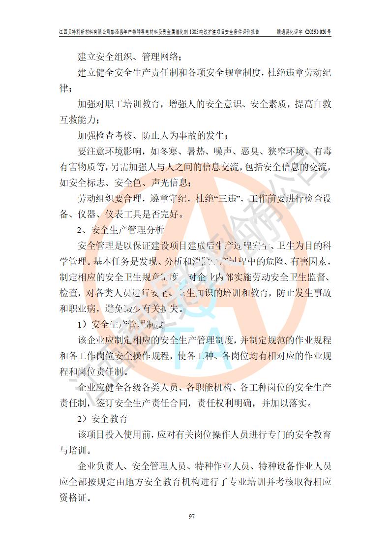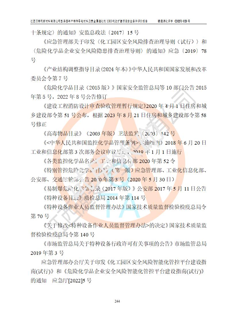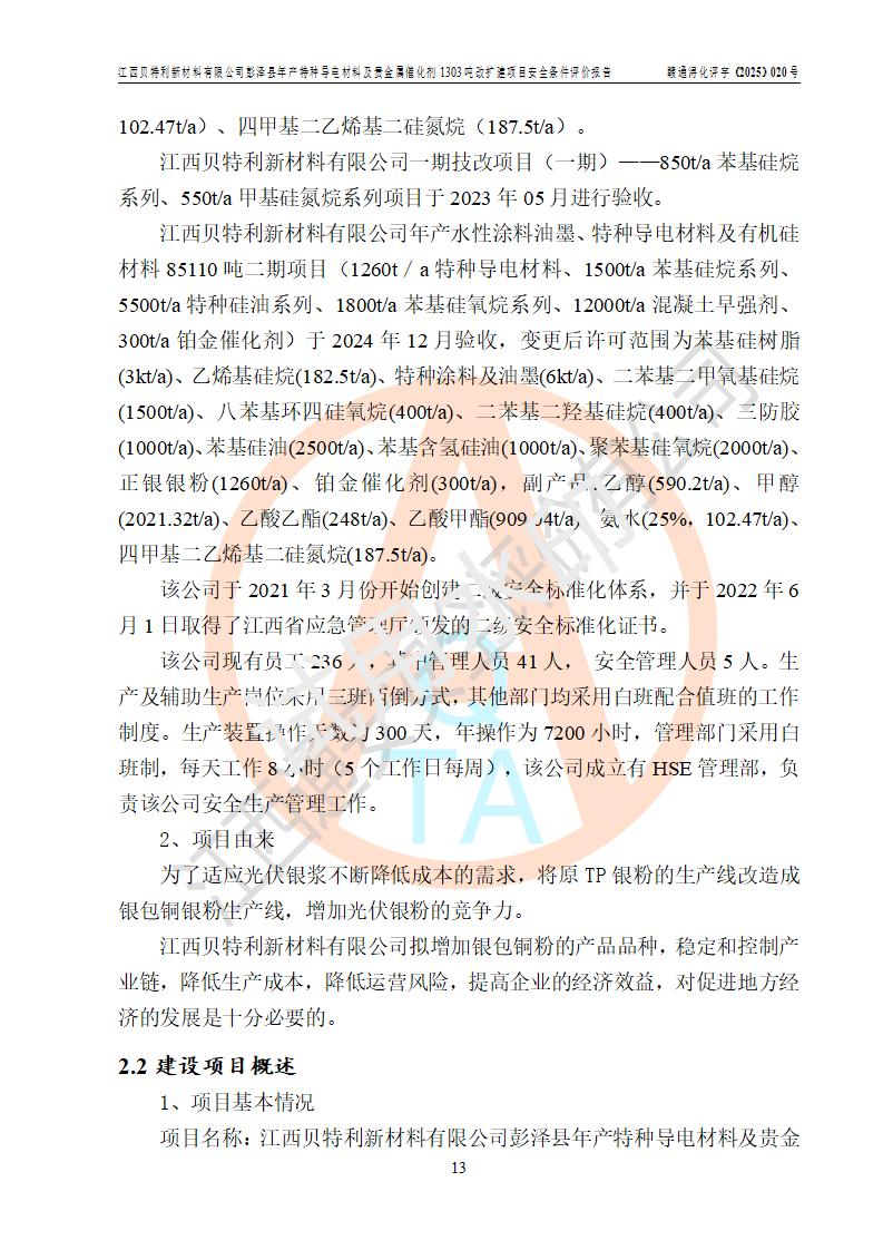 评价结论 | 江西贝特利新材料有限公司江西贝特利彭泽县年产特种导电材料及贵金属催化剂 1303吨改扩建项目的选址、总体布局、周边环境、自然环境能满足建设安全条件:项目选择的工艺过程及设备设施的安全可靠性能达到**法规、标准规定要求。 项目存在的危险有害因素可控,在落实本评价报告提出的有关安全对策措施后,其危险有害程度能达到可以接受的程度,项目建设能够实现安全运行的目标。 | |||||