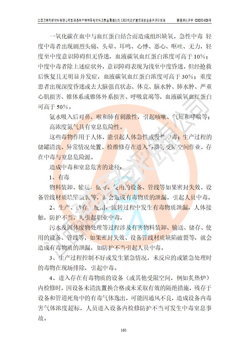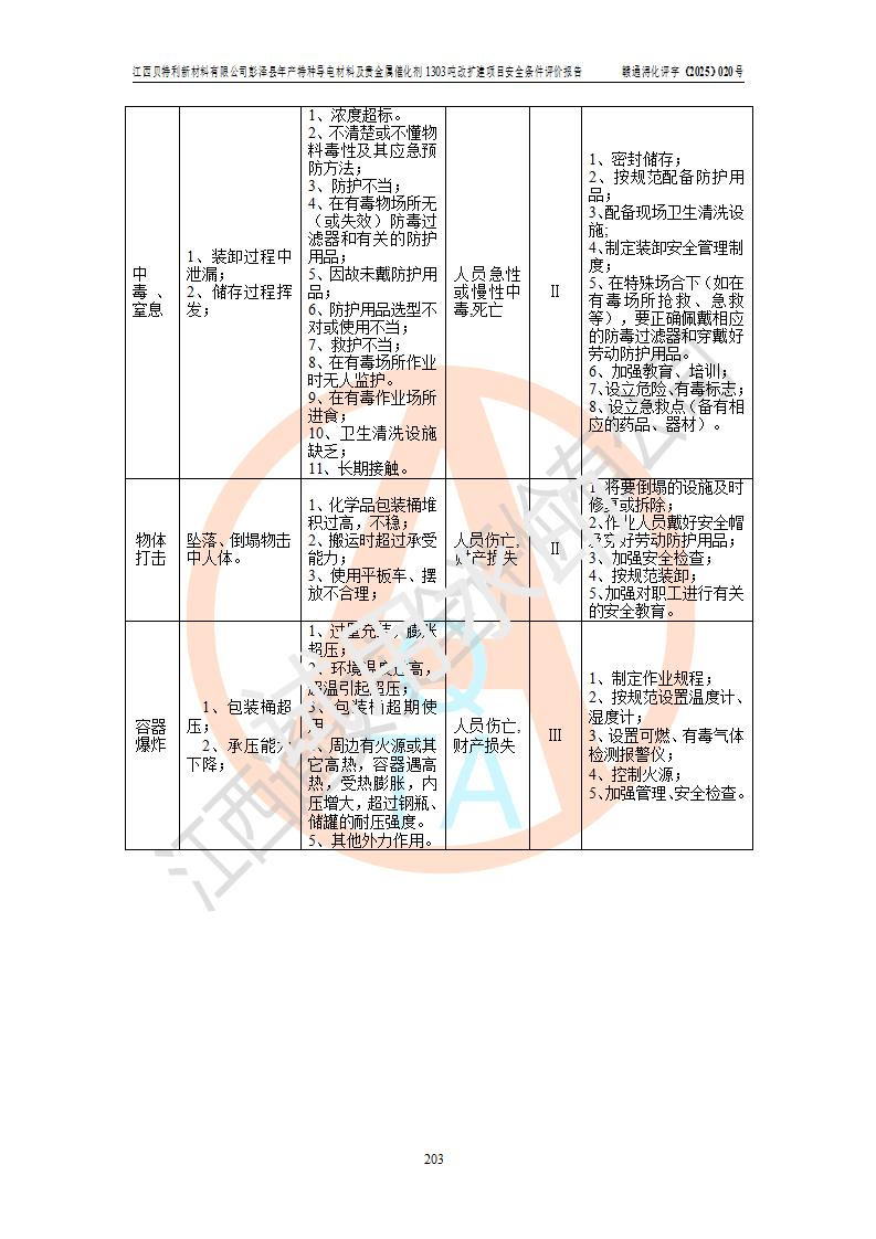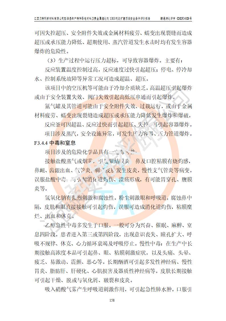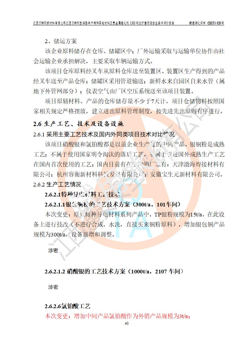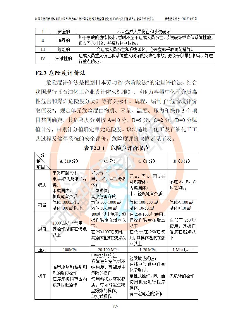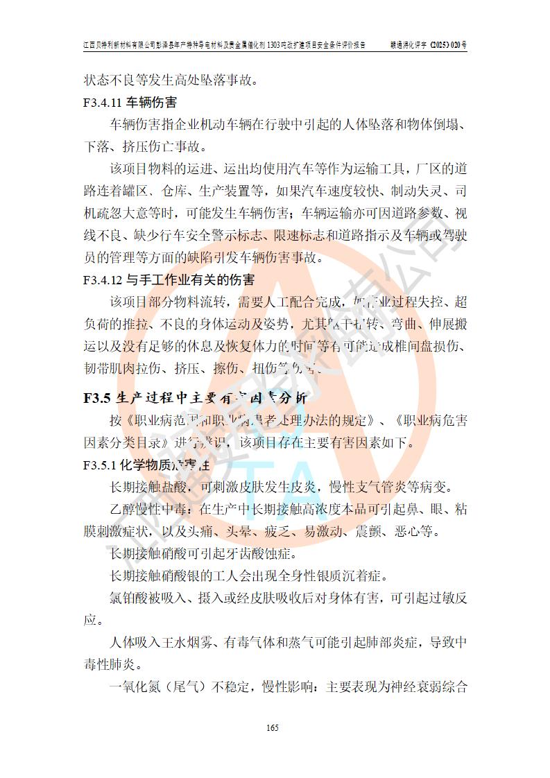 评价结论 | 江西贝特利新材料有限公司江西贝特利彭泽县年产特种导电材料及贵金属催化剂 1303吨改扩建项目的选址、总体布局、周边环境、自然环境能满足建设安全条件:项目选择的工艺过程及设备设施的安全可靠性能达到**法规、标准规定要求。 项目存在的危险有害因素可控,在落实本评价报告提出的有关安全对策措施后,其危险有害程度能达到可以接受的程度,项目建设能够实现安全运行的目标。 | |||||