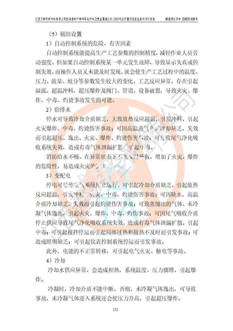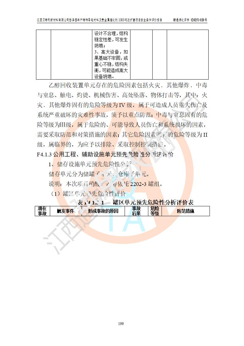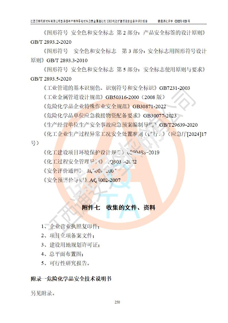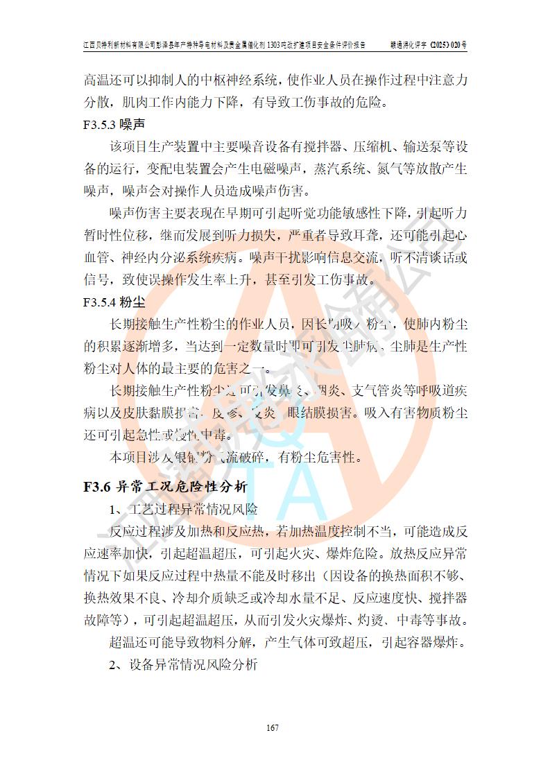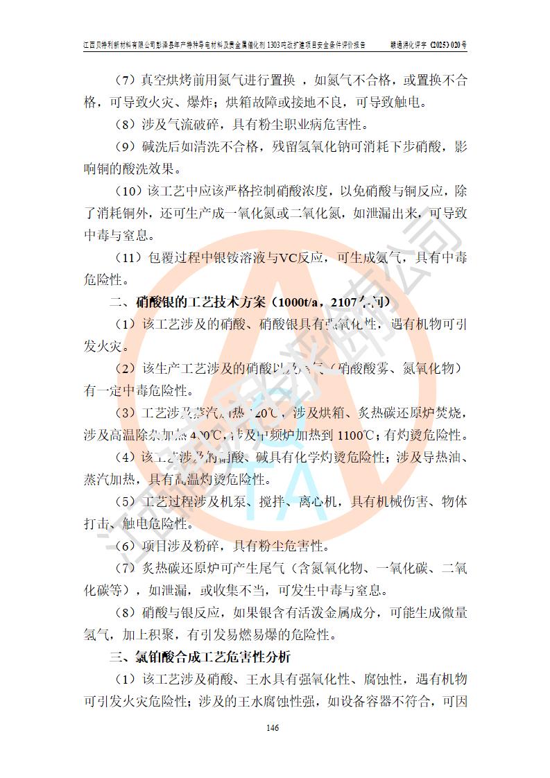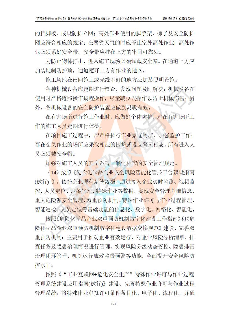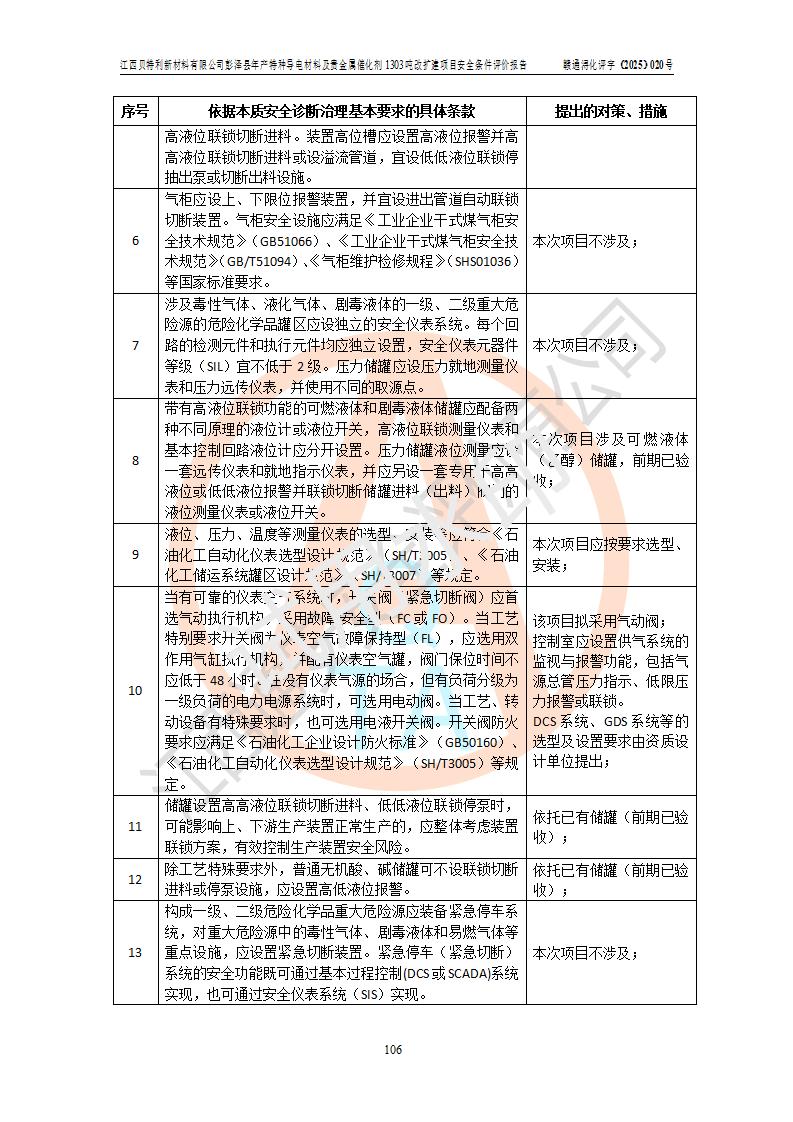 评价结论 | 江西贝特利新材料有限公司江西贝特利彭泽县年产特种导电材料及贵金属催化剂 1303吨改扩建项目的选址、总体布局、周边环境、自然环境能满足建设安全条件:项目选择的工艺过程及设备设施的安全可靠性能达到**法规、标准规定要求。 项目存在的危险有害因素可控,在落实本评价报告提出的有关安全对策措施后,其危险有害程度能达到可以接受的程度,项目建设能够实现安全运行的目标。 | |||||