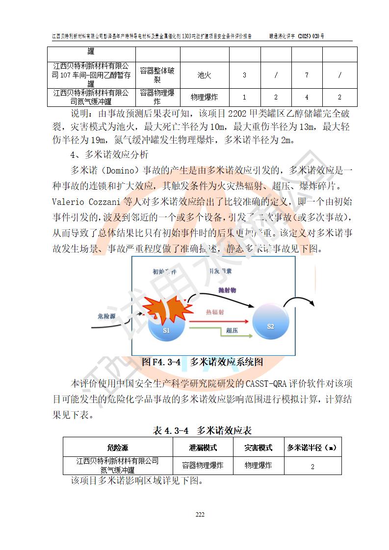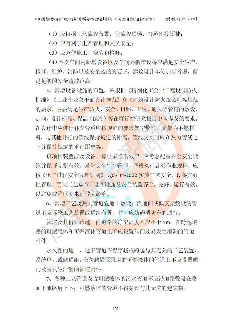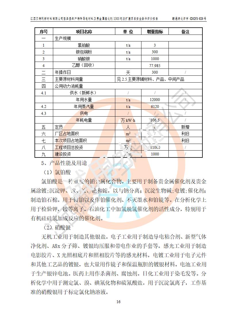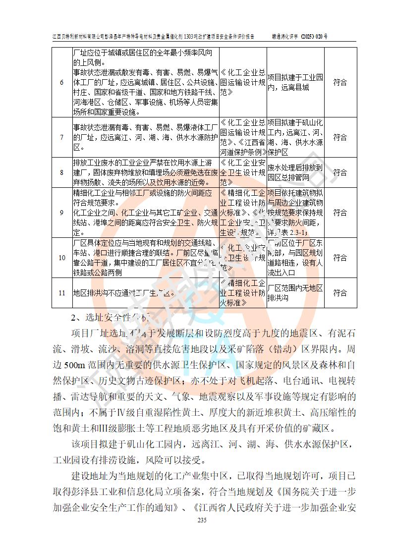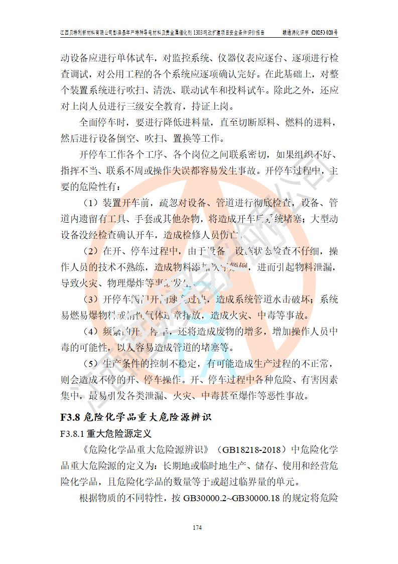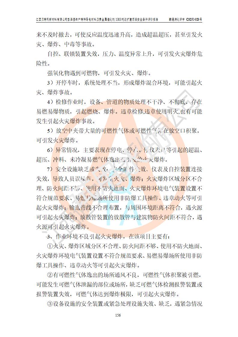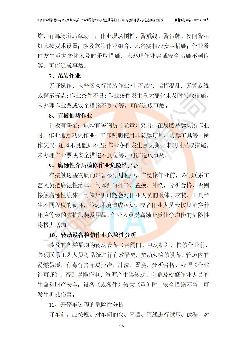评价结论 | 江西贝特利新材料有限公司江西贝特利彭泽县年产特种导电材料及贵金属催化剂 1303吨改扩建项目的选址、总体布局、周边环境、自然环境能满足建设安全条件:项目选择的工艺过程及设备设施的安全可靠性能达到**法规、标准规定要求。 项目存在的危险有害因素可控,在落实本评价报告提出的有关安全对策措施后,其危险有害程度能达到可以接受的程度,项目建设能够实现安全运行的目标。 | |||||