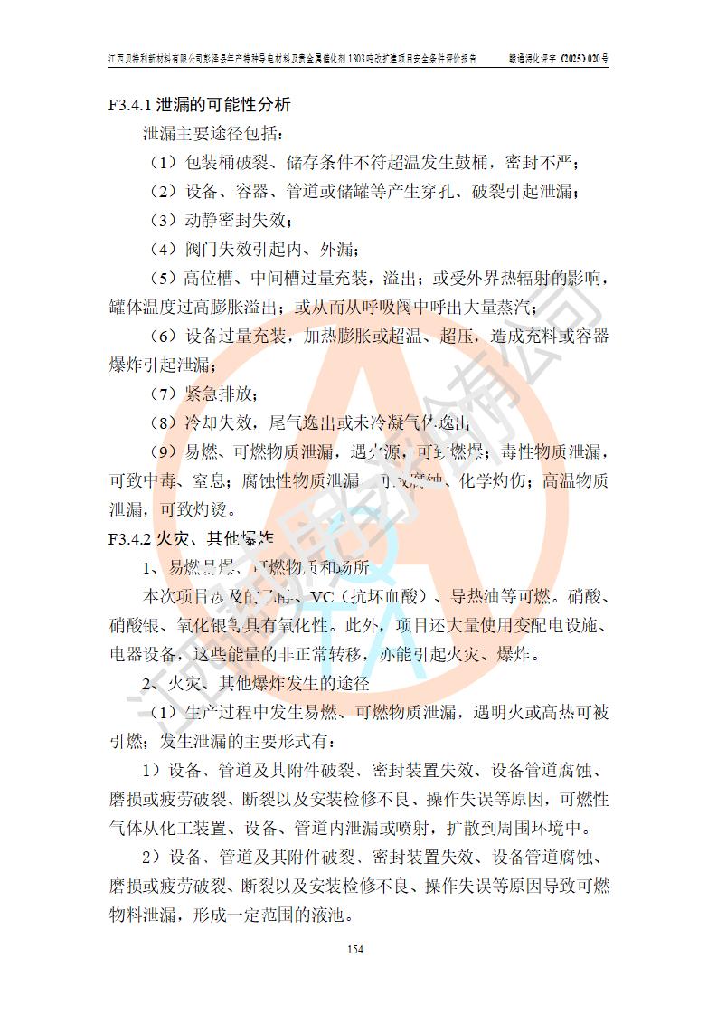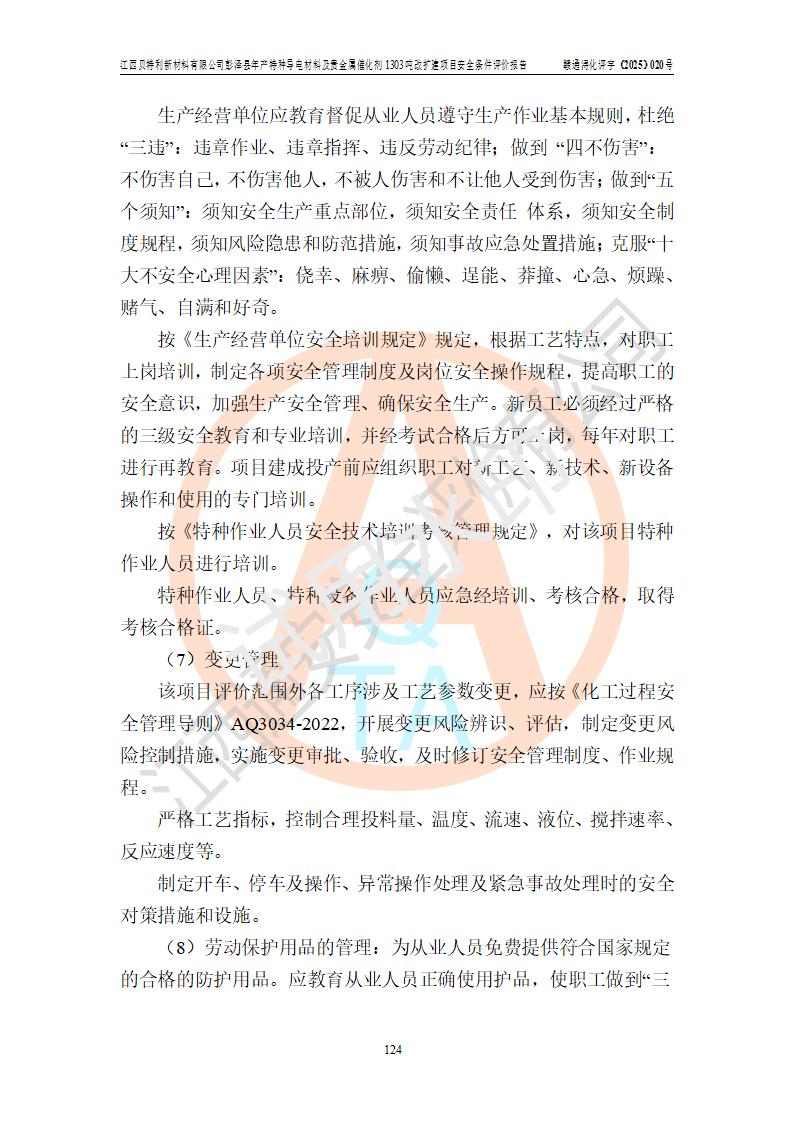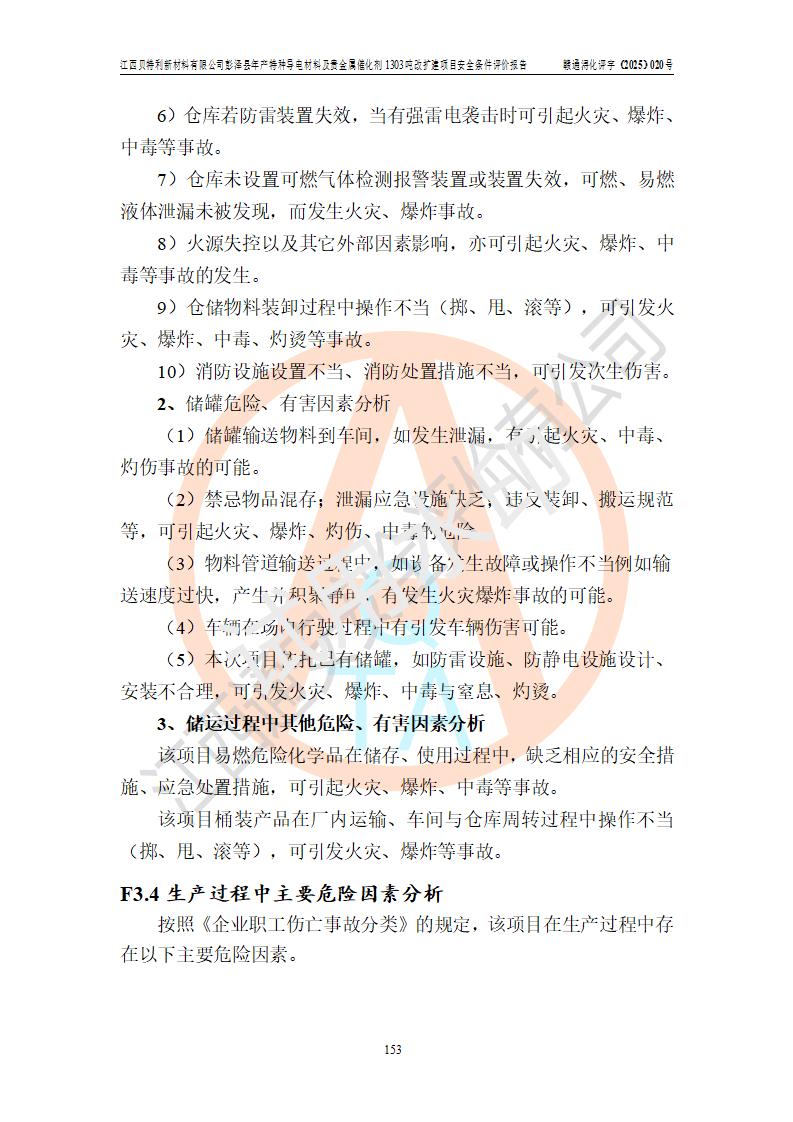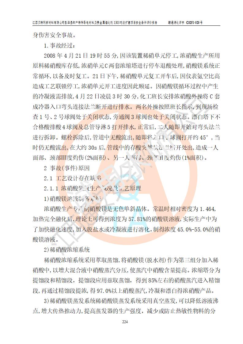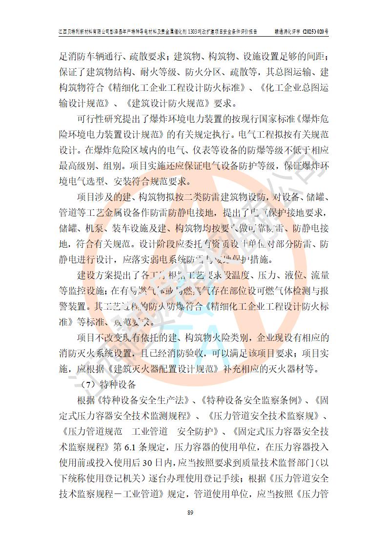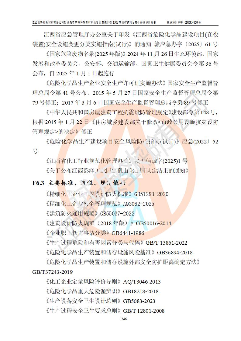 评价结论 | 江西贝特利新材料有限公司江西贝特利彭泽县年产特种导电材料及贵金属催化剂 1303吨改扩建项目的选址、总体布局、周边环境、自然环境能满足建设安全条件:项目选择的工艺过程及设备设施的安全可靠性能达到**法规、标准规定要求。 项目存在的危险有害因素可控,在落实本评价报告提出的有关安全对策措施后,其危险有害程度能达到可以接受的程度,项目建设能够实现安全运行的目标。 | |||||