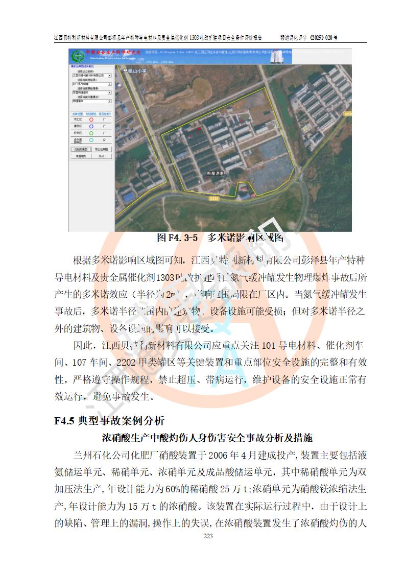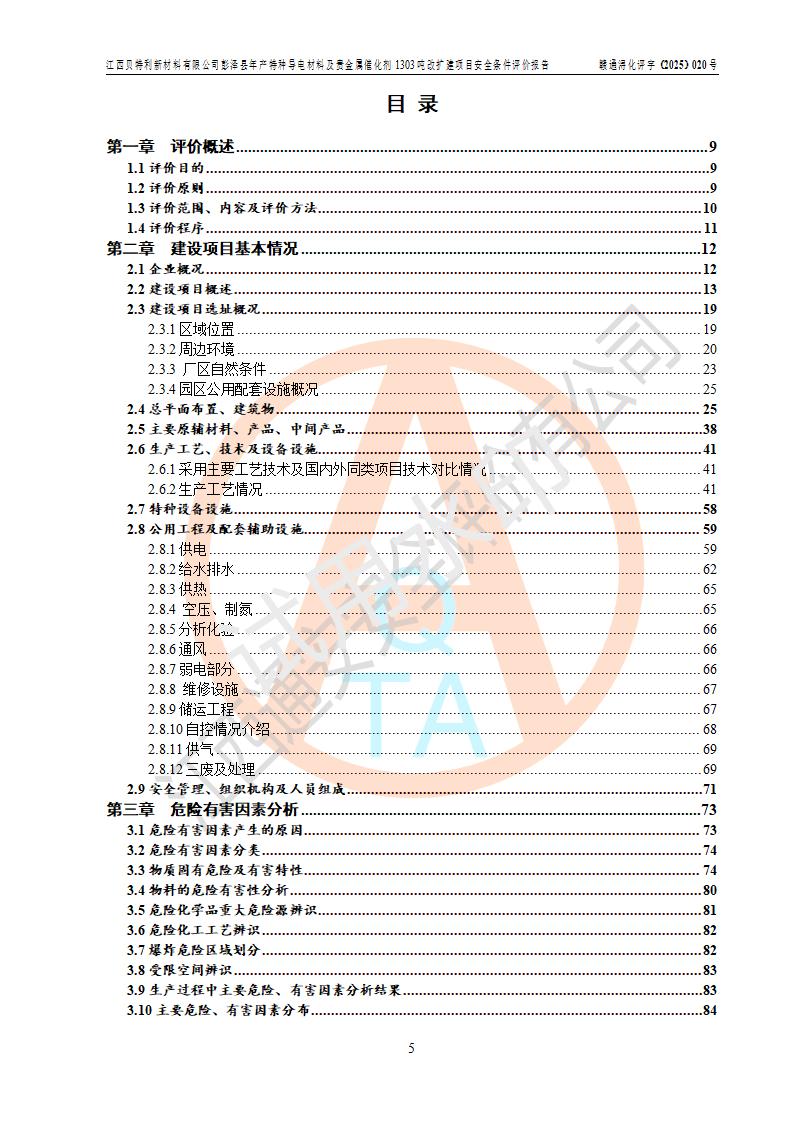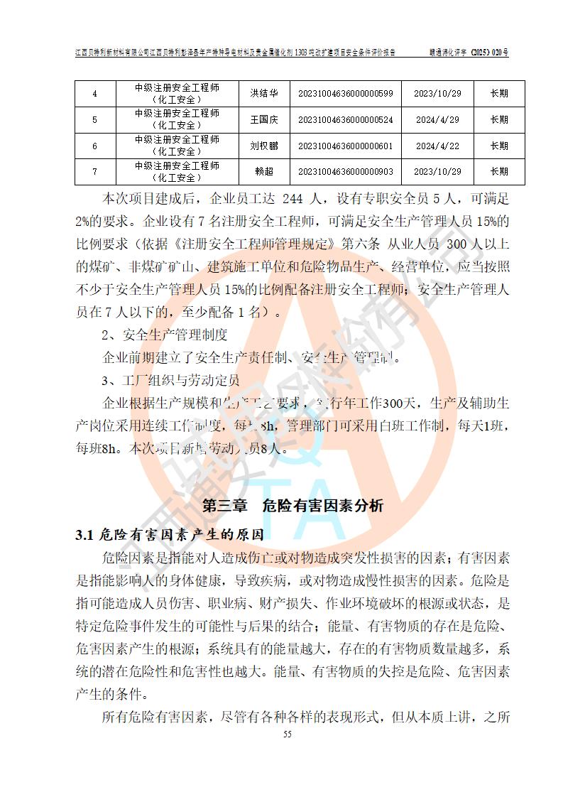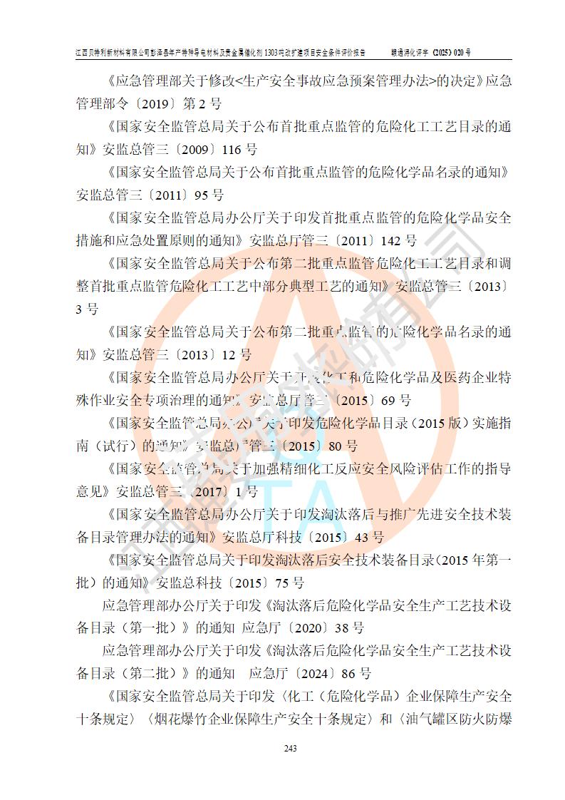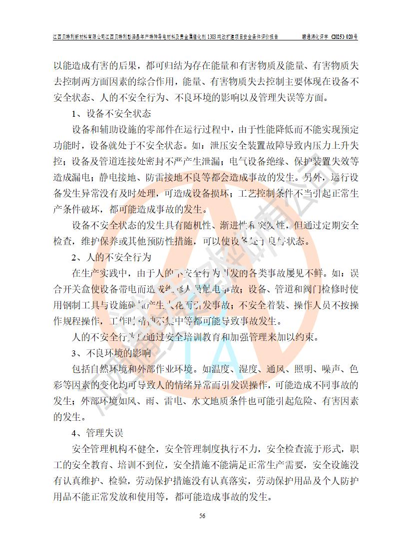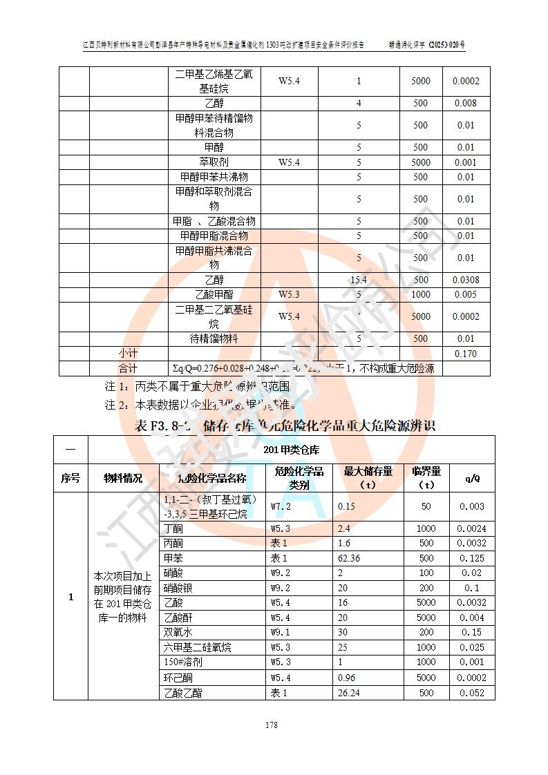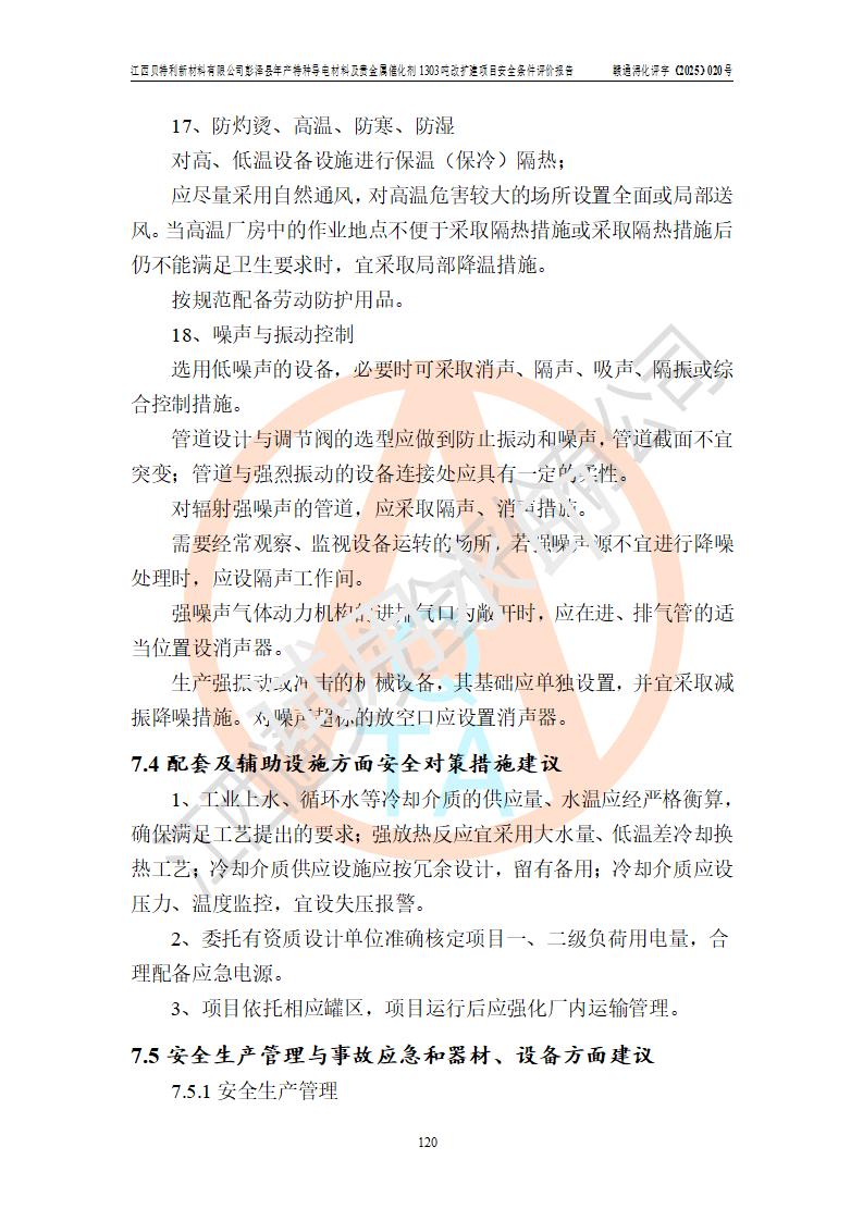 评价结论 | 江西贝特利新材料有限公司江西贝特利彭泽县年产特种导电材料及贵金属催化剂 1303吨改扩建项目的选址、总体布局、周边环境、自然环境能满足建设安全条件:项目选择的工艺过程及设备设施的安全可靠性能达到**法规、标准规定要求。 项目存在的危险有害因素可控,在落实本评价报告提出的有关安全对策措施后,其危险有害程度能达到可以接受的程度,项目建设能够实现安全运行的目标。 | |||||