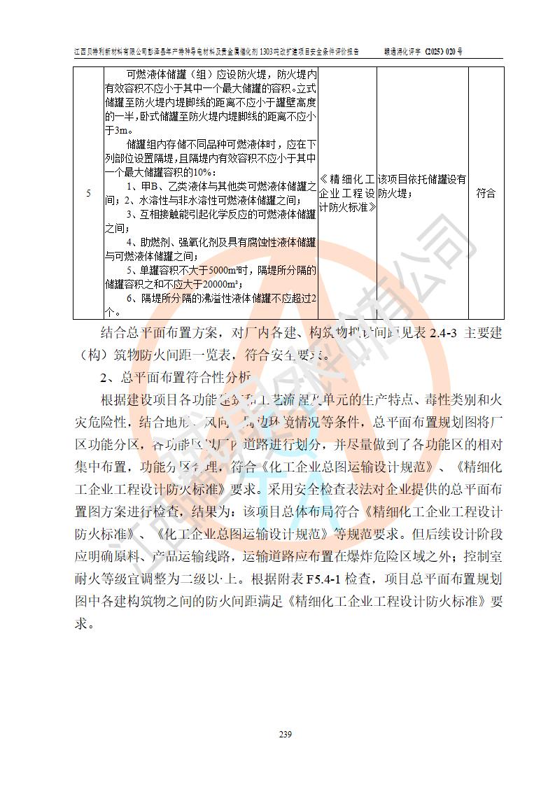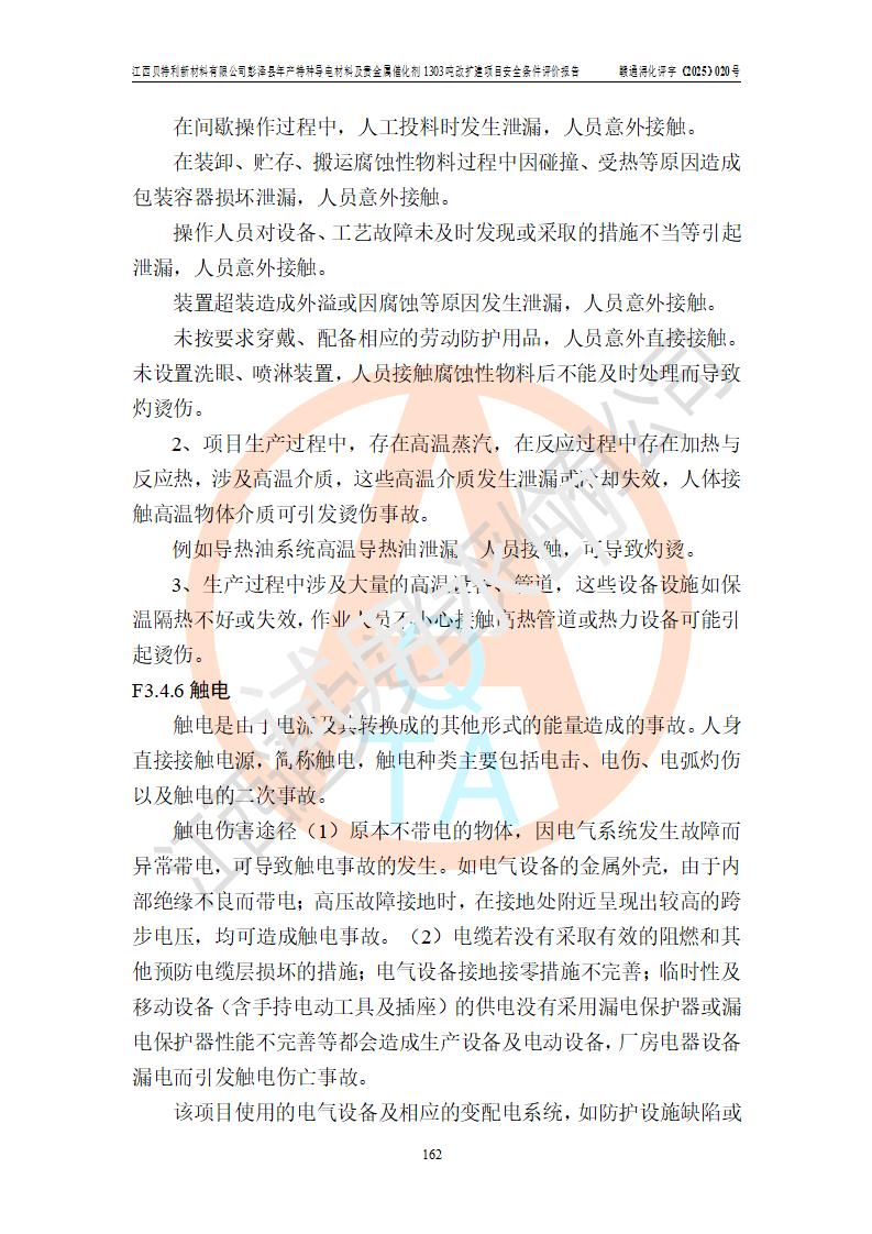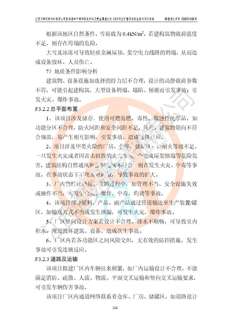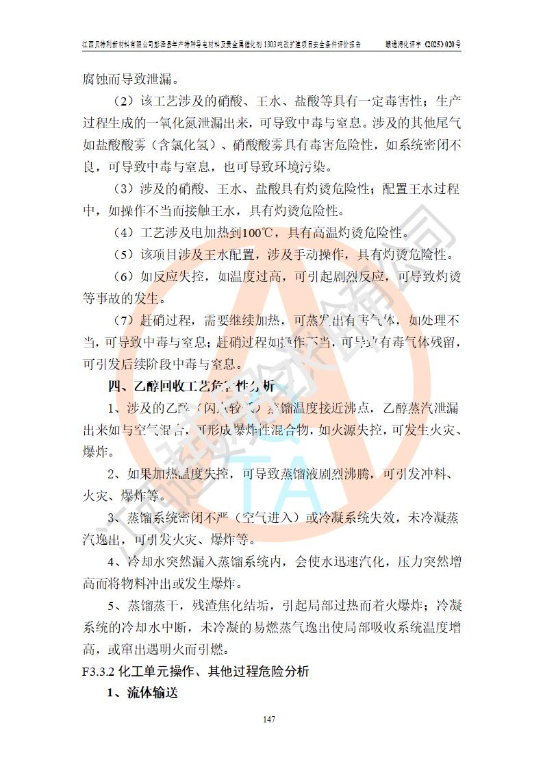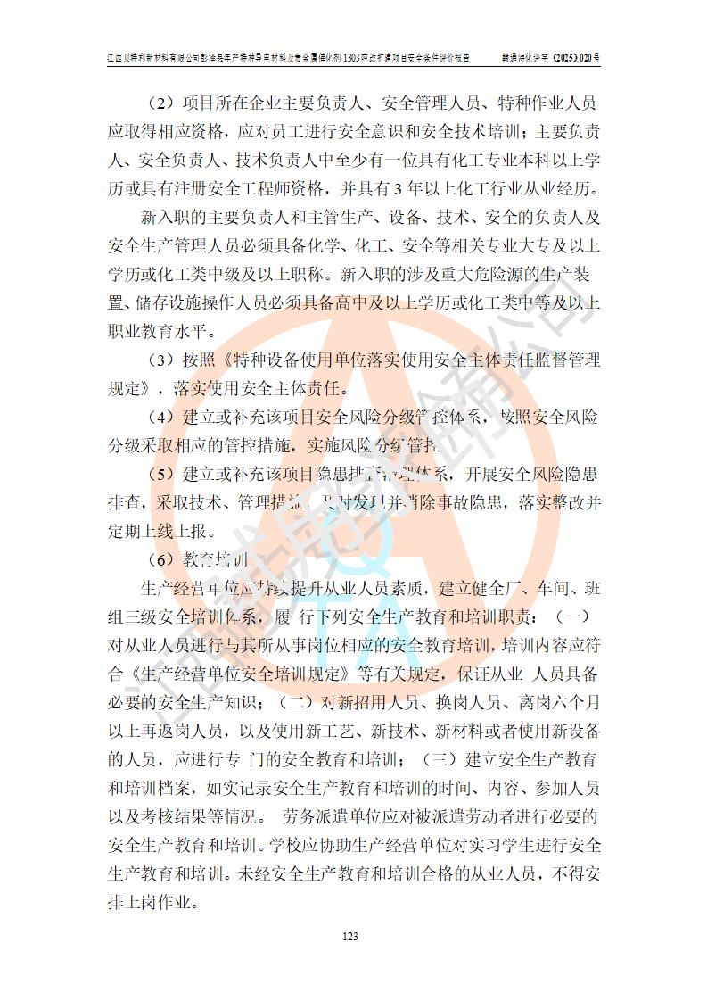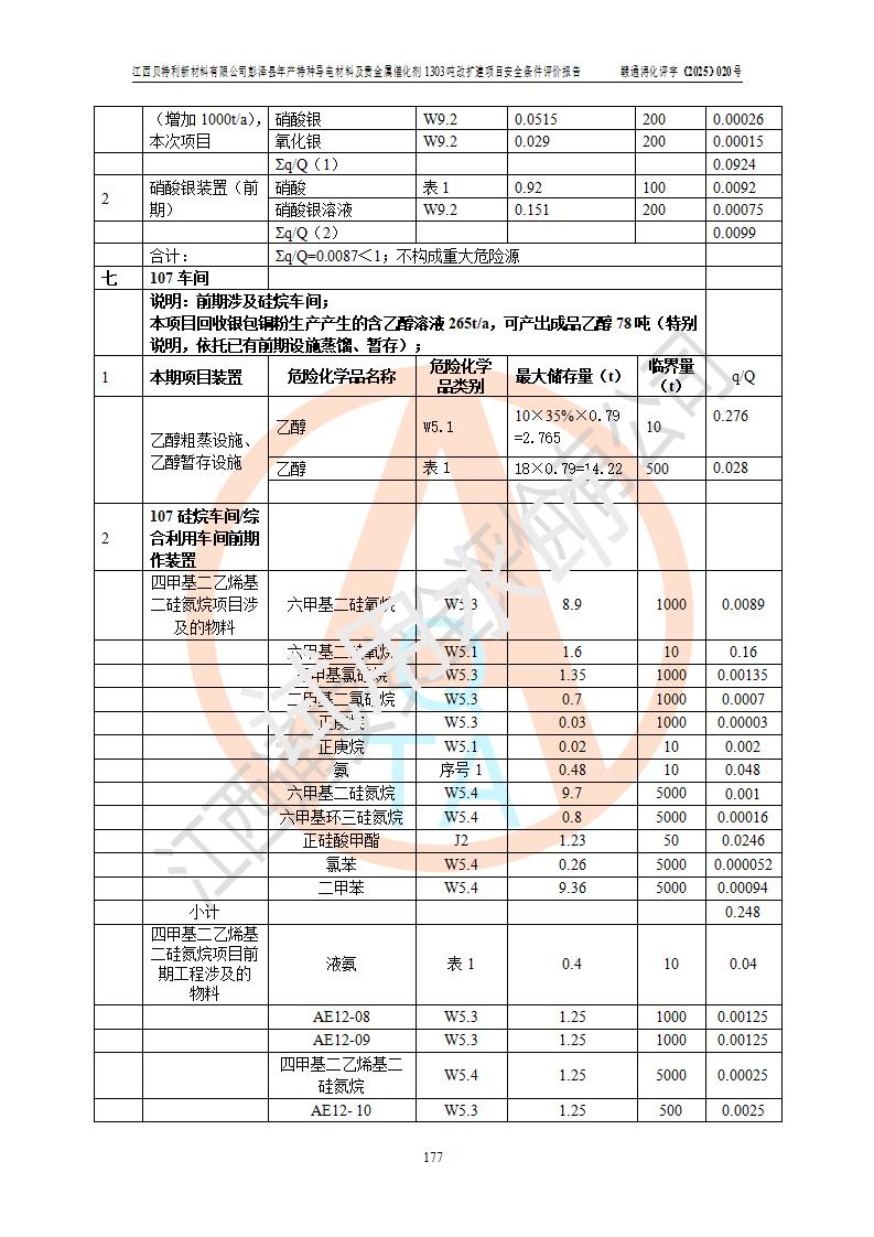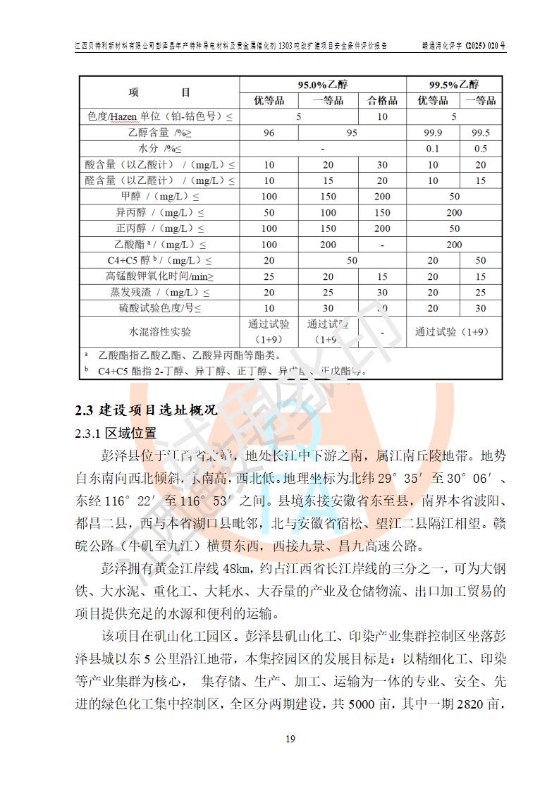 评价结论 | 江西贝特利新材料有限公司江西贝特利彭泽县年产特种导电材料及贵金属催化剂 1303吨改扩建项目的选址、总体布局、周边环境、自然环境能满足建设安全条件:项目选择的工艺过程及设备设施的安全可靠性能达到**法规、标准规定要求。 项目存在的危险有害因素可控,在落实本评价报告提出的有关安全对策措施后,其危险有害程度能达到可以接受的程度,项目建设能够实现安全运行的目标。 | |||||