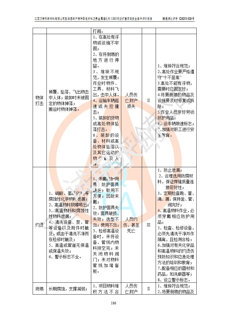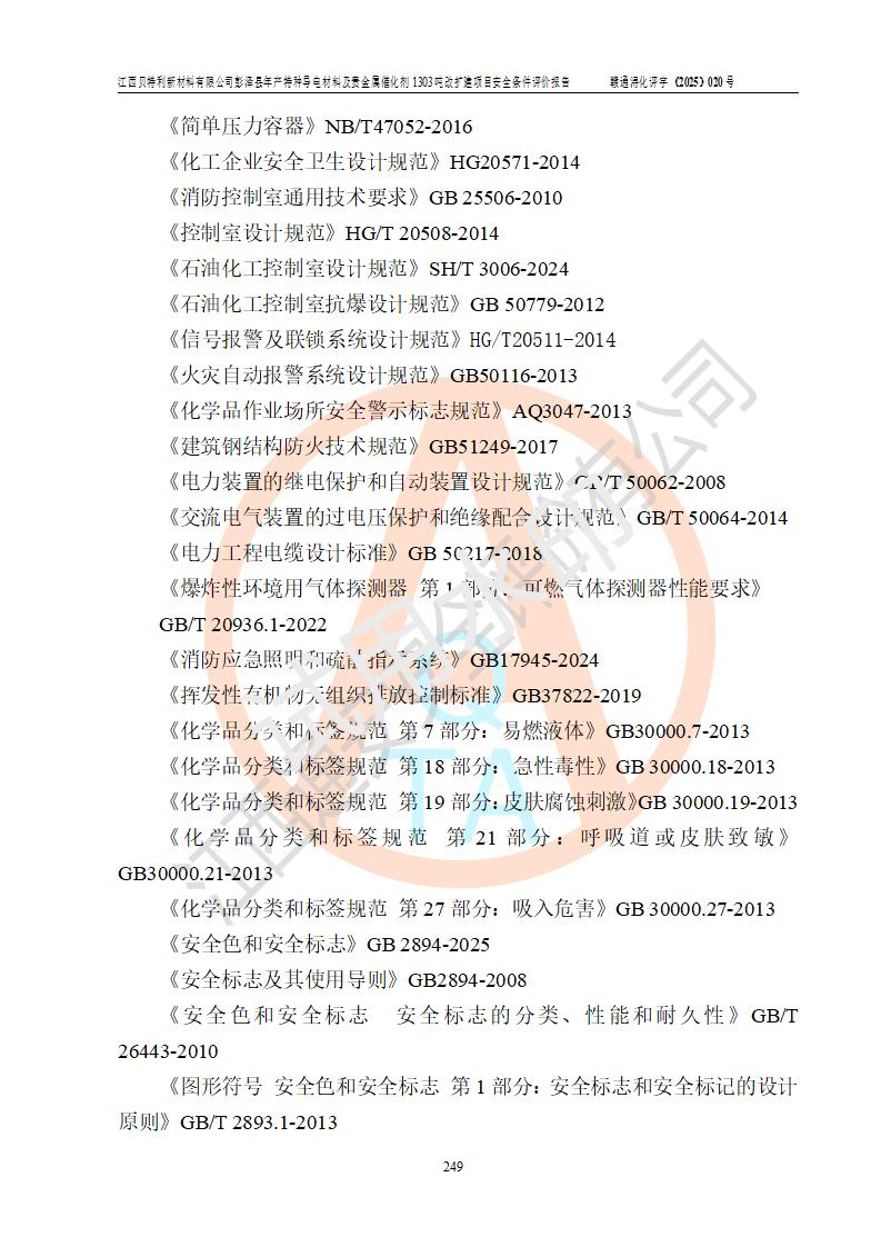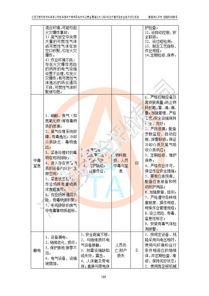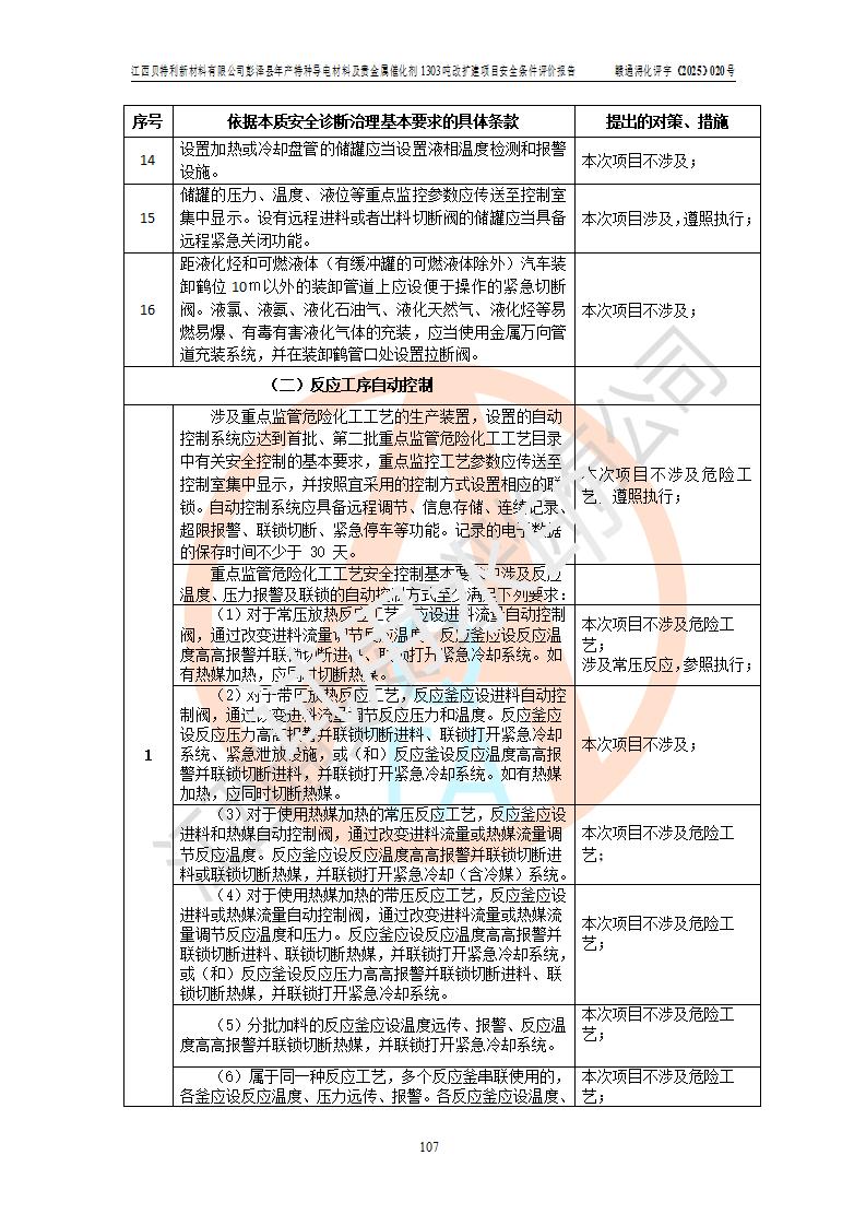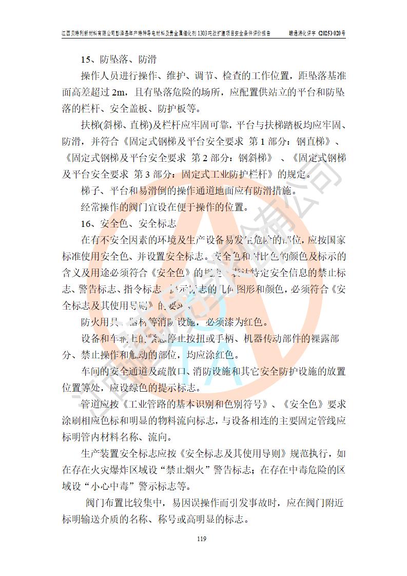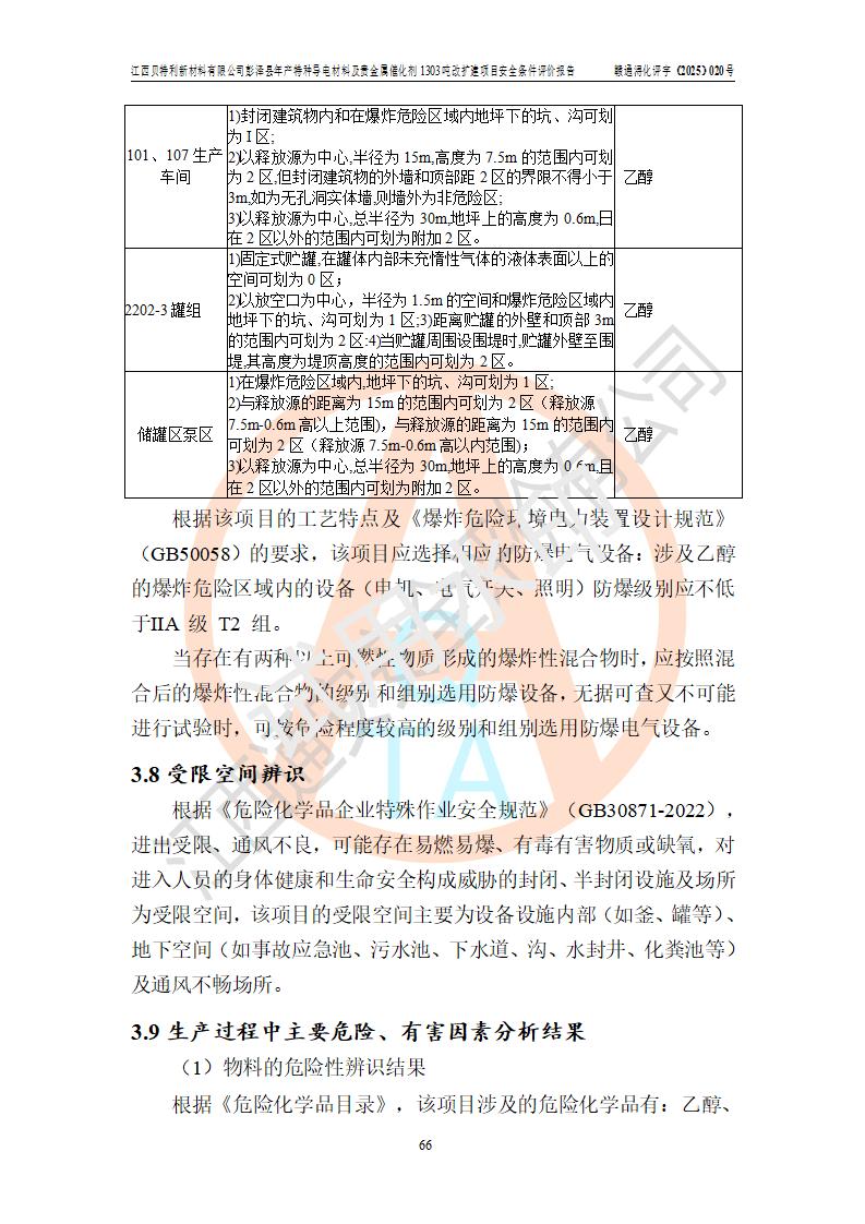 评价结论 | 江西贝特利新材料有限公司江西贝特利彭泽县年产特种导电材料及贵金属催化剂 1303吨改扩建项目的选址、总体布局、周边环境、自然环境能满足建设安全条件:项目选择的工艺过程及设备设施的安全可靠性能达到**法规、标准规定要求。 项目存在的危险有害因素可控,在落实本评价报告提出的有关安全对策措施后,其危险有害程度能达到可以接受的程度,项目建设能够实现安全运行的目标。 | |||||