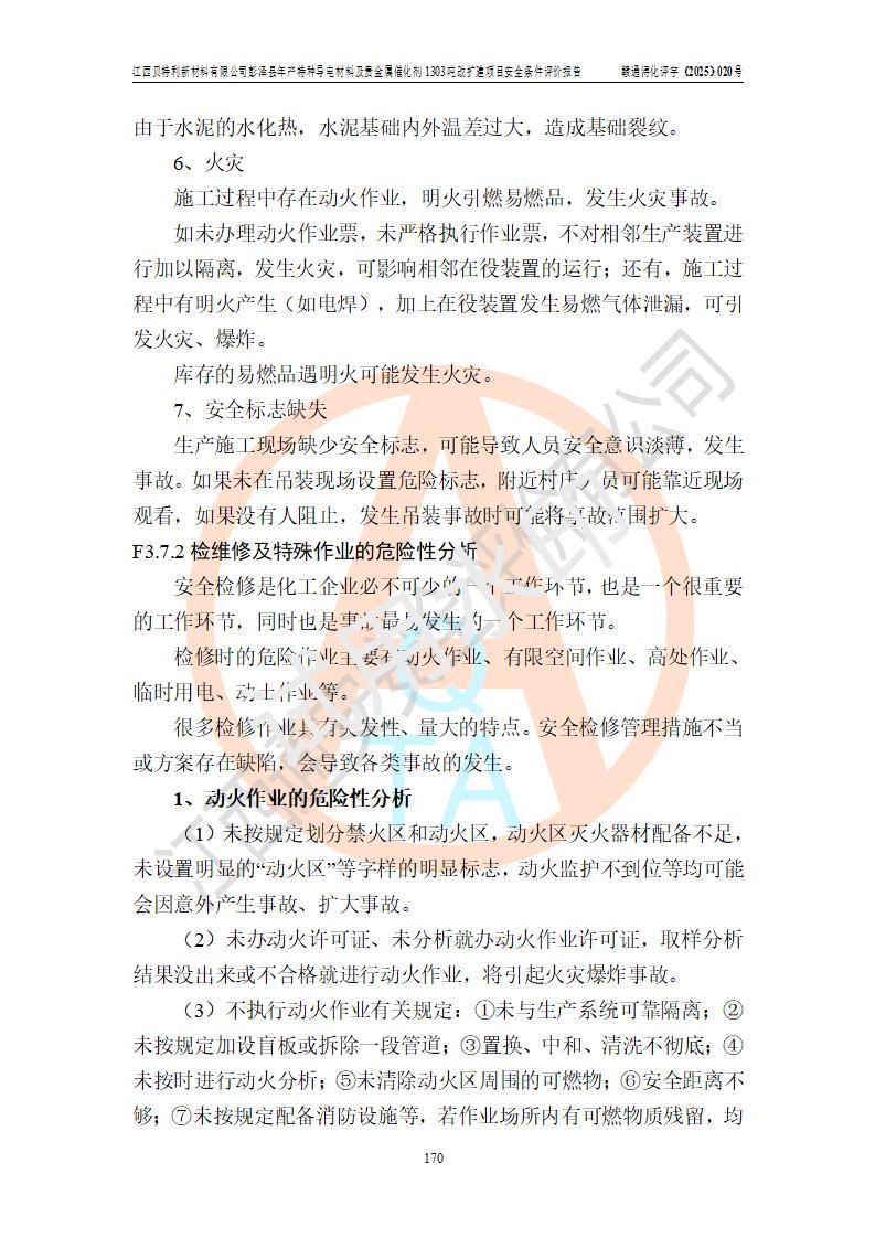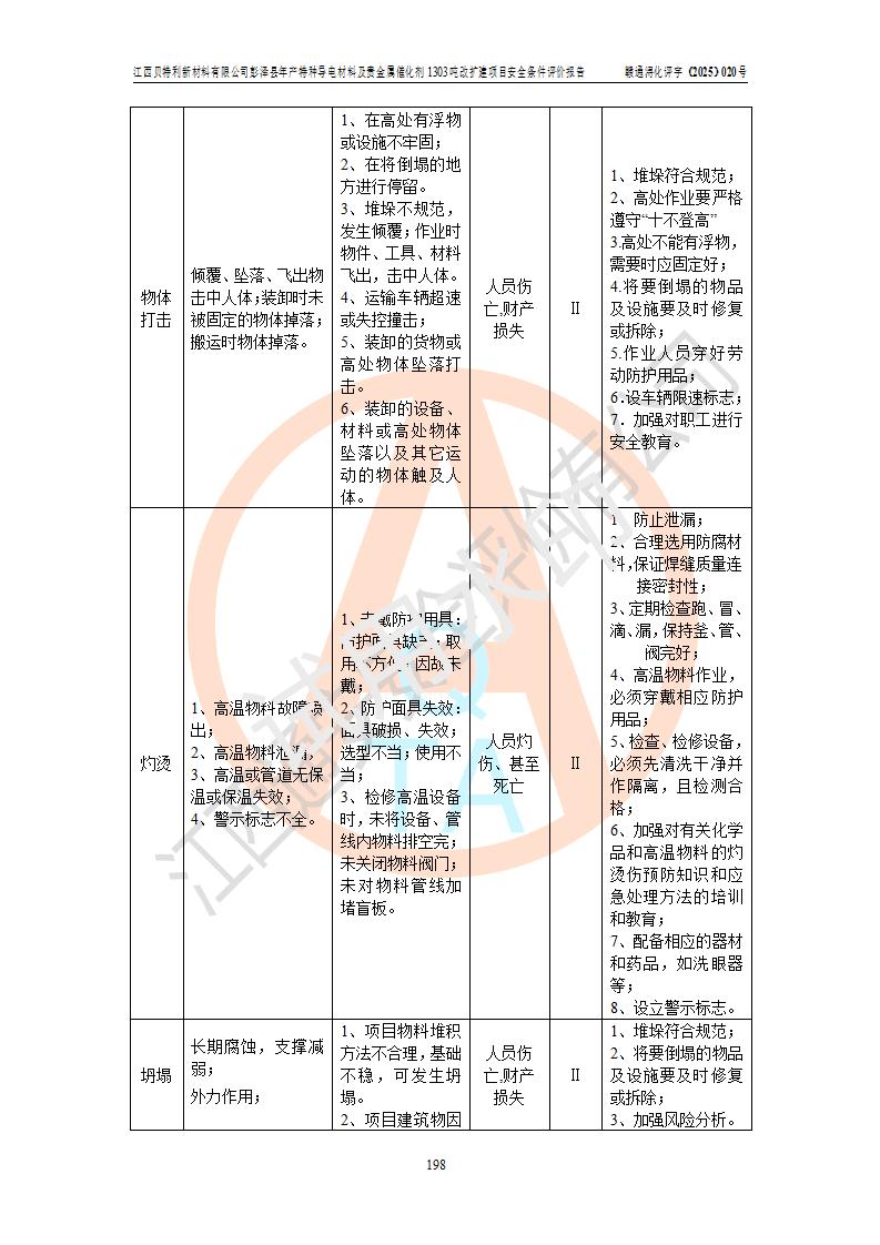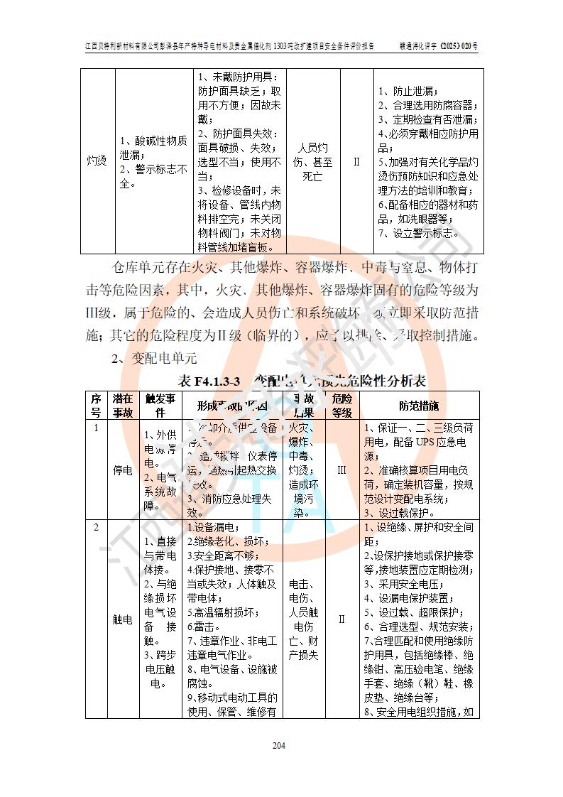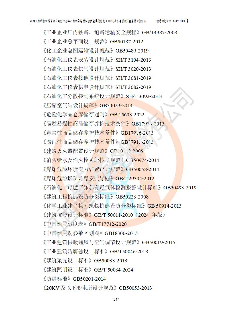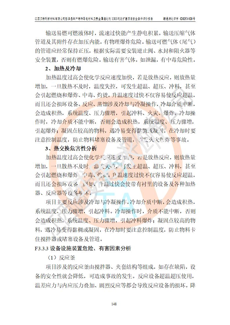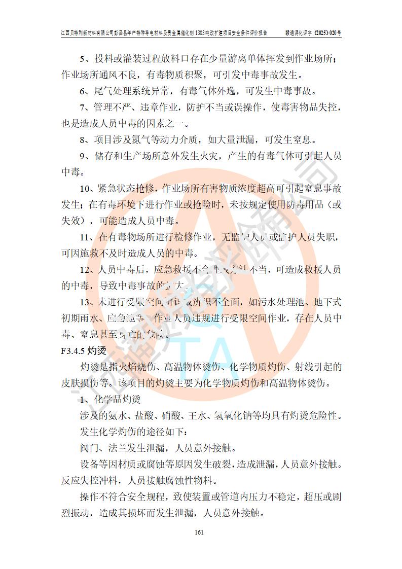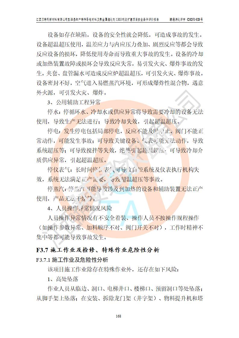 评价结论 | 江西贝特利新材料有限公司江西贝特利彭泽县年产特种导电材料及贵金属催化剂 1303吨改扩建项目的选址、总体布局、周边环境、自然环境能满足建设安全条件:项目选择的工艺过程及设备设施的安全可靠性能达到**法规、标准规定要求。 项目存在的危险有害因素可控,在落实本评价报告提出的有关安全对策措施后,其危险有害程度能达到可以接受的程度,项目建设能够实现安全运行的目标。 | |||||