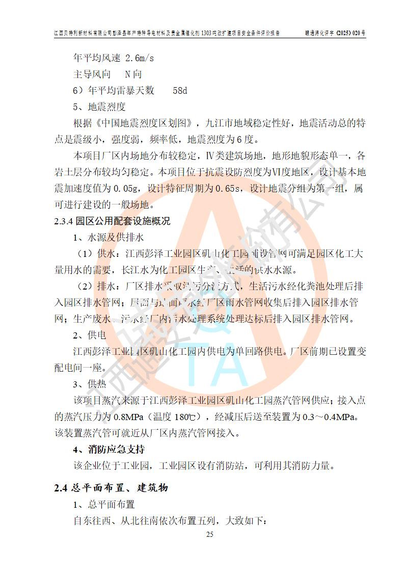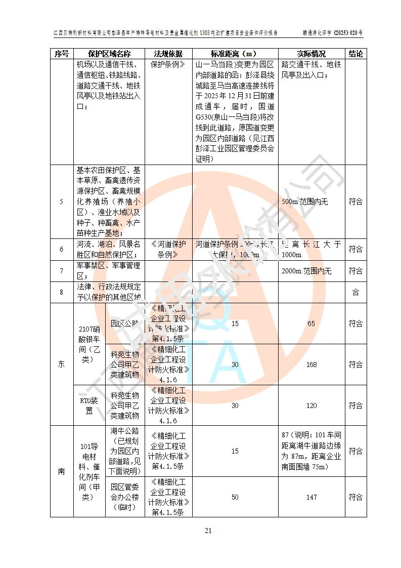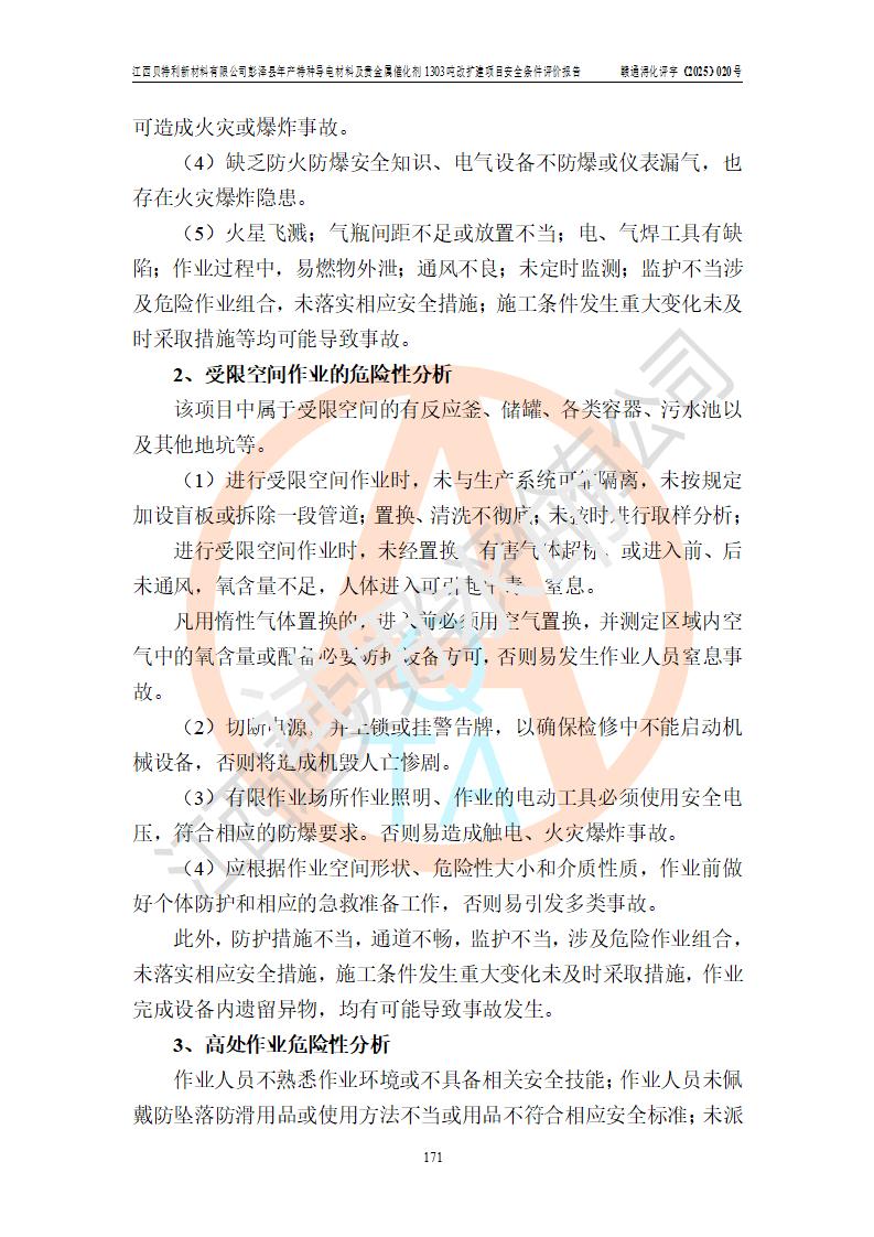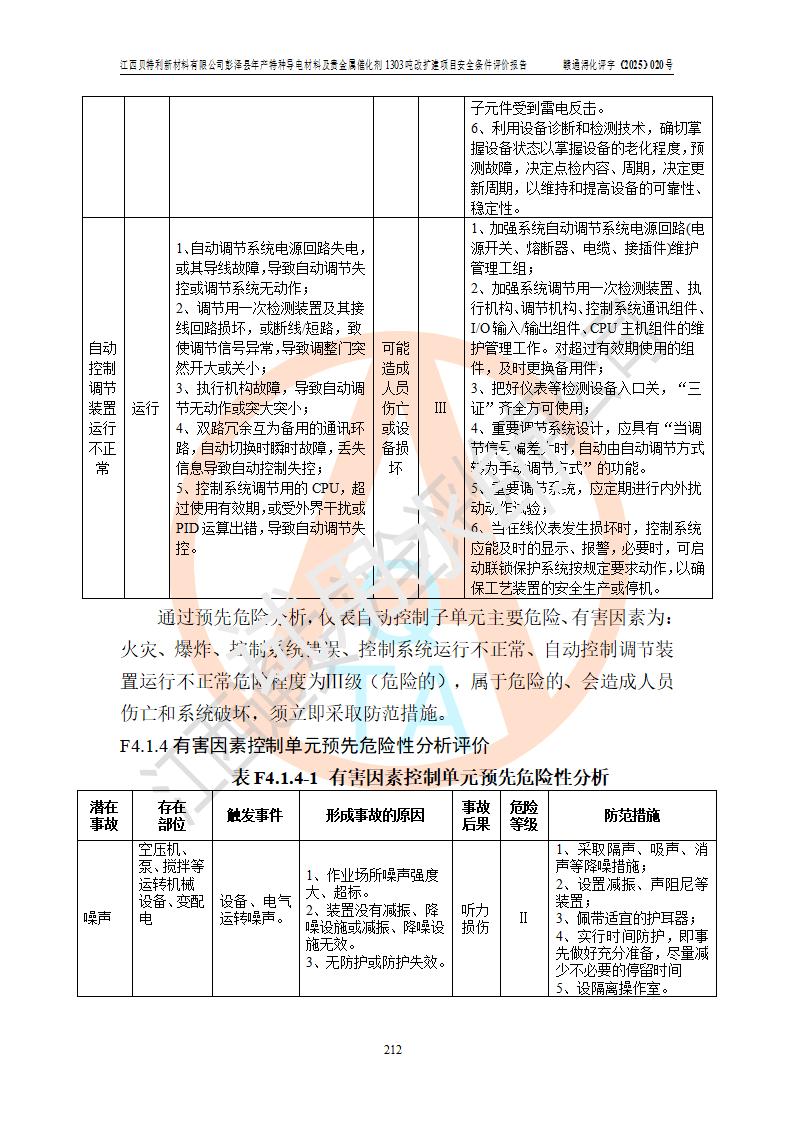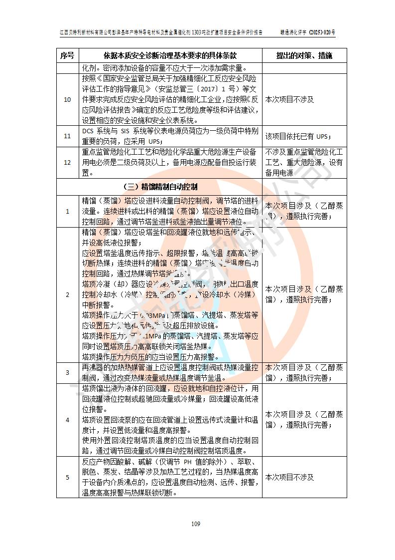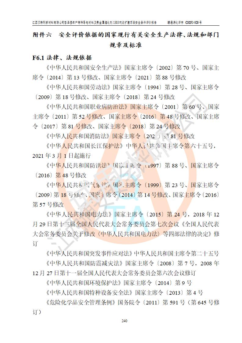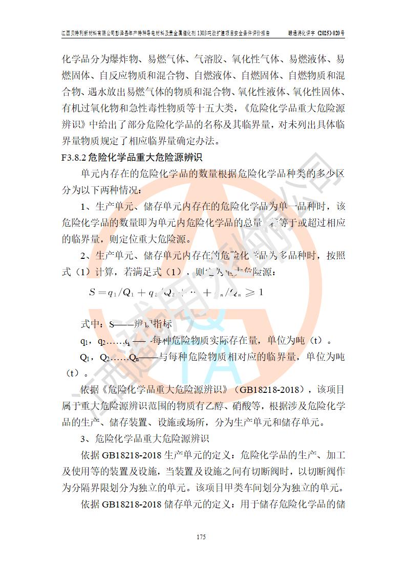 评价结论 | 江西贝特利新材料有限公司江西贝特利彭泽县年产特种导电材料及贵金属催化剂 1303吨改扩建项目的选址、总体布局、周边环境、自然环境能满足建设安全条件:项目选择的工艺过程及设备设施的安全可靠性能达到**法规、标准规定要求。 项目存在的危险有害因素可控,在落实本评价报告提出的有关安全对策措施后,其危险有害程度能达到可以接受的程度,项目建设能够实现安全运行的目标。 | |||||