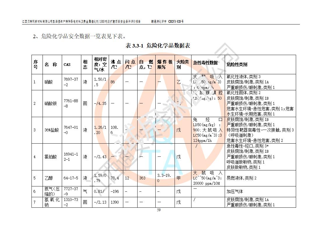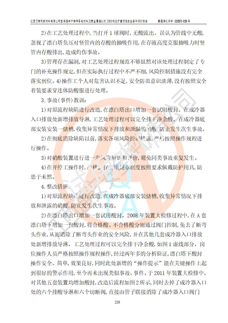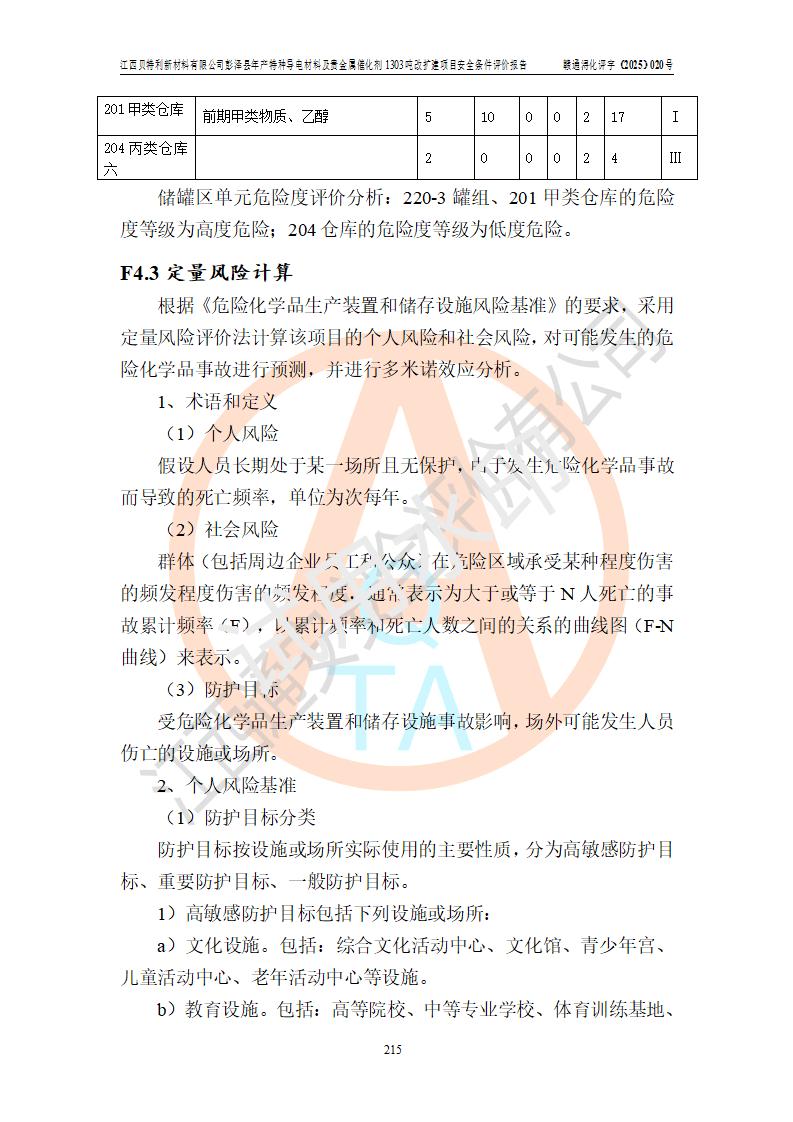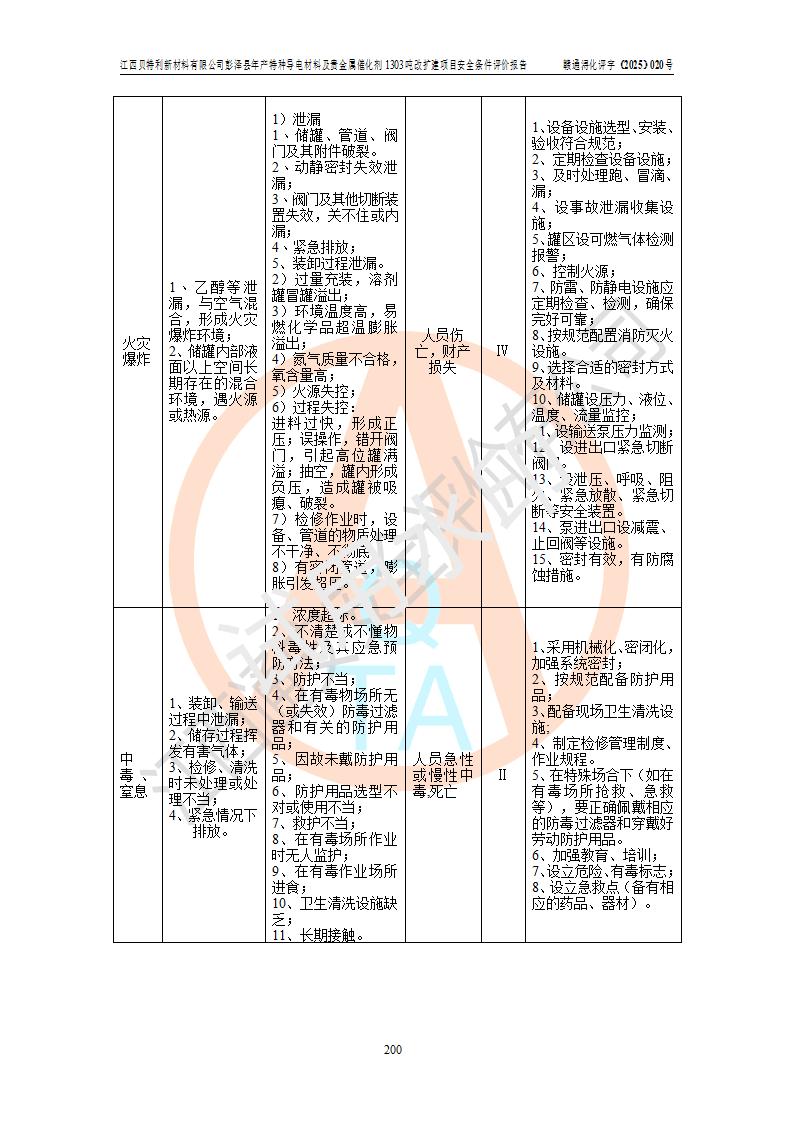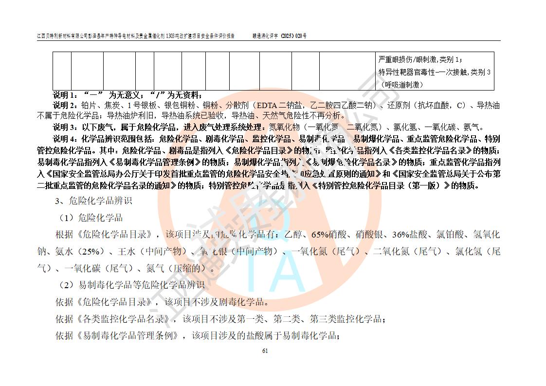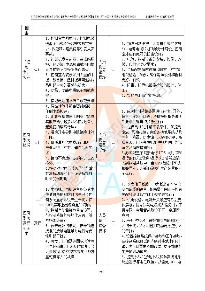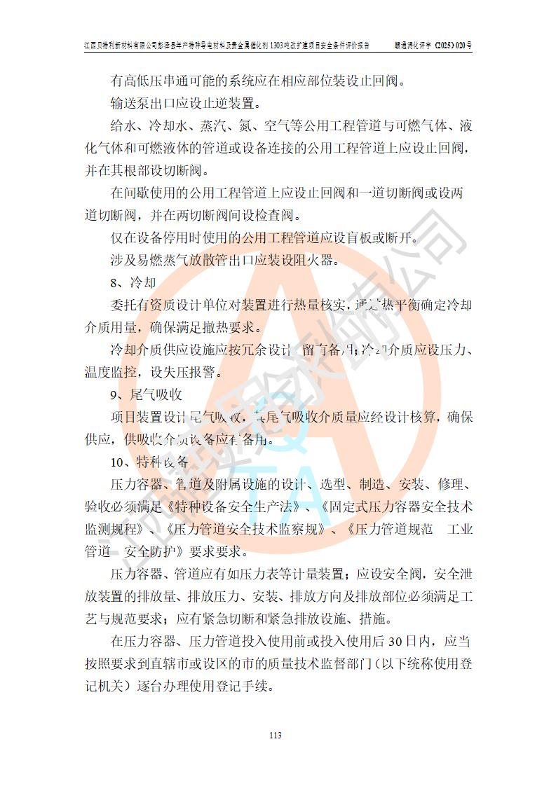 评价结论 | 江西贝特利新材料有限公司江西贝特利彭泽县年产特种导电材料及贵金属催化剂 1303吨改扩建项目的选址、总体布局、周边环境、自然环境能满足建设安全条件:项目选择的工艺过程及设备设施的安全可靠性能达到**法规、标准规定要求。 项目存在的危险有害因素可控,在落实本评价报告提出的有关安全对策措施后,其危险有害程度能达到可以接受的程度,项目建设能够实现安全运行的目标。 | |||||