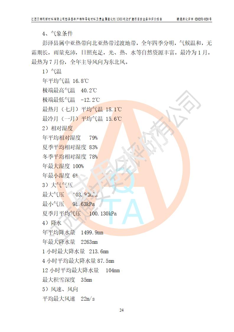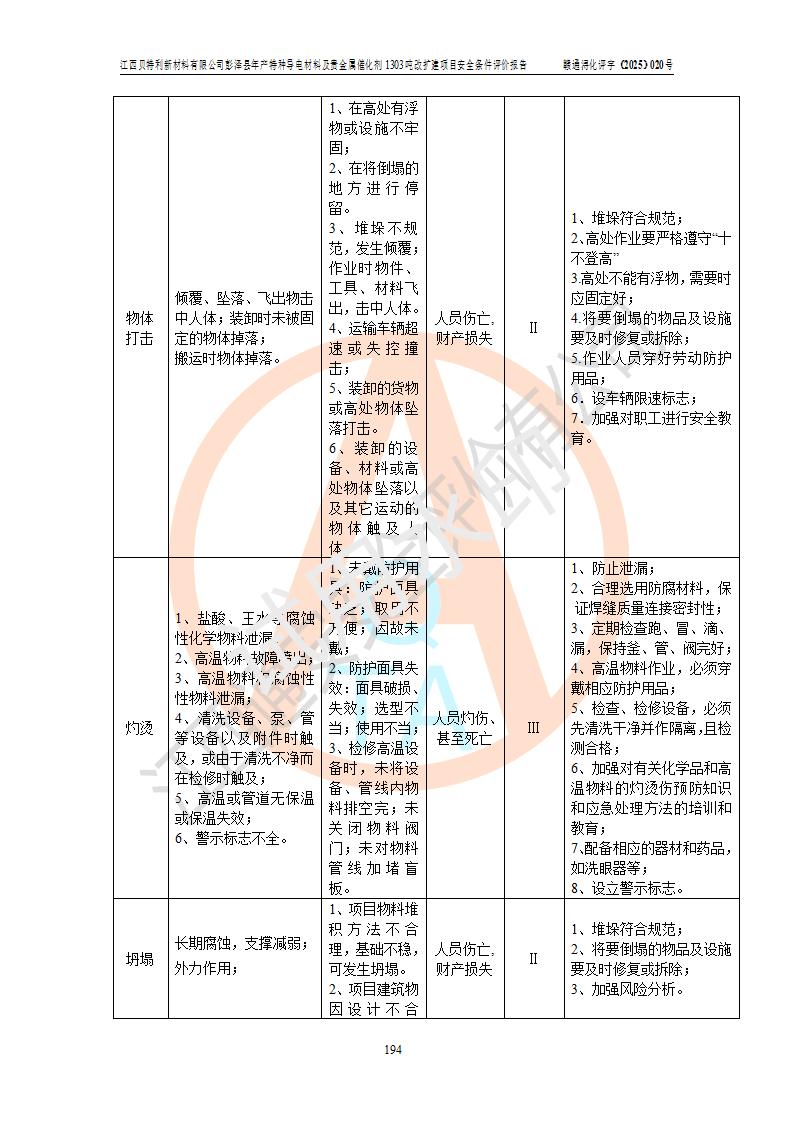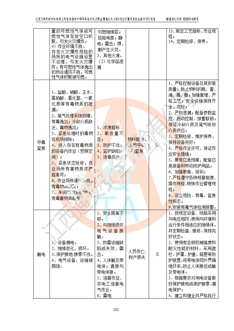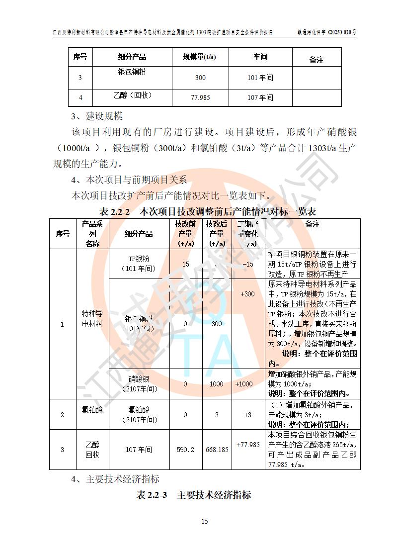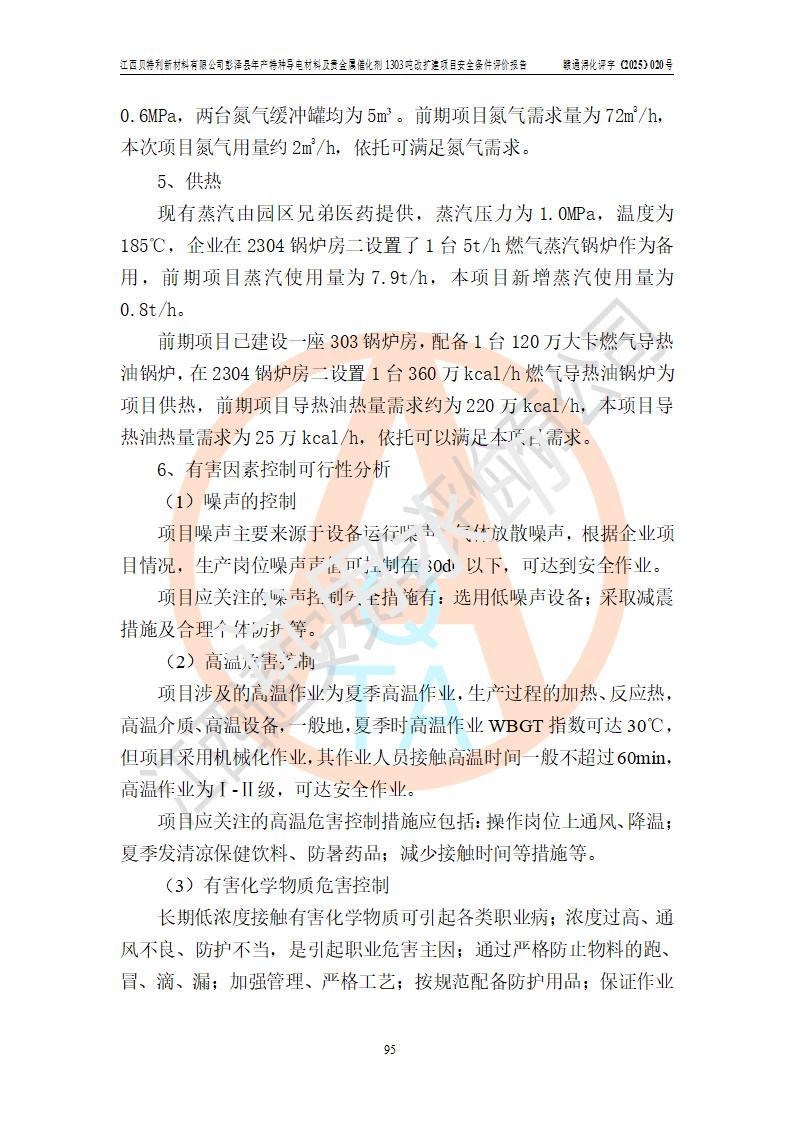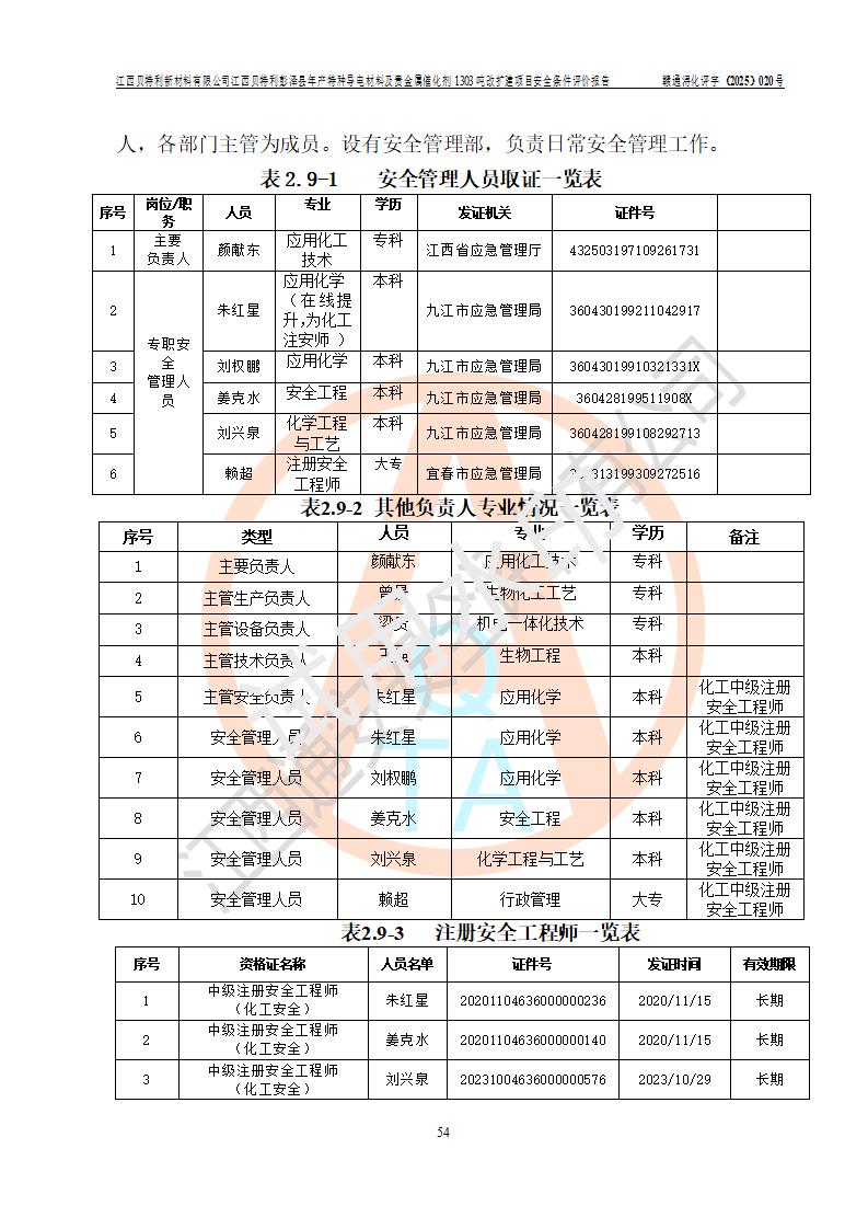 评价结论 | 江西贝特利新材料有限公司江西贝特利彭泽县年产特种导电材料及贵金属催化剂 1303吨改扩建项目的选址、总体布局、周边环境、自然环境能满足建设安全条件:项目选择的工艺过程及设备设施的安全可靠性能达到**法规、标准规定要求。 项目存在的危险有害因素可控,在落实本评价报告提出的有关安全对策措施后,其危险有害程度能达到可以接受的程度,项目建设能够实现安全运行的目标。 | |||||