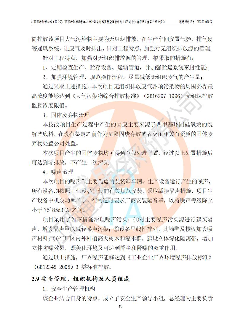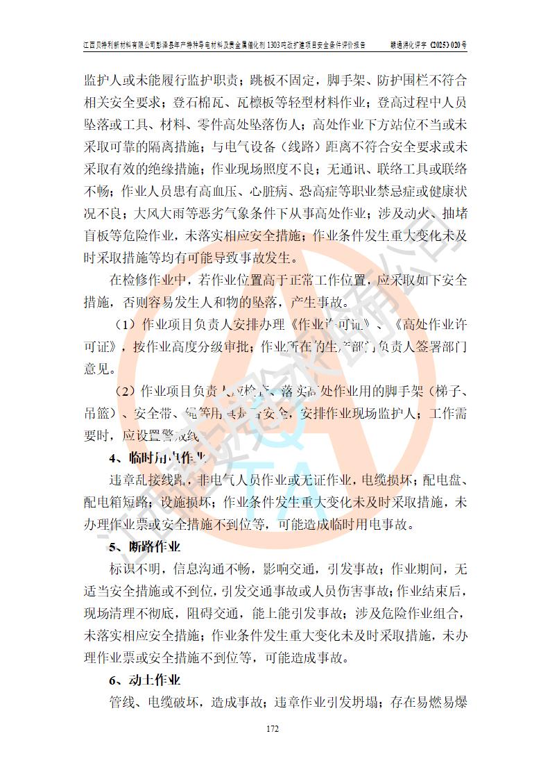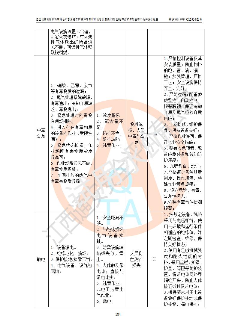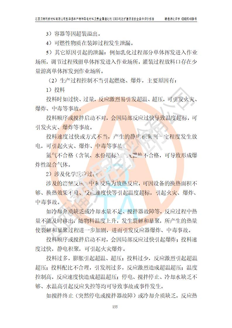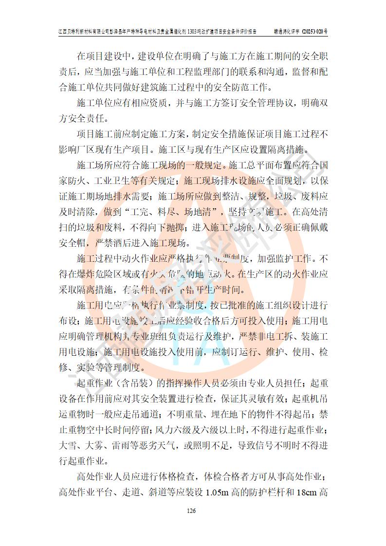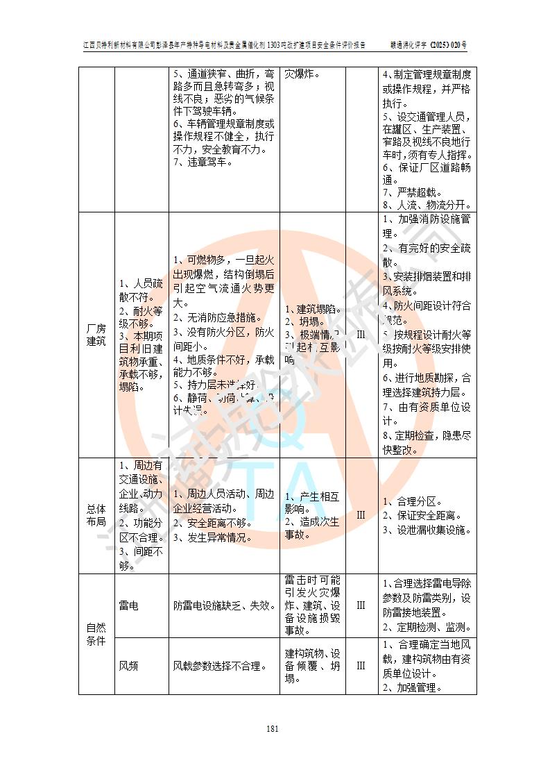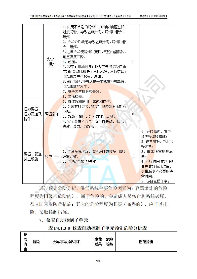 评价结论 | 江西贝特利新材料有限公司江西贝特利彭泽县年产特种导电材料及贵金属催化剂 1303吨改扩建项目的选址、总体布局、周边环境、自然环境能满足建设安全条件:项目选择的工艺过程及设备设施的安全可靠性能达到**法规、标准规定要求。 项目存在的危险有害因素可控,在落实本评价报告提出的有关安全对策措施后,其危险有害程度能达到可以接受的程度,项目建设能够实现安全运行的目标。 | |||||