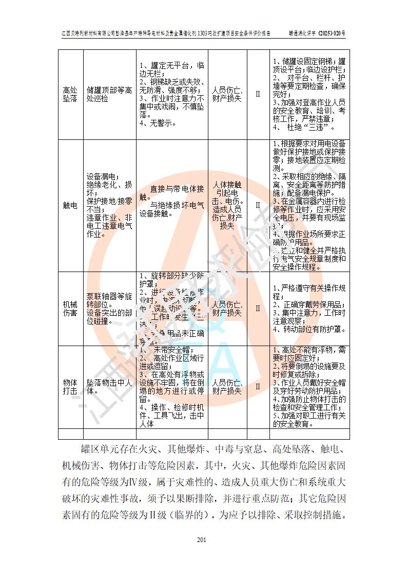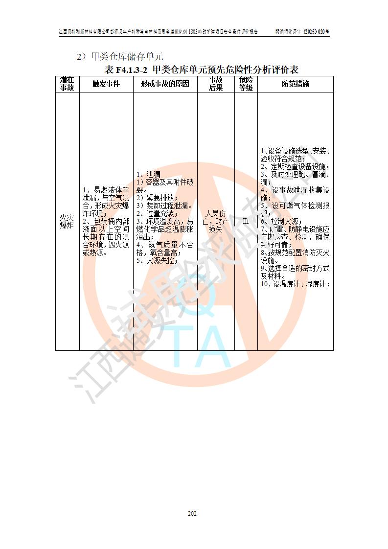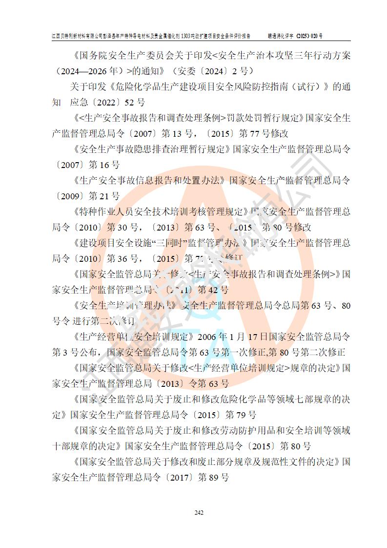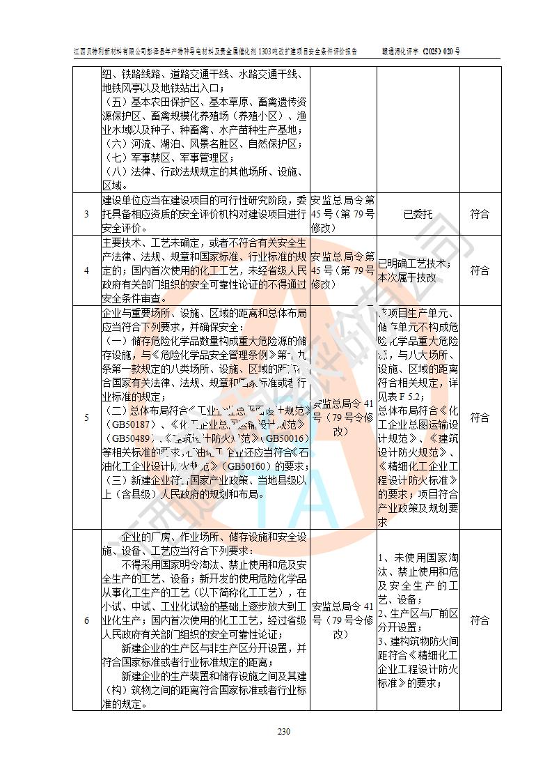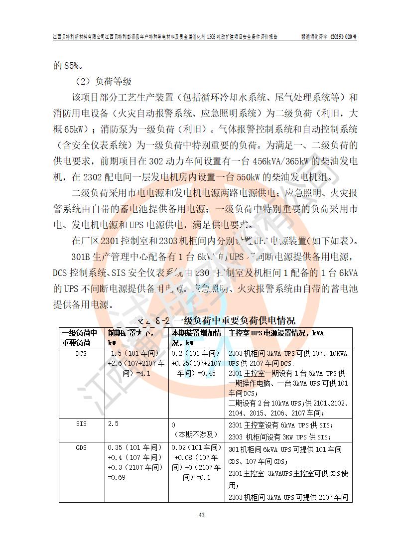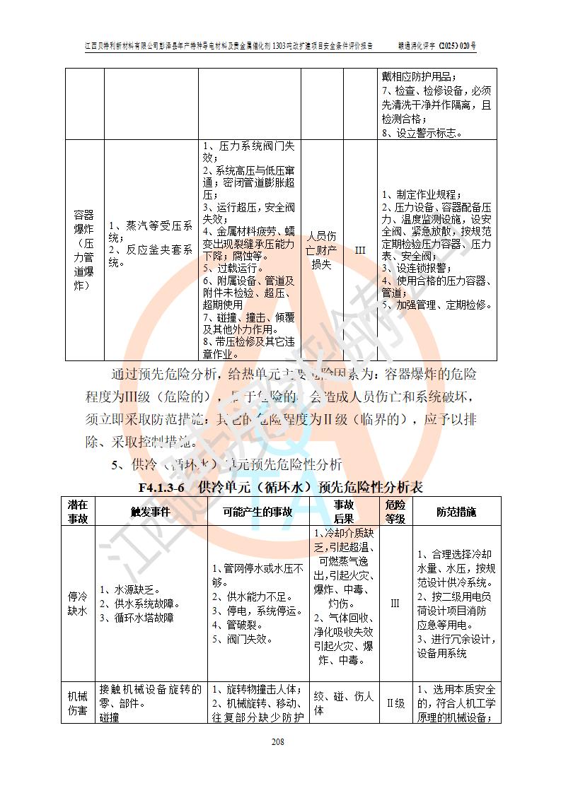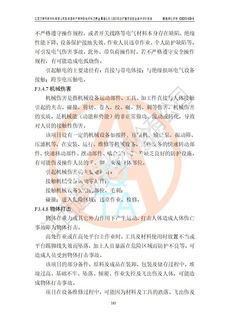 评价结论 | 江西贝特利新材料有限公司江西贝特利彭泽县年产特种导电材料及贵金属催化剂 1303吨改扩建项目的选址、总体布局、周边环境、自然环境能满足建设安全条件:项目选择的工艺过程及设备设施的安全可靠性能达到**法规、标准规定要求。 项目存在的危险有害因素可控,在落实本评价报告提出的有关安全对策措施后,其危险有害程度能达到可以接受的程度,项目建设能够实现安全运行的目标。 | |||||