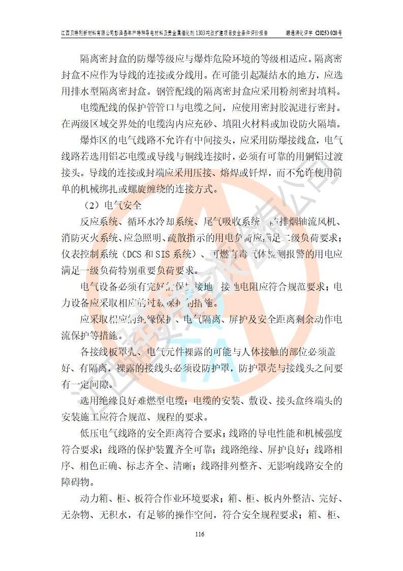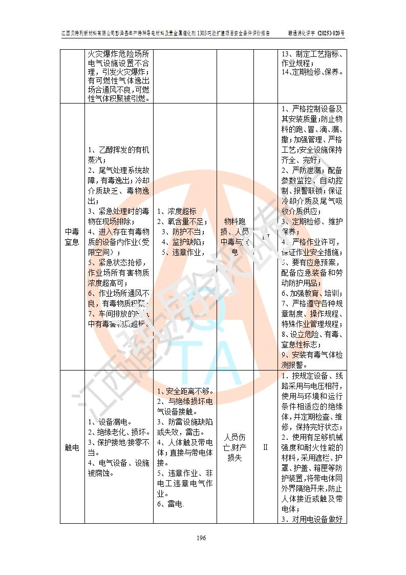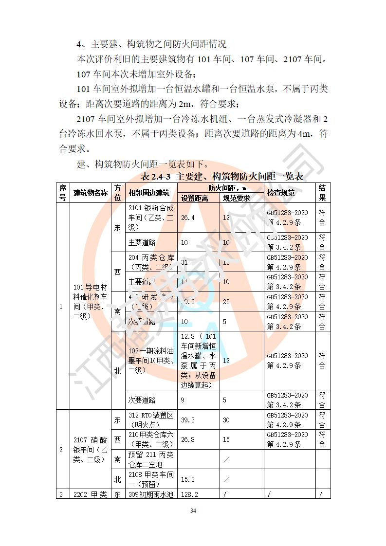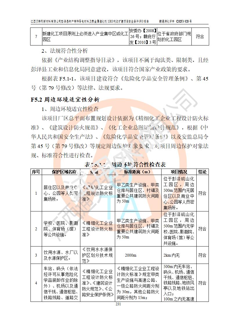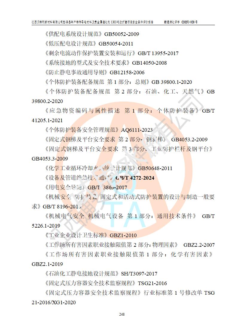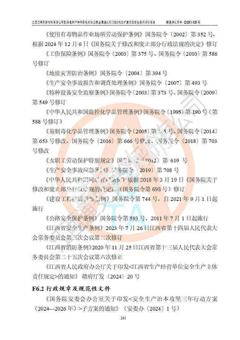 评价结论 | 江西贝特利新材料有限公司江西贝特利彭泽县年产特种导电材料及贵金属催化剂 1303吨改扩建项目的选址、总体布局、周边环境、自然环境能满足建设安全条件:项目选择的工艺过程及设备设施的安全可靠性能达到**法规、标准规定要求。 项目存在的危险有害因素可控,在落实本评价报告提出的有关安全对策措施后,其危险有害程度能达到可以接受的程度,项目建设能够实现安全运行的目标。 | |||||