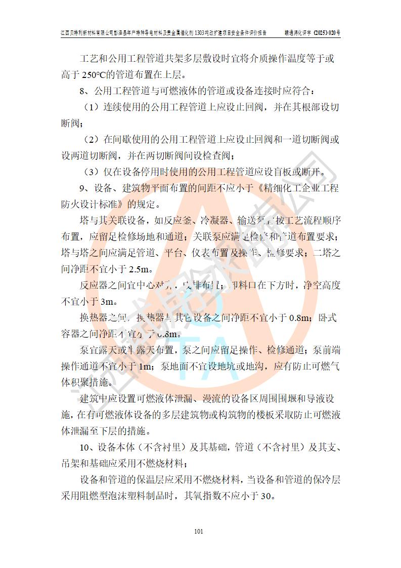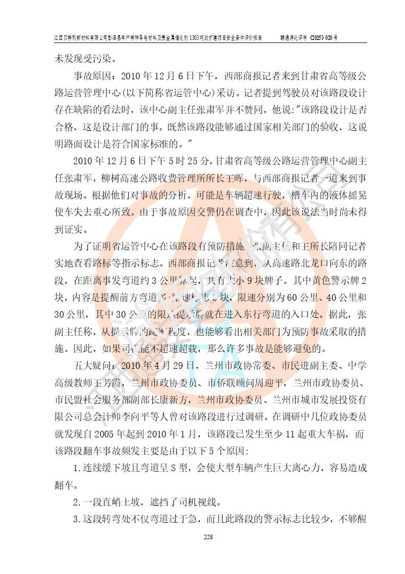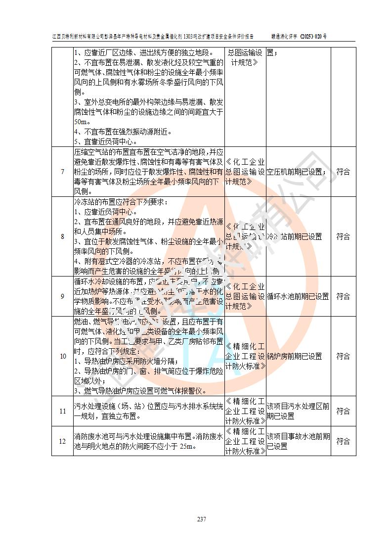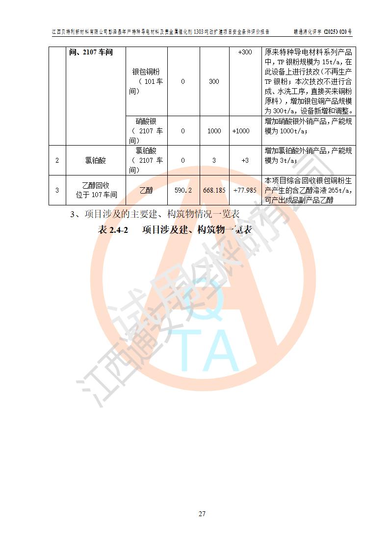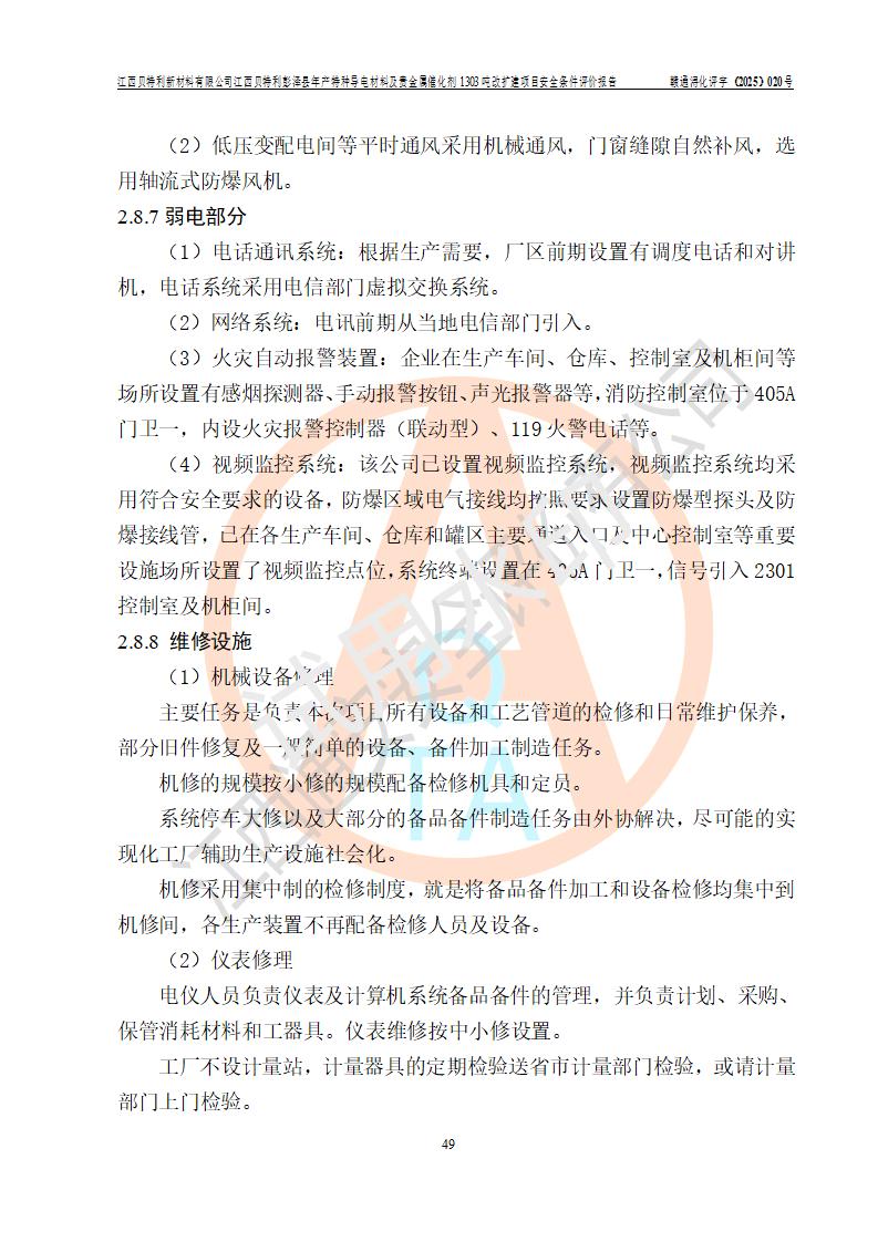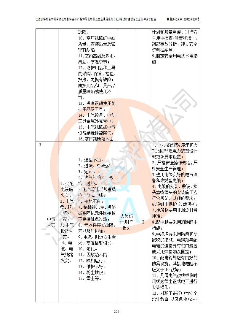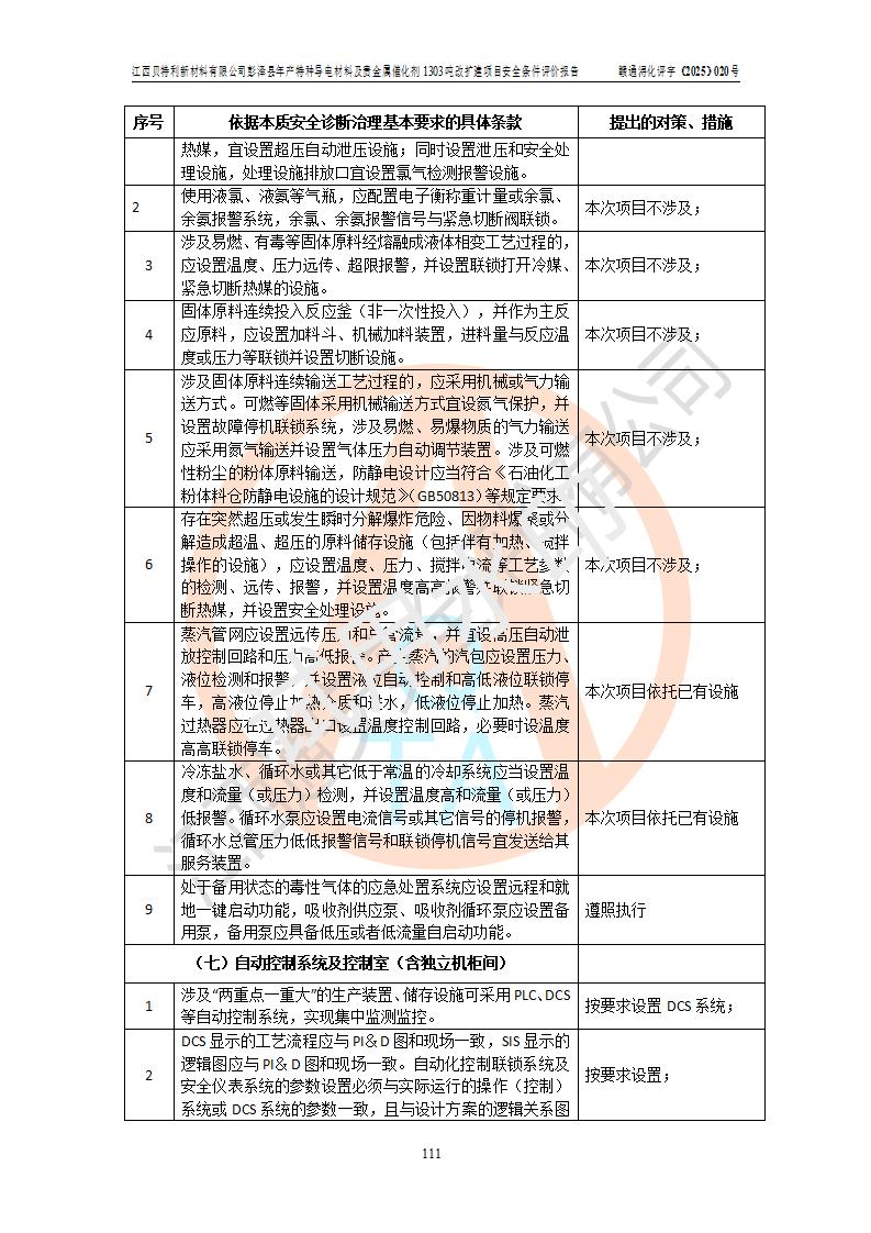 评价结论 | 江西贝特利新材料有限公司江西贝特利彭泽县年产特种导电材料及贵金属催化剂 1303吨改扩建项目的选址、总体布局、周边环境、自然环境能满足建设安全条件:项目选择的工艺过程及设备设施的安全可靠性能达到**法规、标准规定要求。 项目存在的危险有害因素可控,在落实本评价报告提出的有关安全对策措施后,其危险有害程度能达到可以接受的程度,项目建设能够实现安全运行的目标。 | |||||