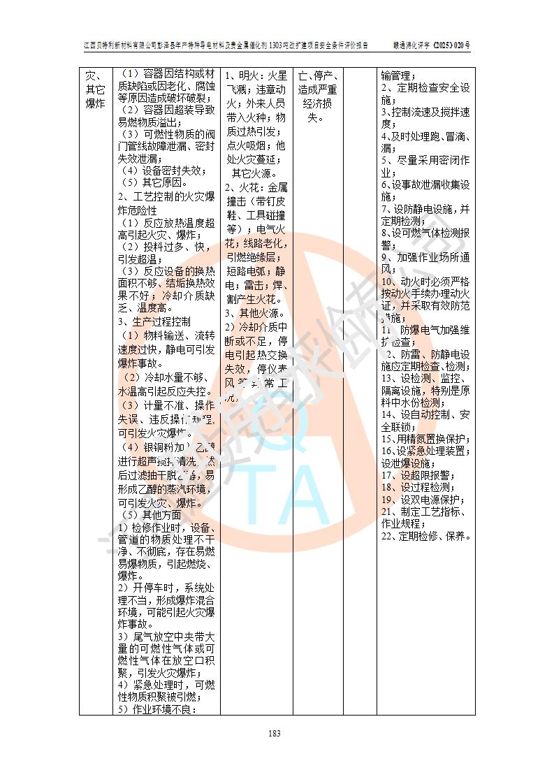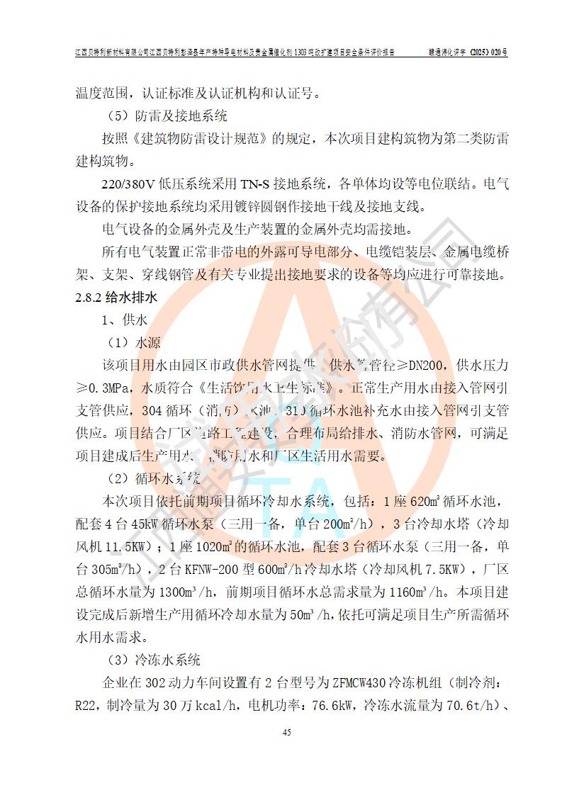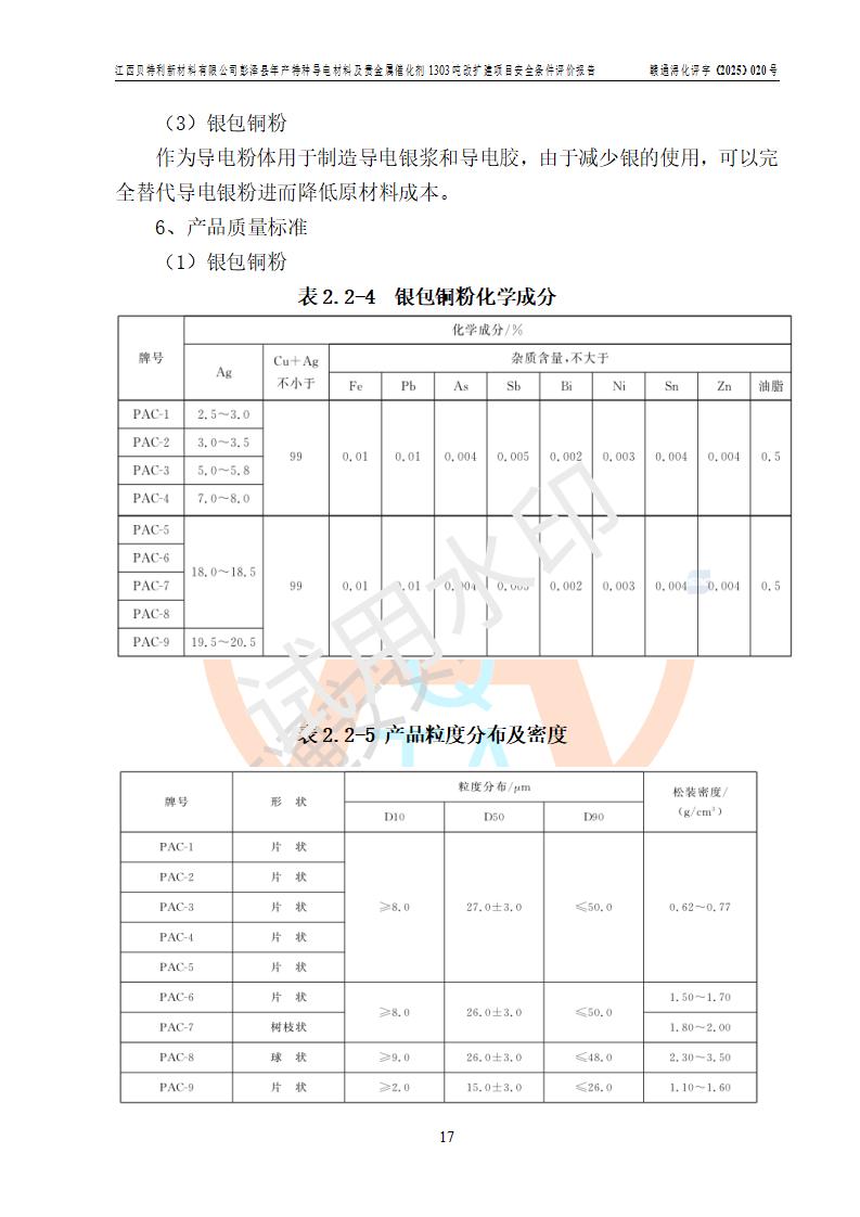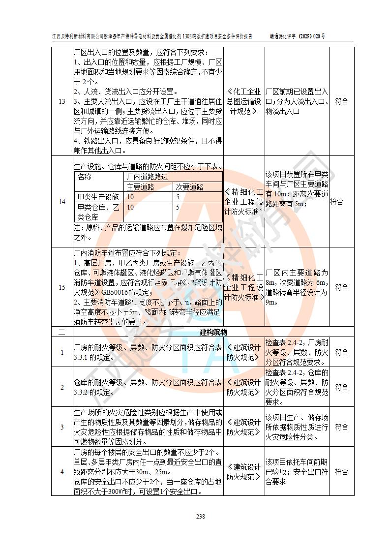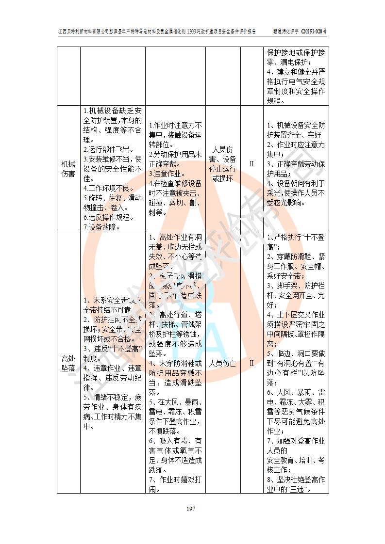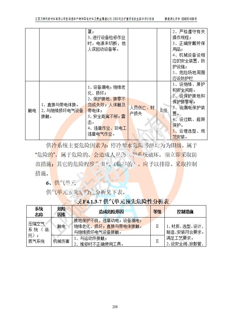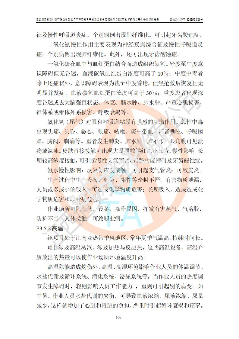 评价结论 | 江西贝特利新材料有限公司江西贝特利彭泽县年产特种导电材料及贵金属催化剂 1303吨改扩建项目的选址、总体布局、周边环境、自然环境能满足建设安全条件:项目选择的工艺过程及设备设施的安全可靠性能达到**法规、标准规定要求。 项目存在的危险有害因素可控,在落实本评价报告提出的有关安全对策措施后,其危险有害程度能达到可以接受的程度,项目建设能够实现安全运行的目标。 | |||||