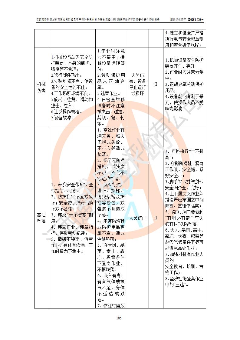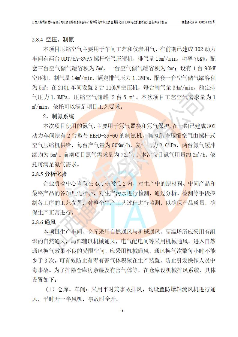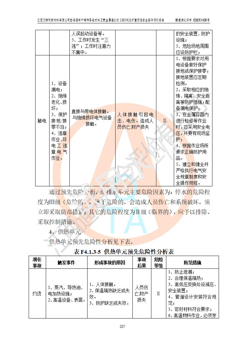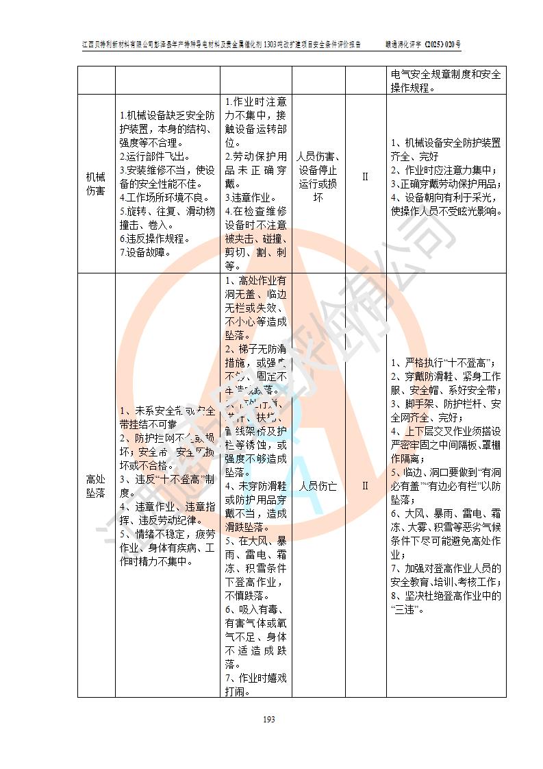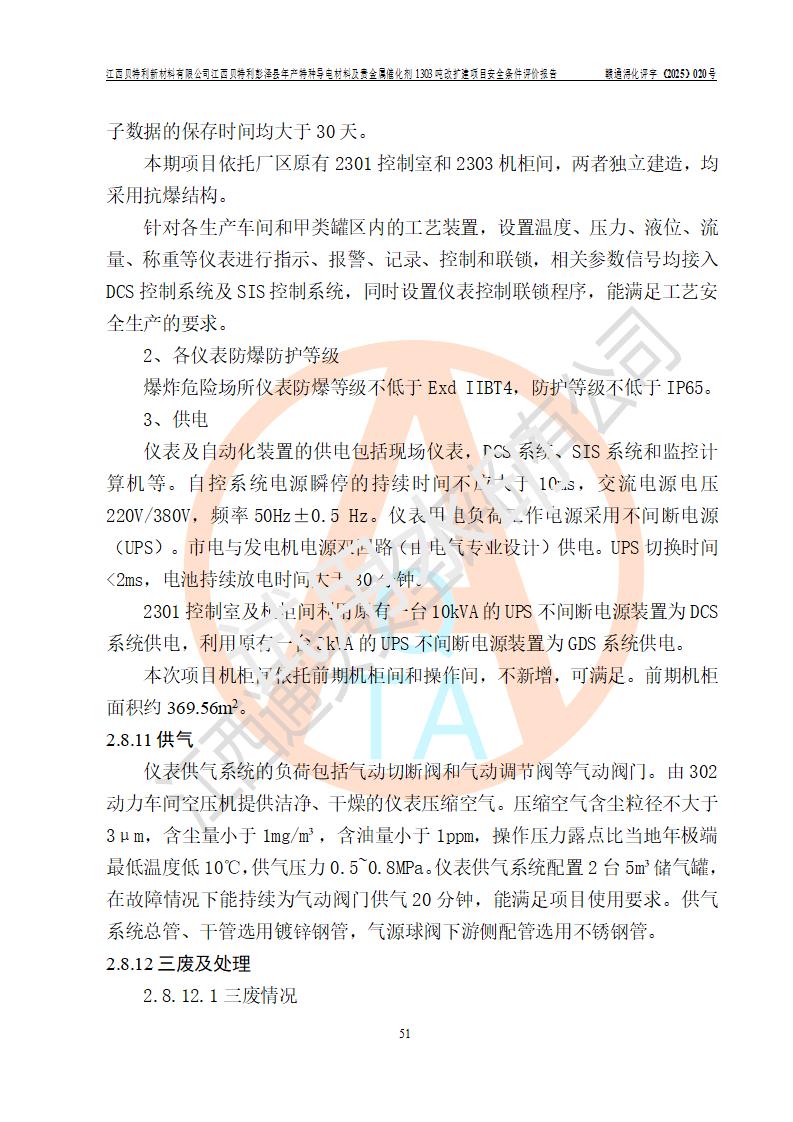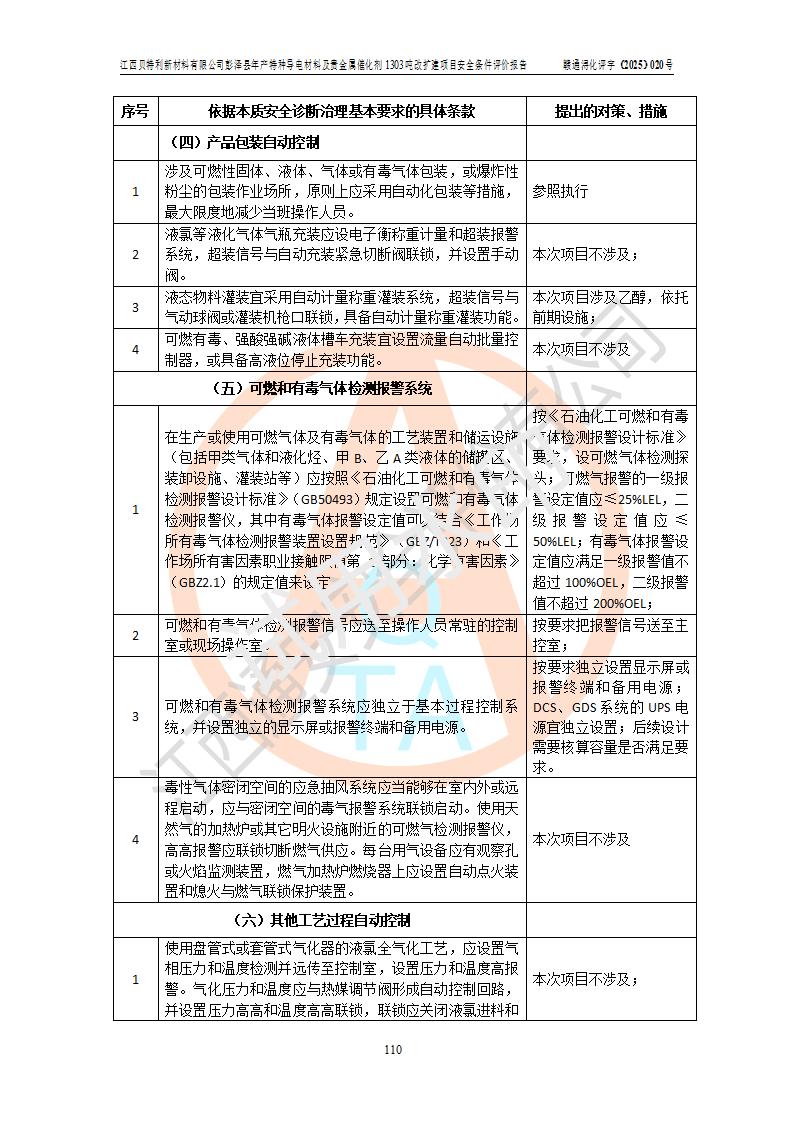 评价结论 | 江西贝特利新材料有限公司江西贝特利彭泽县年产特种导电材料及贵金属催化剂 1303吨改扩建项目的选址、总体布局、周边环境、自然环境能满足建设安全条件:项目选择的工艺过程及设备设施的安全可靠性能达到**法规、标准规定要求。 项目存在的危险有害因素可控,在落实本评价报告提出的有关安全对策措施后,其危险有害程度能达到可以接受的程度,项目建设能够实现安全运行的目标。 | |||||