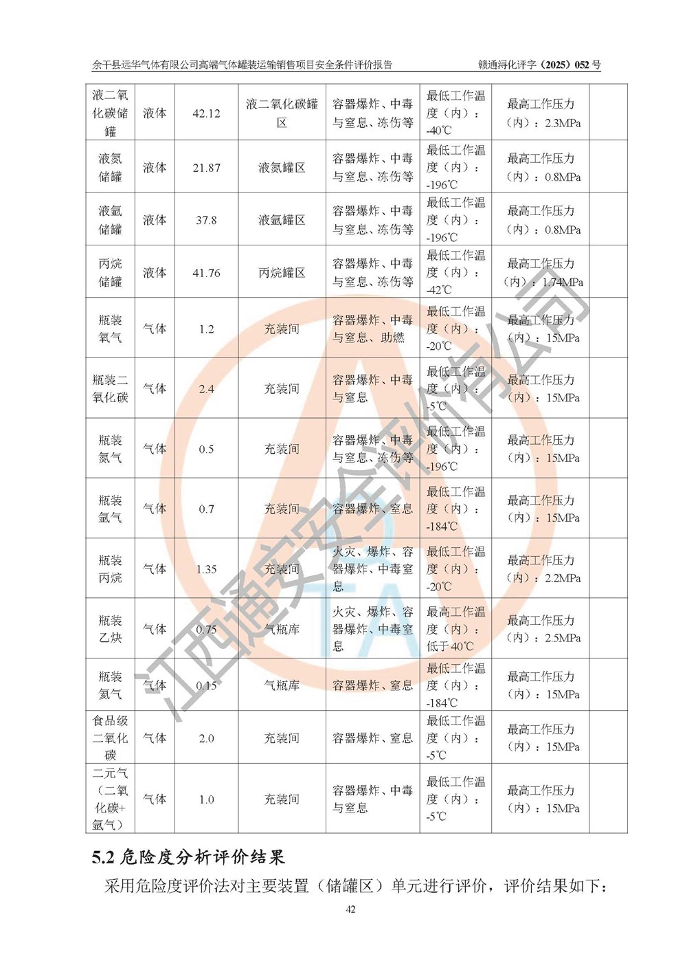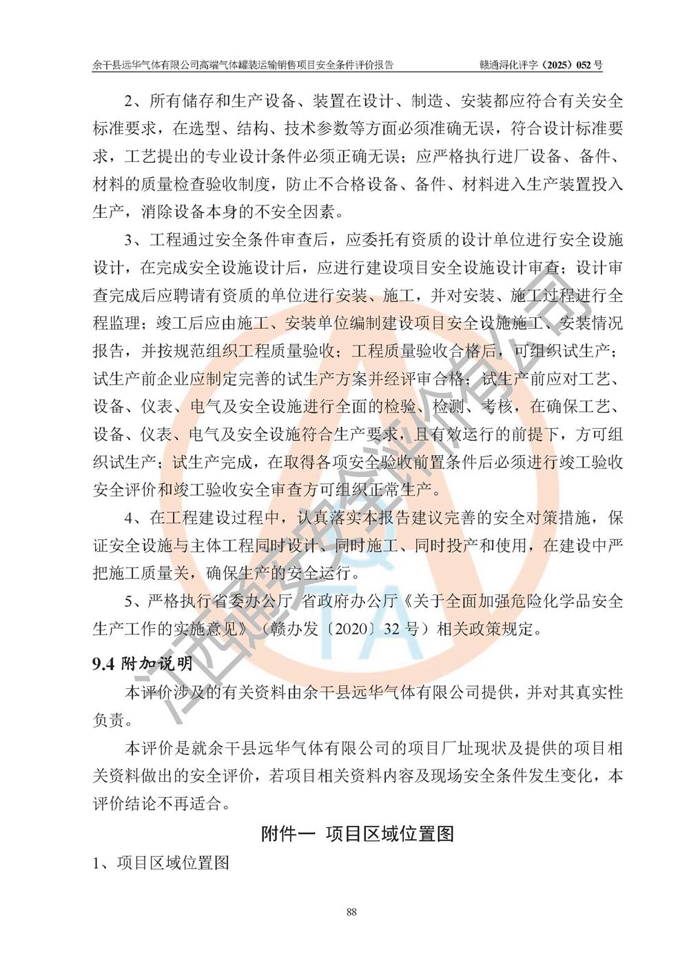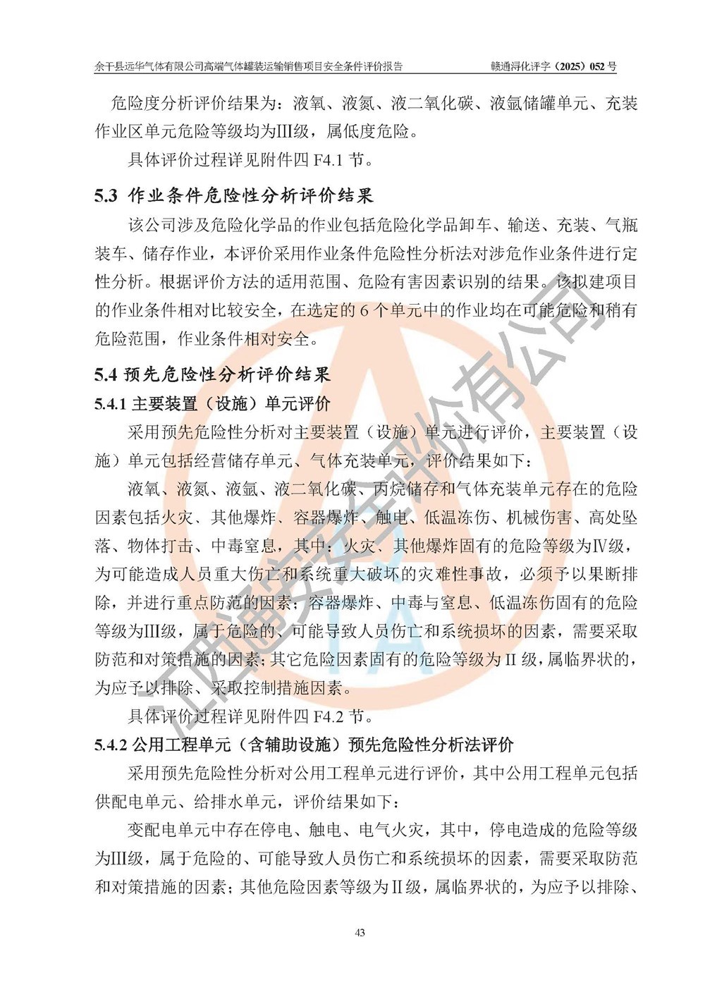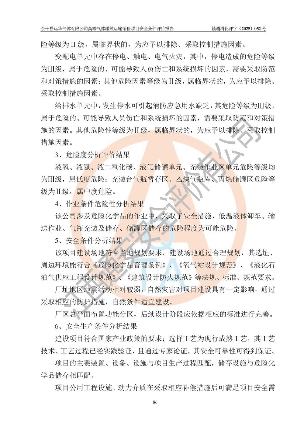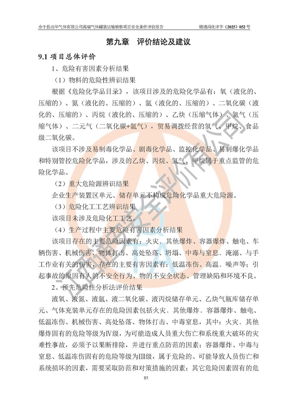评价结论 | 综上所述:余干县远华气体有限公司高端气体罐装运输销售项目的选址、总平面布局、总体运输、周边环境、自然环境能满足建设安全条件;项目选择的工艺过程及设备设施的安全可靠性能达到**法规、标准规定要求;项目存在的危险有害因素可控,在落实本评价报告提出的有关安全对策措施后,其危险有害程度能达到可以接受的程度,项目建设能够实现安全运行目标。 | ||||||
