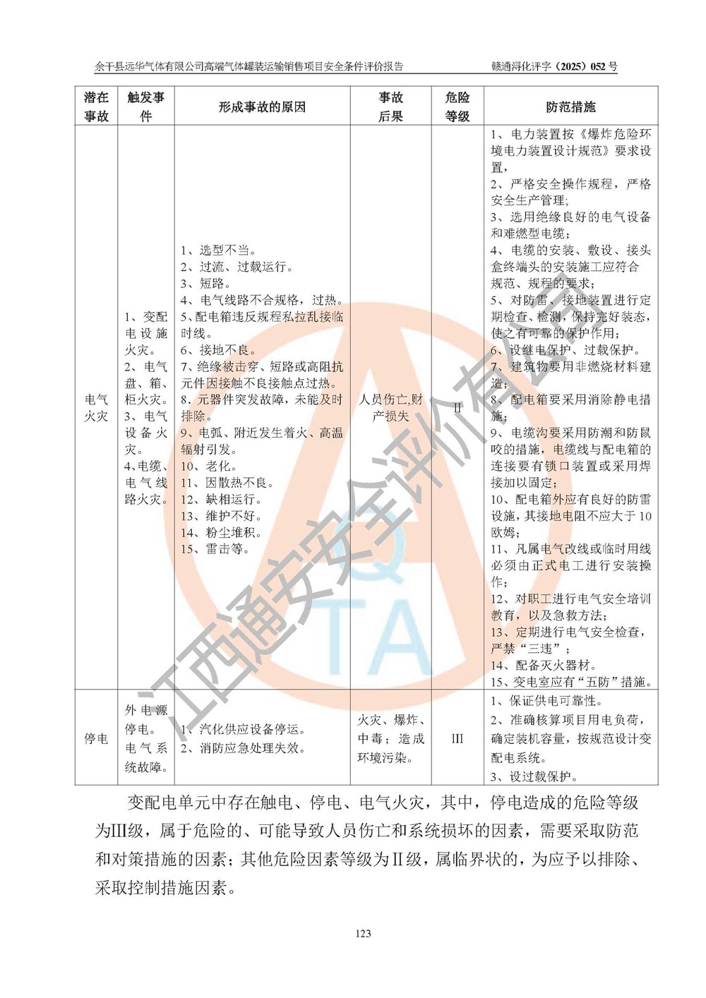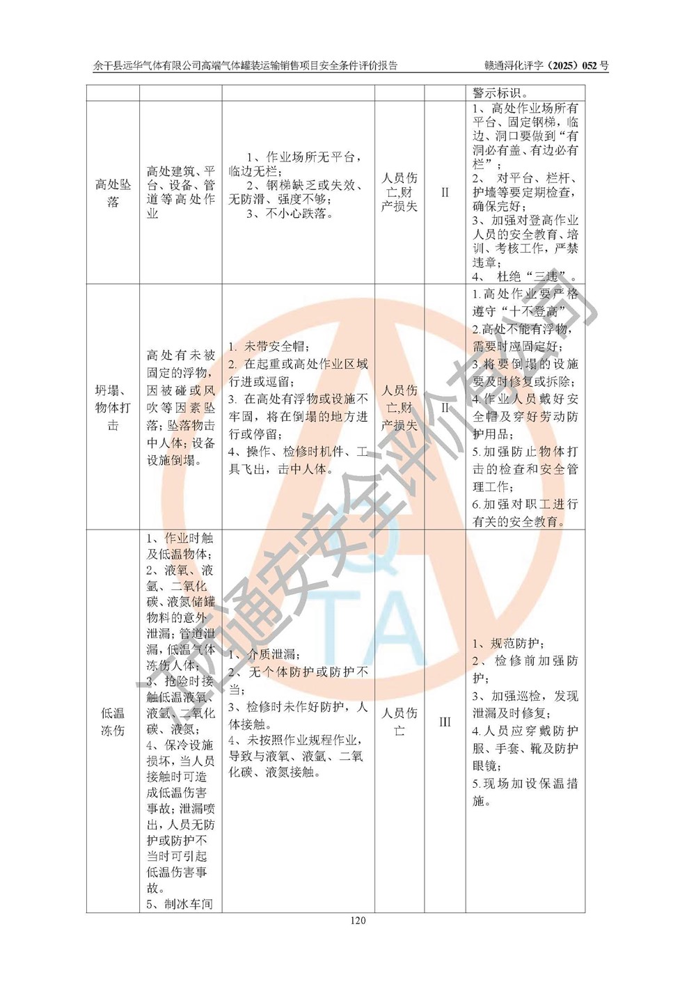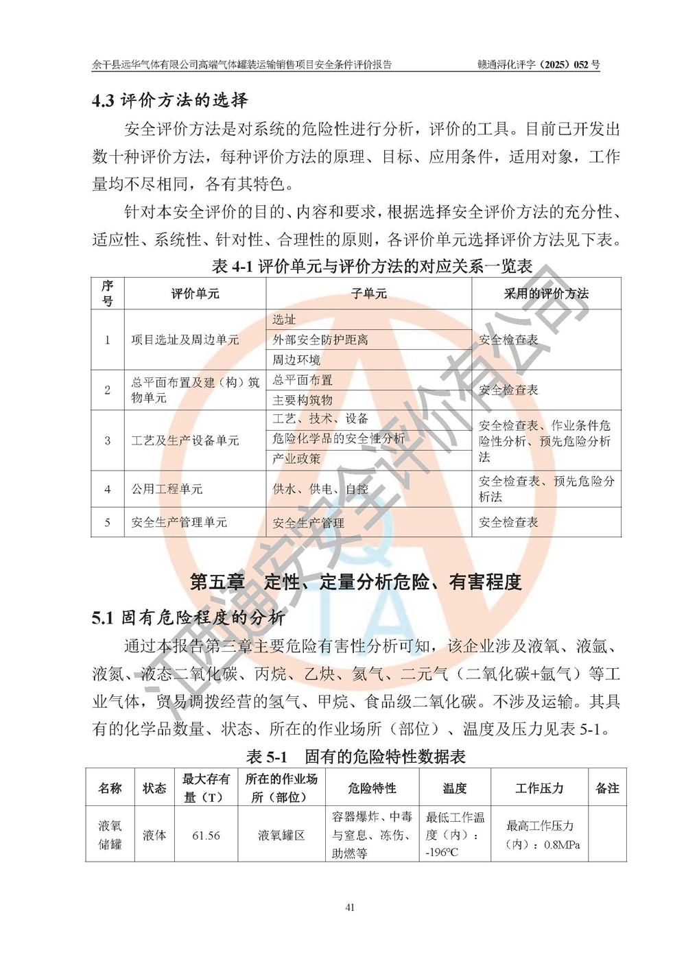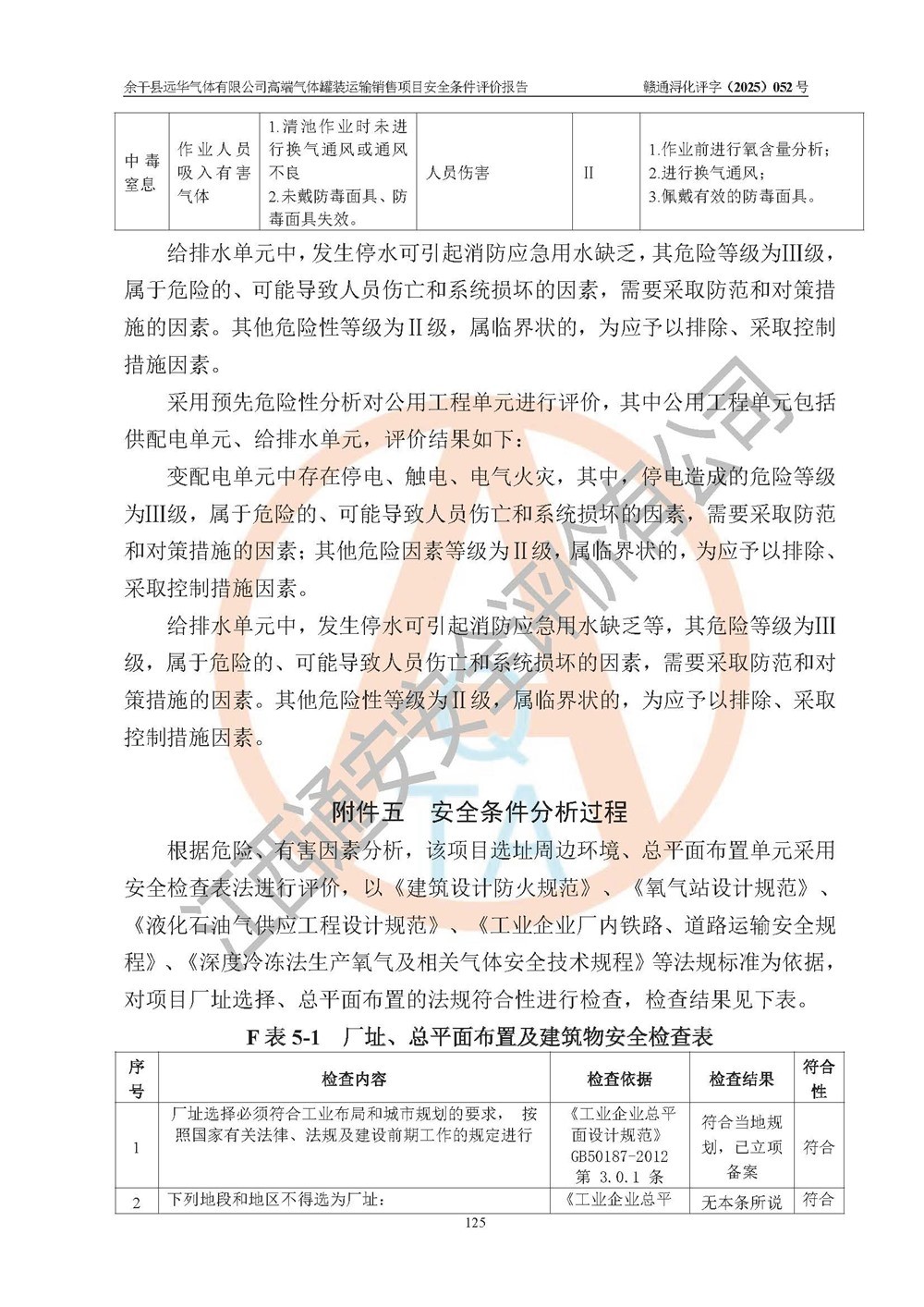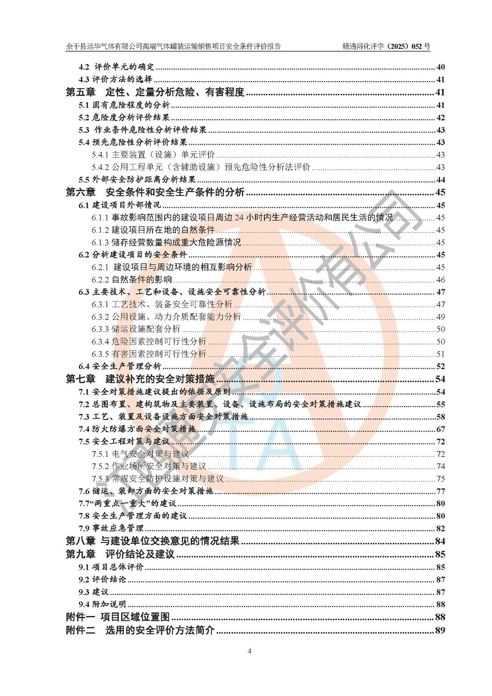 评价结论 | 综上所述:余干县远华气体有限公司高端气体罐装运输销售项目的选址、总平面布局、总体运输、周边环境、自然环境能满足建设安全条件;项目选择的工艺过程及设备设施的安全可靠性能达到**法规、标准规定要求;项目存在的危险有害因素可控,在落实本评价报告提出的有关安全对策措施后,其危险有害程度能达到可以接受的程度,项目建设能够实现安全运行目标。 | ||||||