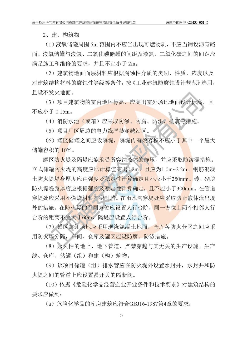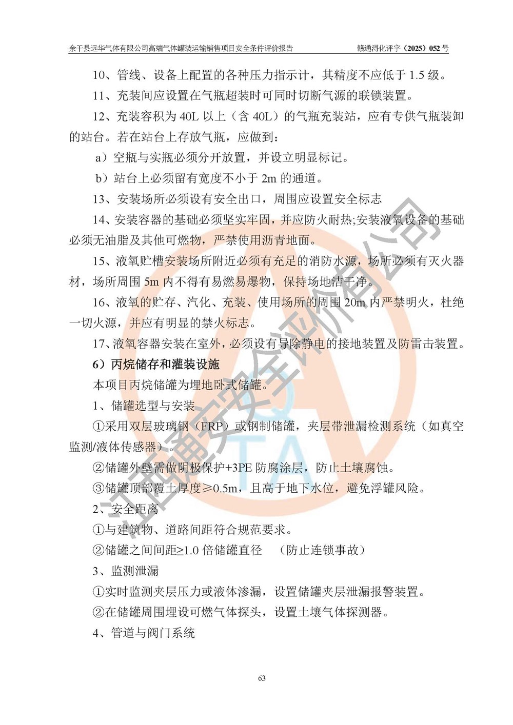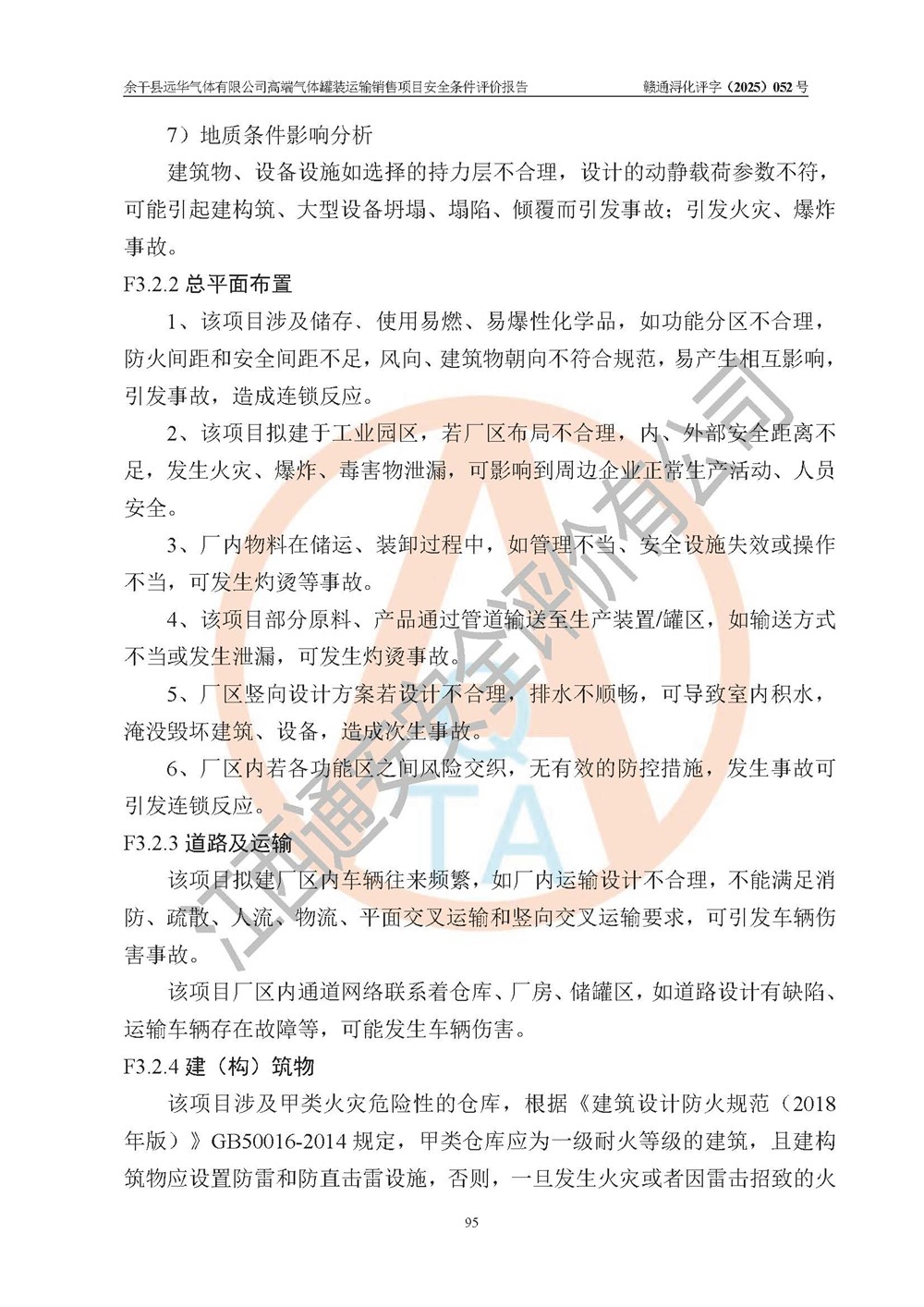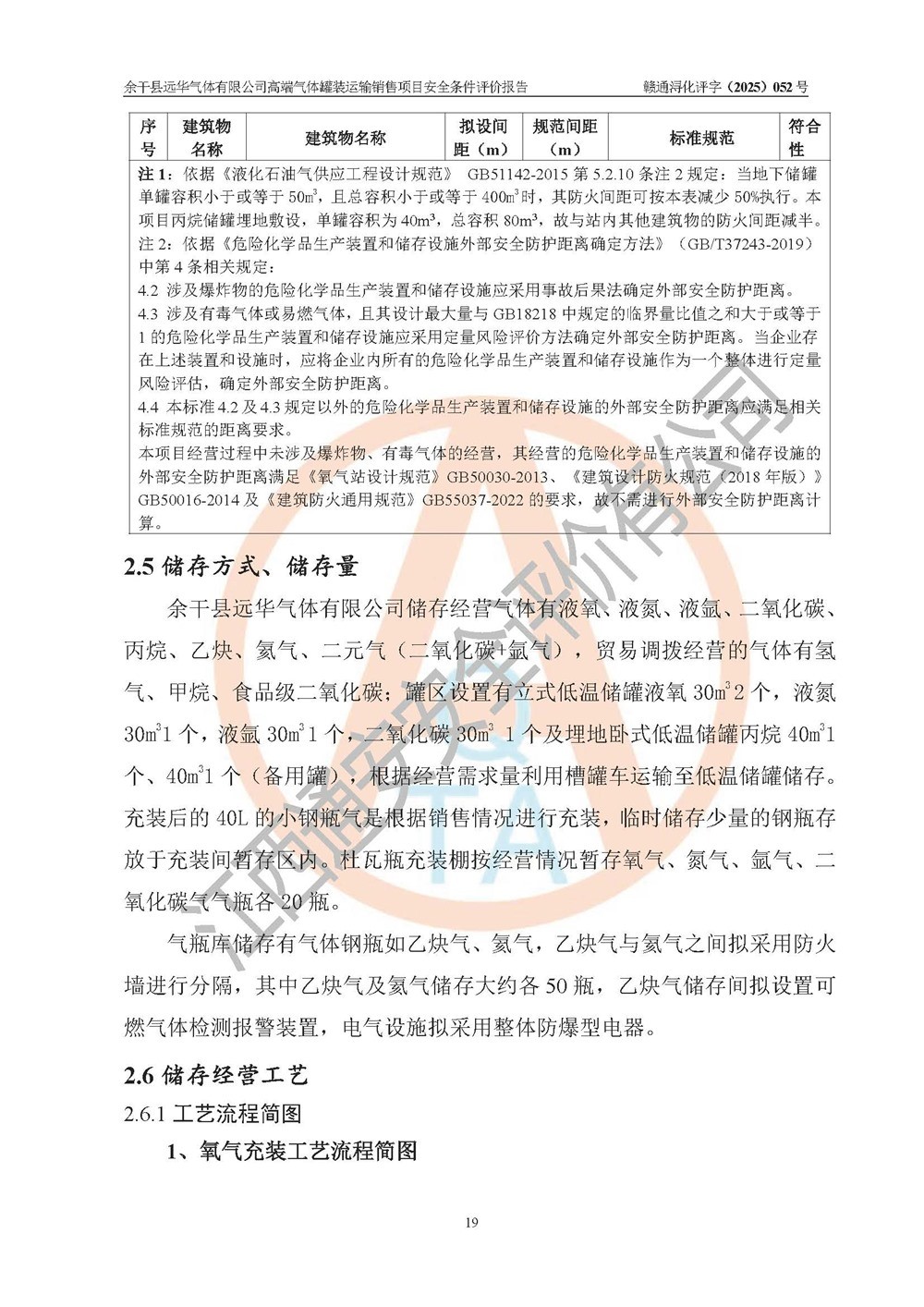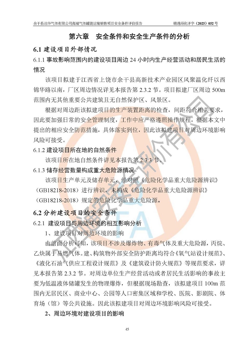 项目简介 | 余干县远华气体有限公司成立于2024年05月10日,公司类型为有限责任公司(自然人投资或控股),该公司法定**人为张建华,注册资本贰佰万元整,经营场所位于江西省上饶市余干县****产业园区内聚温化纤以西锦华路以南。经营范围:一般项目:气体、液体分离及纯净设备销售(除依法须经批准的项目外,凭营业执照依法自主开展经营活动)。 余干县远华气体有限公司于2025年02月11日取得了余干县发展和改革委员会《余干县远华气体有限公司高端气体罐装运输销售项目》备案文件,备案编号:2502-361127-04-01-434579。 该项目涉及氧、二氧化碳、氮、氩、丙烷、乙炔、氦气、二元气(二氧化碳+氩气)的储存经营,贸易调拨经营的气体氢气、甲烷、食品二氧化碳。该公司拟建低温立式储罐液氧罐30m3 2个、液态二氧化碳罐30m3 1个、液氮罐30m3 1个、液氩罐30m3 1个,及各工业气瓶100瓶、各杜瓦瓶20瓶;全压力式卧式埋地储罐丙烷40m3 1个、40m3 1个(备用罐)及丙烷工业气瓶50瓶;气瓶库内乙炔气瓶及氦气气瓶各50瓶。项目储存经营过程中涉及的氧(液态的、压缩的)、二氧化碳(液态的、压缩的)、氩(液态的、压缩的)、氮(液态的、压缩的)、丙烷、乙炔、氦气、食品级二氧化碳、二元气(二氧化碳+氩气)均属于危险化学品,贸易调拨经营的气体氢气、甲烷、食品二氧化碳属于危险化学品。不涉及易制毒化学品、剧毒化学品、监控化学品、易制爆化学品、特别管控危险化学品,乙炔、丙烷、氢气、甲烷属于重点监管的危险化学品。该项目储存经营场所(生产单元、储存单元)不构成危险化学品重大危险源。 依据《危险化学品经营许可证管理办法》(**安全生产监督管理总局令第55号,第79号修改),项目储存经营的化学品属于危险化学品,需要办理《危险化学品经营许可证》。 依据《中华人民共和国安全生产法》、《危险化学品安全管理条例》等规定的要求,危险化学品新、改、扩建的生产性建设工程**进行安全评价,根据《危险化学品建设项目安全监督管理办法》(**安全生产监督管理总局令第45号,第79号、89号令修改)的规定,危险化学品新、改、扩建的生产性建设工程**进行建设项目安全条件评价,以使工程项目的设立满足安全生产条件,项目的安全设施与主体工程同时设计、同时施工、同时投入使用,项目在安全生产及安全管理方面符合**及行业有关法律法规及标准。因此余干县远华气体有限公司委托江西通安安全评价有限公司承担该项目的安全条件评价。 江西通安安全评价有限公司接受委托后,参照现行的法律、法规和标准,按照《安全评价通则》、《安全预评价导则》、江西省应急管理厅关于印发《江西省危险化学品建设项目安全监督管理实施细则》(试行)的通知等规范规定的要求,成立评价组。评价组完成风险分析、资料收集、现场勘查和类比调查等前期准备工作,并制定评价实施计划。评价组在前期准备工作的基础上,根据企业提供的资料,分析了该项目中可能存在的主要危险、有害因素,在危险、有害因素分析基础上,根据该项目的生产工艺、功能区域特点,划分了评价单元,并针对划分的评价单元选择了相应的安全评价方法进行了逐项分析、评价,提出了相应的预防和控制对策措施。 本报告可作为余干县远华气体有限公司高端气体罐装运输销售项目安全生产技术、安全生产管理决策及办理相关安全生产行政许可事项的技术依据。 本次安全评价范围:余干县远华气体有限公司高端气体罐装运输销售项目,主要包括: (1)选址、周边环境、总平面布置及建、建构筑物(主要包括罐区、气体灌装间、气瓶库、杜瓦瓶充装棚、变配电室、制冰车间、研发中心); (2)项目的生产工艺及装置;相关的公用工程、辅助工程设施(配电房、消防泵房、消防水池/事故水池等)。 评价内容涉及工程的安全条件、安全生产条件及安全生产管理,包括生产过程中的危险有害因素,建设项目的安全条件以及工艺、设备设施的安全可靠性和安全生产方面管理的组织、机构、人员、防护设施、作业环境及管理制度等。本项目不涉及城镇燃气经营。 项目厂外运输及其运输工具不在评价范围内。涉及该项目的环境、消防、职业卫生、产品质量及施工安全等问题则应执行**的有关法规规定及相关标准;本评价引用到的**、消防、职业卫生方面的法规标准与安全评价有**的关联,环境保护、职业卫生与消防应以其主管部门审核意见为准。 | ||||||