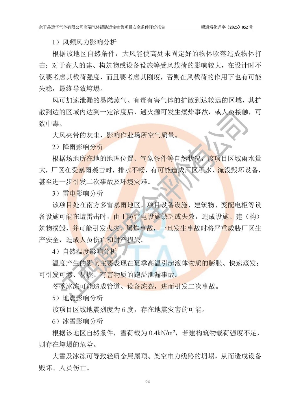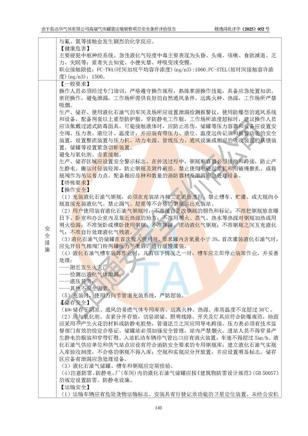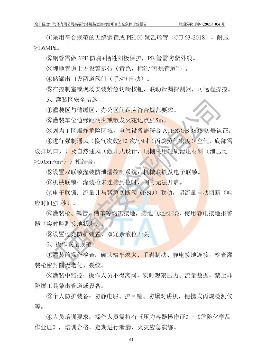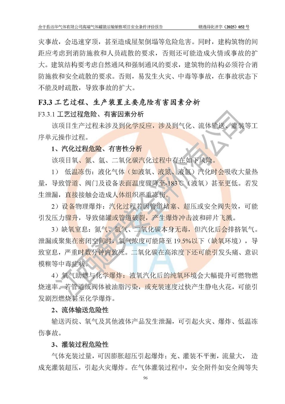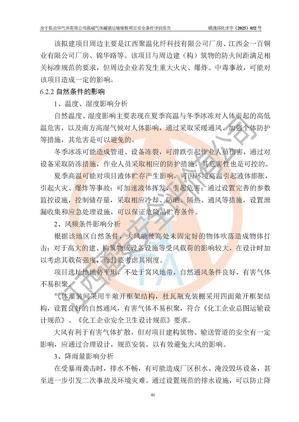 项目简介 | 余干县远华气体有限公司成立于2024年05月10日,公司类型为有限责任公司(自然人投资或控股),该公司法定**人为张建华,注册资本贰佰万元整,经营场所位于江西省上饶市余干县****产业园区内聚温化纤以西锦华路以南。经营范围:一般项目:气体、液体分离及纯净设备销售(除依法须经批准的项目外,凭营业执照依法自主开展经营活动)。 余干县远华气体有限公司于2025年02月11日取得了余干县发展和改革委员会《余干县远华气体有限公司高端气体罐装运输销售项目》备案文件,备案编号:2502-361127-04-01-434579。 该项目涉及氧、二氧化碳、氮、氩、丙烷、乙炔、氦气、二元气(二氧化碳+氩气)的储存经营,贸易调拨经营的气体氢气、甲烷、食品二氧化碳。该公司拟建低温立式储罐液氧罐30m3 2个、液态二氧化碳罐30m3 1个、液氮罐30m3 1个、液氩罐30m3 1个,及各工业气瓶100瓶、各杜瓦瓶20瓶;全压力式卧式埋地储罐丙烷40m3 1个、40m3 1个(备用罐)及丙烷工业气瓶50瓶;气瓶库内乙炔气瓶及氦气气瓶各50瓶。项目储存经营过程中涉及的氧(液态的、压缩的)、二氧化碳(液态的、压缩的)、氩(液态的、压缩的)、氮(液态的、压缩的)、丙烷、乙炔、氦气、食品级二氧化碳、二元气(二氧化碳+氩气)均属于危险化学品,贸易调拨经营的气体氢气、甲烷、食品二氧化碳属于危险化学品。不涉及易制毒化学品、剧毒化学品、监控化学品、易制爆化学品、特别管控危险化学品,乙炔、丙烷、氢气、甲烷属于重点监管的危险化学品。该项目储存经营场所(生产单元、储存单元)不构成危险化学品重大危险源。 依据《危险化学品经营许可证管理办法》(**安全生产监督管理总局令第55号,第79号修改),项目储存经营的化学品属于危险化学品,需要办理《危险化学品经营许可证》。 依据《中华人民共和国安全生产法》、《危险化学品安全管理条例》等规定的要求,危险化学品新、改、扩建的生产性建设工程**进行安全评价,根据《危险化学品建设项目安全监督管理办法》(**安全生产监督管理总局令第45号,第79号、89号令修改)的规定,危险化学品新、改、扩建的生产性建设工程**进行建设项目安全条件评价,以使工程项目的设立满足安全生产条件,项目的安全设施与主体工程同时设计、同时施工、同时投入使用,项目在安全生产及安全管理方面符合**及行业有关法律法规及标准。因此余干县远华气体有限公司委托江西通安安全评价有限公司承担该项目的安全条件评价。 江西通安安全评价有限公司接受委托后,参照现行的法律、法规和标准,按照《安全评价通则》、《安全预评价导则》、江西省应急管理厅关于印发《江西省危险化学品建设项目安全监督管理实施细则》(试行)的通知等规范规定的要求,成立评价组。评价组完成风险分析、资料收集、现场勘查和类比调查等前期准备工作,并制定评价实施计划。评价组在前期准备工作的基础上,根据企业提供的资料,分析了该项目中可能存在的主要危险、有害因素,在危险、有害因素分析基础上,根据该项目的生产工艺、功能区域特点,划分了评价单元,并针对划分的评价单元选择了相应的安全评价方法进行了逐项分析、评价,提出了相应的预防和控制对策措施。 本报告可作为余干县远华气体有限公司高端气体罐装运输销售项目安全生产技术、安全生产管理决策及办理相关安全生产行政许可事项的技术依据。 本次安全评价范围:余干县远华气体有限公司高端气体罐装运输销售项目,主要包括: (1)选址、周边环境、总平面布置及建、建构筑物(主要包括罐区、气体灌装间、气瓶库、杜瓦瓶充装棚、变配电室、制冰车间、研发中心); (2)项目的生产工艺及装置;相关的公用工程、辅助工程设施(配电房、消防泵房、消防水池/事故水池等)。 评价内容涉及工程的安全条件、安全生产条件及安全生产管理,包括生产过程中的危险有害因素,建设项目的安全条件以及工艺、设备设施的安全可靠性和安全生产方面管理的组织、机构、人员、防护设施、作业环境及管理制度等。本项目不涉及城镇燃气经营。 项目厂外运输及其运输工具不在评价范围内。涉及该项目的环境、消防、职业卫生、产品质量及施工安全等问题则应执行**的有关法规规定及相关标准;本评价引用到的**、消防、职业卫生方面的法规标准与安全评价有**的关联,环境保护、职业卫生与消防应以其主管部门审核意见为准。 | ||||||