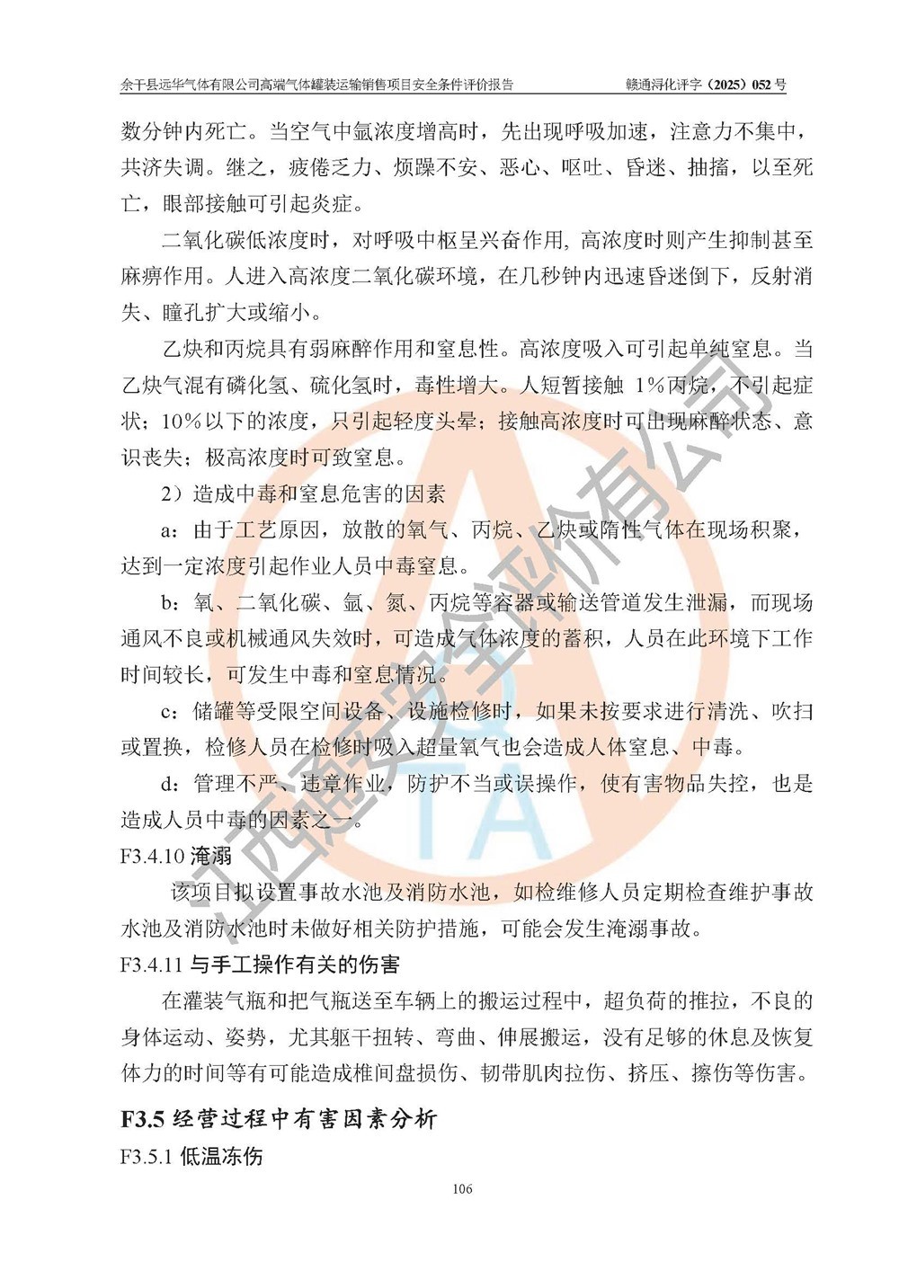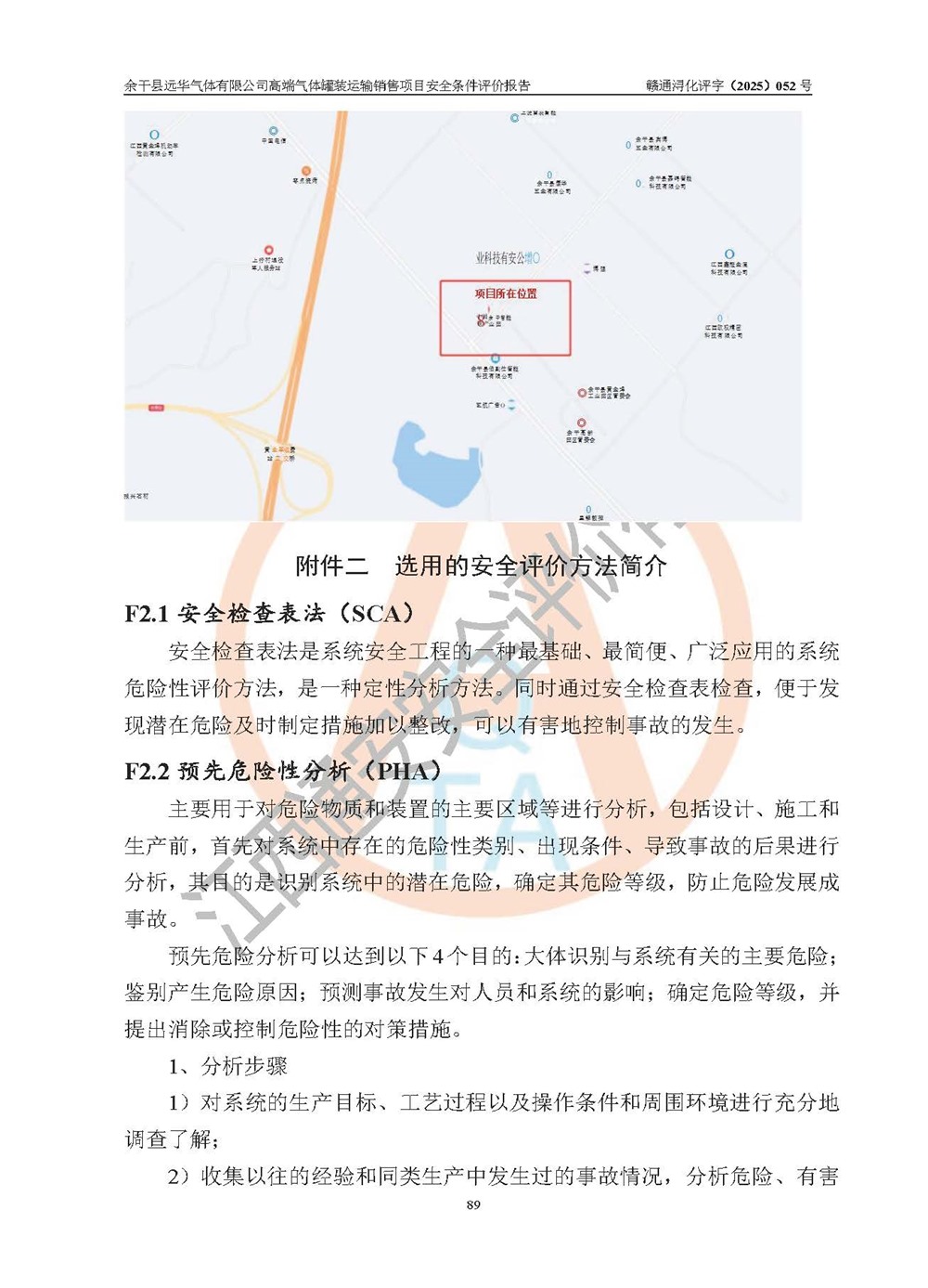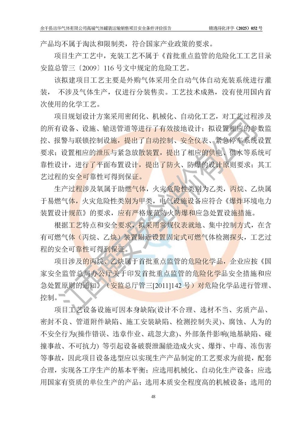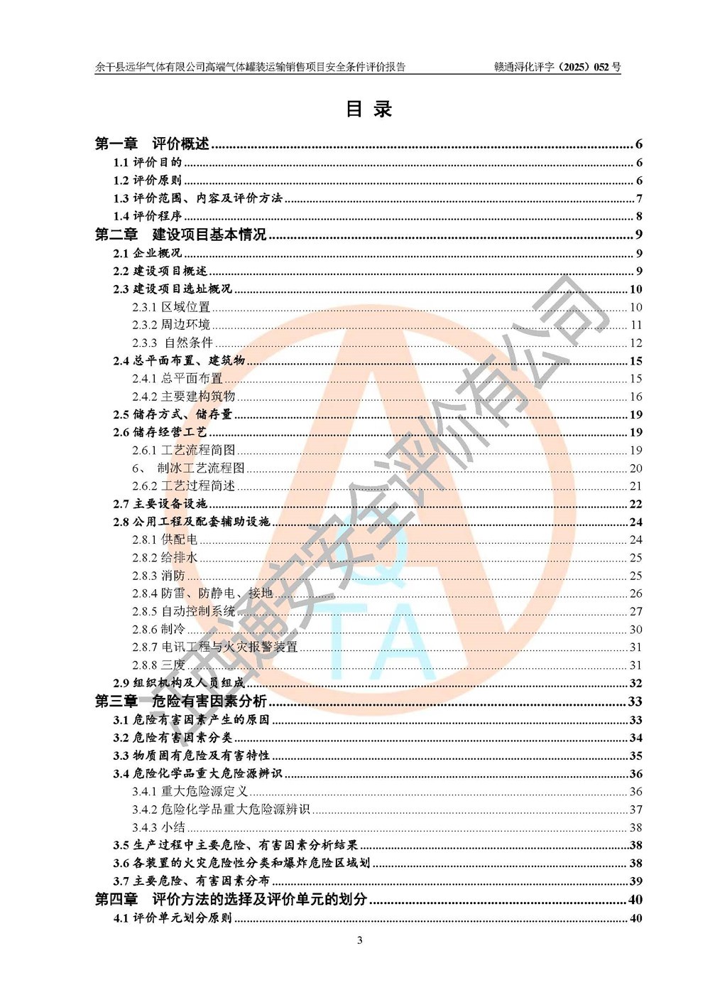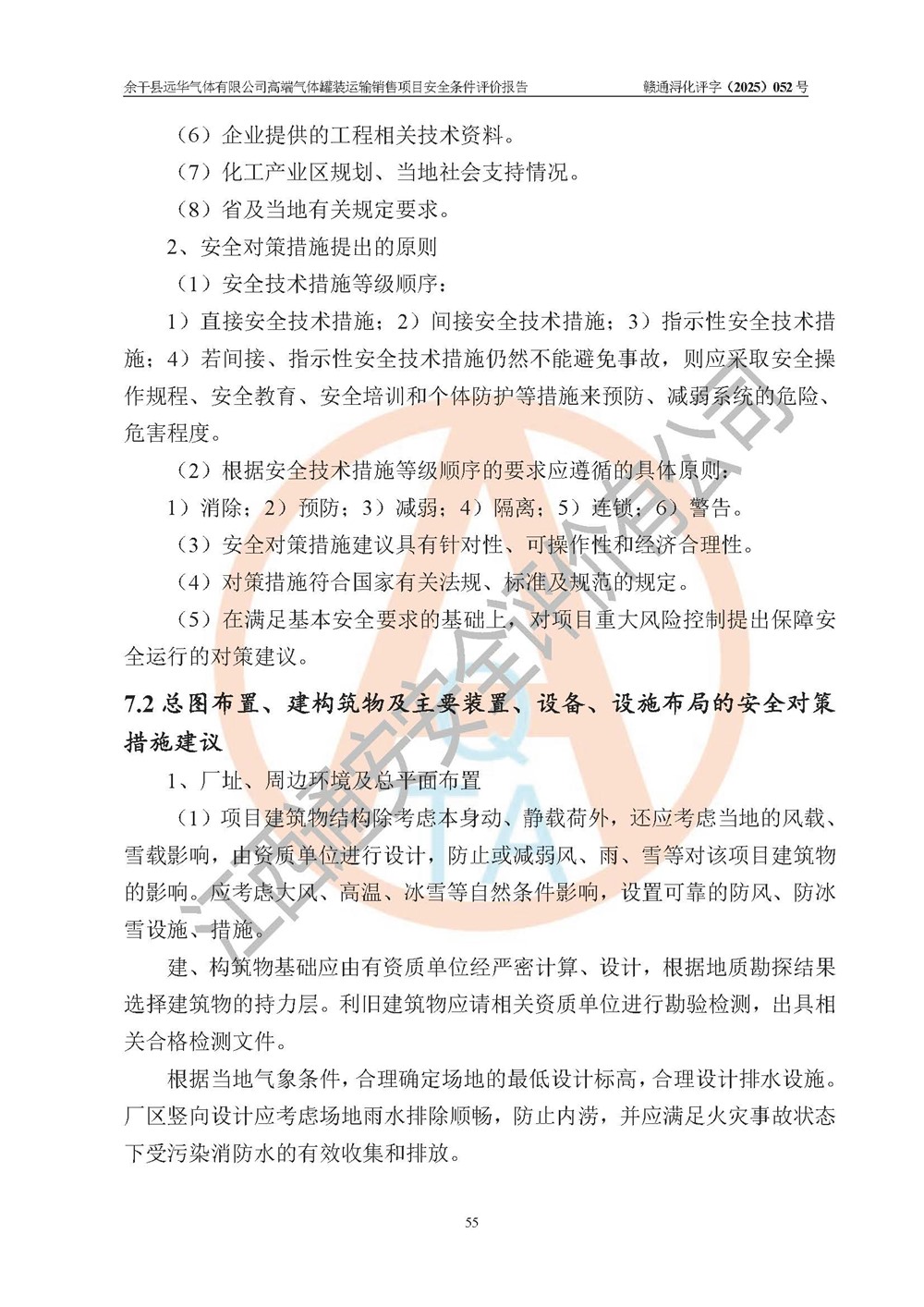 项目简介 | 余干县远华气体有限公司成立于2024年05月10日,公司类型为有限责任公司(自然人投资或控股),该公司法定**人为张建华,注册资本贰佰万元整,经营场所位于江西省上饶市余干县****产业园区内聚温化纤以西锦华路以南。经营范围:一般项目:气体、液体分离及纯净设备销售(除依法须经批准的项目外,凭营业执照依法自主开展经营活动)。 余干县远华气体有限公司于2025年02月11日取得了余干县发展和改革委员会《余干县远华气体有限公司高端气体罐装运输销售项目》备案文件,备案编号:2502-361127-04-01-434579。 该项目涉及氧、二氧化碳、氮、氩、丙烷、乙炔、氦气、二元气(二氧化碳+氩气)的储存经营,贸易调拨经营的气体氢气、甲烷、食品二氧化碳。该公司拟建低温立式储罐液氧罐30m3 2个、液态二氧化碳罐30m3 1个、液氮罐30m3 1个、液氩罐30m3 1个,及各工业气瓶100瓶、各杜瓦瓶20瓶;全压力式卧式埋地储罐丙烷40m3 1个、40m3 1个(备用罐)及丙烷工业气瓶50瓶;气瓶库内乙炔气瓶及氦气气瓶各50瓶。项目储存经营过程中涉及的氧(液态的、压缩的)、二氧化碳(液态的、压缩的)、氩(液态的、压缩的)、氮(液态的、压缩的)、丙烷、乙炔、氦气、食品级二氧化碳、二元气(二氧化碳+氩气)均属于危险化学品,贸易调拨经营的气体氢气、甲烷、食品二氧化碳属于危险化学品。不涉及易制毒化学品、剧毒化学品、监控化学品、易制爆化学品、特别管控危险化学品,乙炔、丙烷、氢气、甲烷属于重点监管的危险化学品。该项目储存经营场所(生产单元、储存单元)不构成危险化学品重大危险源。 依据《危险化学品经营许可证管理办法》(**安全生产监督管理总局令第55号,第79号修改),项目储存经营的化学品属于危险化学品,需要办理《危险化学品经营许可证》。 依据《中华人民共和国安全生产法》、《危险化学品安全管理条例》等规定的要求,危险化学品新、改、扩建的生产性建设工程**进行安全评价,根据《危险化学品建设项目安全监督管理办法》(**安全生产监督管理总局令第45号,第79号、89号令修改)的规定,危险化学品新、改、扩建的生产性建设工程**进行建设项目安全条件评价,以使工程项目的设立满足安全生产条件,项目的安全设施与主体工程同时设计、同时施工、同时投入使用,项目在安全生产及安全管理方面符合**及行业有关法律法规及标准。因此余干县远华气体有限公司委托江西通安安全评价有限公司承担该项目的安全条件评价。 江西通安安全评价有限公司接受委托后,参照现行的法律、法规和标准,按照《安全评价通则》、《安全预评价导则》、江西省应急管理厅关于印发《江西省危险化学品建设项目安全监督管理实施细则》(试行)的通知等规范规定的要求,成立评价组。评价组完成风险分析、资料收集、现场勘查和类比调查等前期准备工作,并制定评价实施计划。评价组在前期准备工作的基础上,根据企业提供的资料,分析了该项目中可能存在的主要危险、有害因素,在危险、有害因素分析基础上,根据该项目的生产工艺、功能区域特点,划分了评价单元,并针对划分的评价单元选择了相应的安全评价方法进行了逐项分析、评价,提出了相应的预防和控制对策措施。 本报告可作为余干县远华气体有限公司高端气体罐装运输销售项目安全生产技术、安全生产管理决策及办理相关安全生产行政许可事项的技术依据。 本次安全评价范围:余干县远华气体有限公司高端气体罐装运输销售项目,主要包括: (1)选址、周边环境、总平面布置及建、建构筑物(主要包括罐区、气体灌装间、气瓶库、杜瓦瓶充装棚、变配电室、制冰车间、研发中心); (2)项目的生产工艺及装置;相关的公用工程、辅助工程设施(配电房、消防泵房、消防水池/事故水池等)。 评价内容涉及工程的安全条件、安全生产条件及安全生产管理,包括生产过程中的危险有害因素,建设项目的安全条件以及工艺、设备设施的安全可靠性和安全生产方面管理的组织、机构、人员、防护设施、作业环境及管理制度等。本项目不涉及城镇燃气经营。 项目厂外运输及其运输工具不在评价范围内。涉及该项目的环境、消防、职业卫生、产品质量及施工安全等问题则应执行**的有关法规规定及相关标准;本评价引用到的**、消防、职业卫生方面的法规标准与安全评价有**的关联,环境保护、职业卫生与消防应以其主管部门审核意见为准。 | ||||||