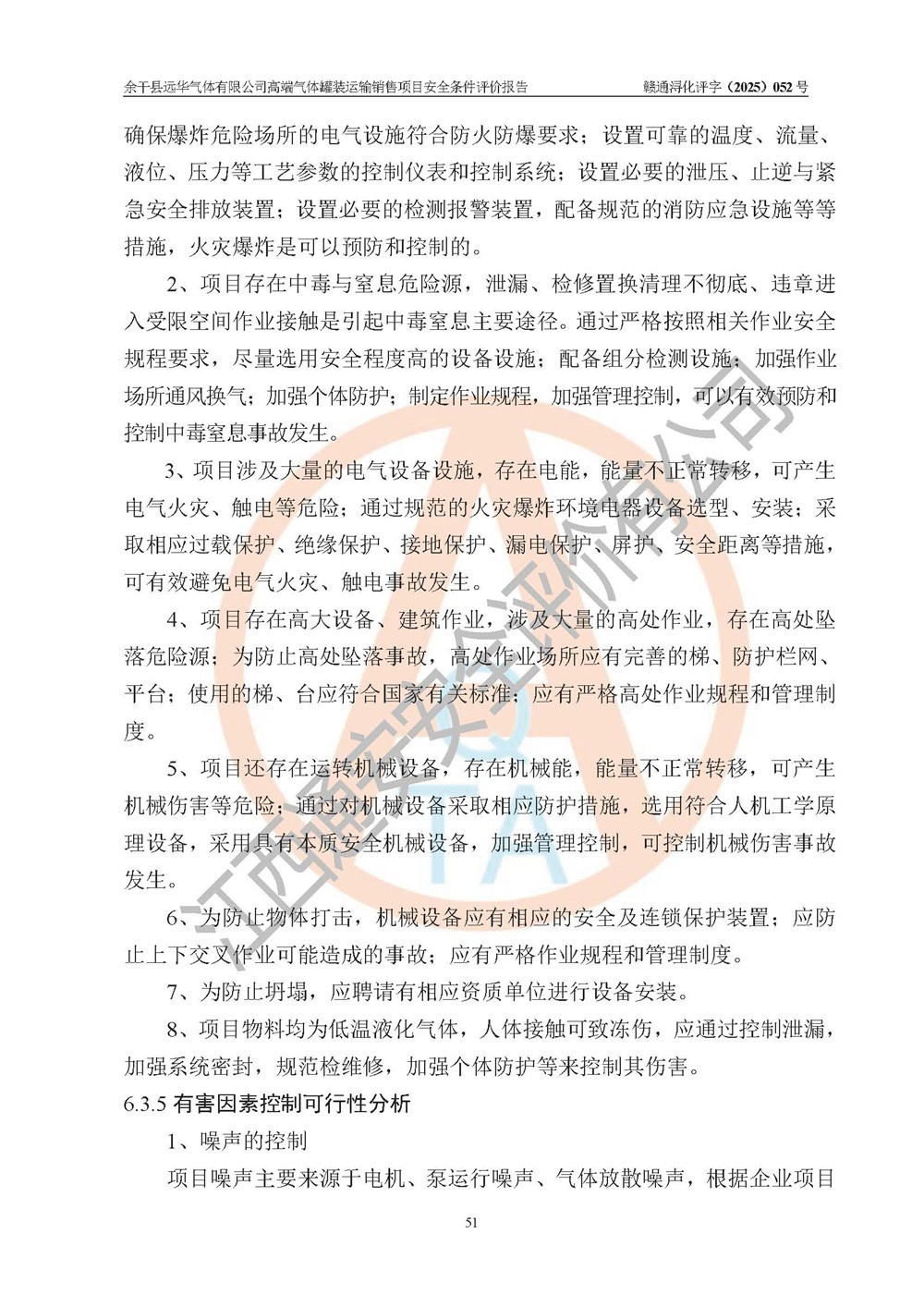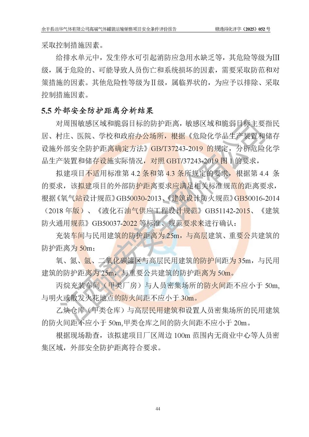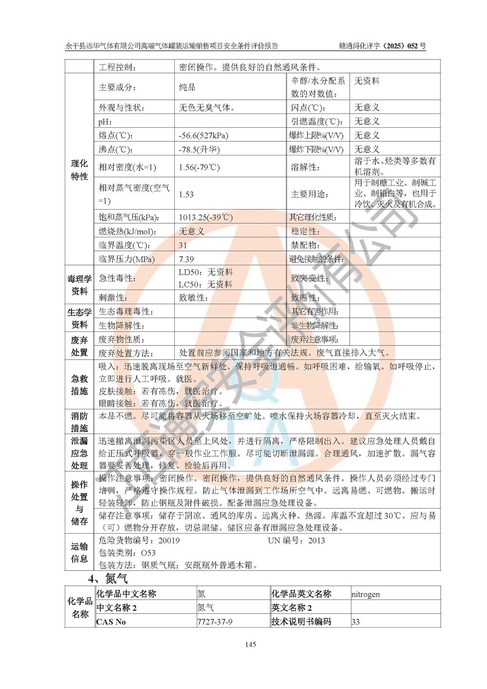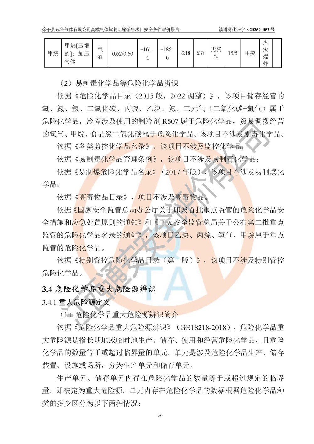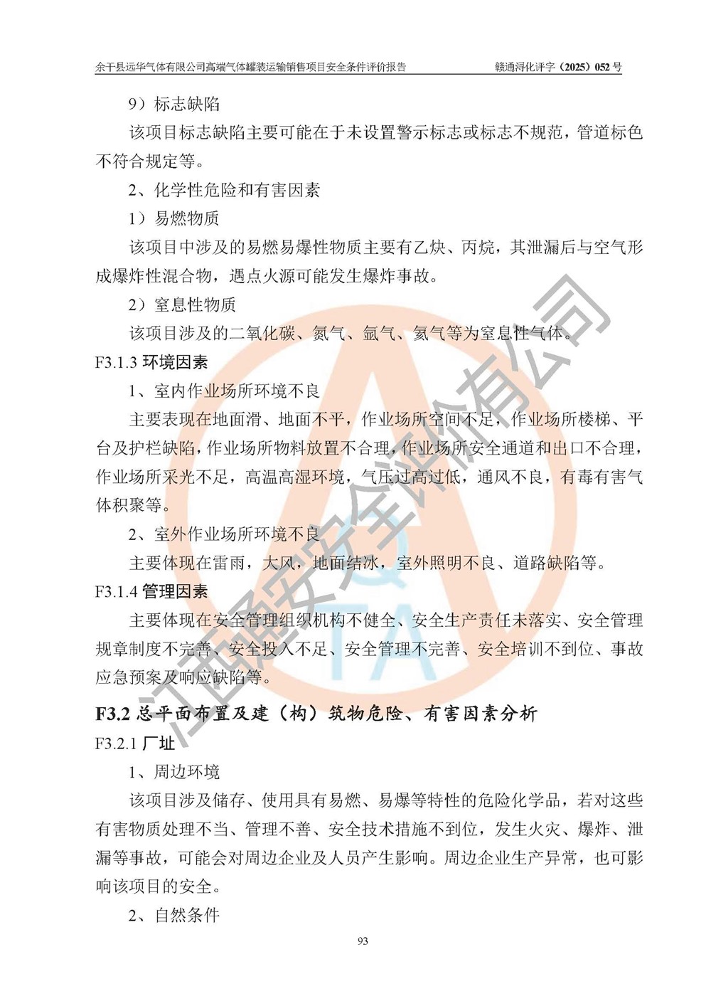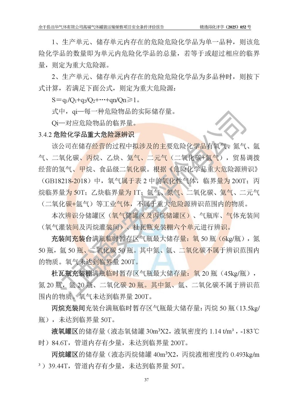 项目简介 | 余干县远华气体有限公司成立于2024年05月10日,公司类型为有限责任公司(自然人投资或控股),该公司法定**人为张建华,注册资本贰佰万元整,经营场所位于江西省上饶市余干县****产业园区内聚温化纤以西锦华路以南。经营范围:一般项目:气体、液体分离及纯净设备销售(除依法须经批准的项目外,凭营业执照依法自主开展经营活动)。 余干县远华气体有限公司于2025年02月11日取得了余干县发展和改革委员会《余干县远华气体有限公司高端气体罐装运输销售项目》备案文件,备案编号:2502-361127-04-01-434579。 该项目涉及氧、二氧化碳、氮、氩、丙烷、乙炔、氦气、二元气(二氧化碳+氩气)的储存经营,贸易调拨经营的气体氢气、甲烷、食品二氧化碳。该公司拟建低温立式储罐液氧罐30m3 2个、液态二氧化碳罐30m3 1个、液氮罐30m3 1个、液氩罐30m3 1个,及各工业气瓶100瓶、各杜瓦瓶20瓶;全压力式卧式埋地储罐丙烷40m3 1个、40m3 1个(备用罐)及丙烷工业气瓶50瓶;气瓶库内乙炔气瓶及氦气气瓶各50瓶。项目储存经营过程中涉及的氧(液态的、压缩的)、二氧化碳(液态的、压缩的)、氩(液态的、压缩的)、氮(液态的、压缩的)、丙烷、乙炔、氦气、食品级二氧化碳、二元气(二氧化碳+氩气)均属于危险化学品,贸易调拨经营的气体氢气、甲烷、食品二氧化碳属于危险化学品。不涉及易制毒化学品、剧毒化学品、监控化学品、易制爆化学品、特别管控危险化学品,乙炔、丙烷、氢气、甲烷属于重点监管的危险化学品。该项目储存经营场所(生产单元、储存单元)不构成危险化学品重大危险源。 依据《危险化学品经营许可证管理办法》(**安全生产监督管理总局令第55号,第79号修改),项目储存经营的化学品属于危险化学品,需要办理《危险化学品经营许可证》。 依据《中华人民共和国安全生产法》、《危险化学品安全管理条例》等规定的要求,危险化学品新、改、扩建的生产性建设工程**进行安全评价,根据《危险化学品建设项目安全监督管理办法》(**安全生产监督管理总局令第45号,第79号、89号令修改)的规定,危险化学品新、改、扩建的生产性建设工程**进行建设项目安全条件评价,以使工程项目的设立满足安全生产条件,项目的安全设施与主体工程同时设计、同时施工、同时投入使用,项目在安全生产及安全管理方面符合**及行业有关法律法规及标准。因此余干县远华气体有限公司委托江西通安安全评价有限公司承担该项目的安全条件评价。 江西通安安全评价有限公司接受委托后,参照现行的法律、法规和标准,按照《安全评价通则》、《安全预评价导则》、江西省应急管理厅关于印发《江西省危险化学品建设项目安全监督管理实施细则》(试行)的通知等规范规定的要求,成立评价组。评价组完成风险分析、资料收集、现场勘查和类比调查等前期准备工作,并制定评价实施计划。评价组在前期准备工作的基础上,根据企业提供的资料,分析了该项目中可能存在的主要危险、有害因素,在危险、有害因素分析基础上,根据该项目的生产工艺、功能区域特点,划分了评价单元,并针对划分的评价单元选择了相应的安全评价方法进行了逐项分析、评价,提出了相应的预防和控制对策措施。 本报告可作为余干县远华气体有限公司高端气体罐装运输销售项目安全生产技术、安全生产管理决策及办理相关安全生产行政许可事项的技术依据。 本次安全评价范围:余干县远华气体有限公司高端气体罐装运输销售项目,主要包括: (1)选址、周边环境、总平面布置及建、建构筑物(主要包括罐区、气体灌装间、气瓶库、杜瓦瓶充装棚、变配电室、制冰车间、研发中心); (2)项目的生产工艺及装置;相关的公用工程、辅助工程设施(配电房、消防泵房、消防水池/事故水池等)。 评价内容涉及工程的安全条件、安全生产条件及安全生产管理,包括生产过程中的危险有害因素,建设项目的安全条件以及工艺、设备设施的安全可靠性和安全生产方面管理的组织、机构、人员、防护设施、作业环境及管理制度等。本项目不涉及城镇燃气经营。 项目厂外运输及其运输工具不在评价范围内。涉及该项目的环境、消防、职业卫生、产品质量及施工安全等问题则应执行**的有关法规规定及相关标准;本评价引用到的**、消防、职业卫生方面的法规标准与安全评价有**的关联,环境保护、职业卫生与消防应以其主管部门审核意见为准。 | ||||||