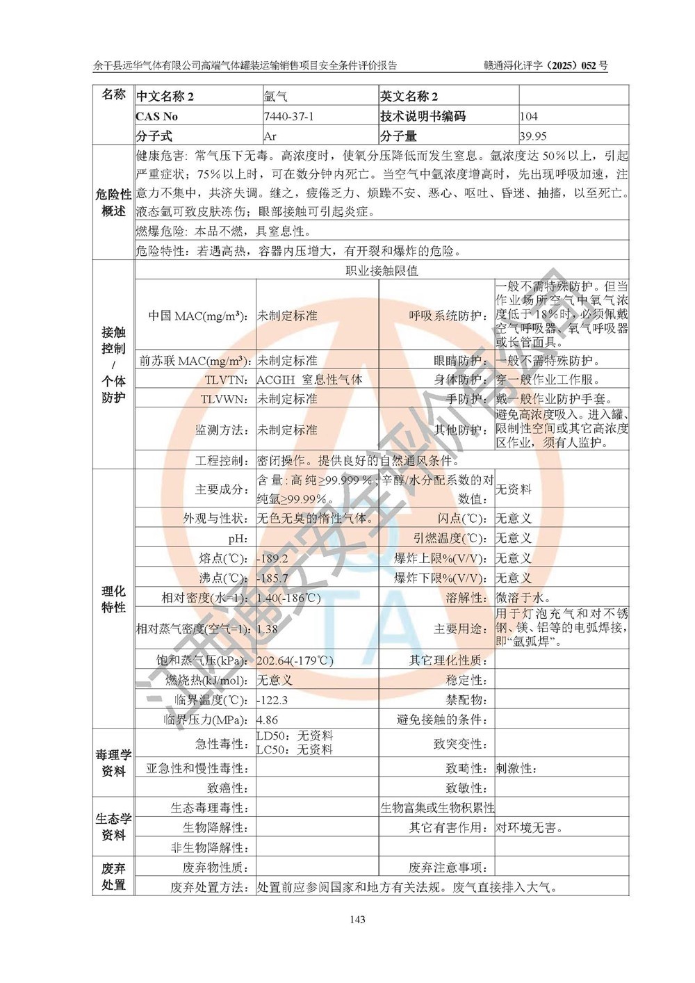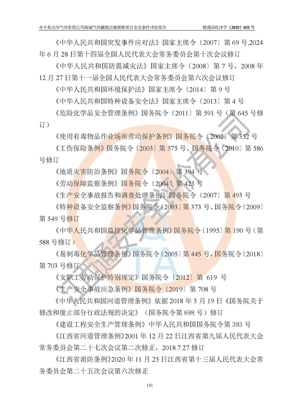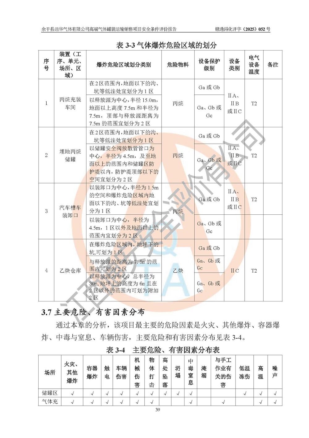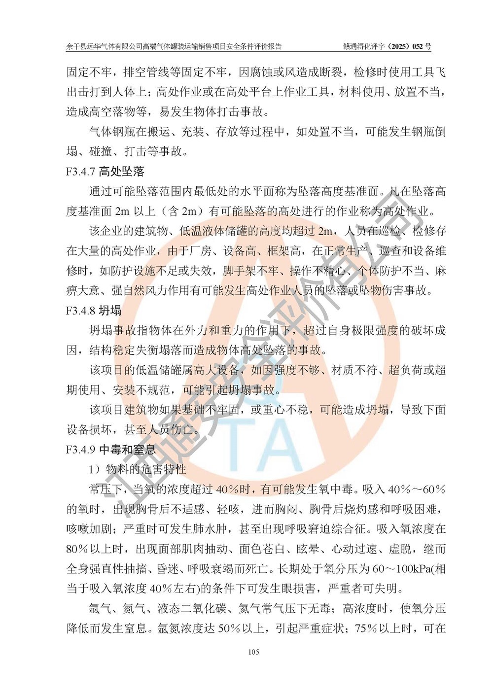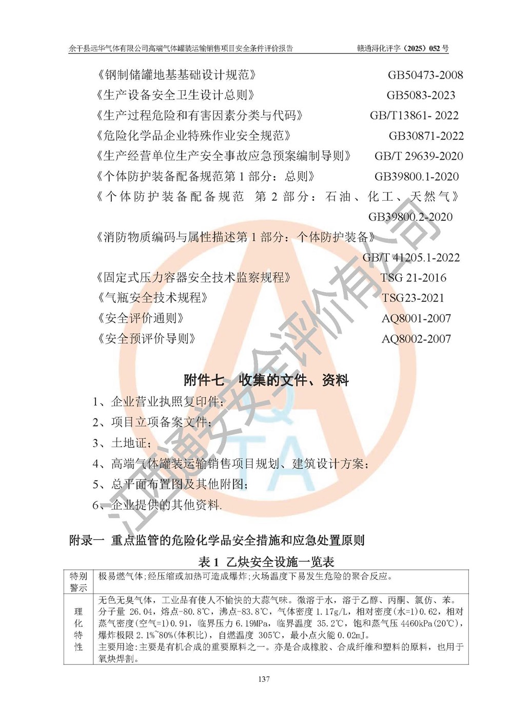 项目简介 | 余干县远华气体有限公司成立于2024年05月10日,公司类型为有限责任公司(自然人投资或控股),该公司法定**人为张建华,注册资本贰佰万元整,经营场所位于江西省上饶市余干县****产业园区内聚温化纤以西锦华路以南。经营范围:一般项目:气体、液体分离及纯净设备销售(除依法须经批准的项目外,凭营业执照依法自主开展经营活动)。 余干县远华气体有限公司于2025年02月11日取得了余干县发展和改革委员会《余干县远华气体有限公司高端气体罐装运输销售项目》备案文件,备案编号:2502-361127-04-01-434579。 该项目涉及氧、二氧化碳、氮、氩、丙烷、乙炔、氦气、二元气(二氧化碳+氩气)的储存经营,贸易调拨经营的气体氢气、甲烷、食品二氧化碳。该公司拟建低温立式储罐液氧罐30m3 2个、液态二氧化碳罐30m3 1个、液氮罐30m3 1个、液氩罐30m3 1个,及各工业气瓶100瓶、各杜瓦瓶20瓶;全压力式卧式埋地储罐丙烷40m3 1个、40m3 1个(备用罐)及丙烷工业气瓶50瓶;气瓶库内乙炔气瓶及氦气气瓶各50瓶。项目储存经营过程中涉及的氧(液态的、压缩的)、二氧化碳(液态的、压缩的)、氩(液态的、压缩的)、氮(液态的、压缩的)、丙烷、乙炔、氦气、食品级二氧化碳、二元气(二氧化碳+氩气)均属于危险化学品,贸易调拨经营的气体氢气、甲烷、食品二氧化碳属于危险化学品。不涉及易制毒化学品、剧毒化学品、监控化学品、易制爆化学品、特别管控危险化学品,乙炔、丙烷、氢气、甲烷属于重点监管的危险化学品。该项目储存经营场所(生产单元、储存单元)不构成危险化学品重大危险源。 依据《危险化学品经营许可证管理办法》(**安全生产监督管理总局令第55号,第79号修改),项目储存经营的化学品属于危险化学品,需要办理《危险化学品经营许可证》。 依据《中华人民共和国安全生产法》、《危险化学品安全管理条例》等规定的要求,危险化学品新、改、扩建的生产性建设工程**进行安全评价,根据《危险化学品建设项目安全监督管理办法》(**安全生产监督管理总局令第45号,第79号、89号令修改)的规定,危险化学品新、改、扩建的生产性建设工程**进行建设项目安全条件评价,以使工程项目的设立满足安全生产条件,项目的安全设施与主体工程同时设计、同时施工、同时投入使用,项目在安全生产及安全管理方面符合**及行业有关法律法规及标准。因此余干县远华气体有限公司委托江西通安安全评价有限公司承担该项目的安全条件评价。 江西通安安全评价有限公司接受委托后,参照现行的法律、法规和标准,按照《安全评价通则》、《安全预评价导则》、江西省应急管理厅关于印发《江西省危险化学品建设项目安全监督管理实施细则》(试行)的通知等规范规定的要求,成立评价组。评价组完成风险分析、资料收集、现场勘查和类比调查等前期准备工作,并制定评价实施计划。评价组在前期准备工作的基础上,根据企业提供的资料,分析了该项目中可能存在的主要危险、有害因素,在危险、有害因素分析基础上,根据该项目的生产工艺、功能区域特点,划分了评价单元,并针对划分的评价单元选择了相应的安全评价方法进行了逐项分析、评价,提出了相应的预防和控制对策措施。 本报告可作为余干县远华气体有限公司高端气体罐装运输销售项目安全生产技术、安全生产管理决策及办理相关安全生产行政许可事项的技术依据。 本次安全评价范围:余干县远华气体有限公司高端气体罐装运输销售项目,主要包括: (1)选址、周边环境、总平面布置及建、建构筑物(主要包括罐区、气体灌装间、气瓶库、杜瓦瓶充装棚、变配电室、制冰车间、研发中心); (2)项目的生产工艺及装置;相关的公用工程、辅助工程设施(配电房、消防泵房、消防水池/事故水池等)。 评价内容涉及工程的安全条件、安全生产条件及安全生产管理,包括生产过程中的危险有害因素,建设项目的安全条件以及工艺、设备设施的安全可靠性和安全生产方面管理的组织、机构、人员、防护设施、作业环境及管理制度等。本项目不涉及城镇燃气经营。 项目厂外运输及其运输工具不在评价范围内。涉及该项目的环境、消防、职业卫生、产品质量及施工安全等问题则应执行**的有关法规规定及相关标准;本评价引用到的**、消防、职业卫生方面的法规标准与安全评价有**的关联,环境保护、职业卫生与消防应以其主管部门审核意见为准。 | ||||||
