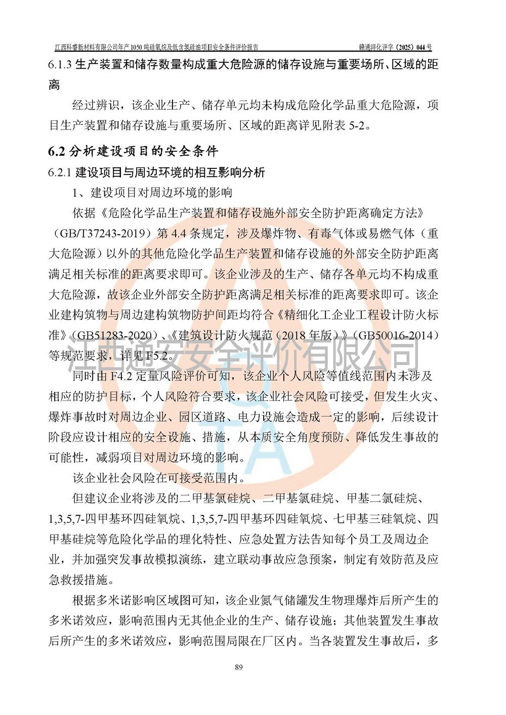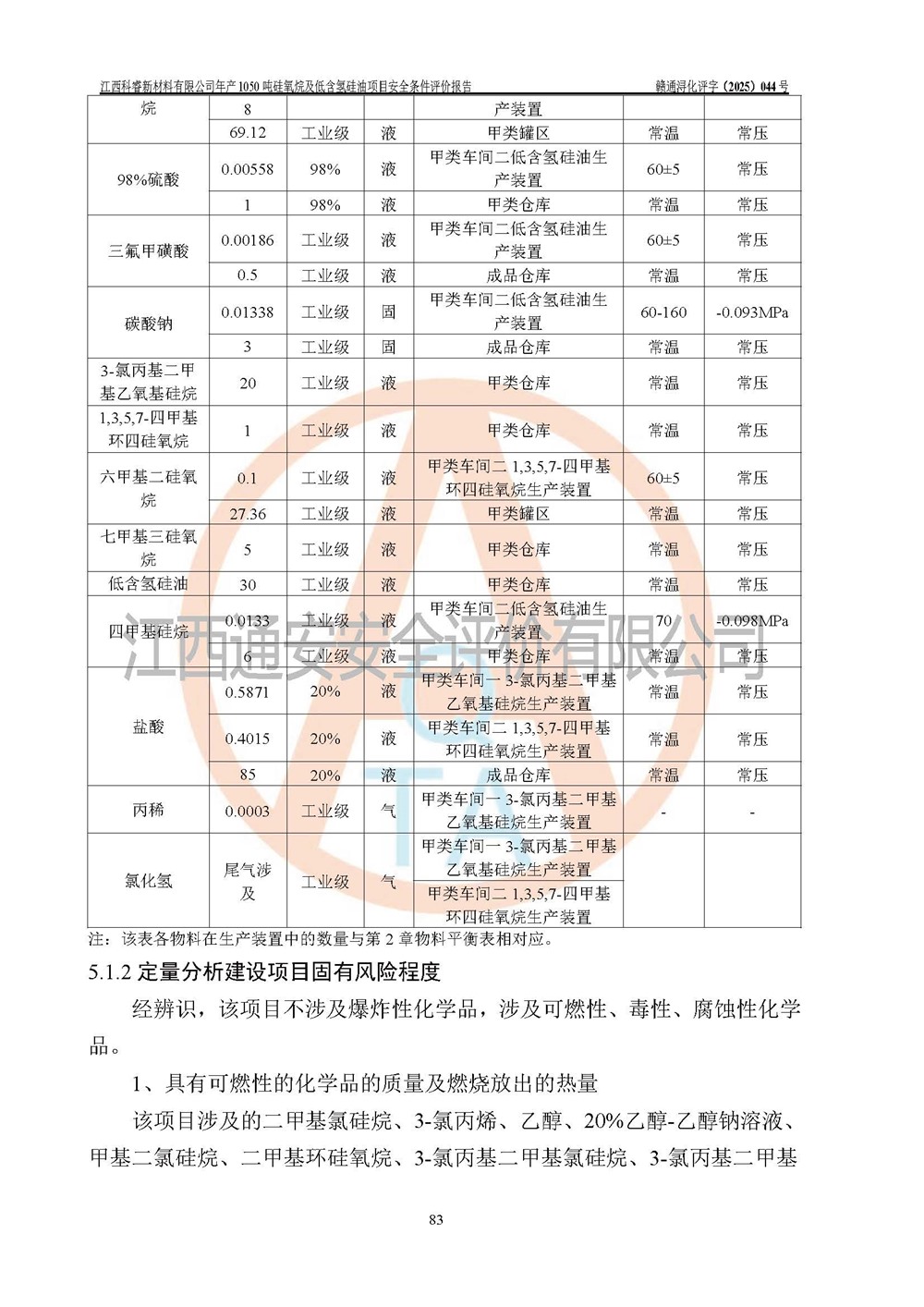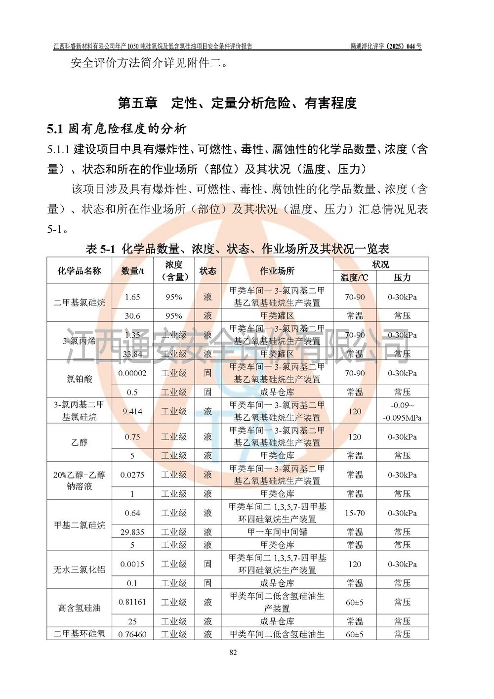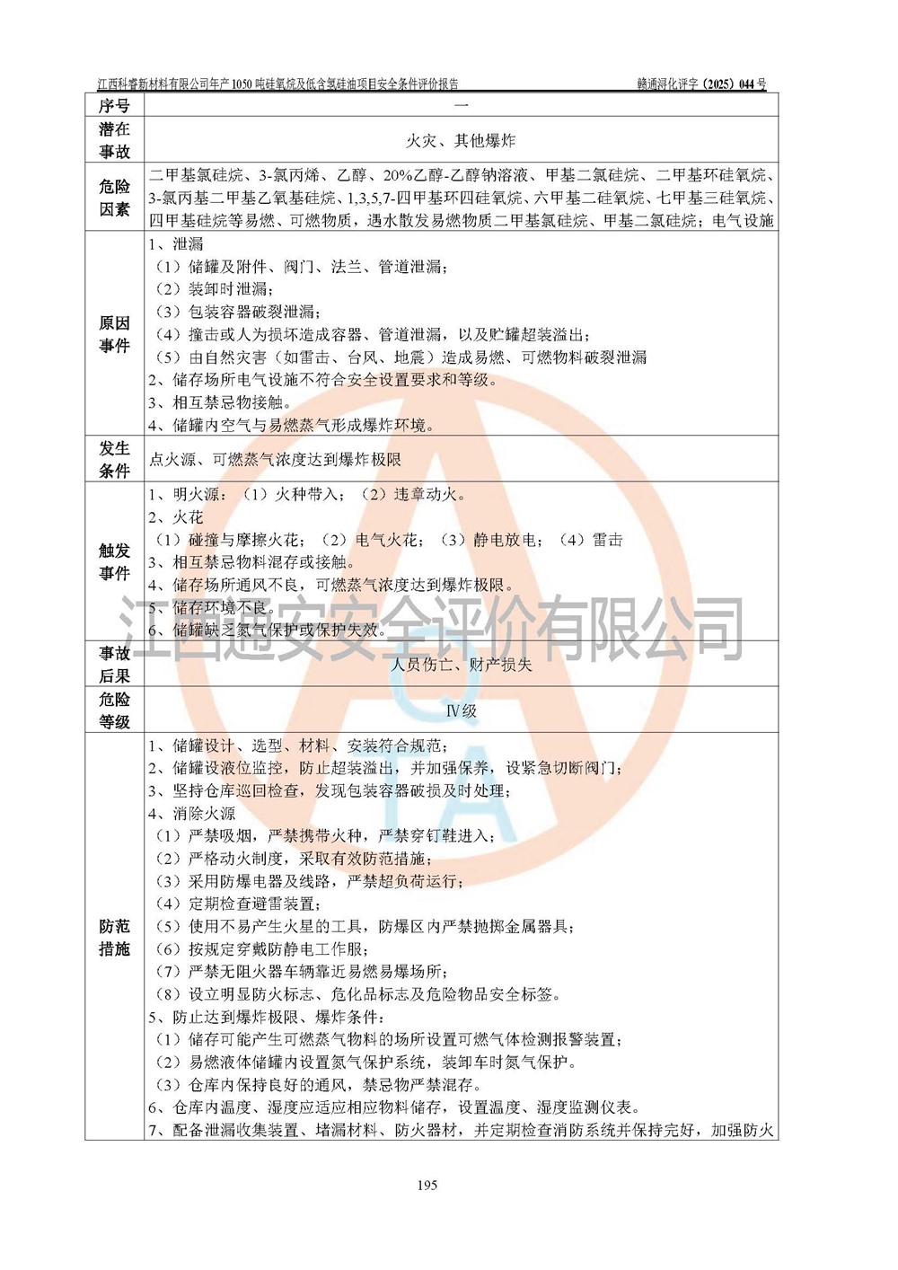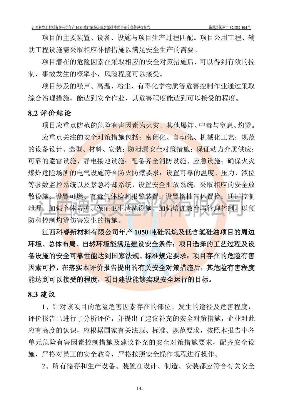 评价结论 | 江西科睿新材料有限公司年产1050吨硅氧烷及低含氢硅油项目的周边环境、总体布局、自然环境能满足建设安全条件;项目选择的工艺过程及设备设施的安全可靠性能达到**法规、标准规定要求;项目存在的危险有害因素可控,在落实本评价报告提出的有关安全对策措施后,其危险有害程度能达到可以接受的程度,项目建设能够实现安全运行的目标。 | |||||