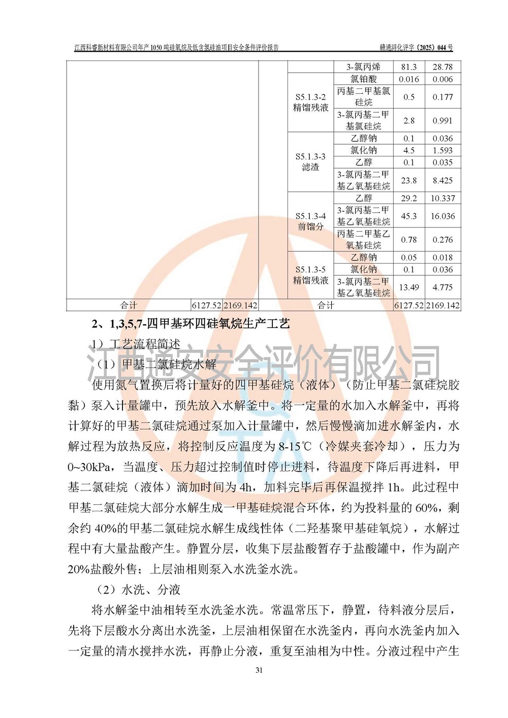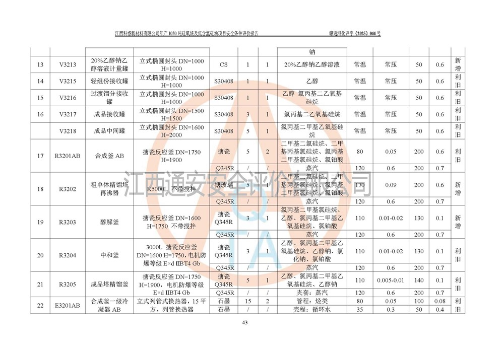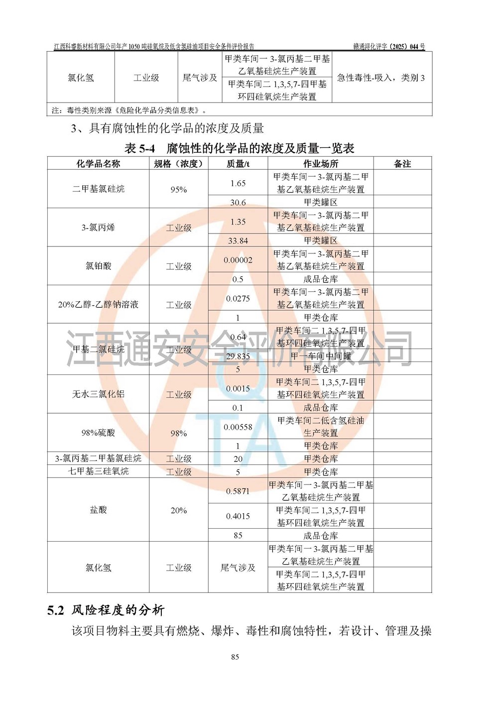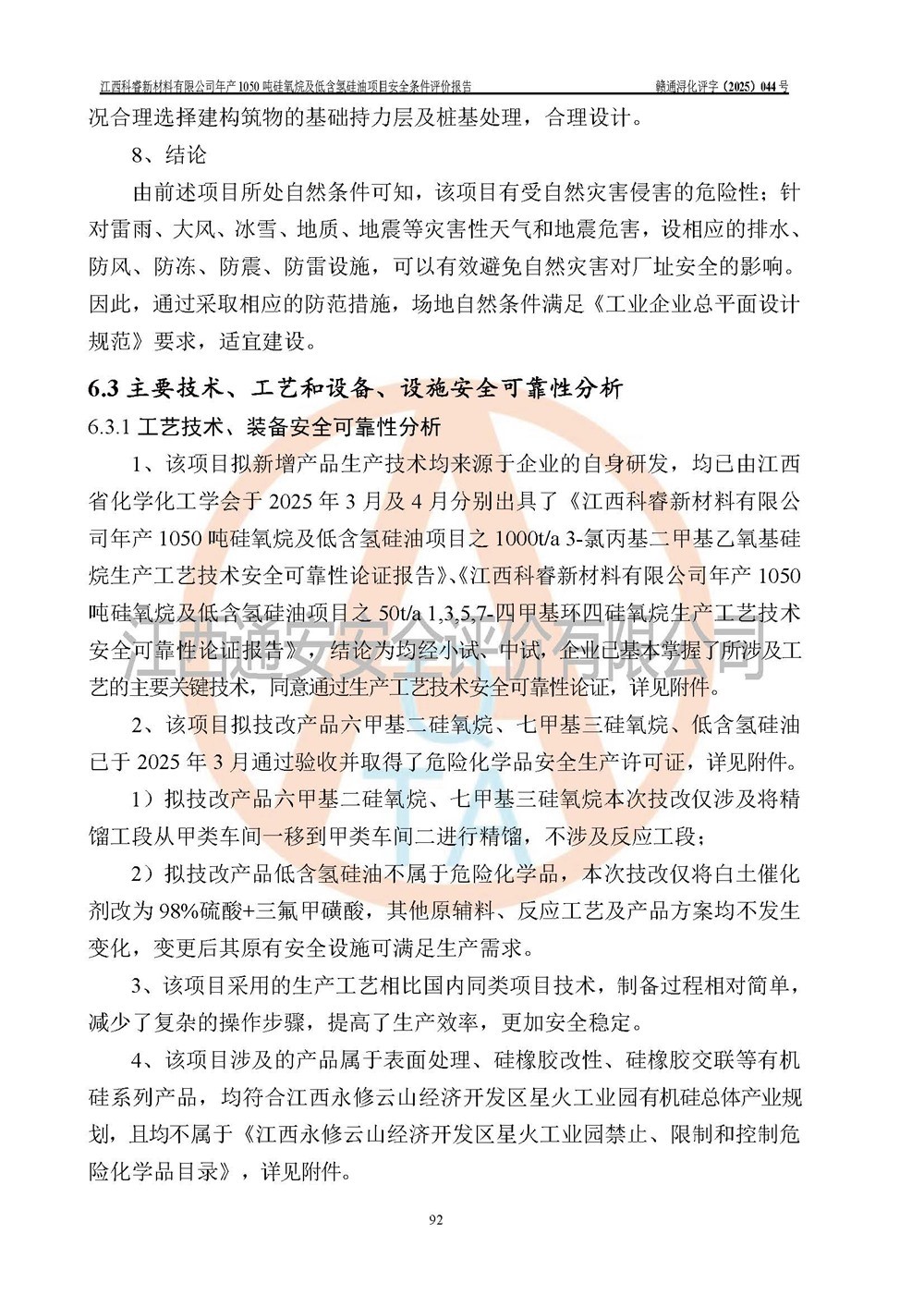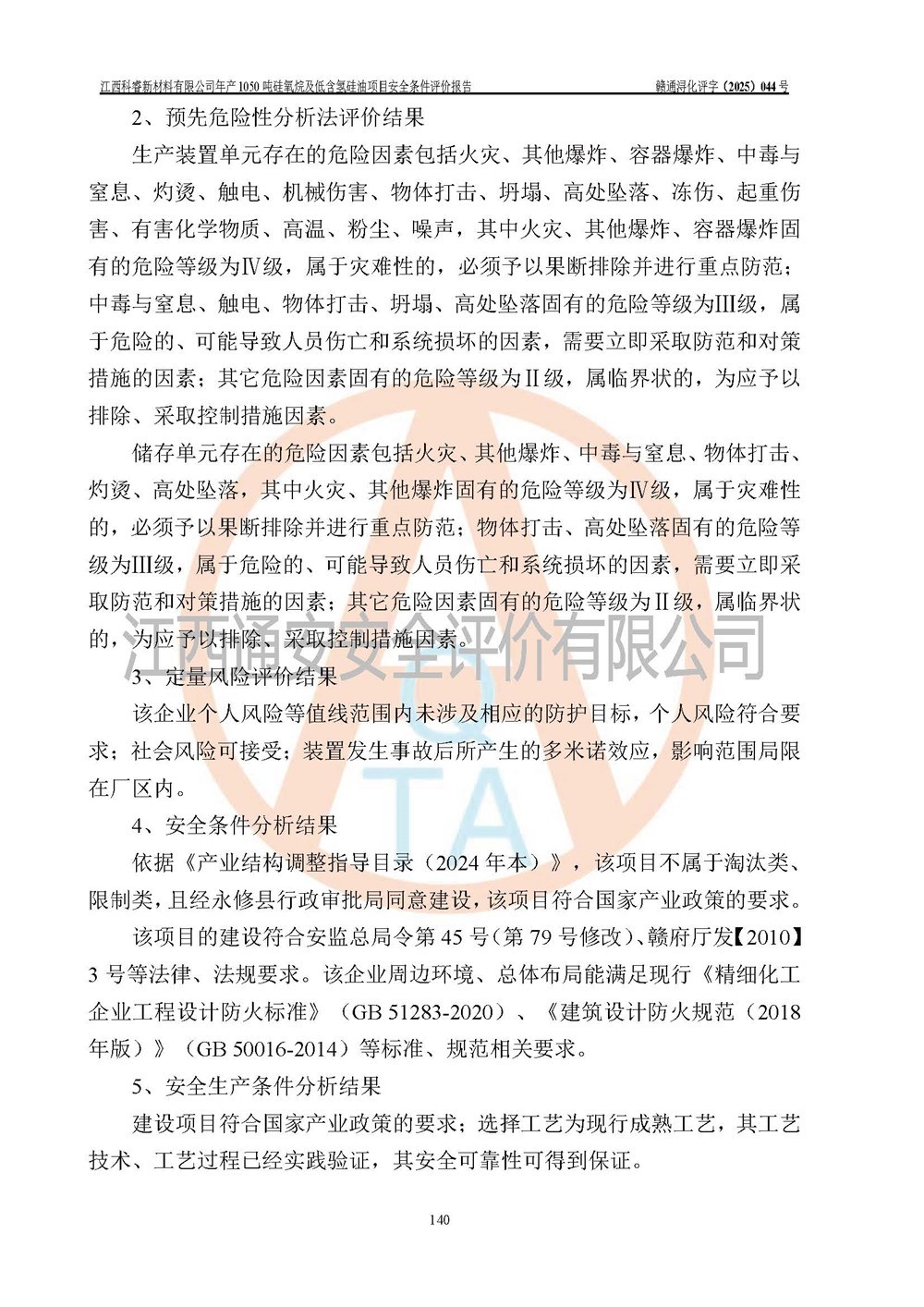 评价结论 | 江西科睿新材料有限公司年产1050吨硅氧烷及低含氢硅油项目的周边环境、总体布局、自然环境能满足建设安全条件;项目选择的工艺过程及设备设施的安全可靠性能达到**法规、标准规定要求;项目存在的危险有害因素可控,在落实本评价报告提出的有关安全对策措施后,其危险有害程度能达到可以接受的程度,项目建设能够实现安全运行的目标。 | |||||