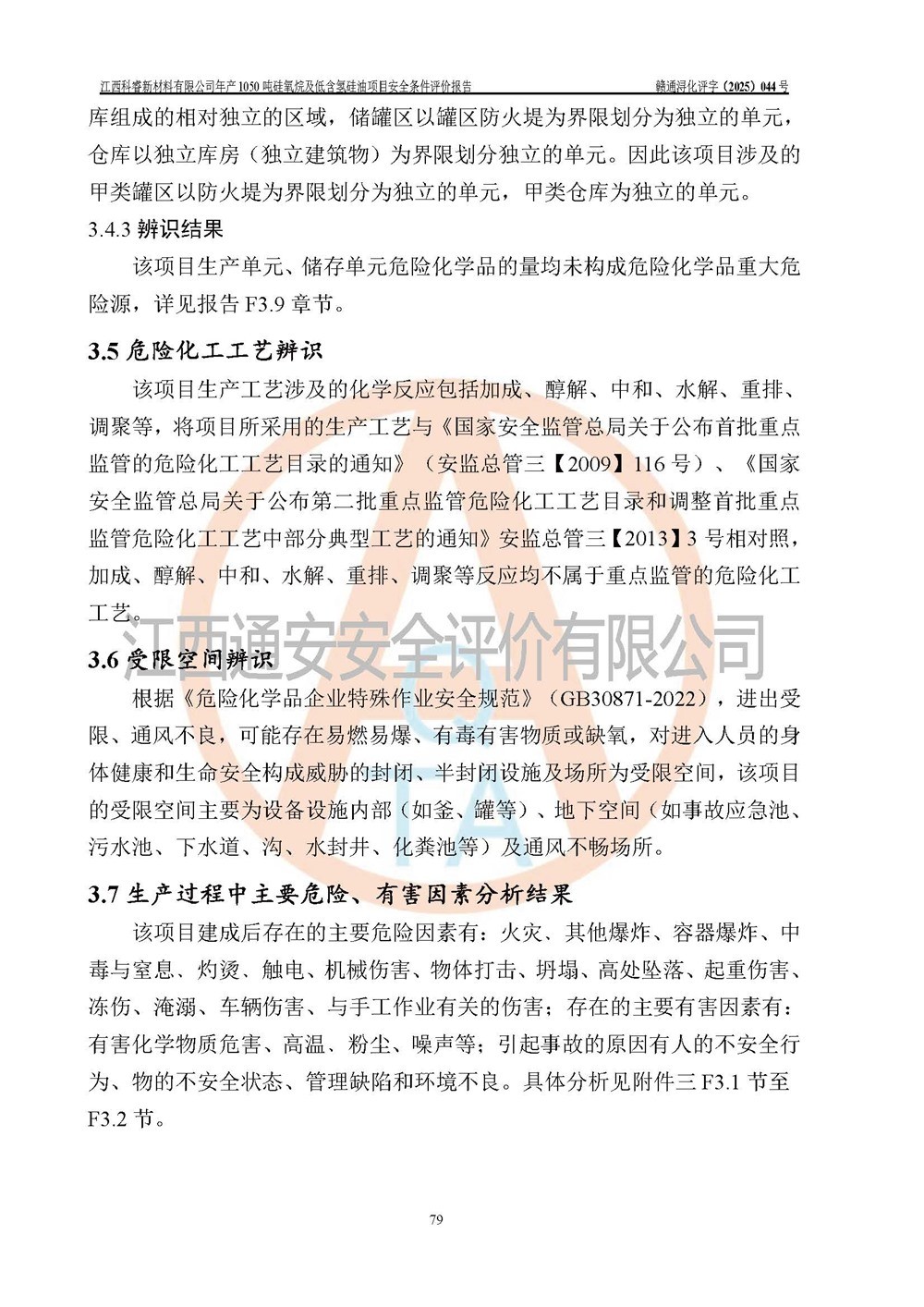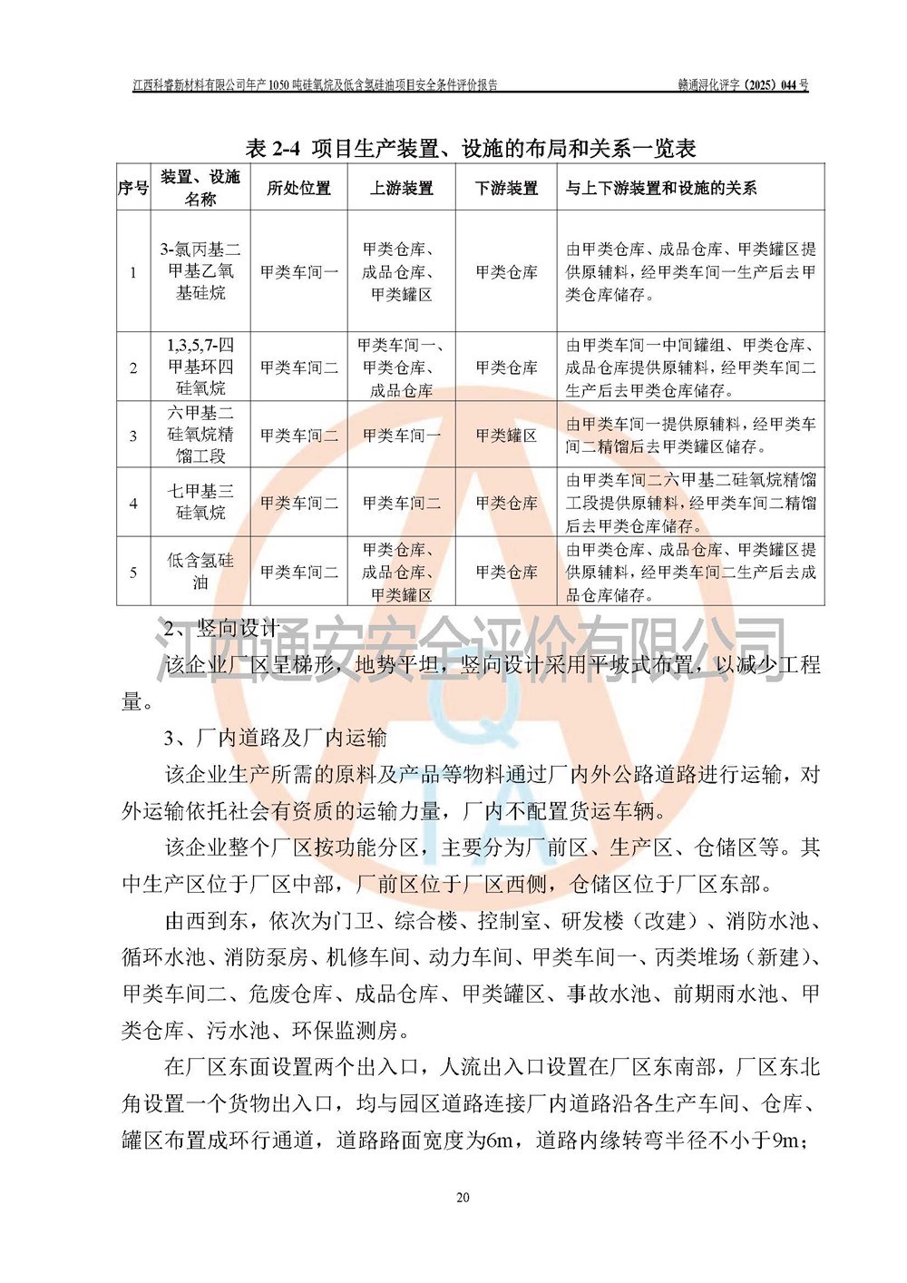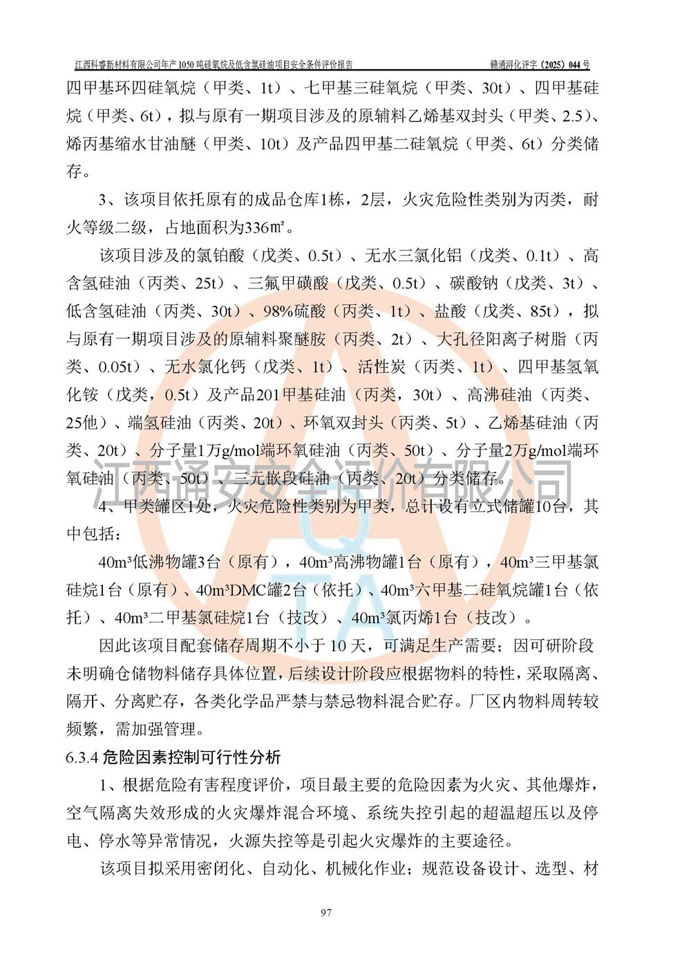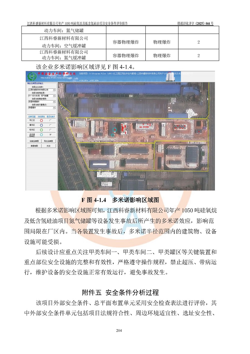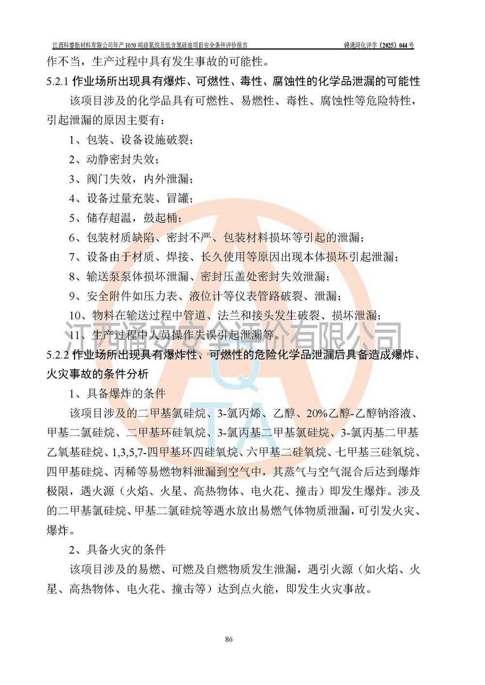 评价结论 | 江西科睿新材料有限公司年产1050吨硅氧烷及低含氢硅油项目的周边环境、总体布局、自然环境能满足建设安全条件;项目选择的工艺过程及设备设施的安全可靠性能达到**法规、标准规定要求;项目存在的危险有害因素可控,在落实本评价报告提出的有关安全对策措施后,其危险有害程度能达到可以接受的程度,项目建设能够实现安全运行的目标。 | |||||