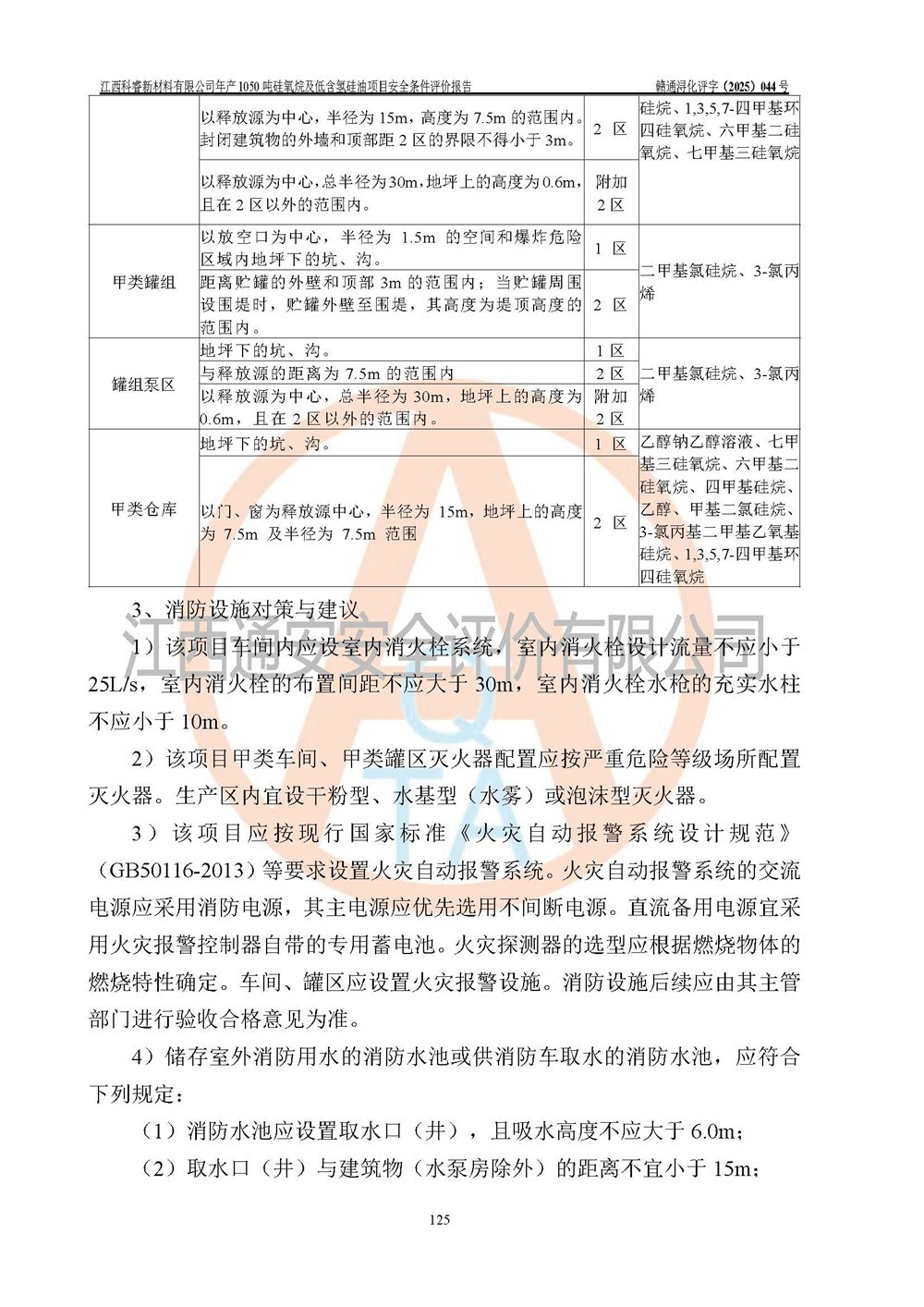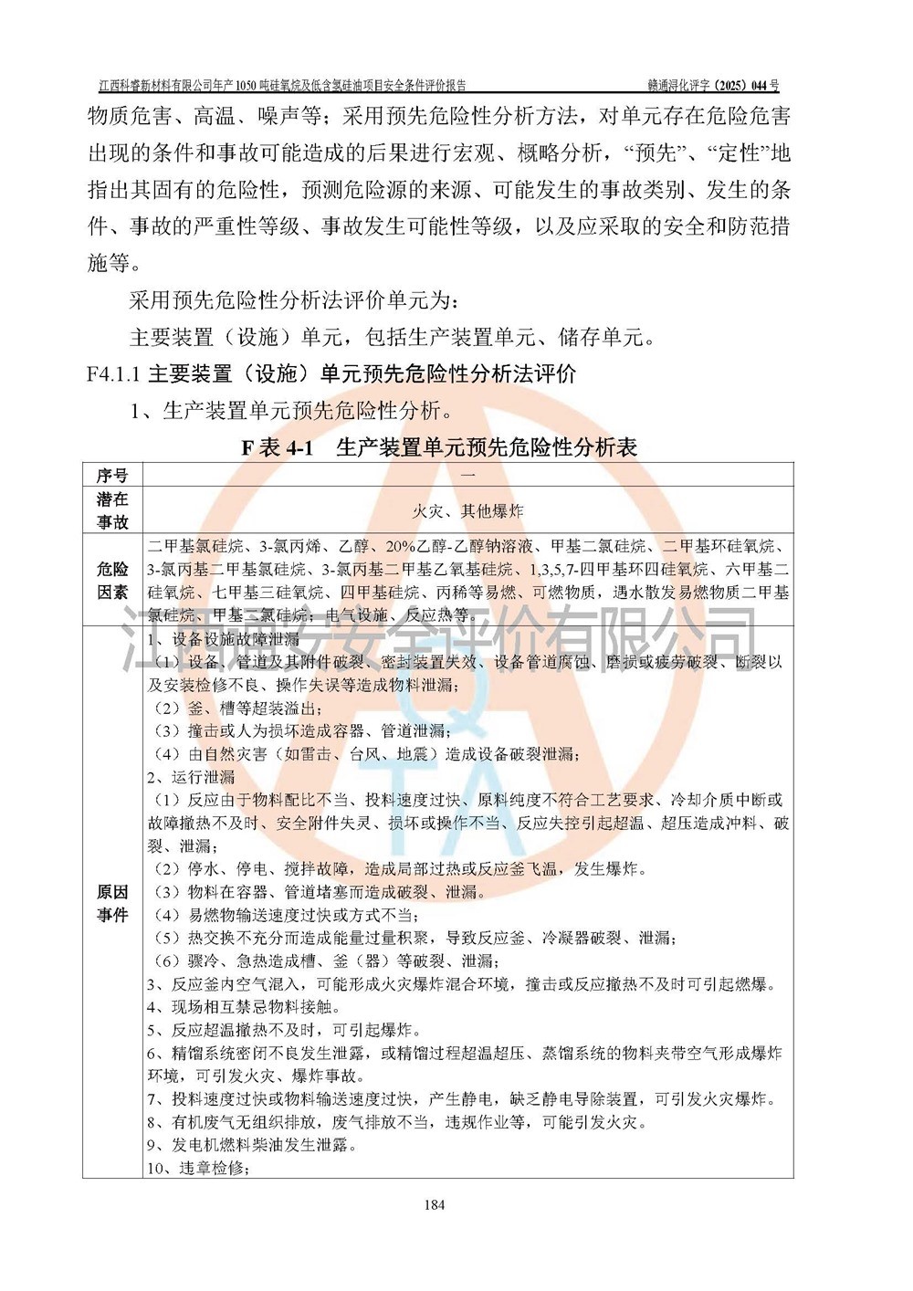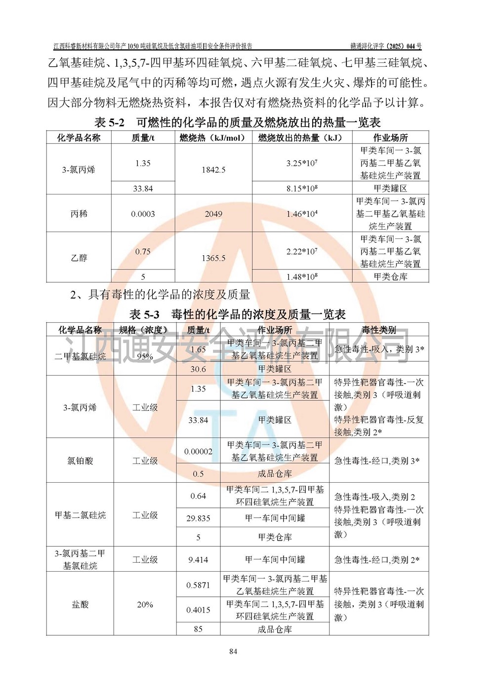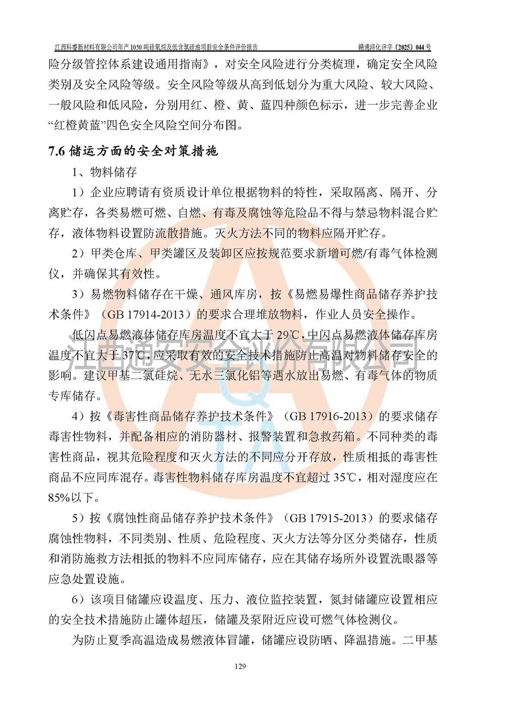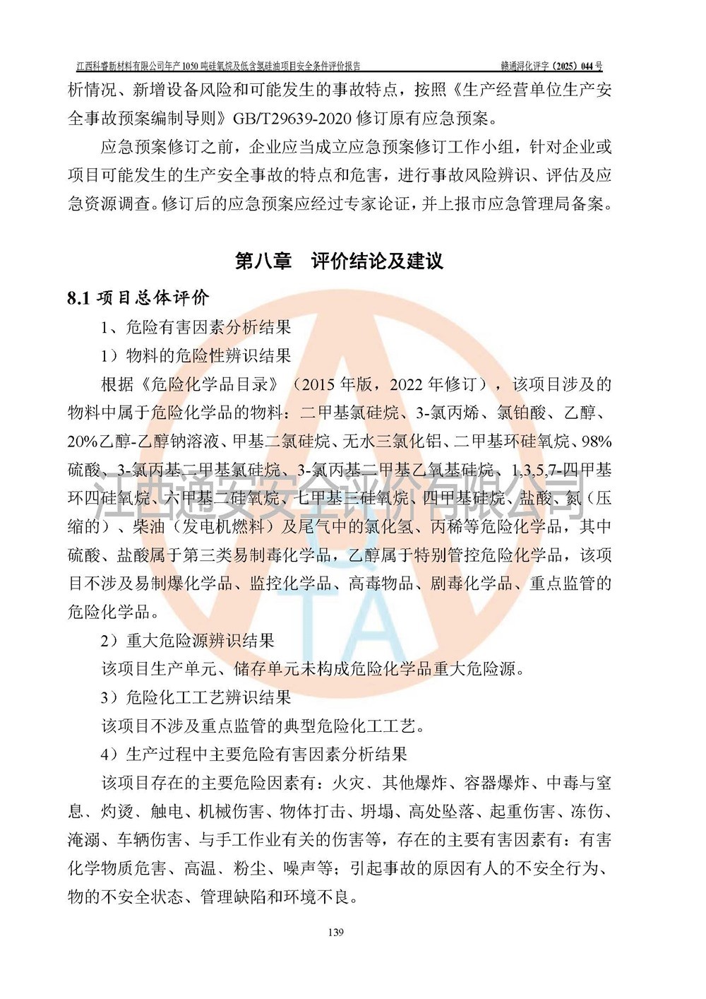 评价结论 | 江西科睿新材料有限公司年产1050吨硅氧烷及低含氢硅油项目的周边环境、总体布局、自然环境能满足建设安全条件;项目选择的工艺过程及设备设施的安全可靠性能达到**法规、标准规定要求;项目存在的危险有害因素可控,在落实本评价报告提出的有关安全对策措施后,其危险有害程度能达到可以接受的程度,项目建设能够实现安全运行的目标。 | |||||