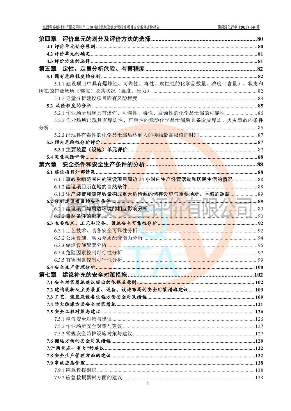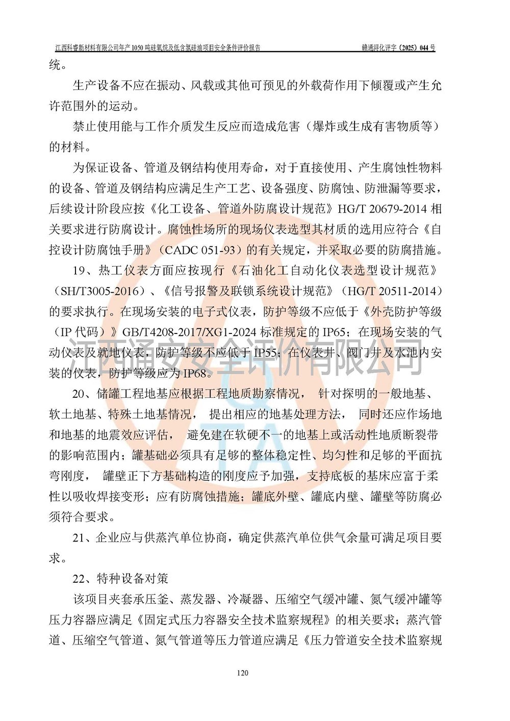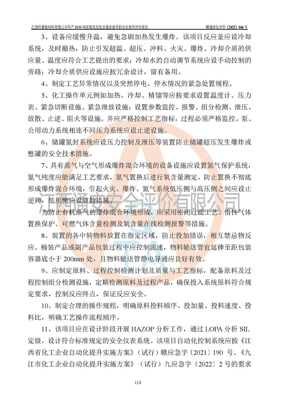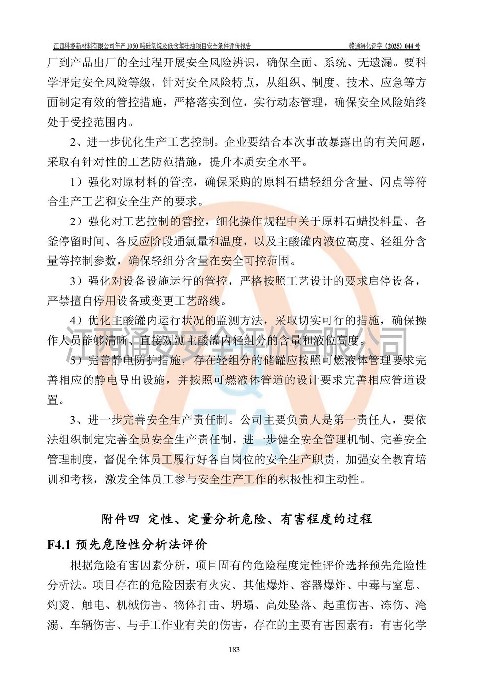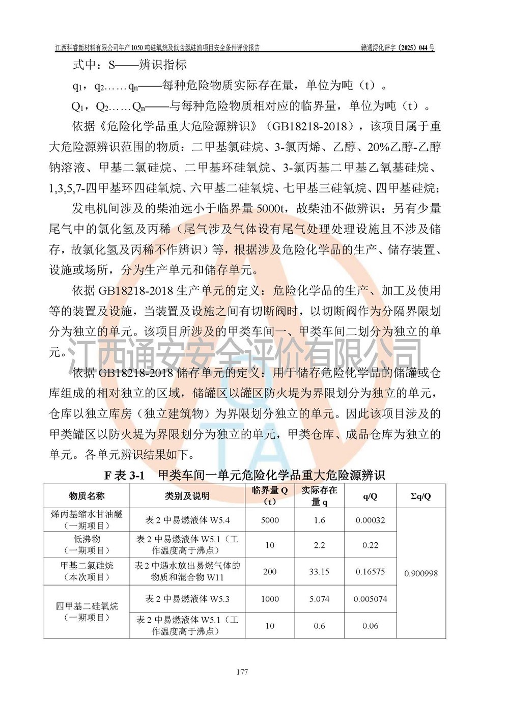 评价结论 | 江西科睿新材料有限公司年产1050吨硅氧烷及低含氢硅油项目的周边环境、总体布局、自然环境能满足建设安全条件;项目选择的工艺过程及设备设施的安全可靠性能达到**法规、标准规定要求;项目存在的危险有害因素可控,在落实本评价报告提出的有关安全对策措施后,其危险有害程度能达到可以接受的程度,项目建设能够实现安全运行的目标。 | |||||