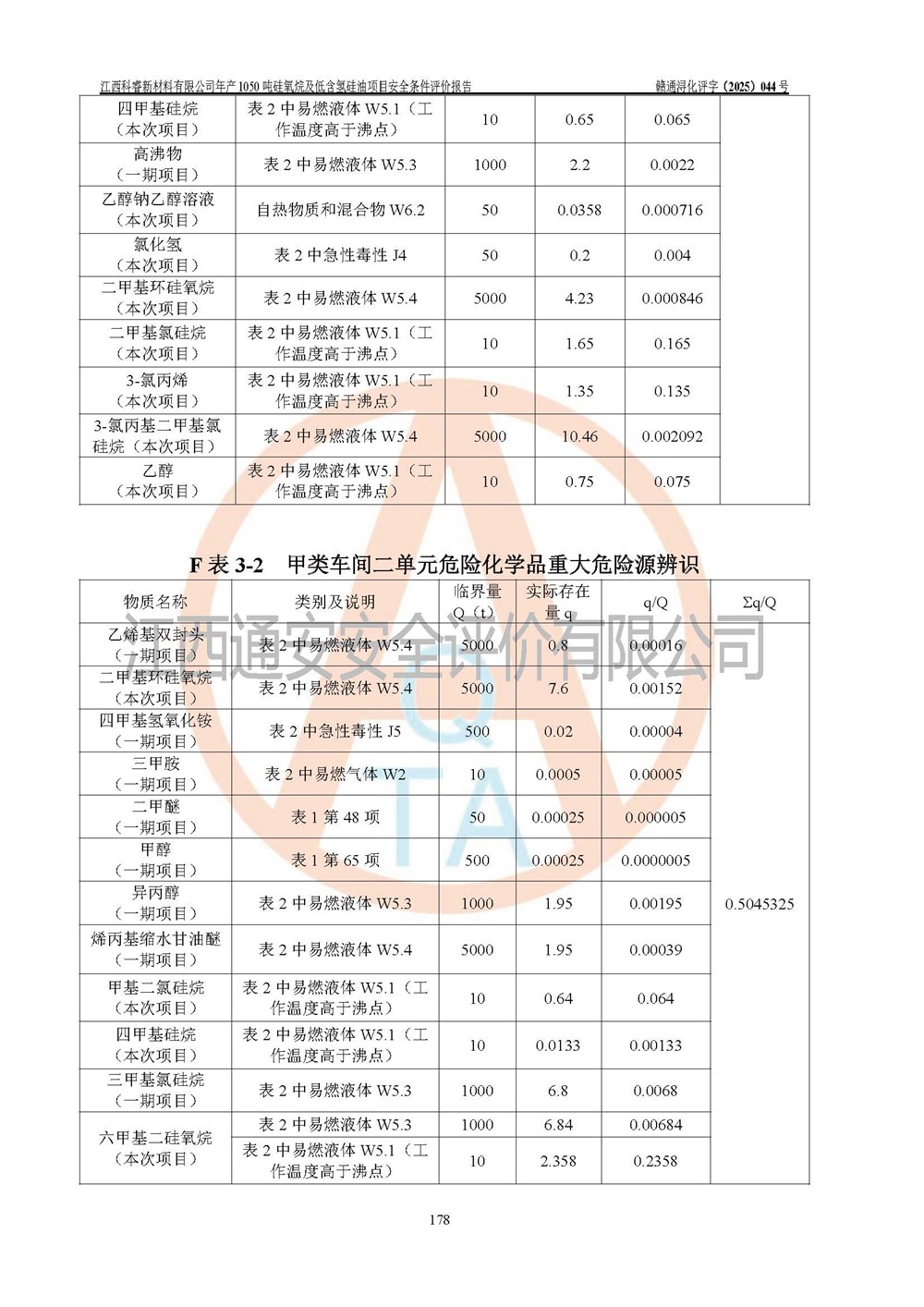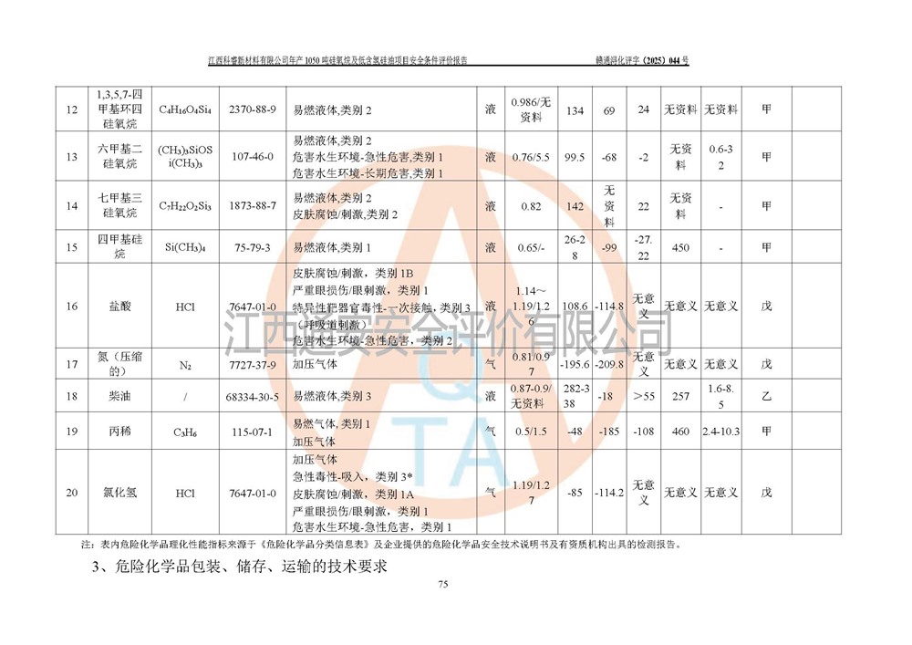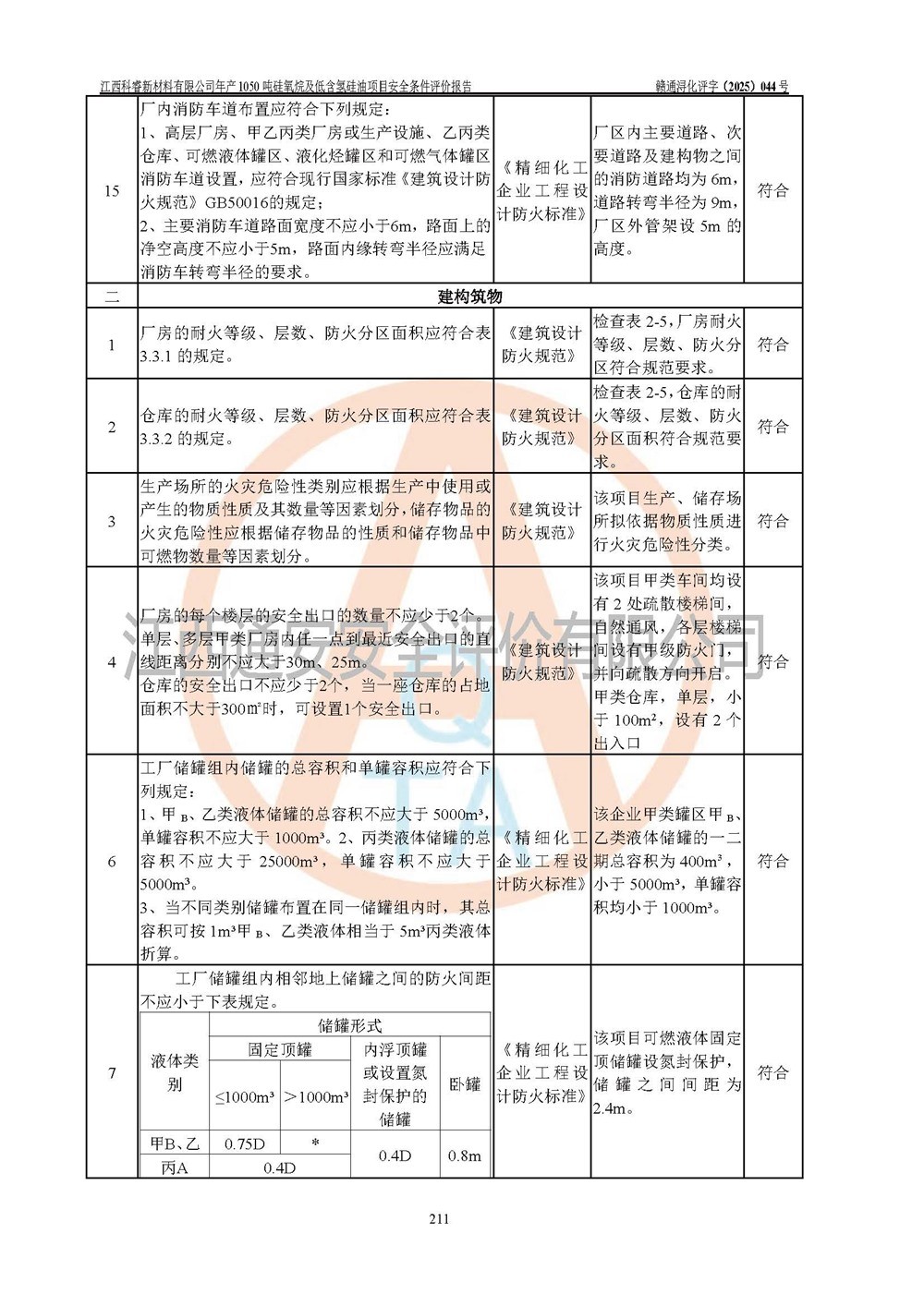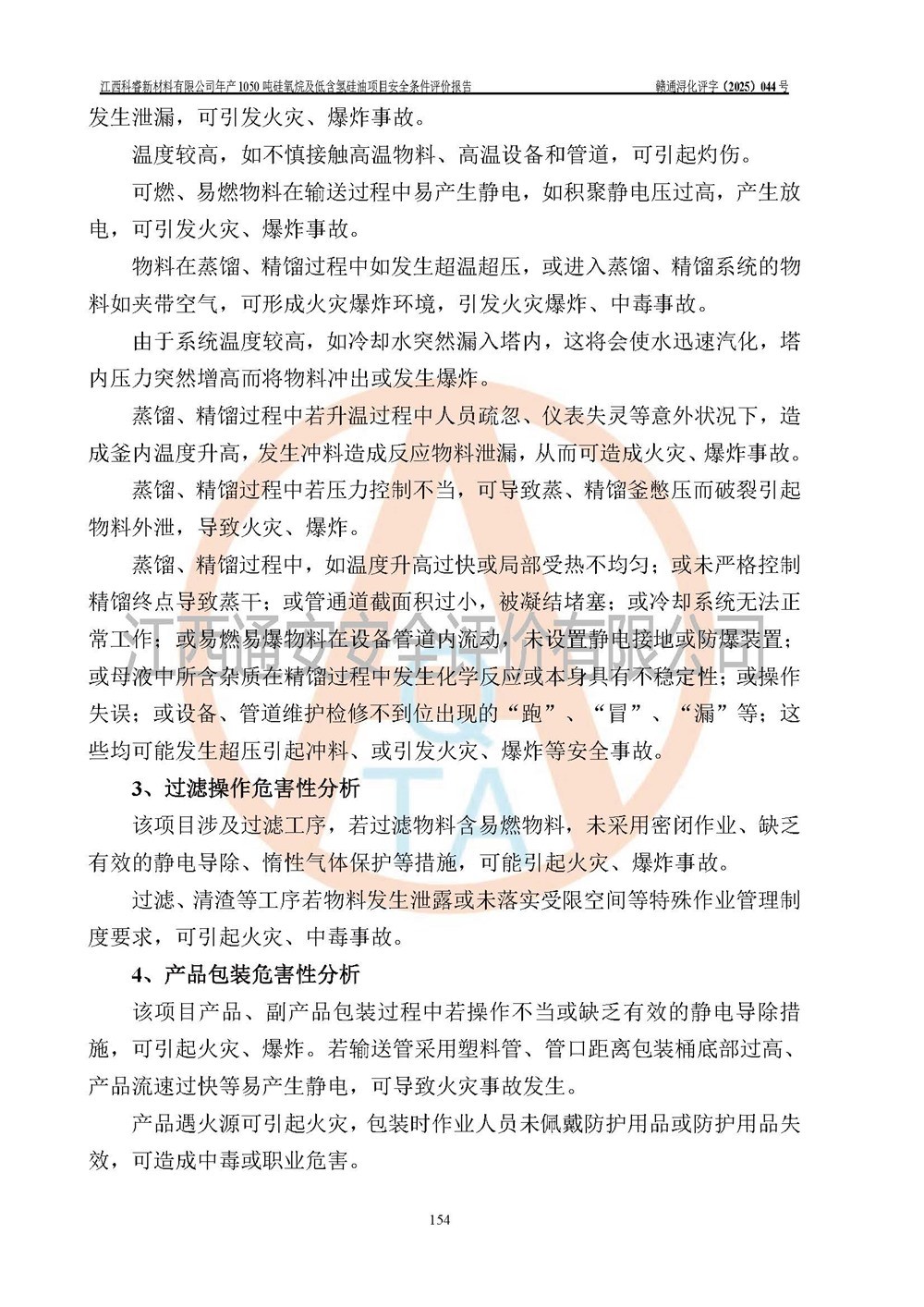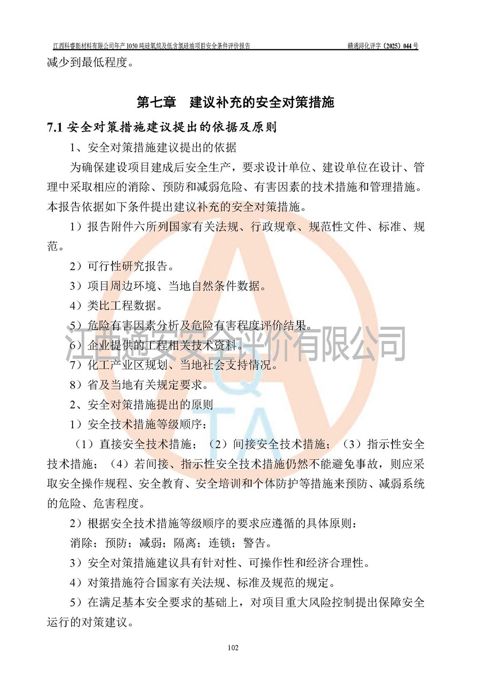 评价结论 | 江西科睿新材料有限公司年产1050吨硅氧烷及低含氢硅油项目的周边环境、总体布局、自然环境能满足建设安全条件;项目选择的工艺过程及设备设施的安全可靠性能达到**法规、标准规定要求;项目存在的危险有害因素可控,在落实本评价报告提出的有关安全对策措施后,其危险有害程度能达到可以接受的程度,项目建设能够实现安全运行的目标。 | |||||