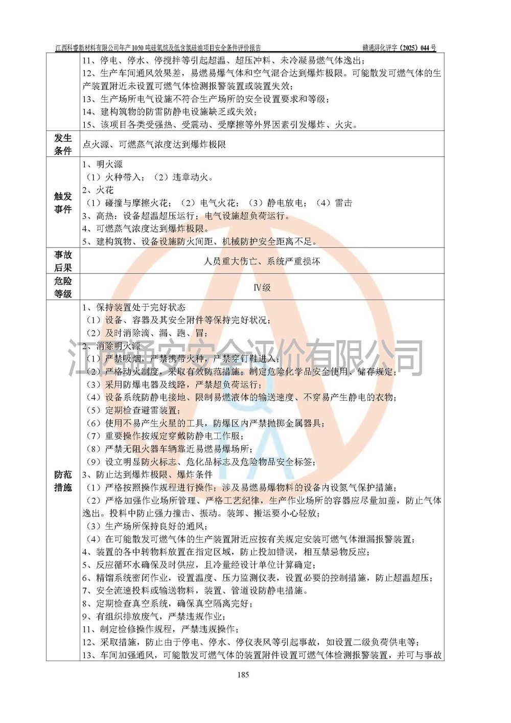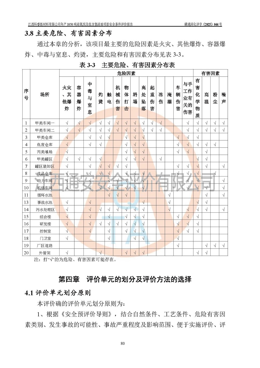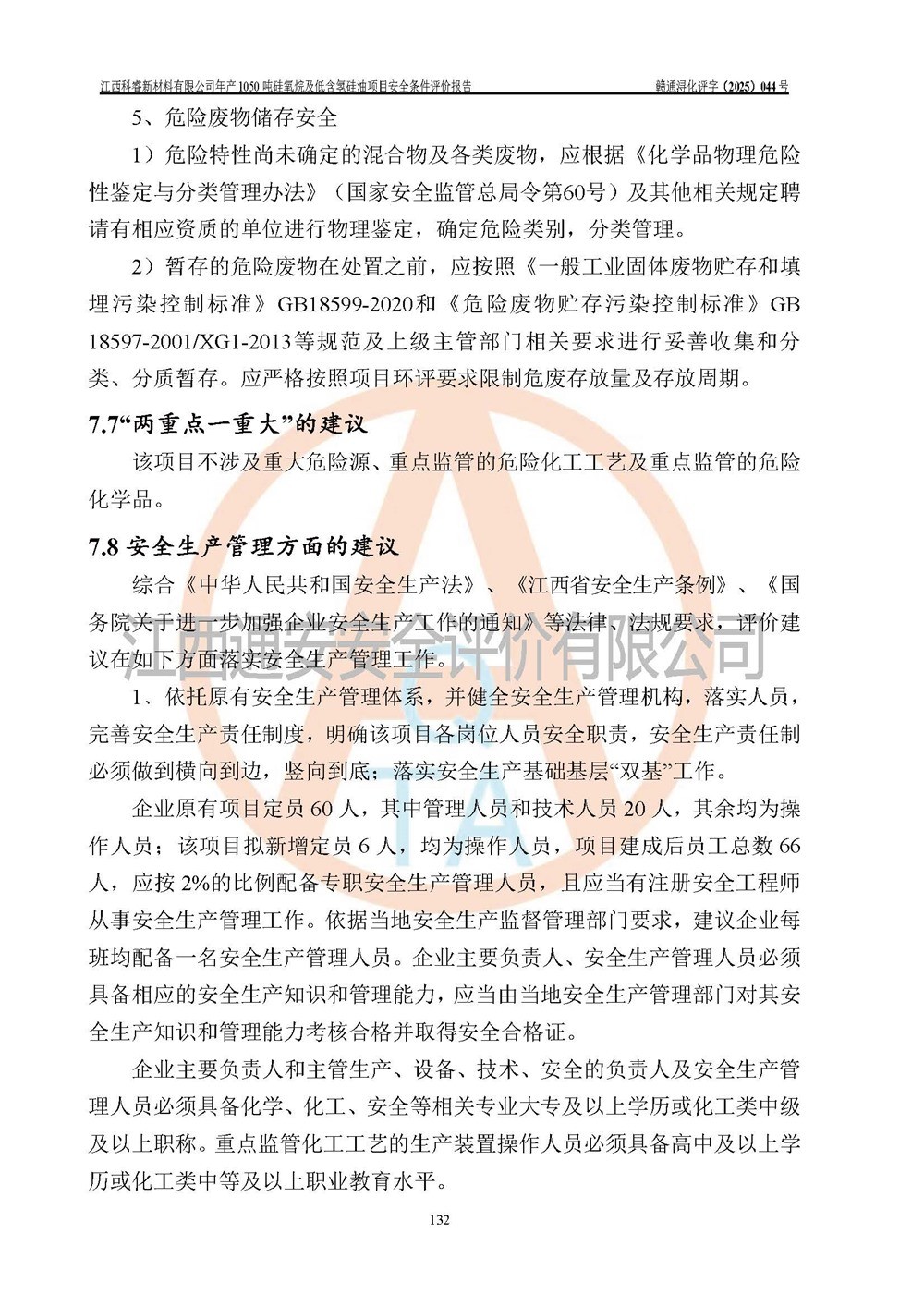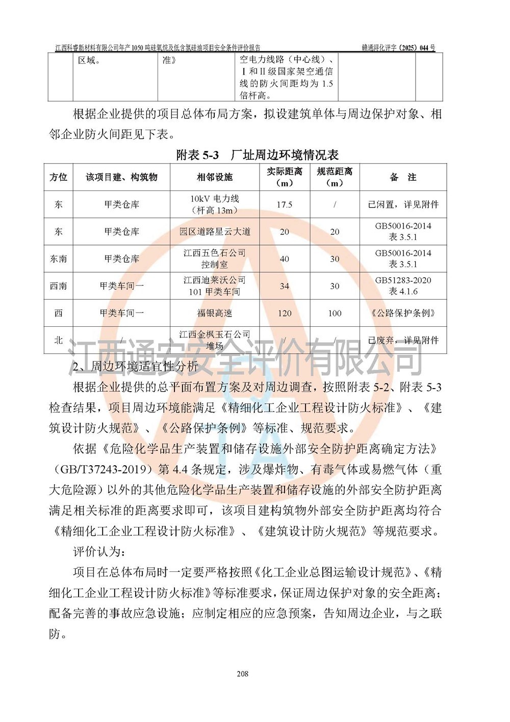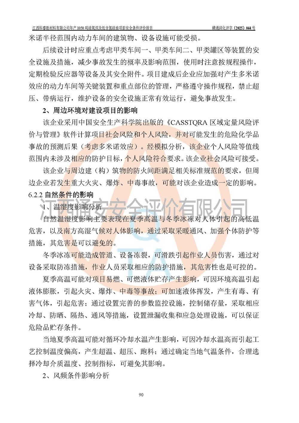评价结论 | 江西科睿新材料有限公司年产1050吨硅氧烷及低含氢硅油项目的周边环境、总体布局、自然环境能满足建设安全条件;项目选择的工艺过程及设备设施的安全可靠性能达到**法规、标准规定要求;项目存在的危险有害因素可控,在落实本评价报告提出的有关安全对策措施后,其危险有害程度能达到可以接受的程度,项目建设能够实现安全运行的目标。 | |||||