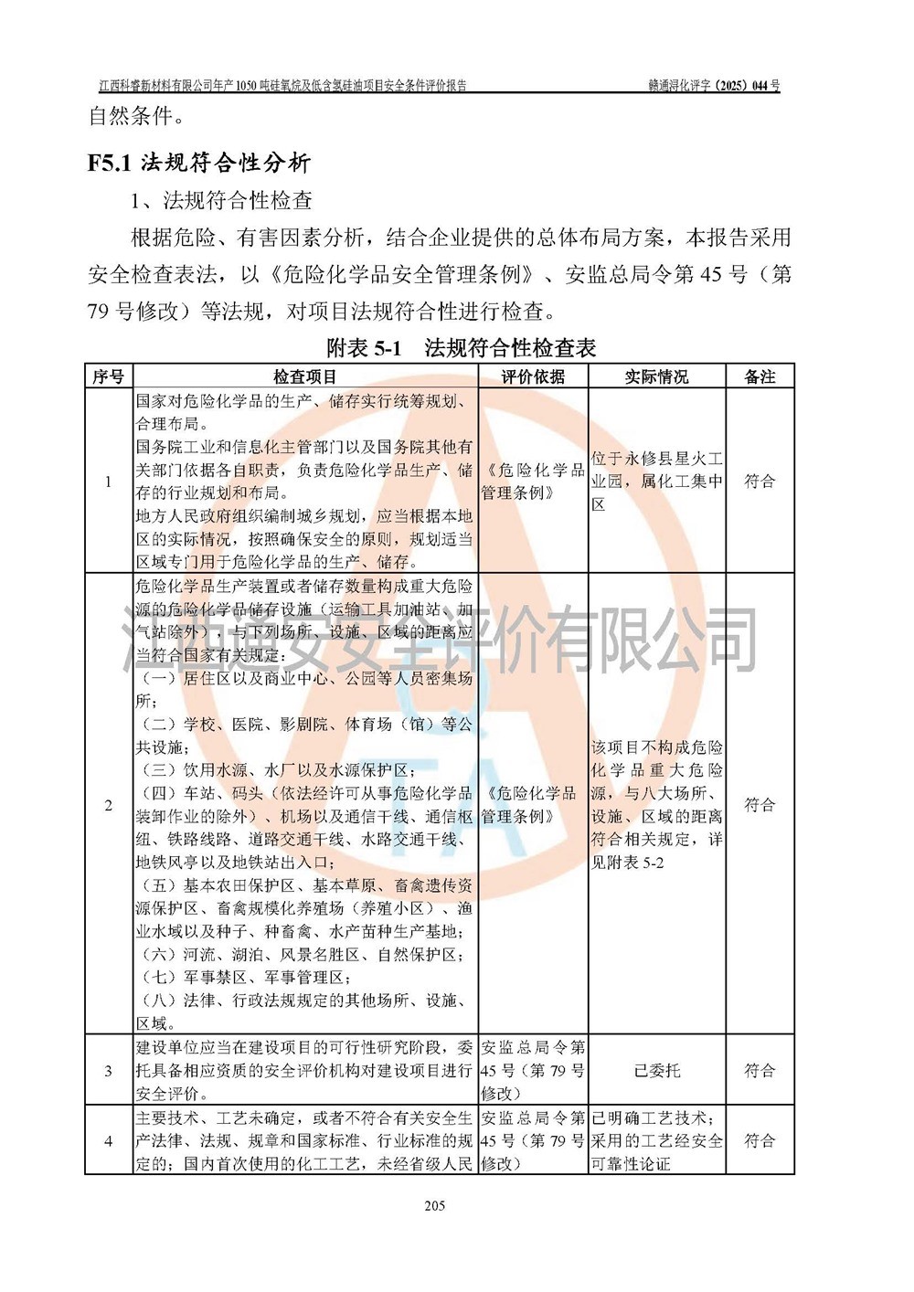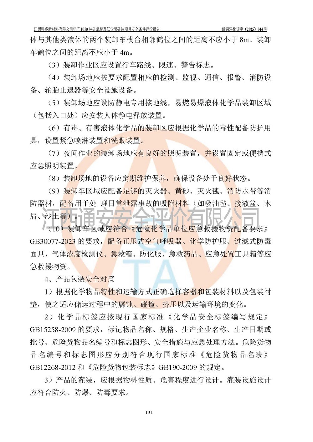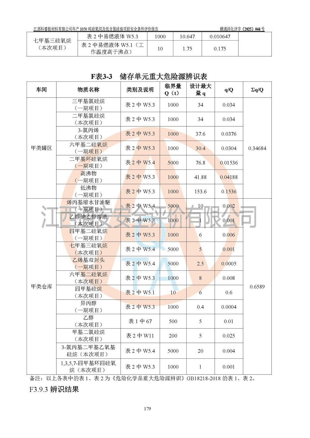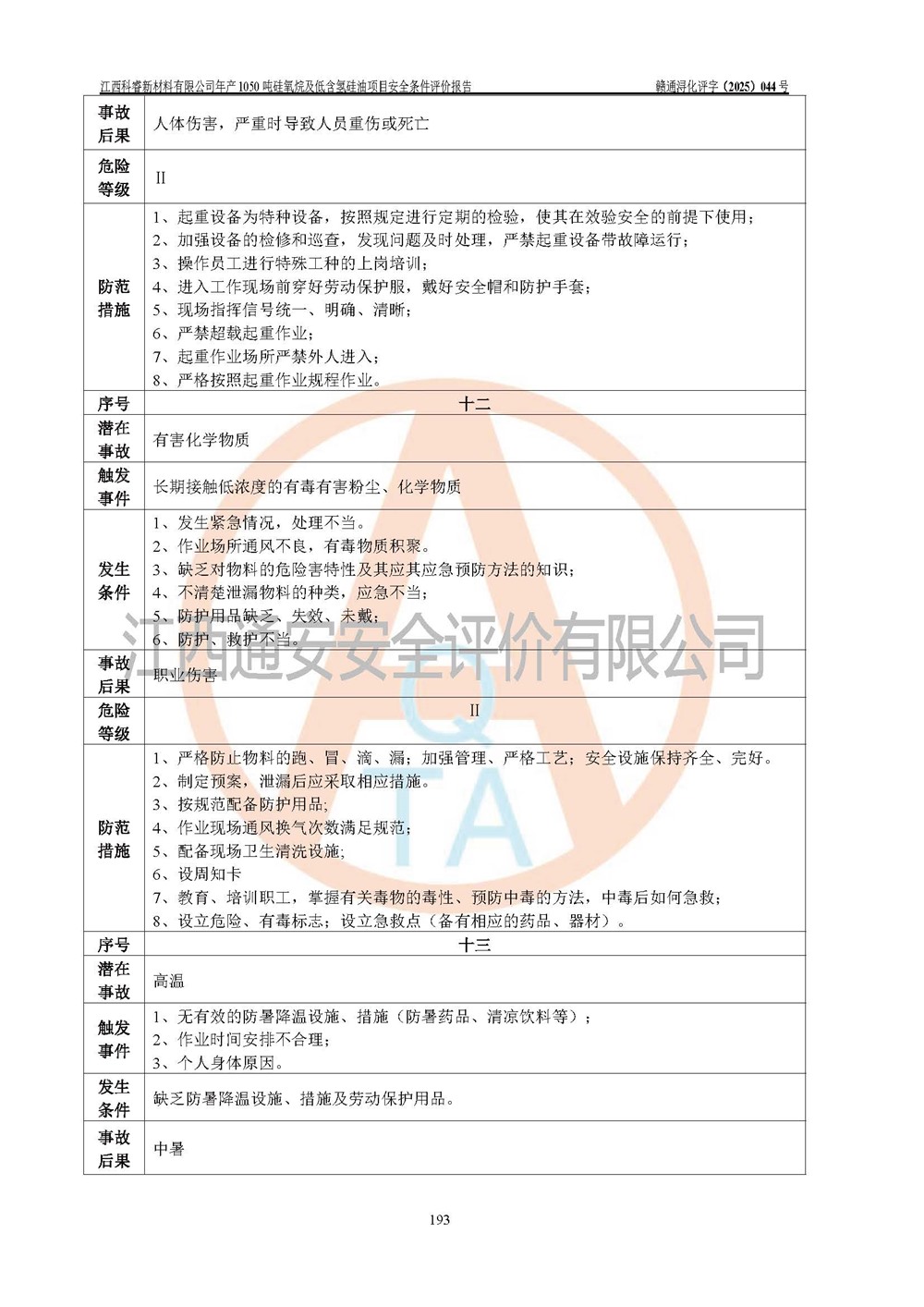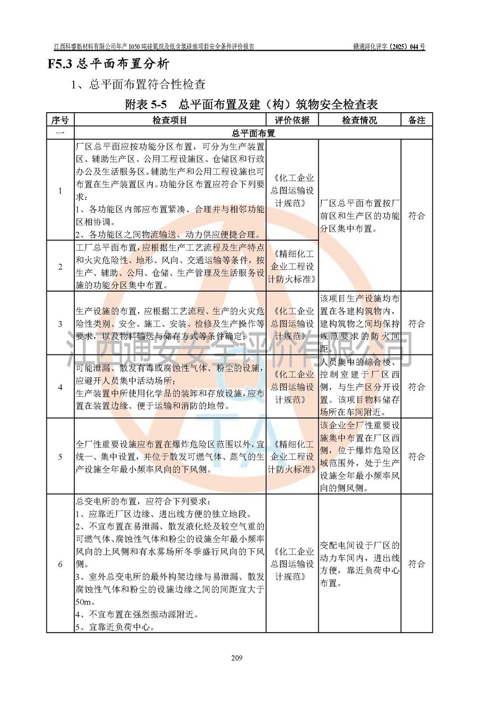 评价结论 | 江西科睿新材料有限公司年产1050吨硅氧烷及低含氢硅油项目的周边环境、总体布局、自然环境能满足建设安全条件;项目选择的工艺过程及设备设施的安全可靠性能达到**法规、标准规定要求;项目存在的危险有害因素可控,在落实本评价报告提出的有关安全对策措施后,其危险有害程度能达到可以接受的程度,项目建设能够实现安全运行的目标。 | |||||