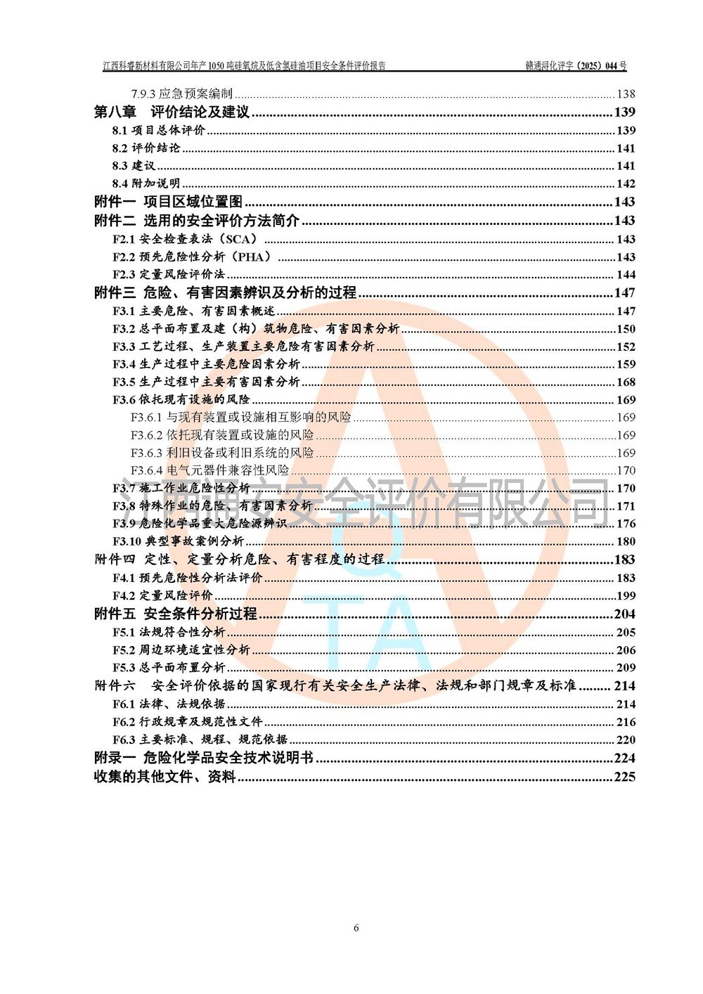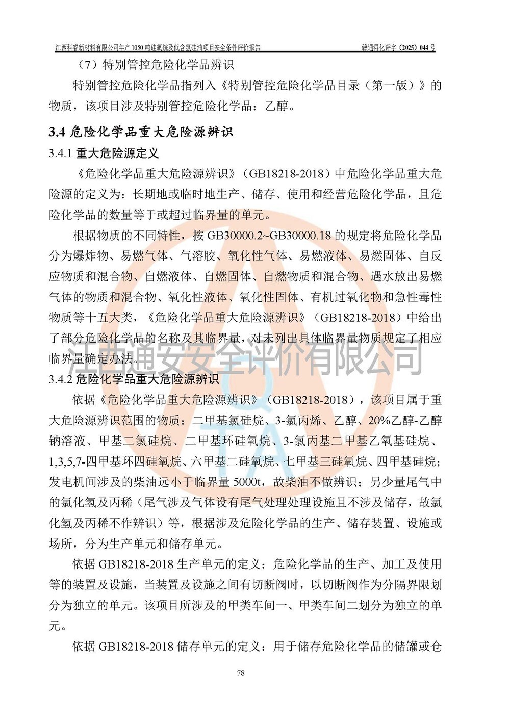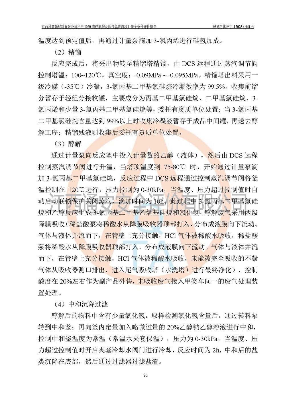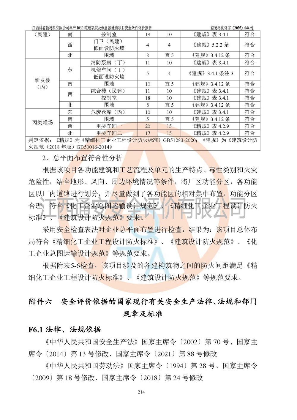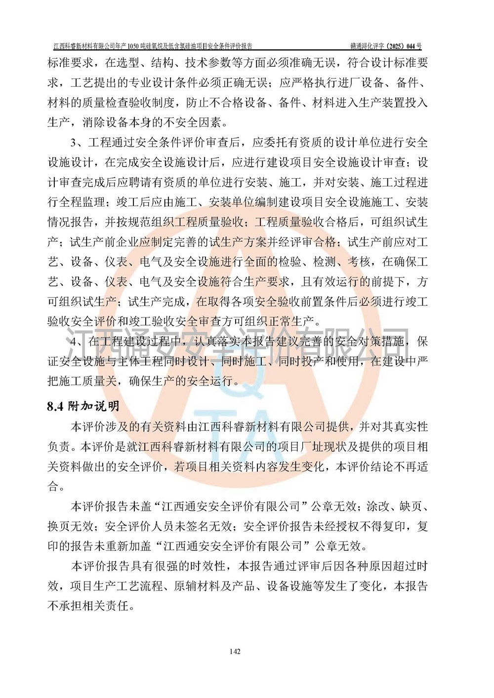 评价结论 | 江西科睿新材料有限公司年产1050吨硅氧烷及低含氢硅油项目的周边环境、总体布局、自然环境能满足建设安全条件;项目选择的工艺过程及设备设施的安全可靠性能达到**法规、标准规定要求;项目存在的危险有害因素可控,在落实本评价报告提出的有关安全对策措施后,其危险有害程度能达到可以接受的程度,项目建设能够实现安全运行的目标。 | |||||