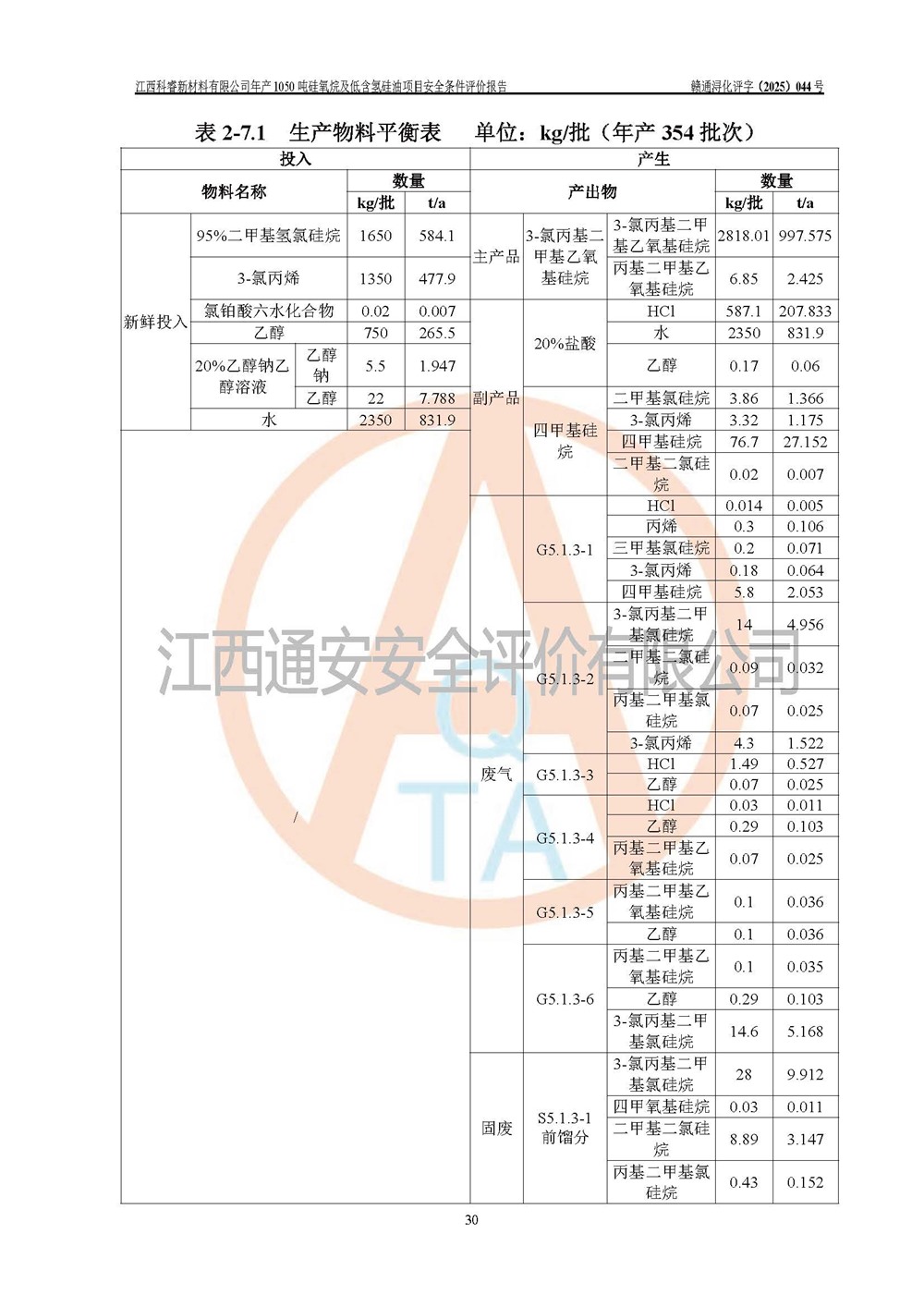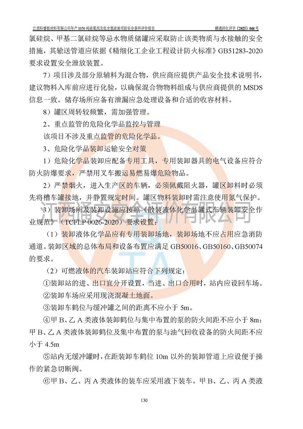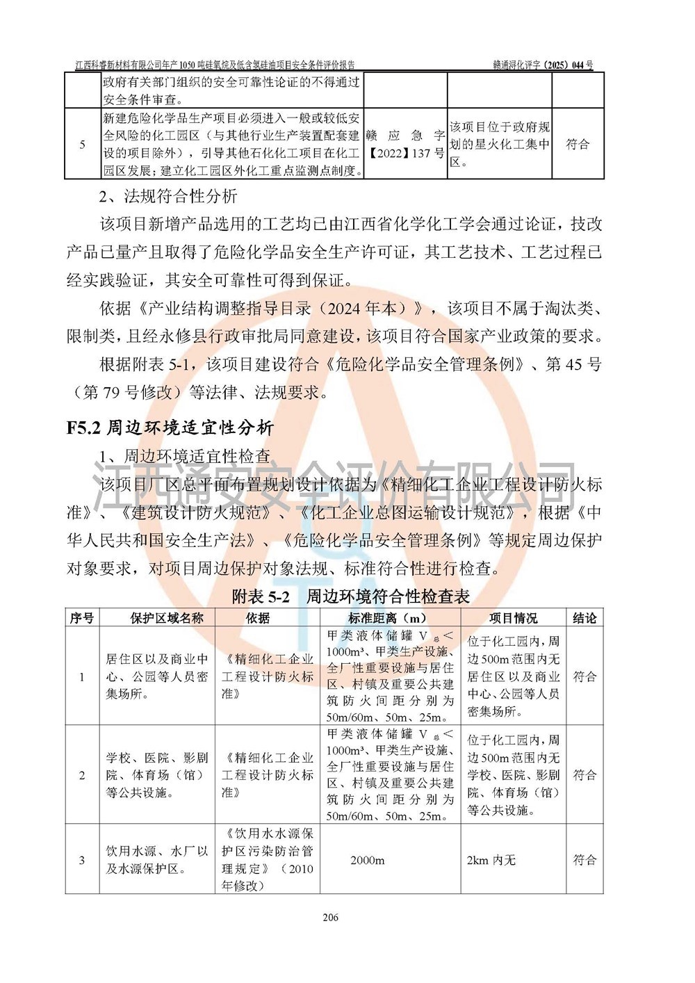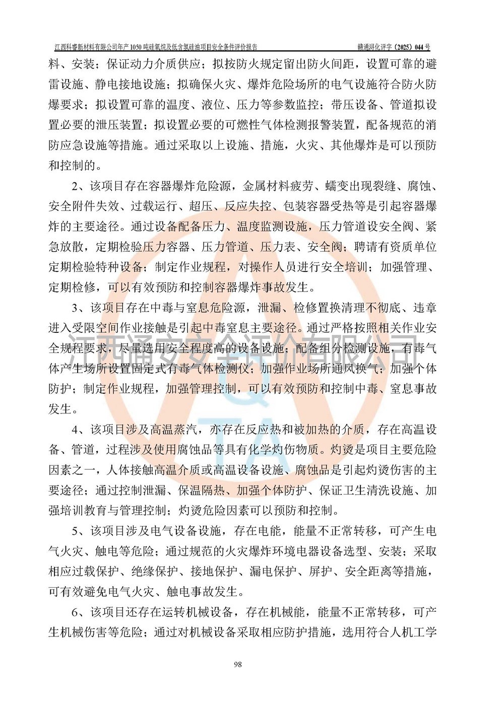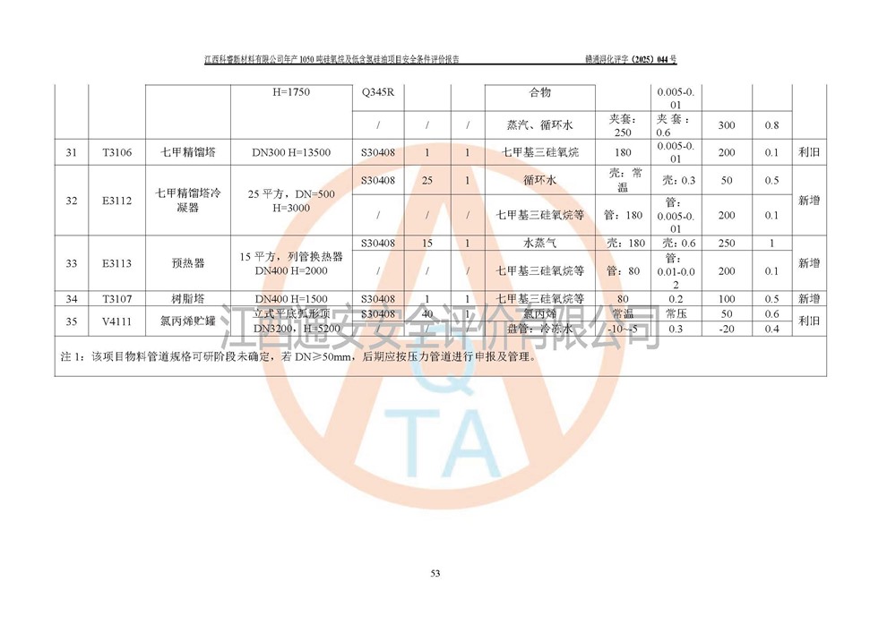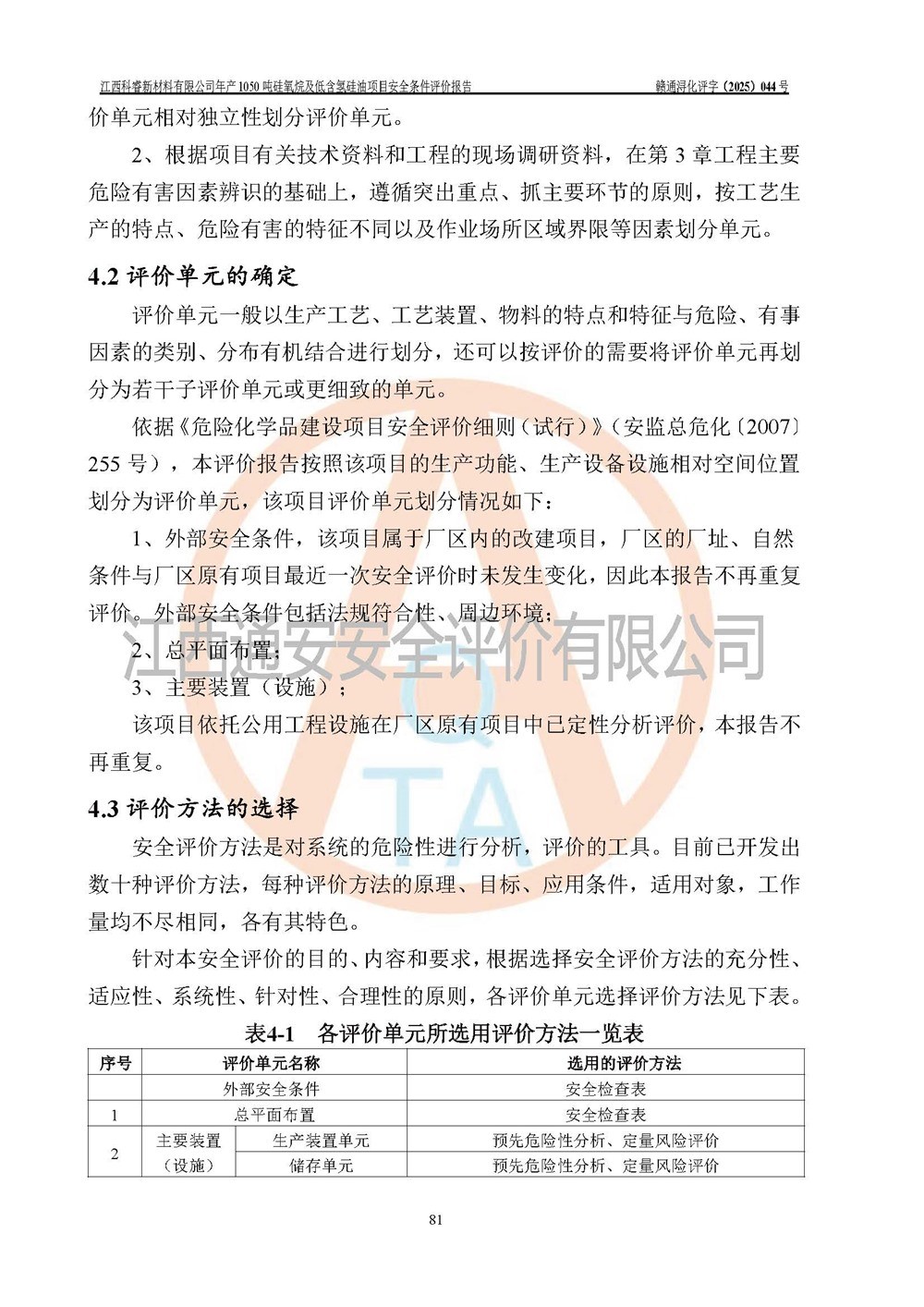 评价结论 | 江西科睿新材料有限公司年产1050吨硅氧烷及低含氢硅油项目的周边环境、总体布局、自然环境能满足建设安全条件;项目选择的工艺过程及设备设施的安全可靠性能达到**法规、标准规定要求;项目存在的危险有害因素可控,在落实本评价报告提出的有关安全对策措施后,其危险有害程度能达到可以接受的程度,项目建设能够实现安全运行的目标。 | |||||