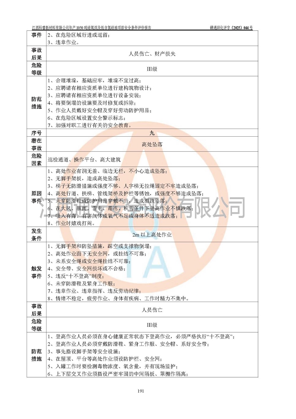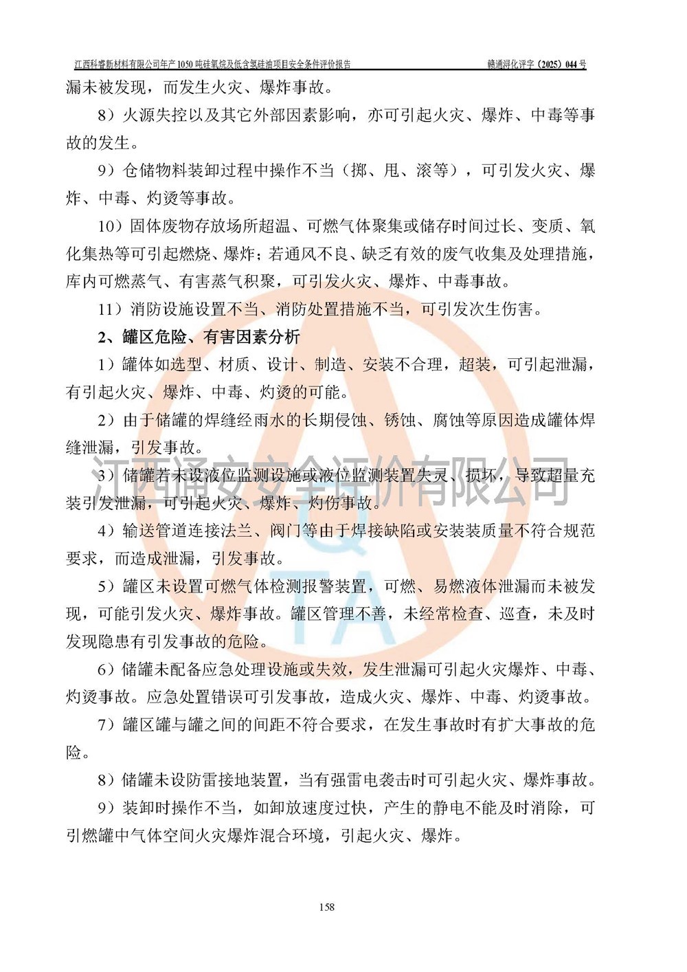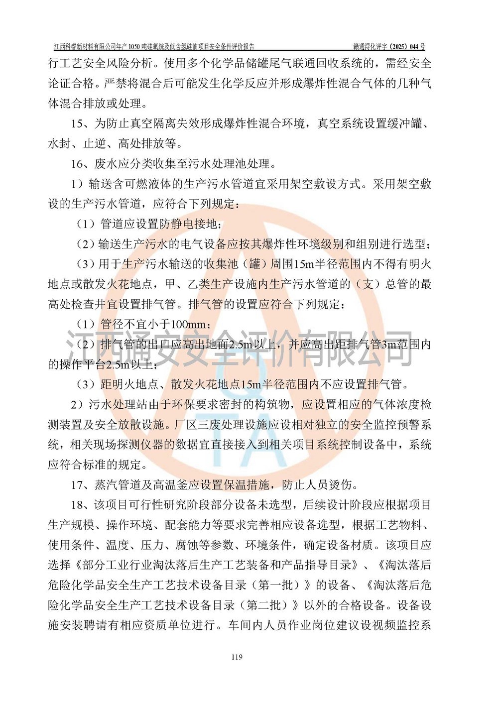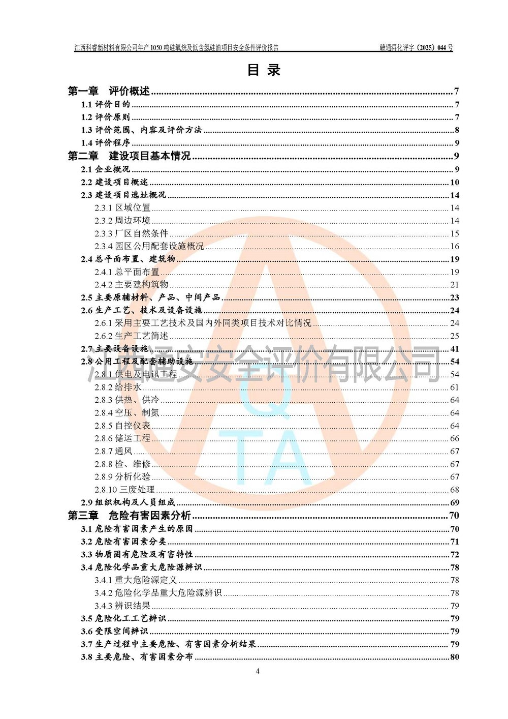评价结论 | 江西科睿新材料有限公司年产1050吨硅氧烷及低含氢硅油项目的周边环境、总体布局、自然环境能满足建设安全条件;项目选择的工艺过程及设备设施的安全可靠性能达到**法规、标准规定要求;项目存在的危险有害因素可控,在落实本评价报告提出的有关安全对策措施后,其危险有害程度能达到可以接受的程度,项目建设能够实现安全运行的目标。 | |||||