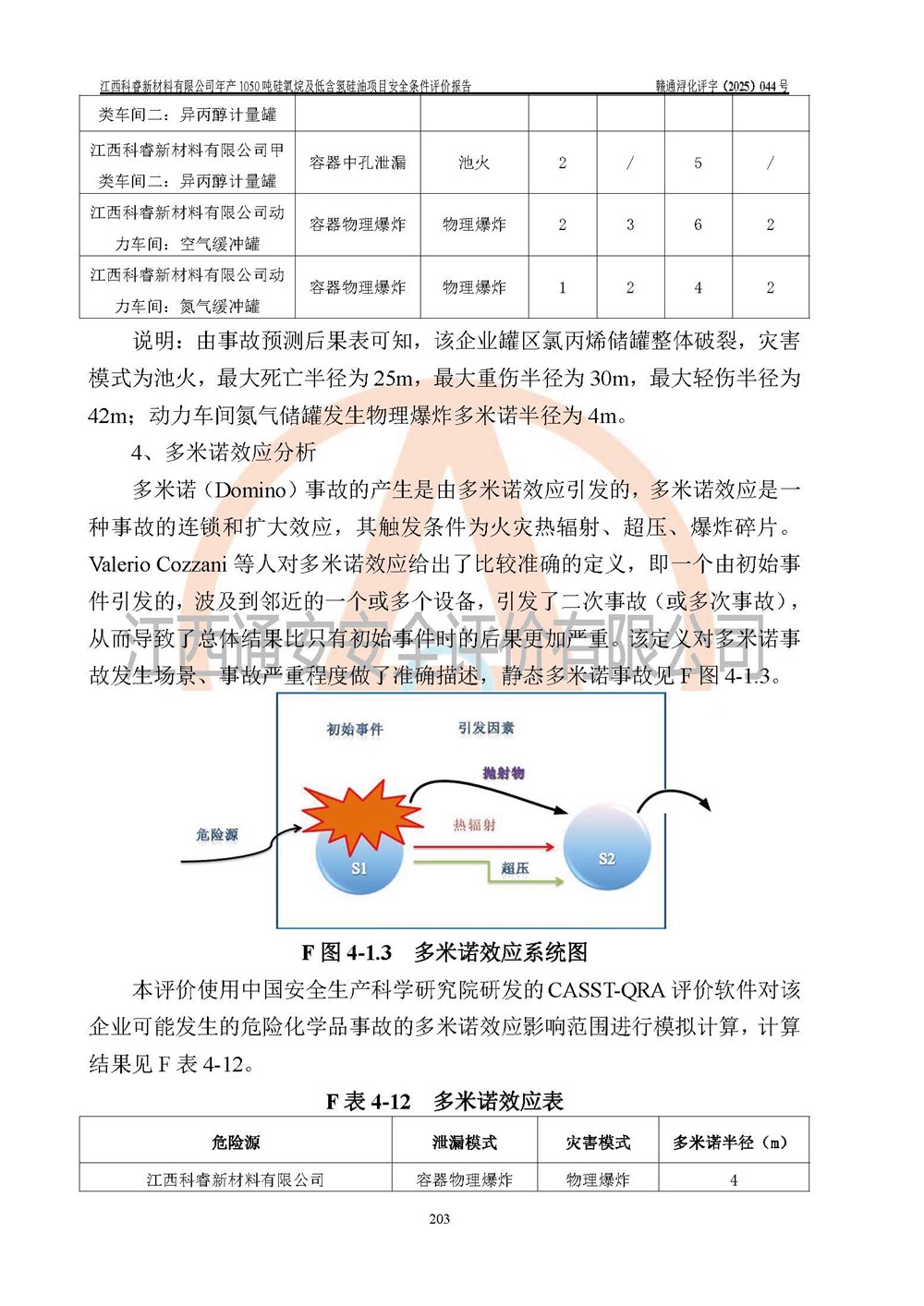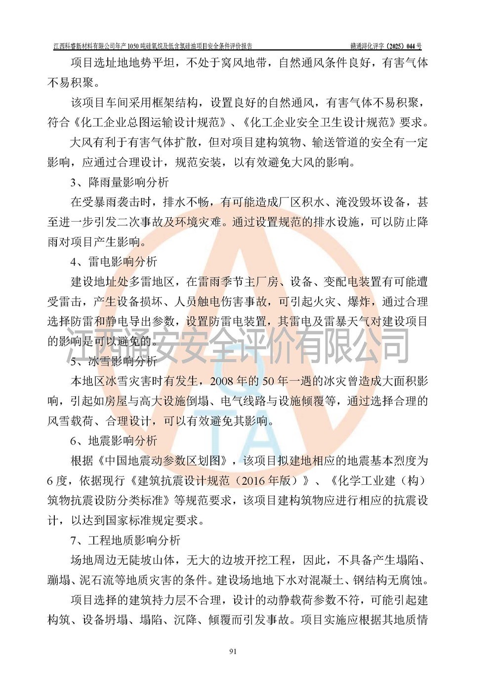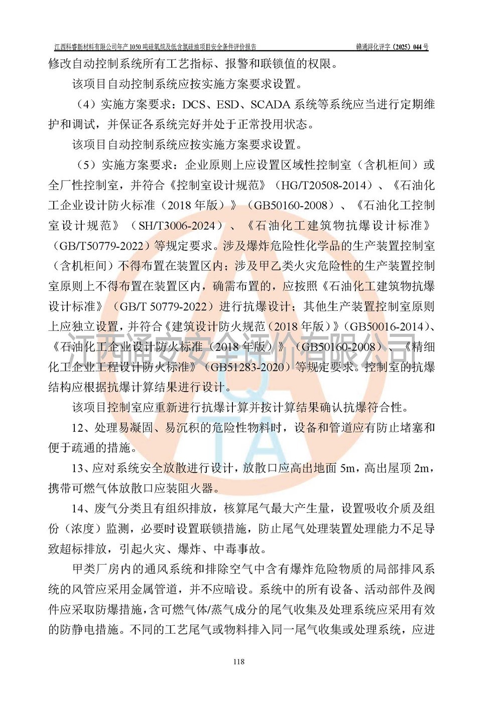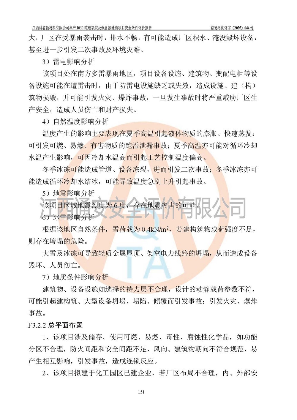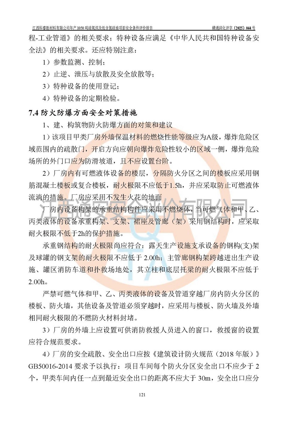 评价结论 | 江西科睿新材料有限公司年产1050吨硅氧烷及低含氢硅油项目的周边环境、总体布局、自然环境能满足建设安全条件;项目选择的工艺过程及设备设施的安全可靠性能达到**法规、标准规定要求;项目存在的危险有害因素可控,在落实本评价报告提出的有关安全对策措施后,其危险有害程度能达到可以接受的程度,项目建设能够实现安全运行的目标。 | |||||
