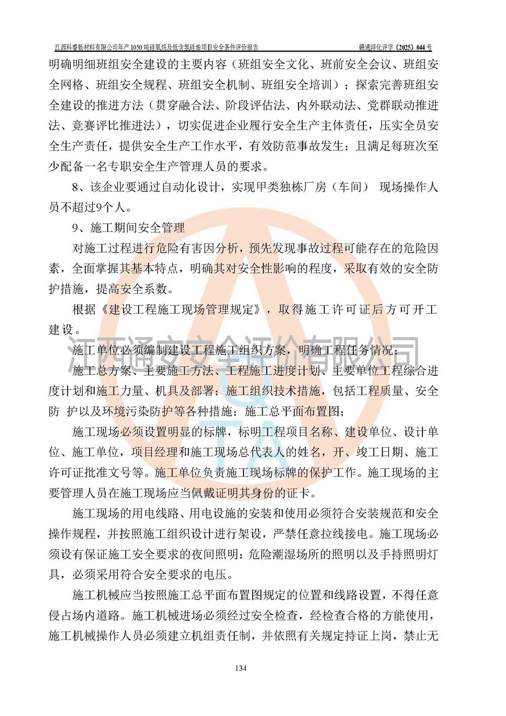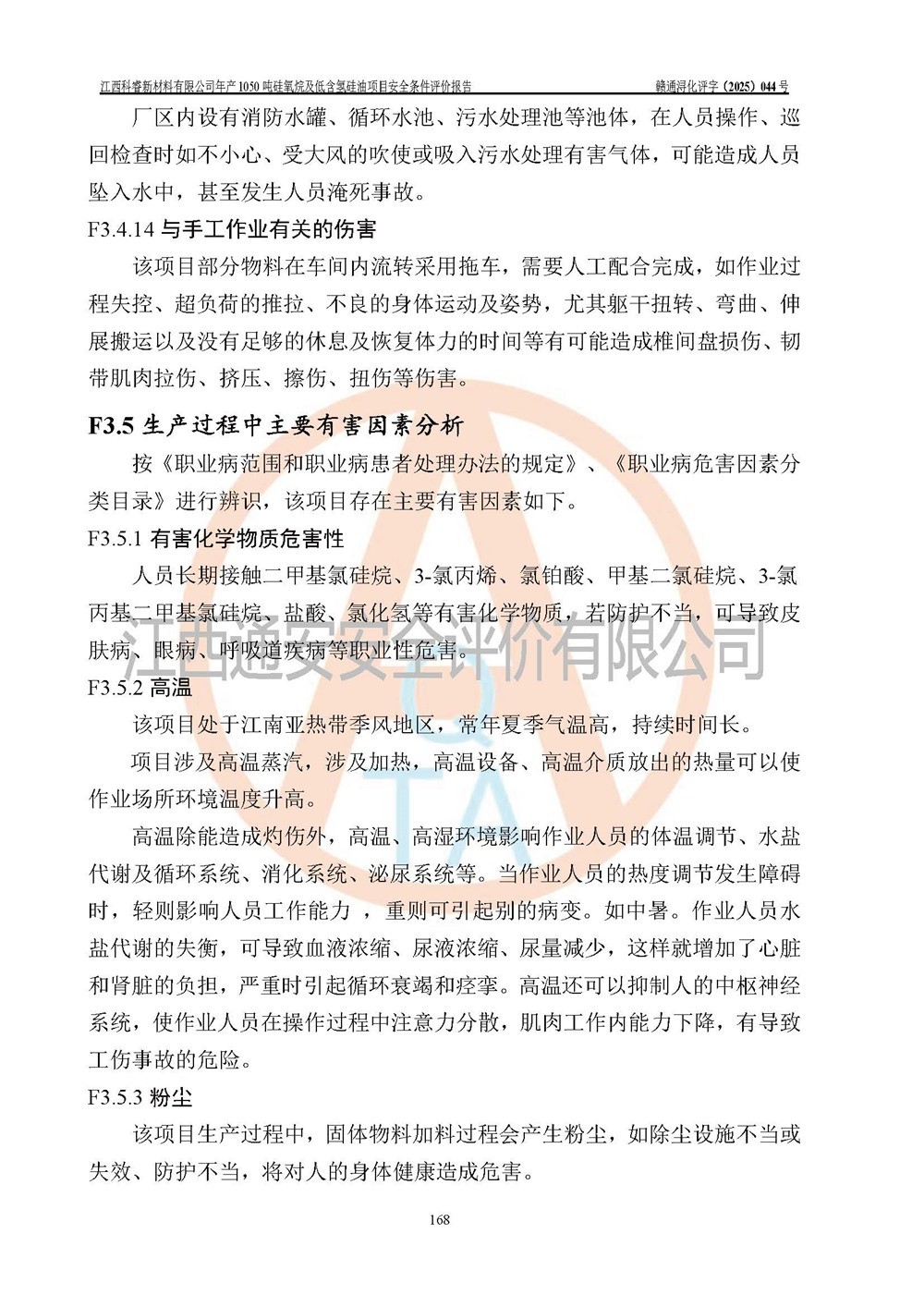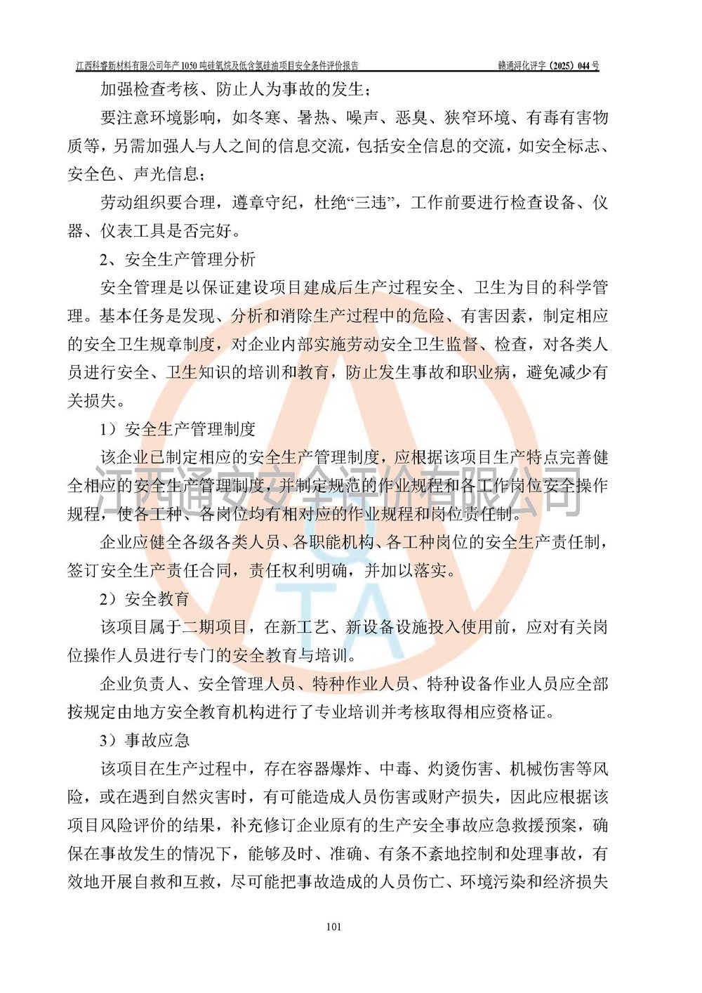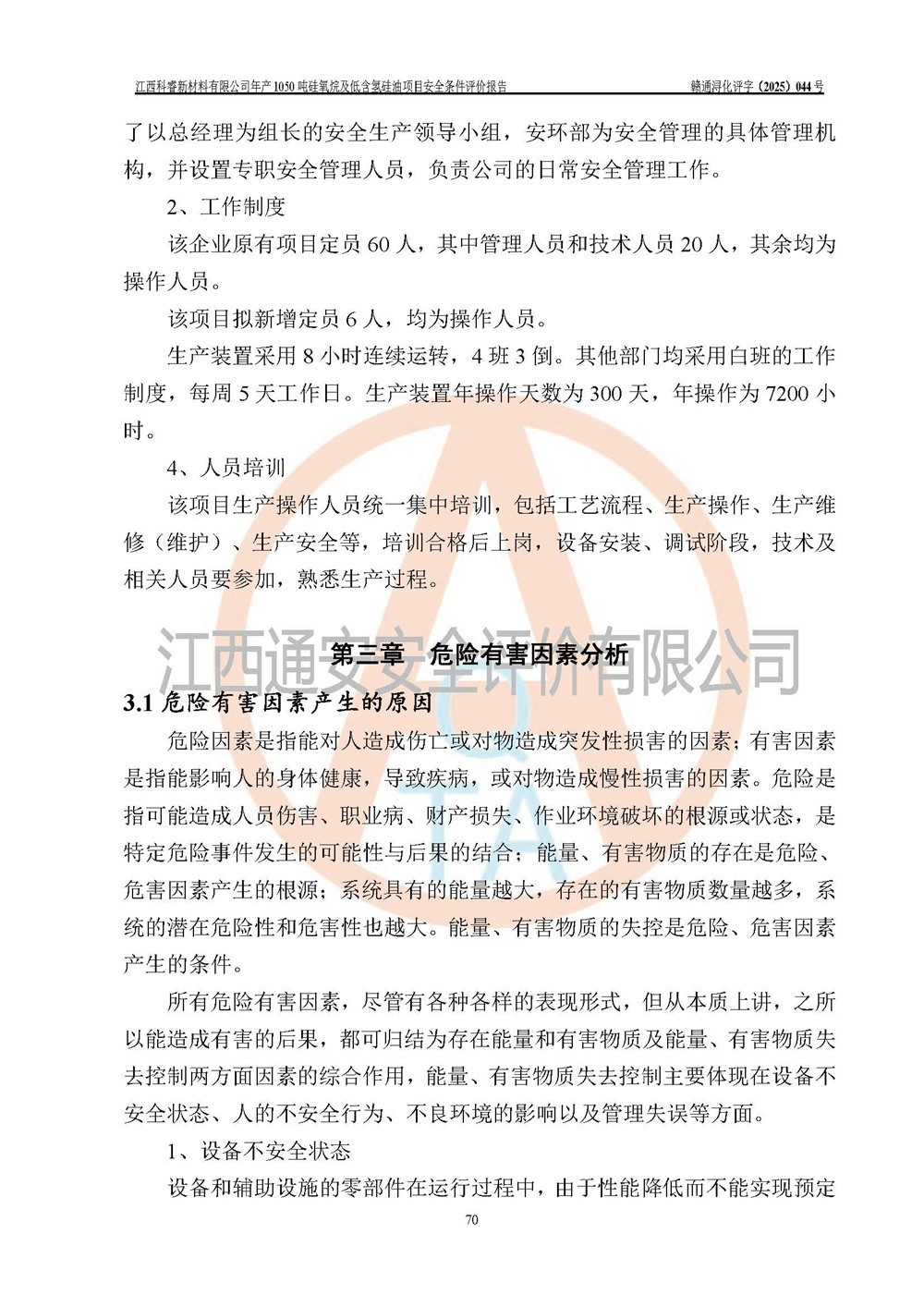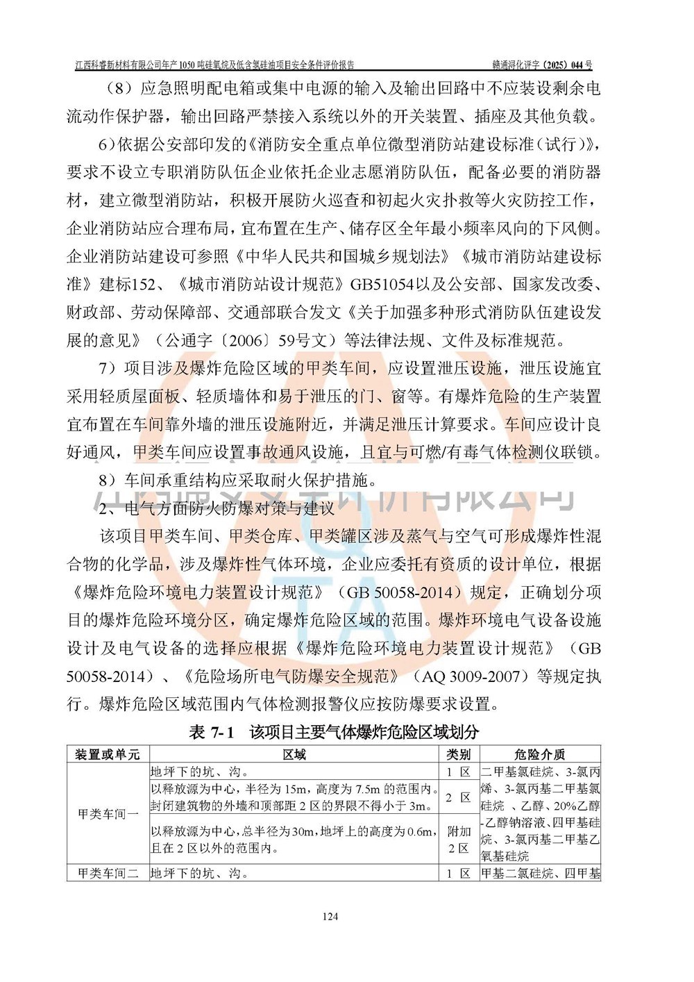 评价结论 | 江西科睿新材料有限公司年产1050吨硅氧烷及低含氢硅油项目的周边环境、总体布局、自然环境能满足建设安全条件;项目选择的工艺过程及设备设施的安全可靠性能达到**法规、标准规定要求;项目存在的危险有害因素可控,在落实本评价报告提出的有关安全对策措施后,其危险有害程度能达到可以接受的程度,项目建设能够实现安全运行的目标。 | |||||
