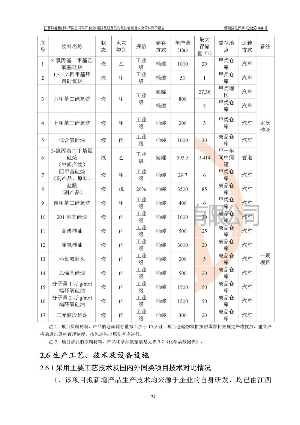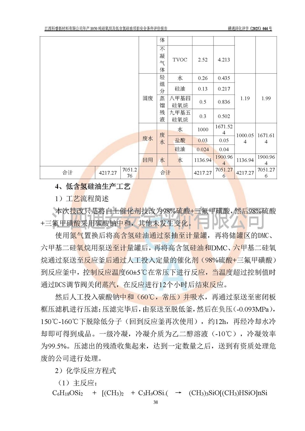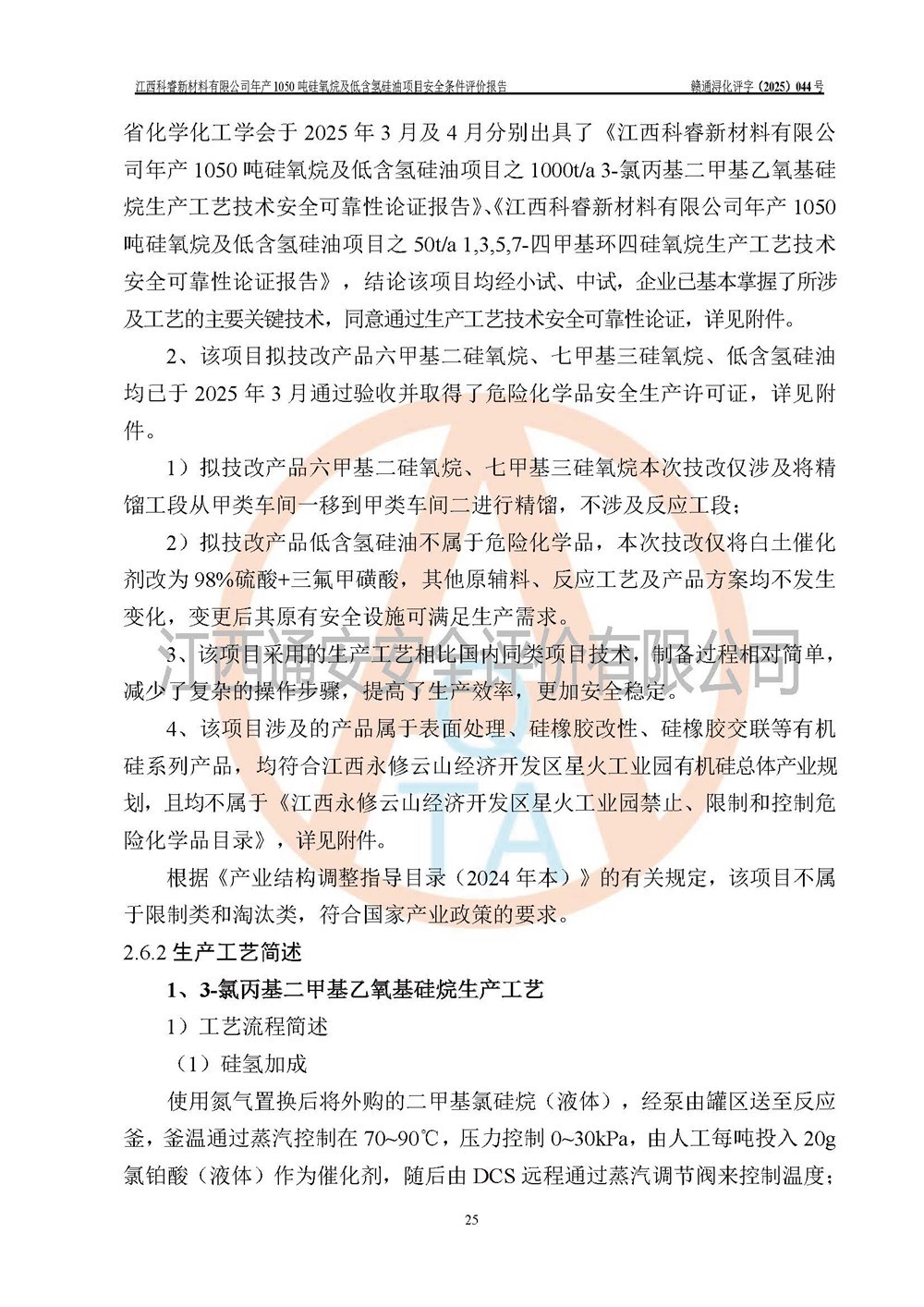 项目简介 | 江西科睿新材料有限公司位于江西省永修县云山经济开发区星火工业园希望大道7号,于2014年02月19日在永修县市场监督管理局注册成立,注册资本为2000(万元),主要经营一般项目:有机硅产品的生产、销售(危险化学品除外);进出口业务(以上经营项目**有专项规定的凭许可证、资质证、批文经营)。 为满足企业内部及市场需求拟再投资1215.94万元在现有厂区内建设年产1050吨硅氧烷及低含氢硅油项目,具体包括1000t/a 3-氯丙基二甲基乙氧基硅烷(新增)、50t/a 1,3,5,7-四甲基环四硅氧烷(新增)、800t/a六甲基二硅氧烷(技改)、200t/a七甲基三硅氧烷(技改)、1000t/a低含氢硅油(技改)。 | |||||
